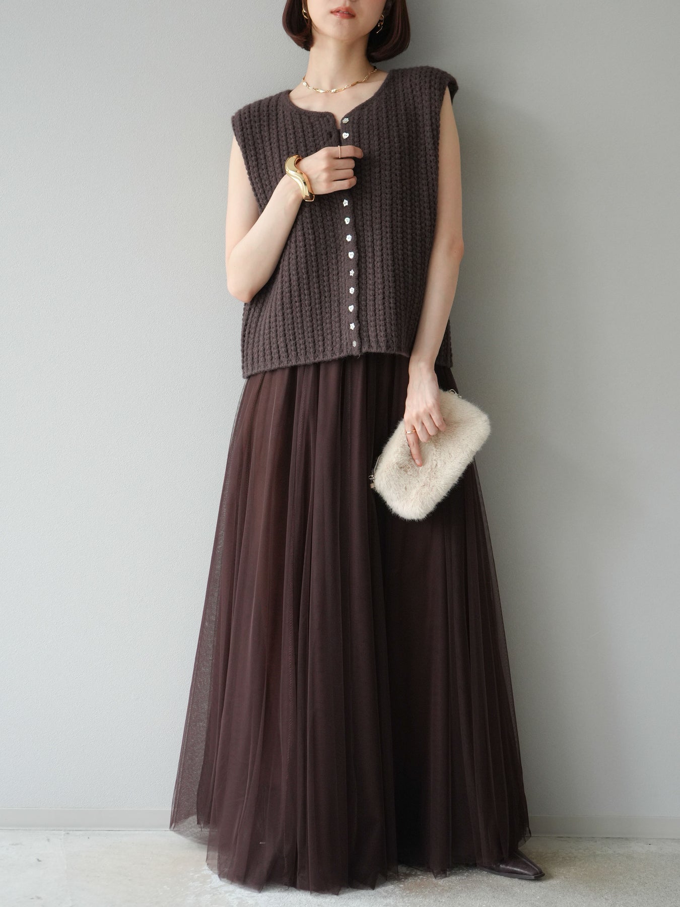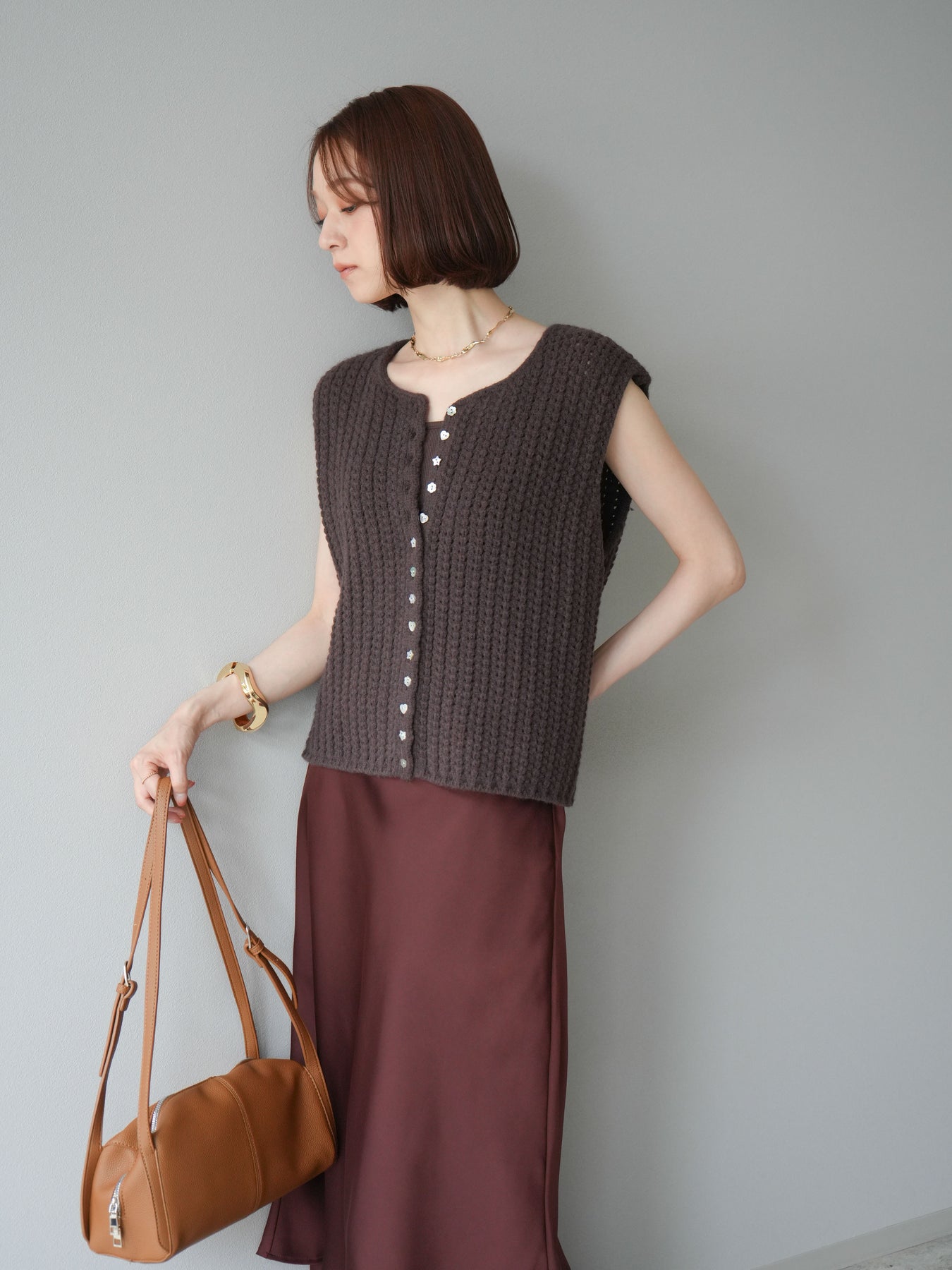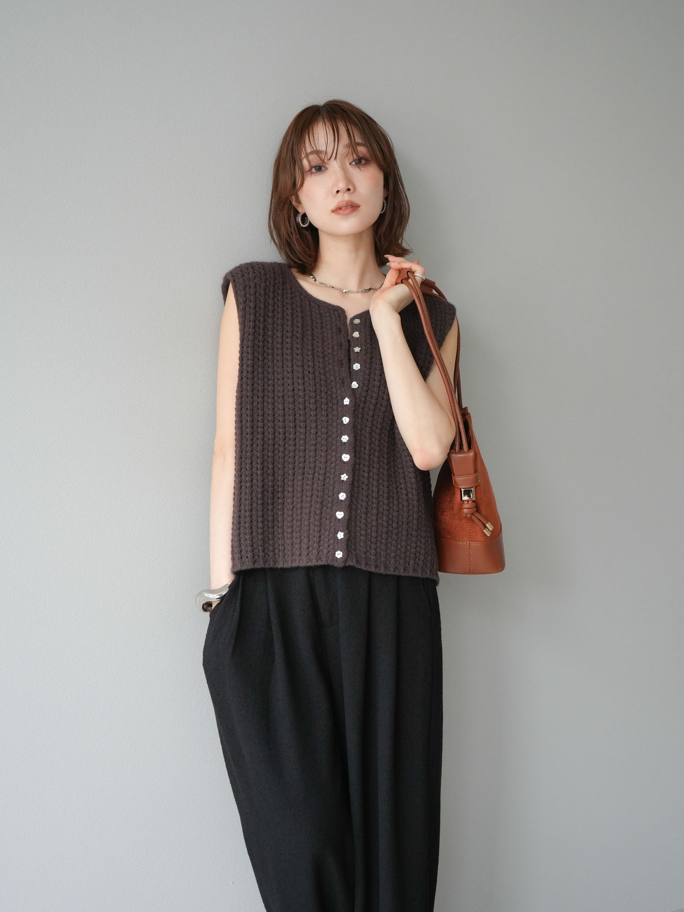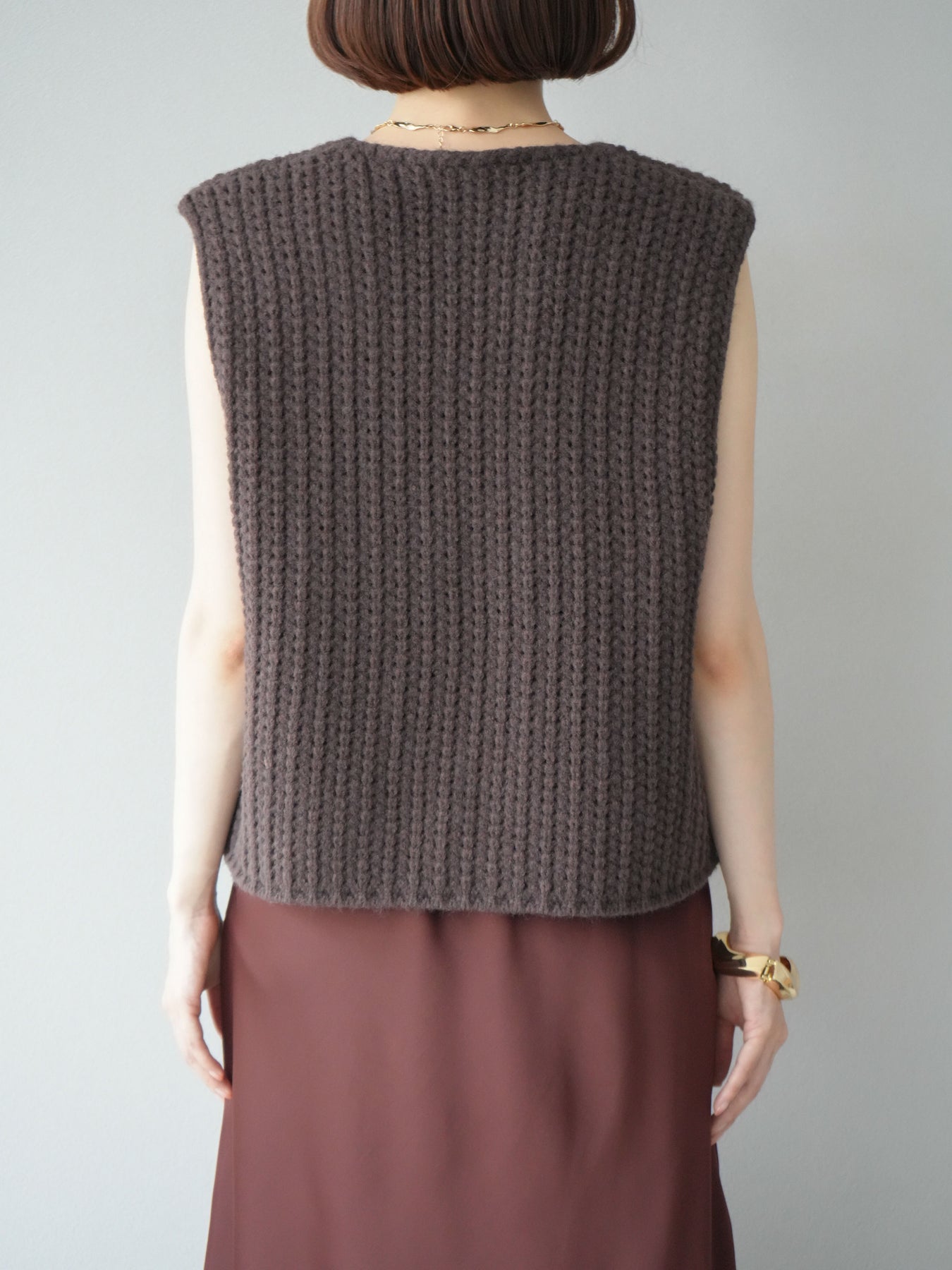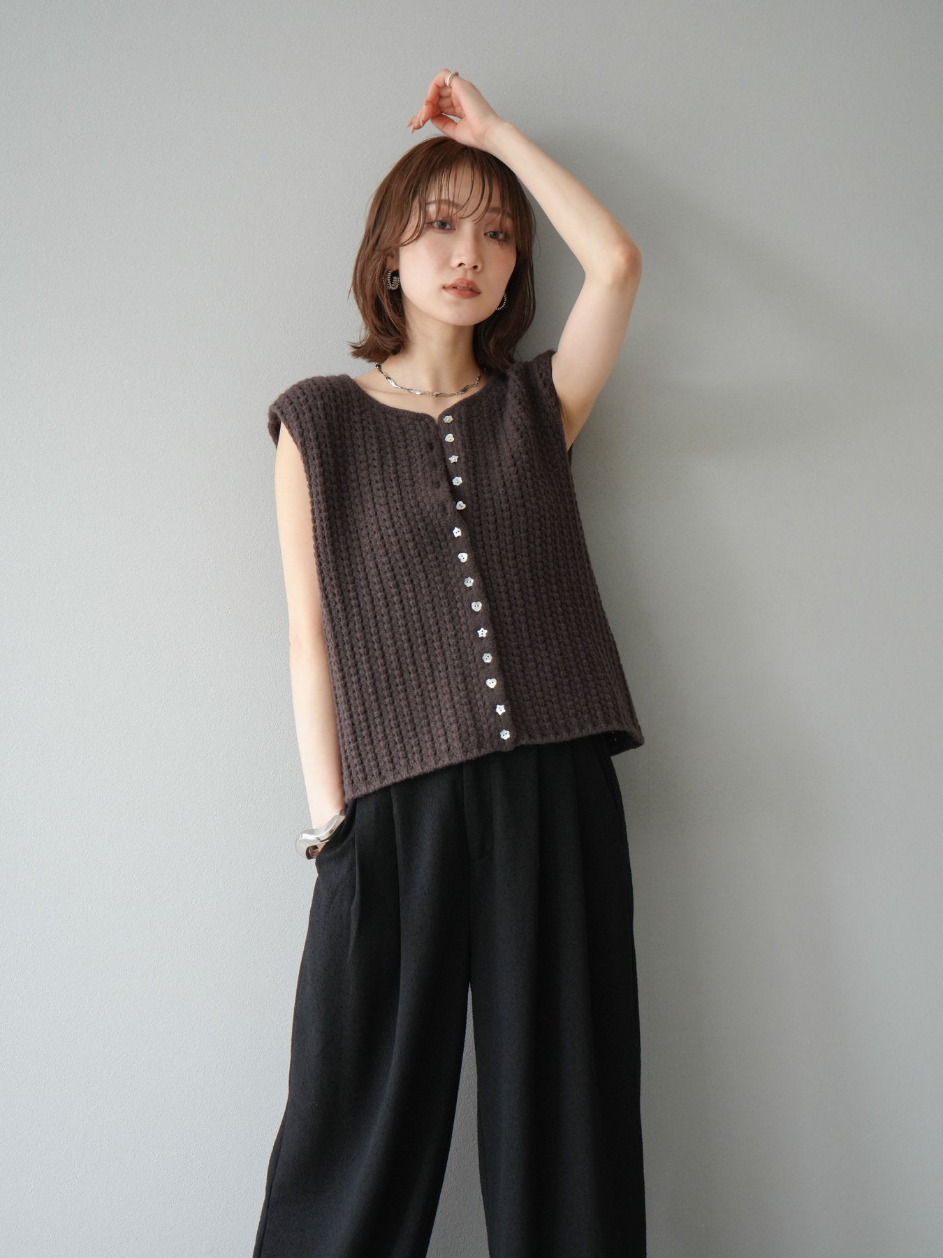 [予約]ランダムボタンニットベスト/ブラウン