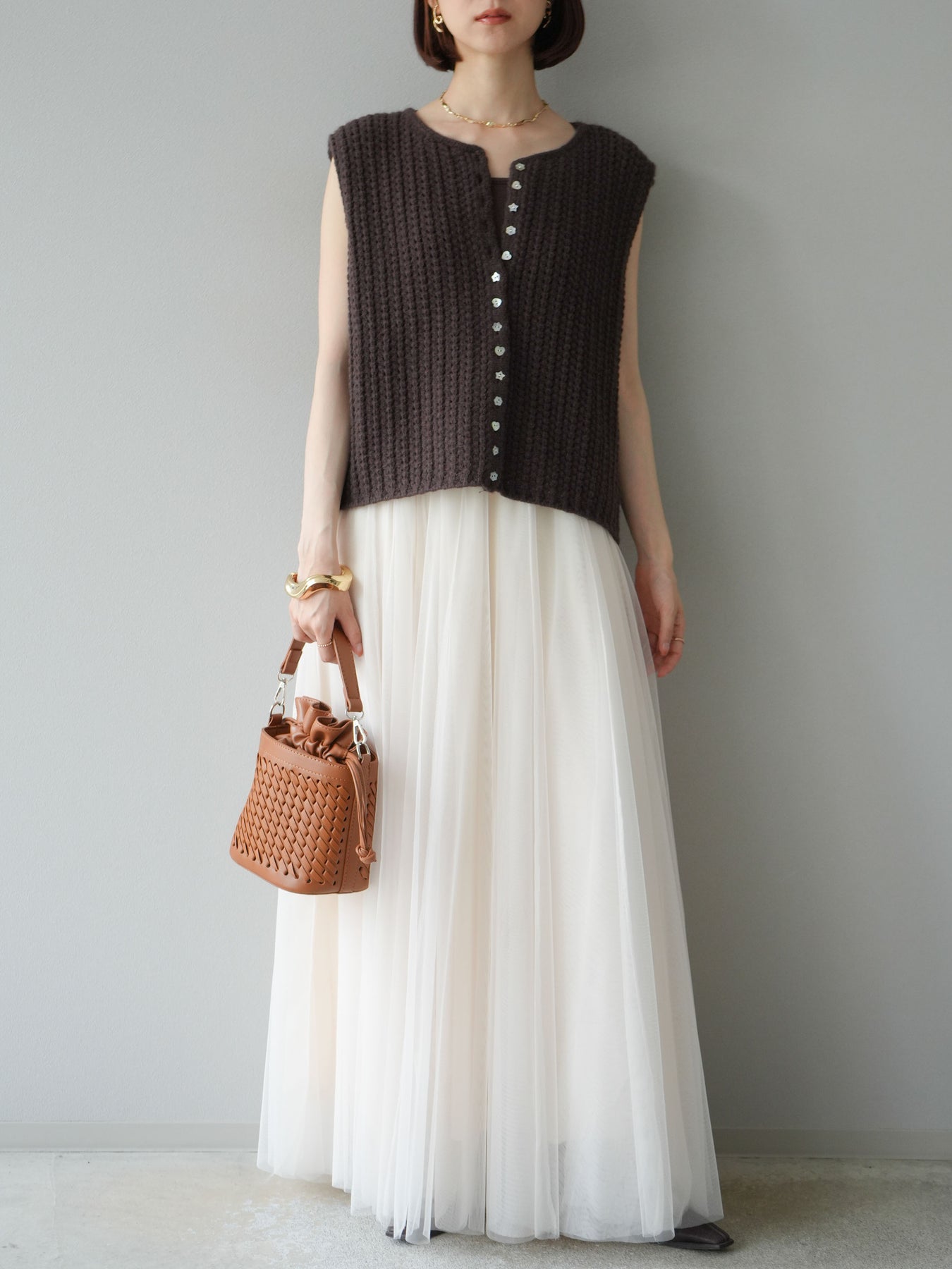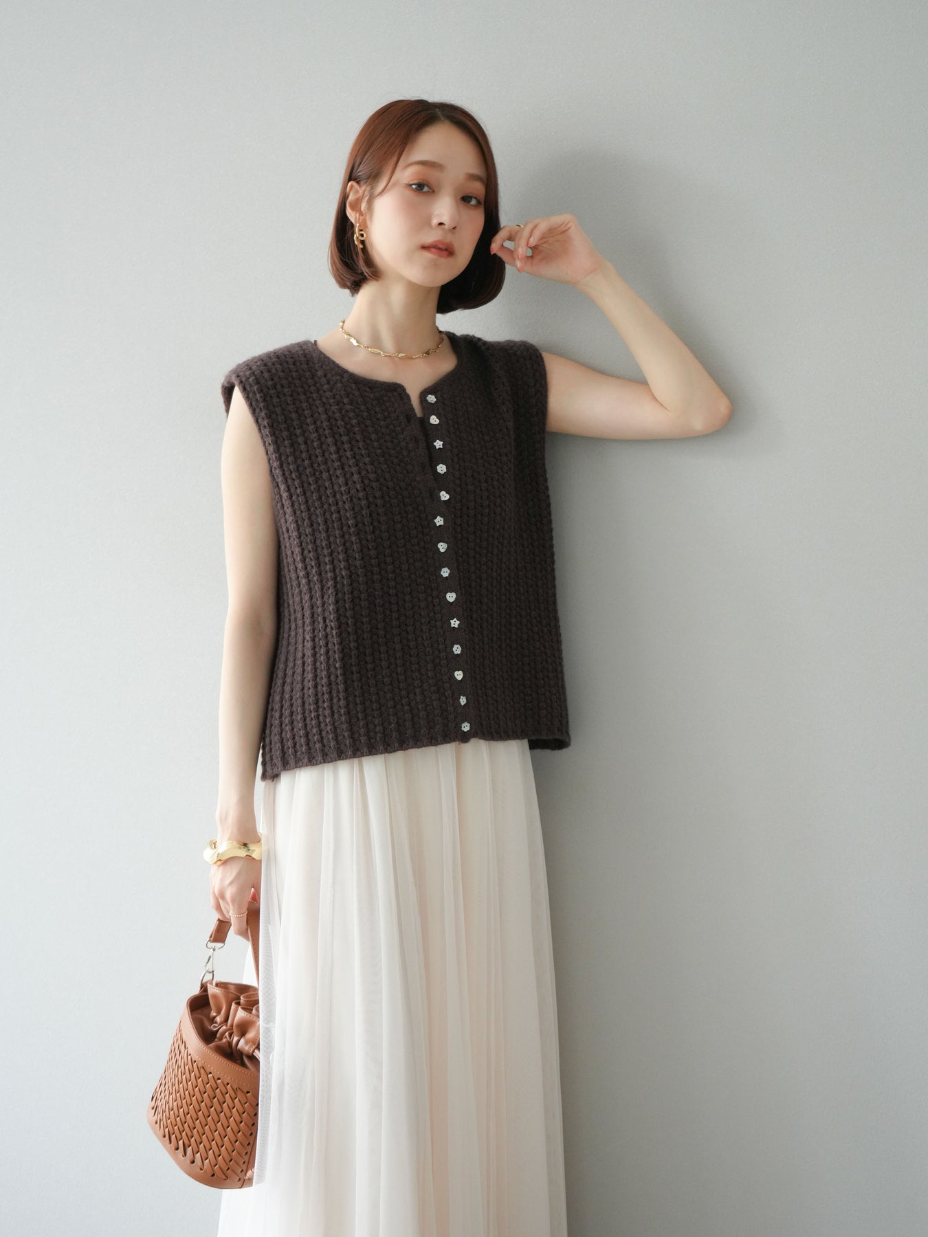 立体感のある編地に、遊び心のあるランダムボタンをあしらったニットベスト。シンプルなシルエットに個性的なディテールを加えることで、羽織るだけでスタイリングの主役になる一枚です。程よい厚みで体のラインを拾いにくく、コンパクトな丈感がボトムスとのバランスを取りやすいデザイン。シャツやカットソーに重ねてレイヤードを楽しんだり、ボタンを留めてトップス風に着こなすことも可能です。カジュアルからきれいめまで幅広く対応でき、季節を問わず活躍する万能アイテムです。 ※ボトムス、キャミソール(インナー)以外の商品は一律でインナーは付属していません。
