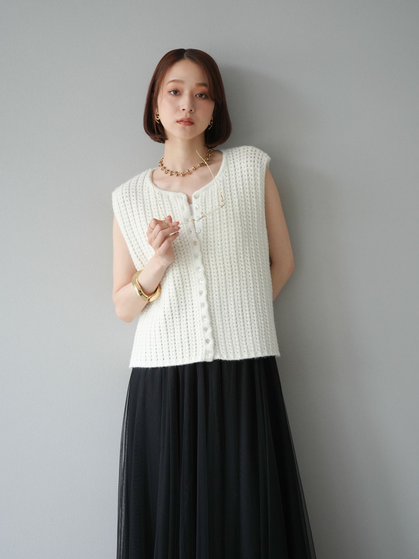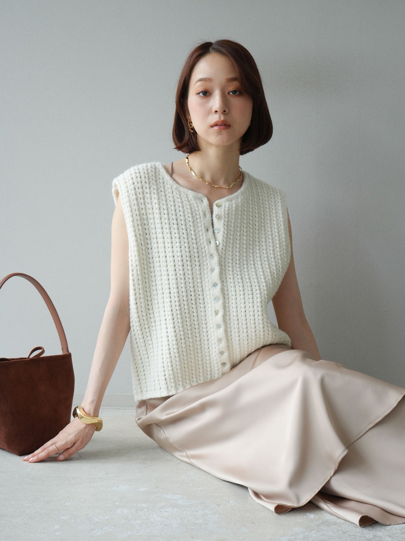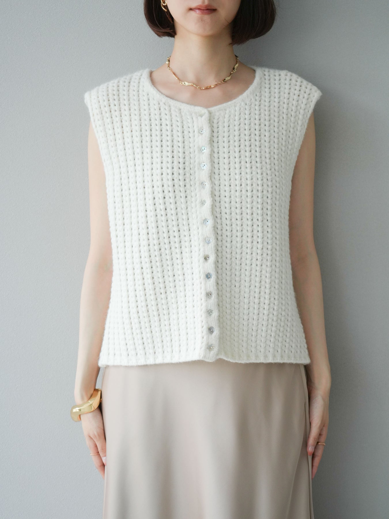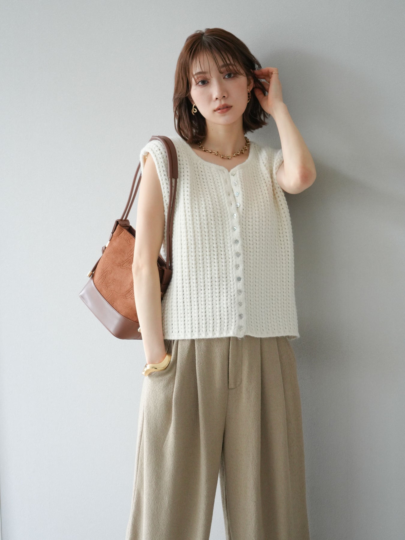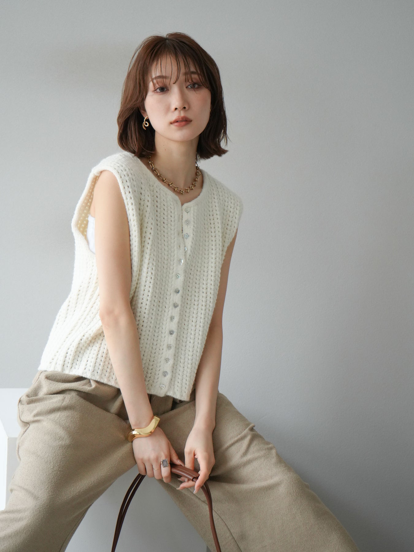 立体感のある編地に、遊び心のあるランダムボタンをあしらったニットベスト。シンプルなシルエットに個性的なディテールを加えることで、羽織るだけでスタイリングの主役になる一枚です。程よい厚みで体のラインを拾いにくく、コンパクトな丈感がボトムスとのバランスを取りやすいデザイン。シャツやカットソーに重ねてレイヤードを楽しんだり、ボタンを留めてトップス風に着こなすことも可能です。カジュアルからきれいめまで幅広く対応でき、季節を問わず活躍する万能アイテムです。 ※ボトムス、キャミソール(インナー)以外の商品は一律でインナーは付属していません。