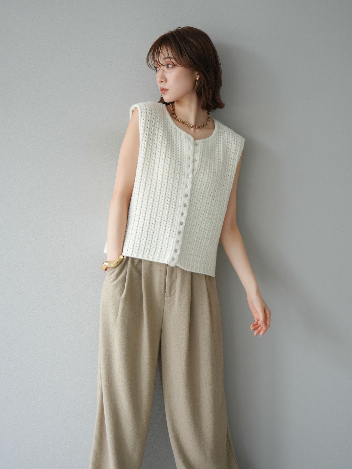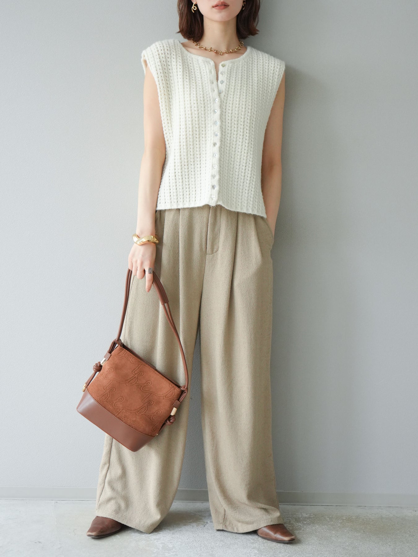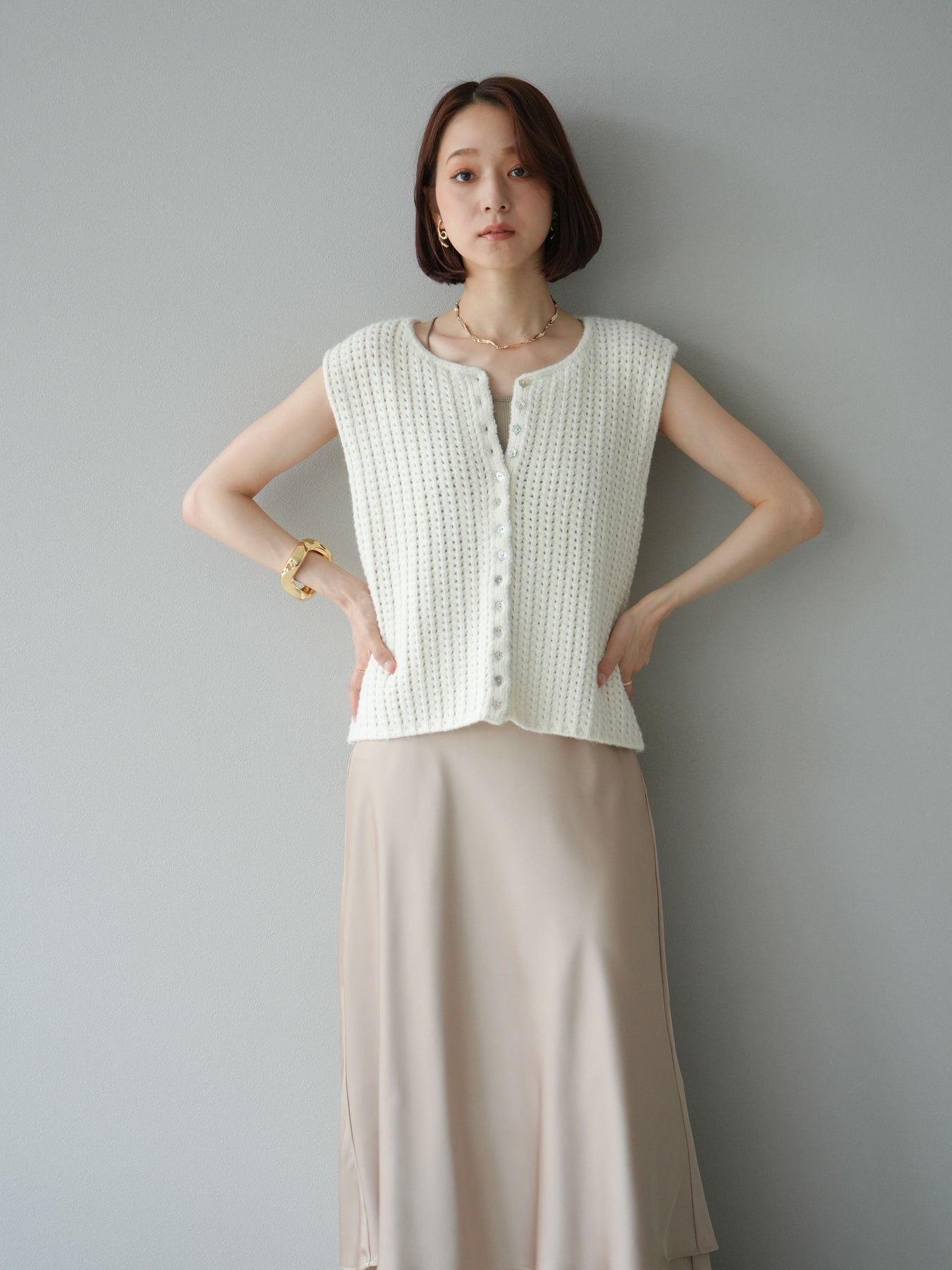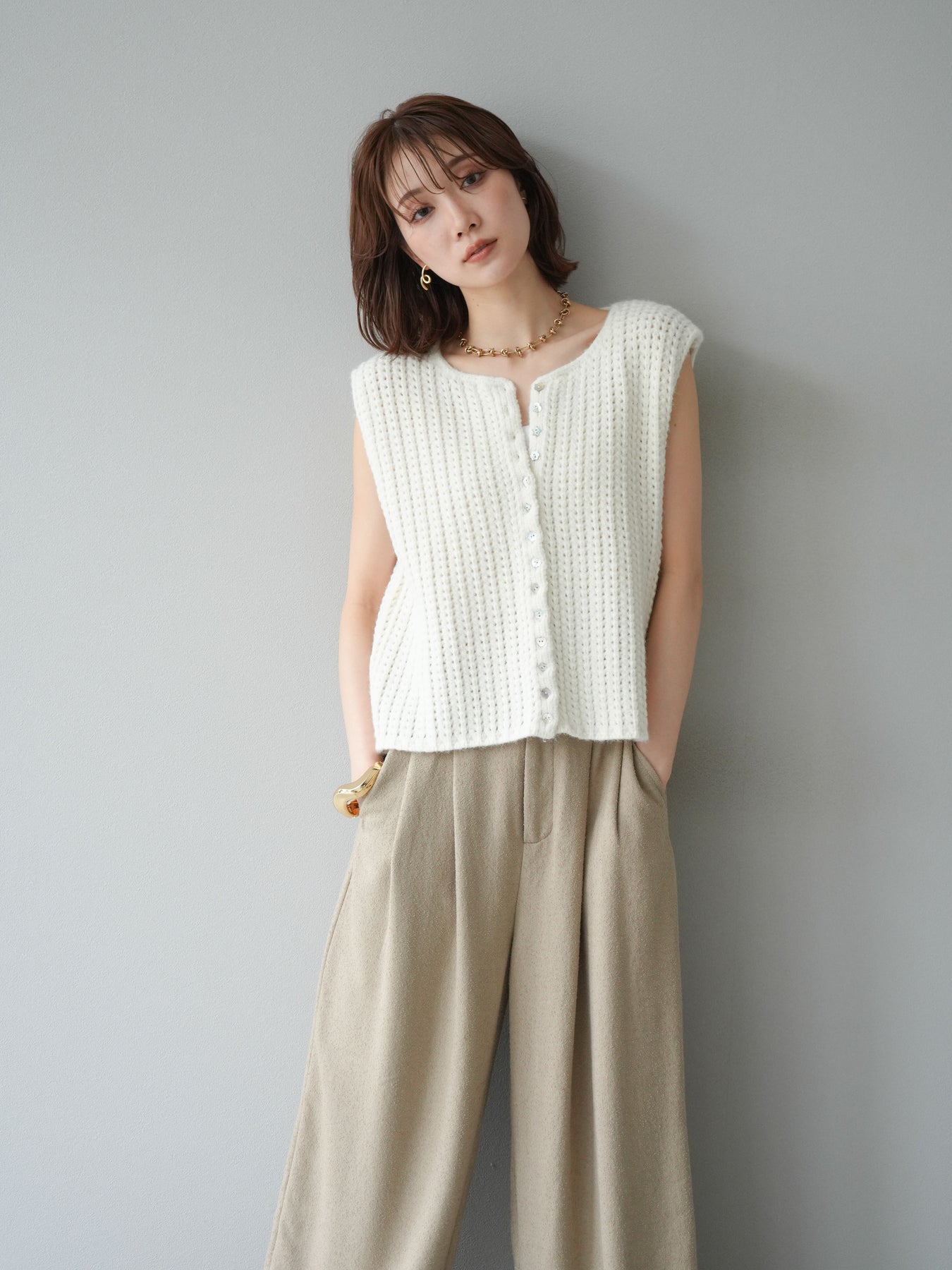 立体感のある編地に、遊び心のあるランダムボタンをあしらったニットベスト。シンプルなシルエットに個性的なディテールを加えることで、羽織るだけでスタイリングの主役になる一枚です。程よい厚みで体のラインを拾いにくく、コンパクトな丈感がボトムスとのバランスを取りやすいデザイン。シャツやカットソーに重ねてレイヤードを楽しんだり、ボタンを留めてトップス風に着こなすことも可能です。カジュアルからきれいめまで幅広く対応でき、季節を問わず活躍する万能アイテムです。 ※ボトムス、キャミソール(インナー)以外の商品は一律でインナーは付属していません。
