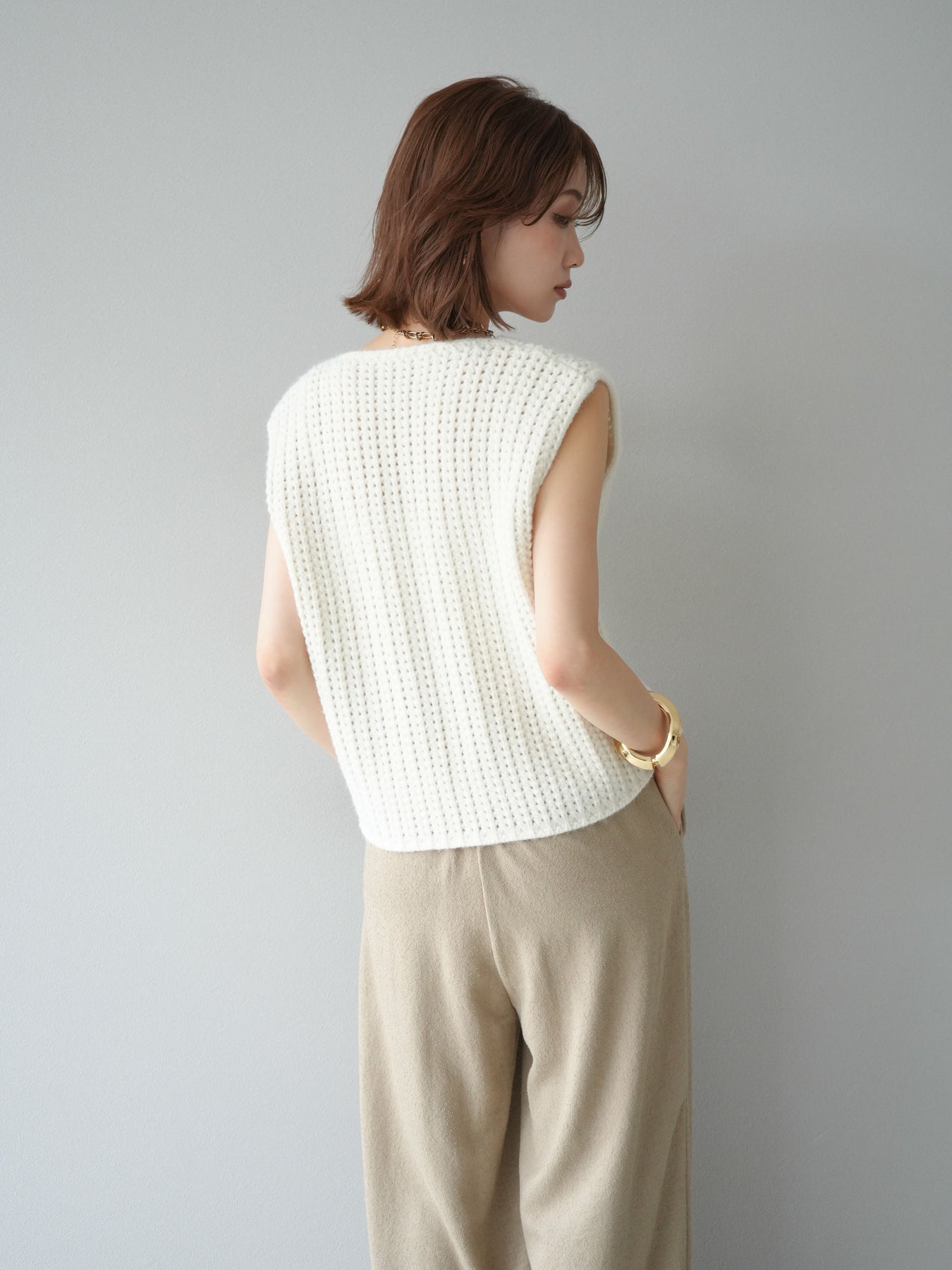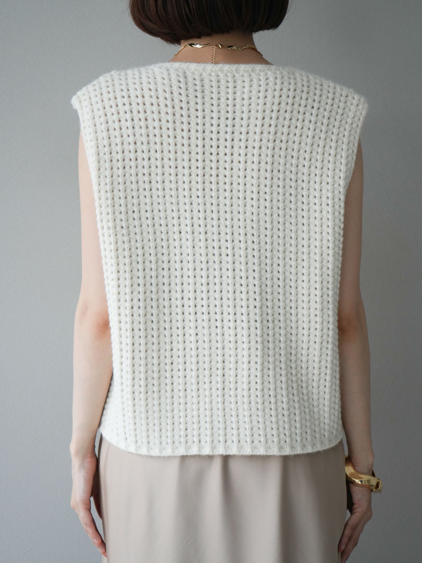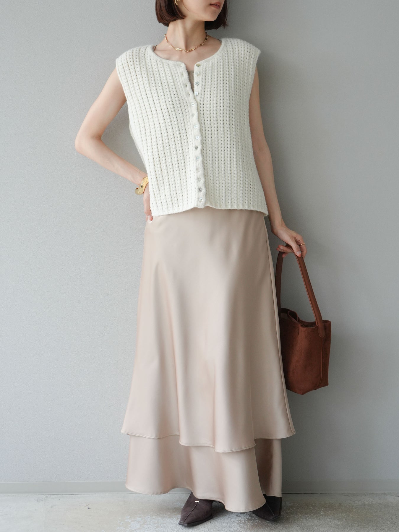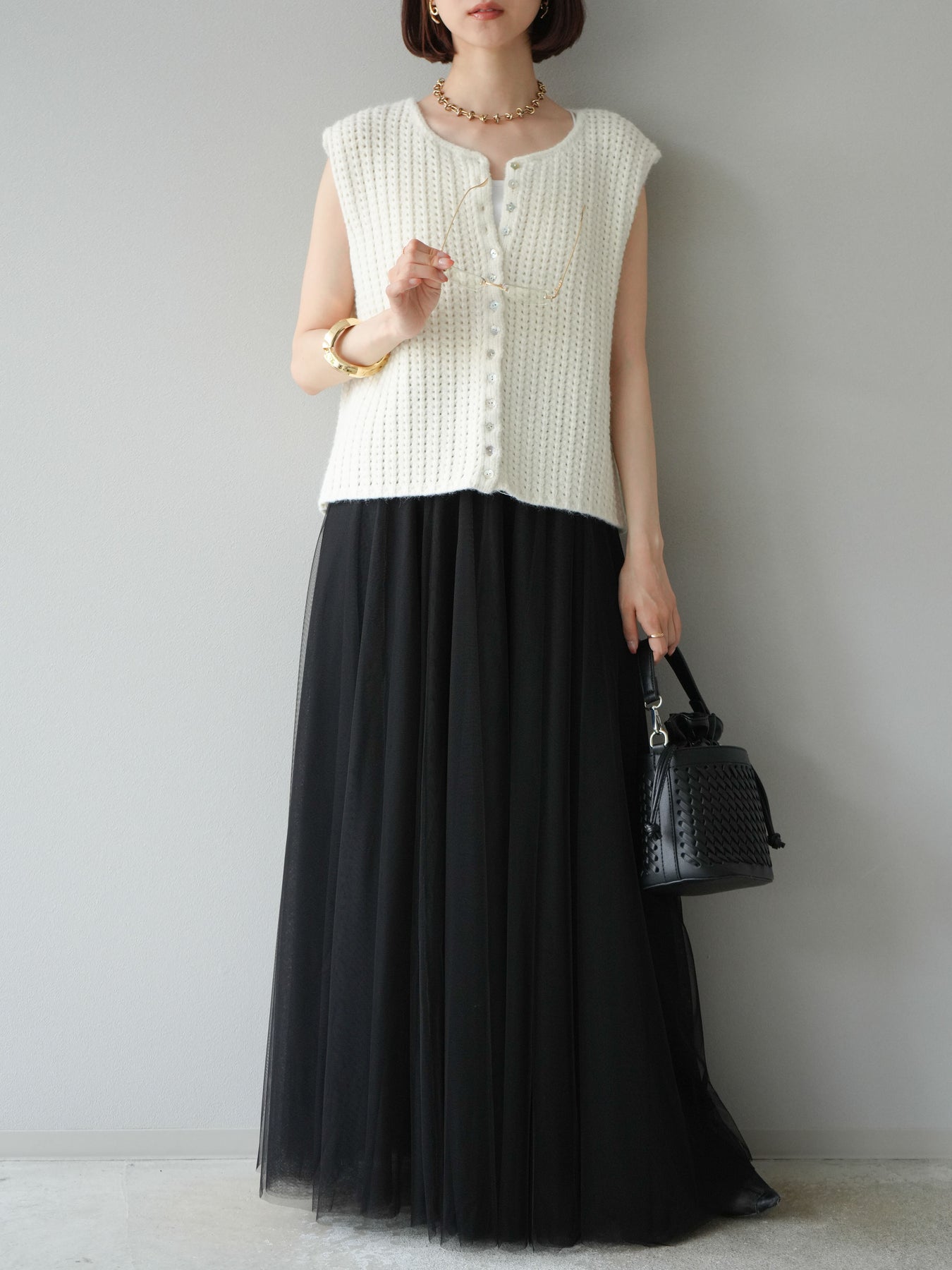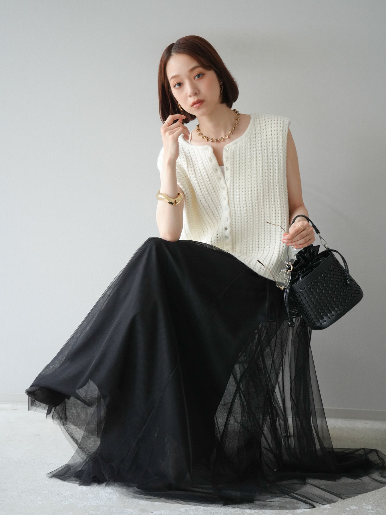 立体感のある編地に、遊び心のあるランダムボタンをあしらったニットベスト。シンプルなシルエットに個性的なディテールを加えることで、羽織るだけでスタイリングの主役になる一枚です。程よい厚みで体のラインを拾いにくく、コンパクトな丈感がボトムスとのバランスを取りやすいデザイン。シャツやカットソーに重ねてレイヤードを楽しんだり、ボタンを留めてトップス風に着こなすことも可能です。カジュアルからきれいめまで幅広く対応でき、季節を問わず活躍する万能アイテムです。 ※ボトムス、キャミソール(インナー)以外の商品は一律でインナーは付属していません。