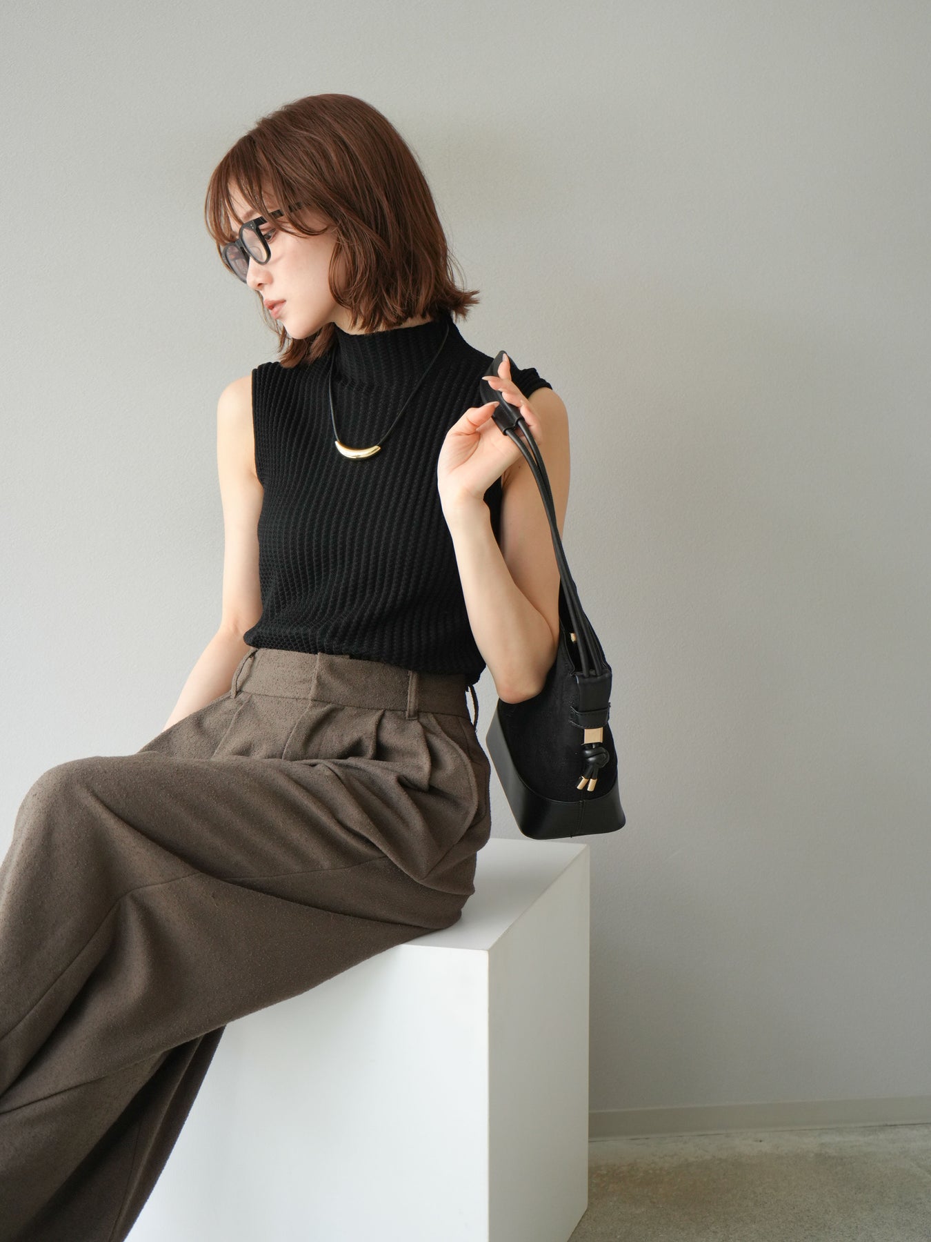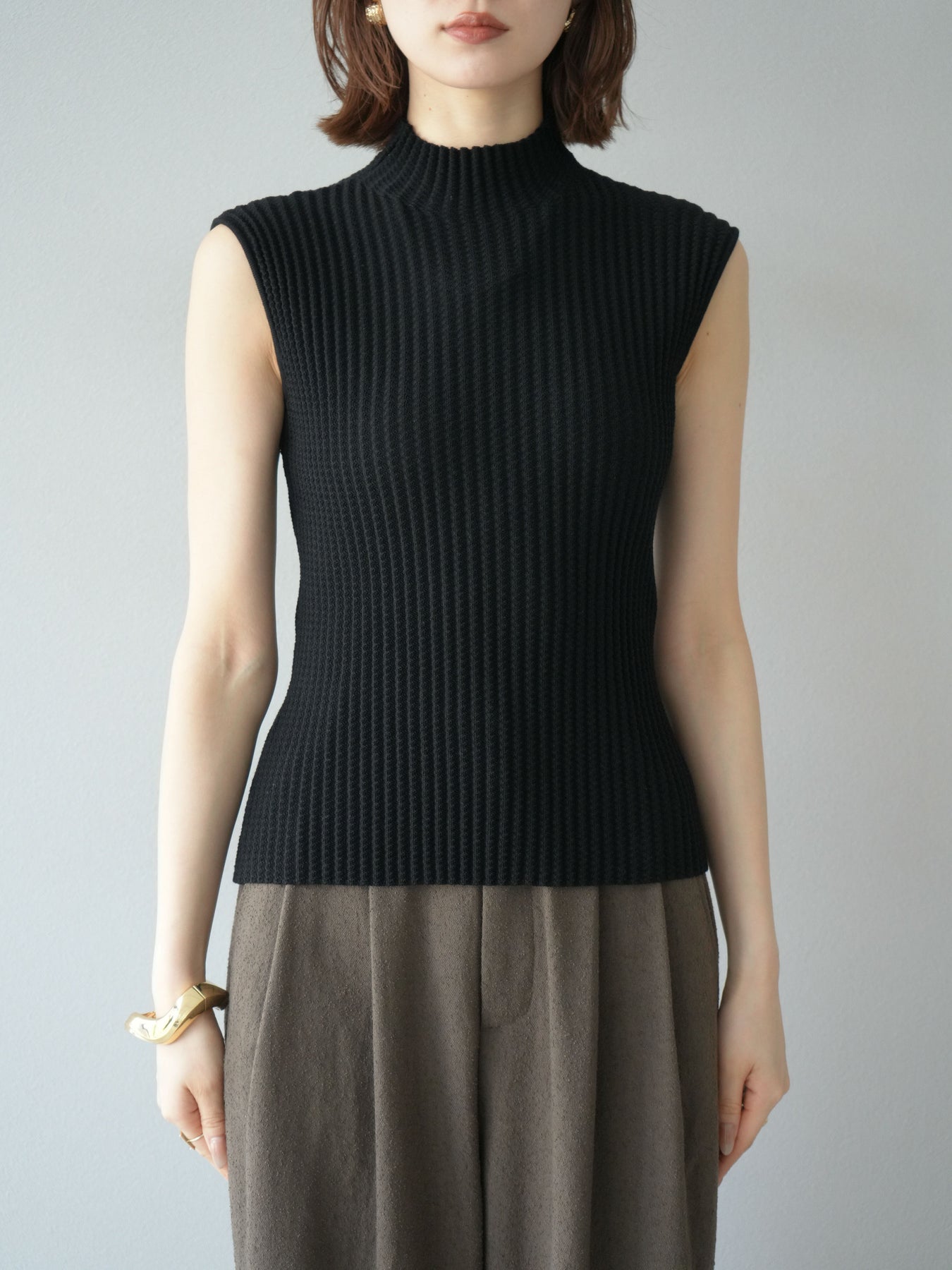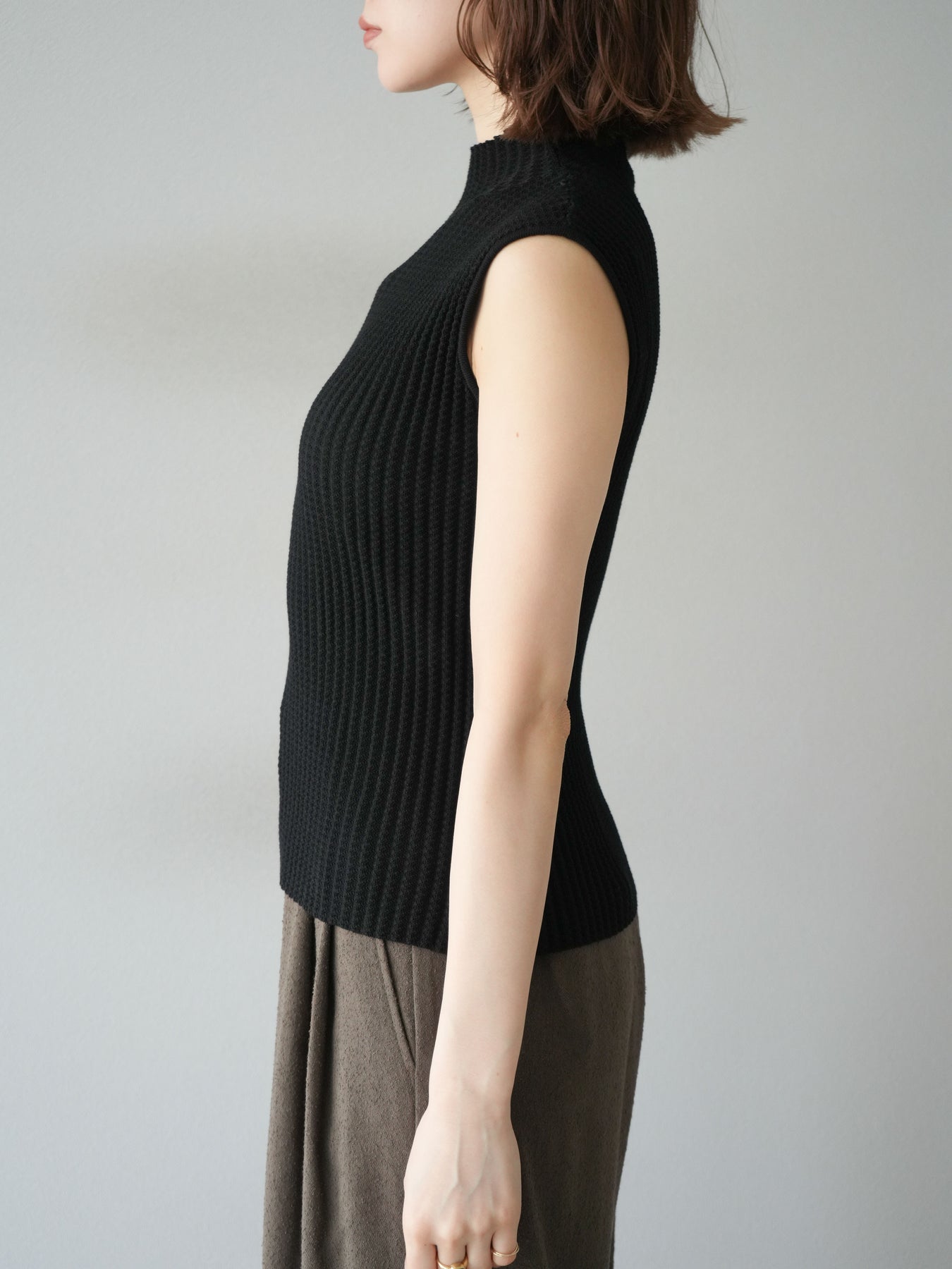 立体感のあるワッフル編みが特徴的なノースリーブニットトップス。程よく厚みのある生地感でシルエットをきれいに保ちつつ、伸縮性があり快適な着心地を叶えます。首元はボトルネック仕様で上品な印象をプラスし、1枚での着用はもちろん、ジャケットやカーディガンのインナーとしても重宝。コンパクトな丈感でボトムスを選ばず、パンツにもスカートにも合わせやすい万能なデザインです。シンプルながらも素材感で差をつけられる、デイリーに活躍するアイテムです。 ※ボトムス、キャミソール(インナー)以外の商品は一律でインナーは付属していません。
