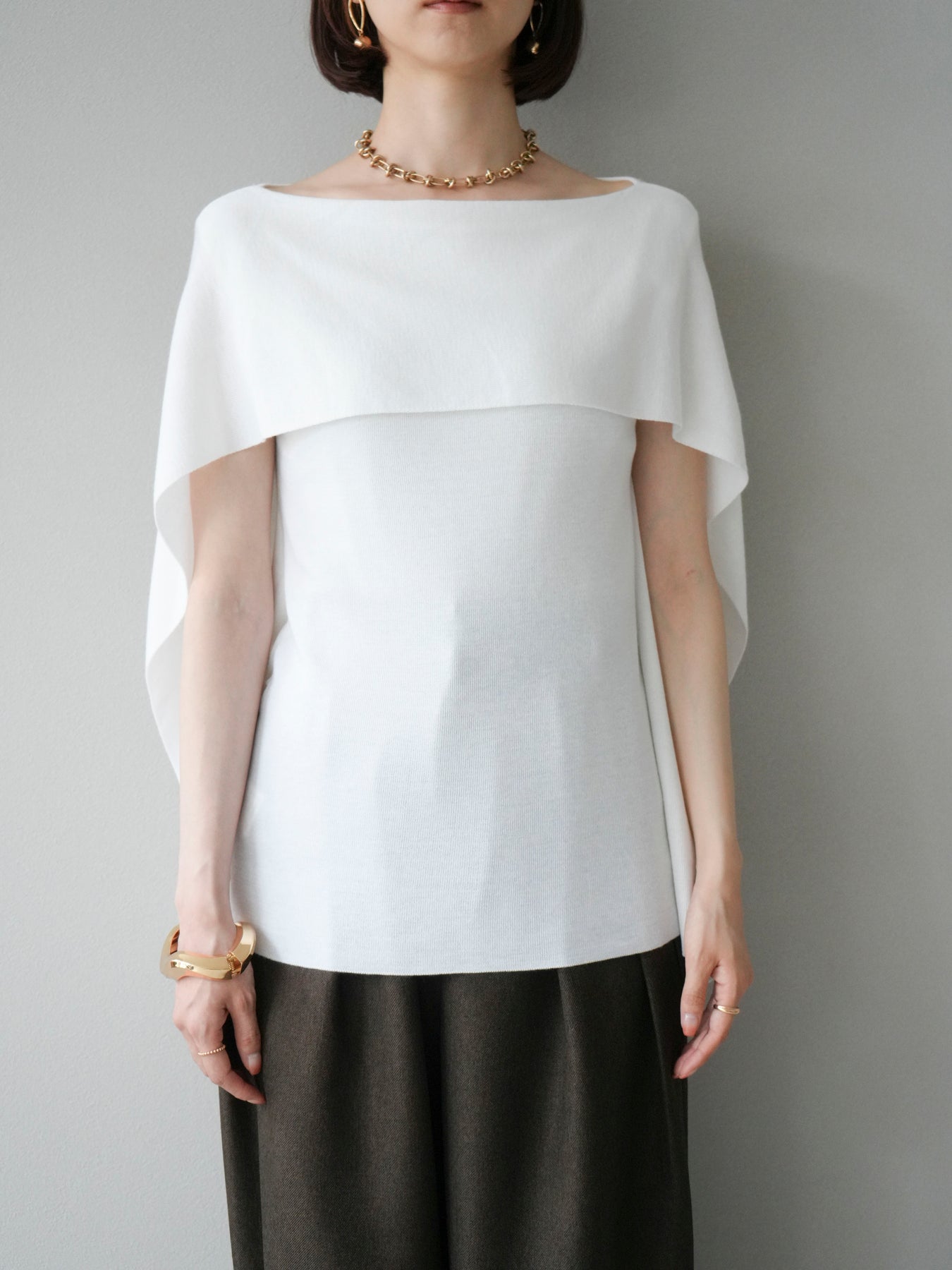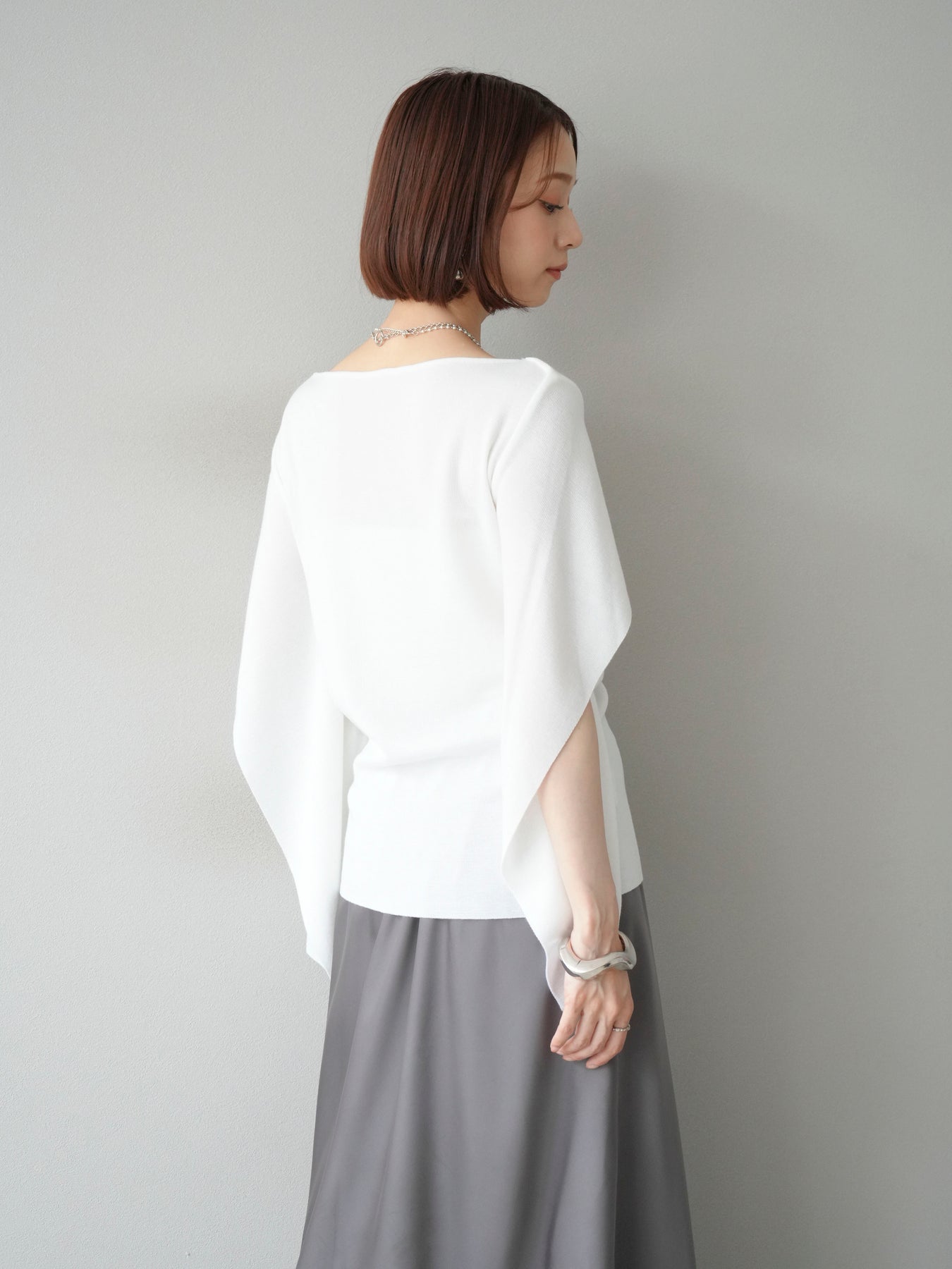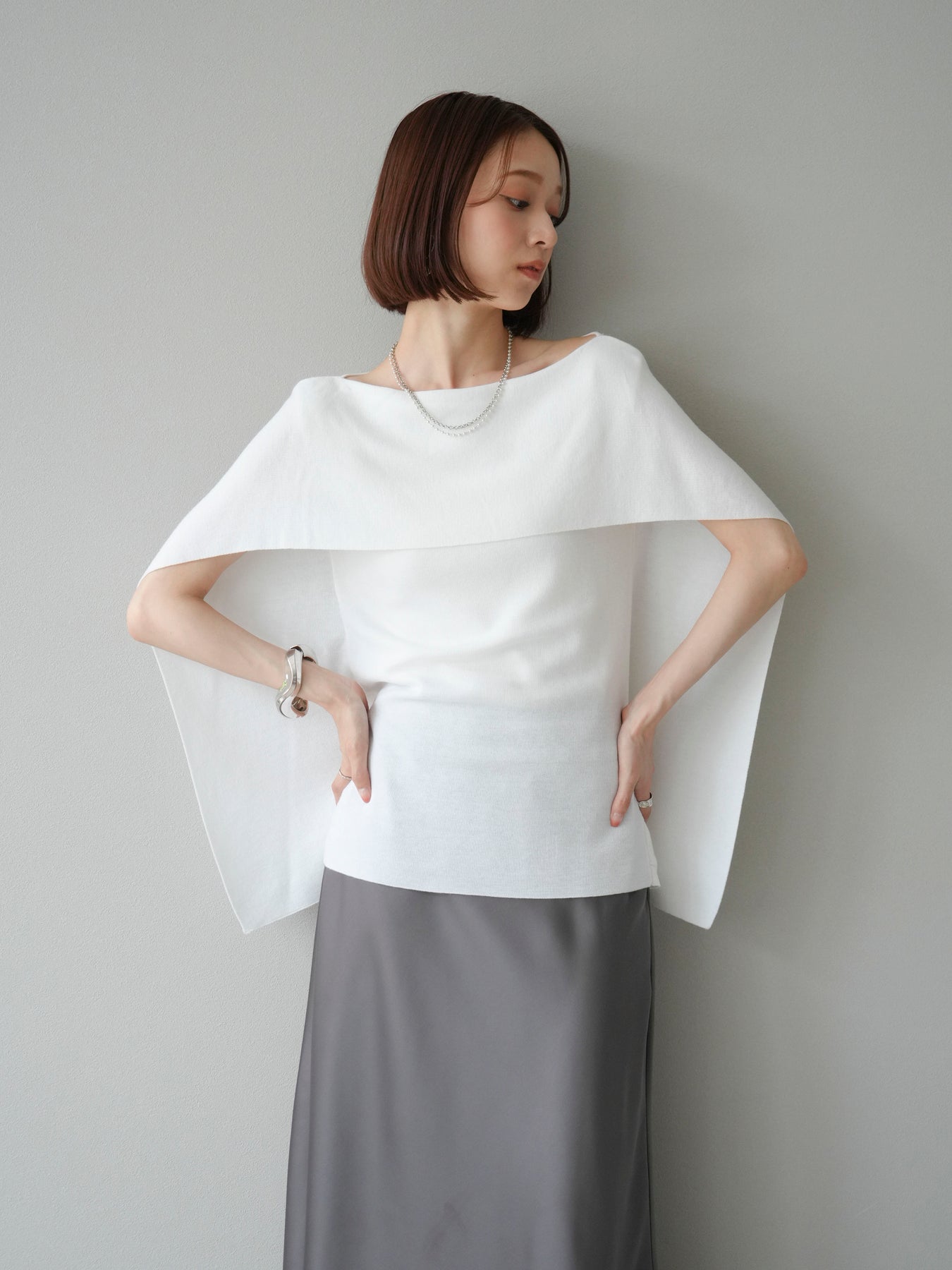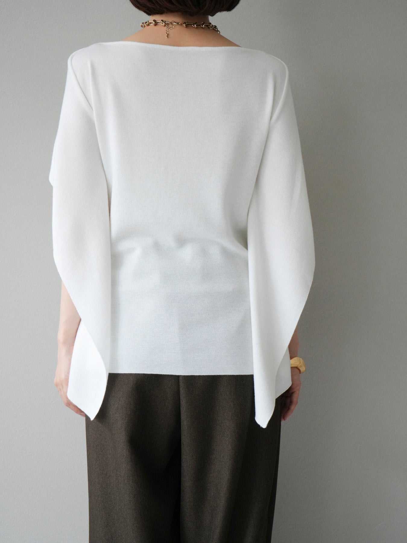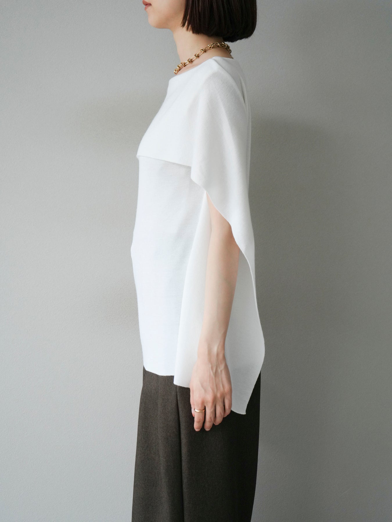 マントのようなシルエットが特徴的なドルマンニット。肩から流れるようなスリットデザインが軽やかさを演出し、シンプルながらもモード感のある一枚に仕上げています。程よくゆとりのあるシルエットで体のラインを拾わず、リラックス感のある着心地を叶えつつ、スタイリングに華やぎをプラス。パンツと合わせてシャープに、スカートに合わせて女性らしくと幅広いコーディネートに対応します。アクセサリーやベルトでアレンジを加えることで、より洗練された雰囲気に仕上がる万能トップスです。 ※ボトムス、キャミソール(インナー)以外の商品は一律でインナーは付属していません。