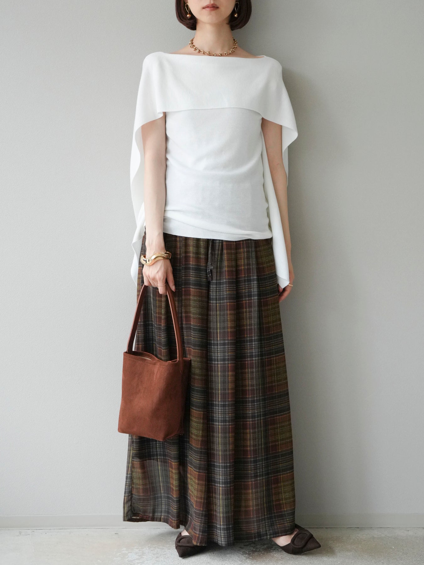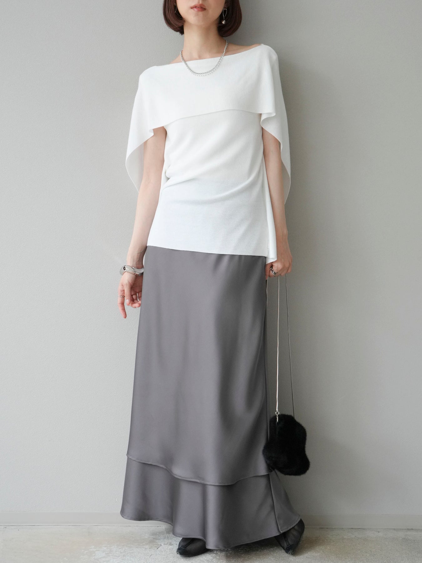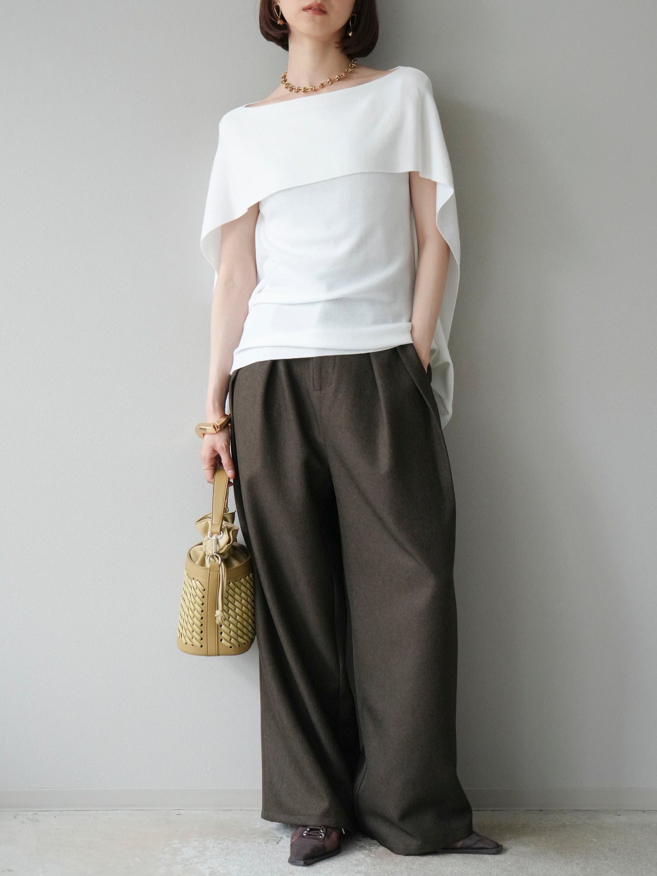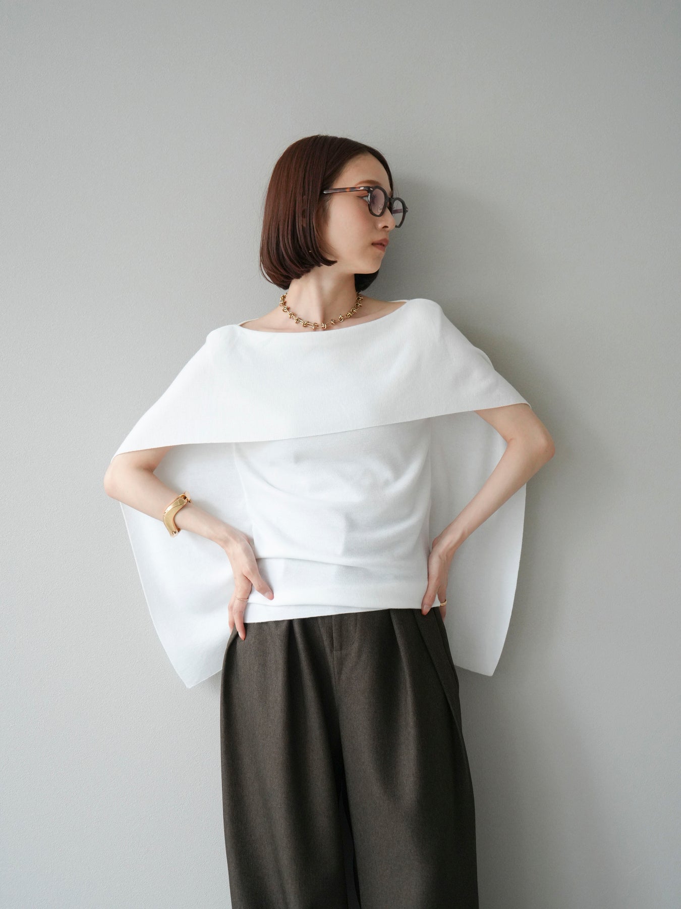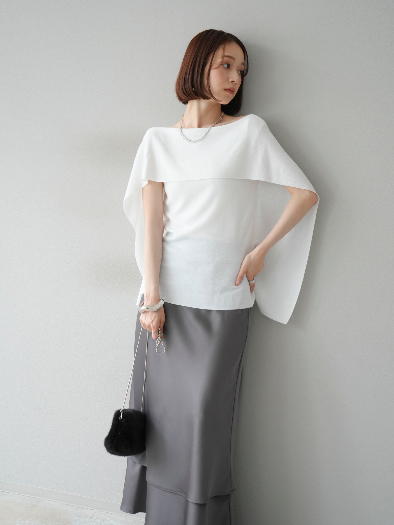 マントのようなシルエットが特徴的なドルマンニット。肩から流れるようなスリットデザインが軽やかさを演出し、シンプルながらもモード感のある一枚に仕上げています。程よくゆとりのあるシルエットで体のラインを拾わず、リラックス感のある着心地を叶えつつ、スタイリングに華やぎをプラス。パンツと合わせてシャープに、スカートに合わせて女性らしくと幅広いコーディネートに対応します。アクセサリーやベルトでアレンジを加えることで、より洗練された雰囲気に仕上がる万能トップスです。 ※ボトムス、キャミソール(インナー)以外の商品は一律でインナーは付属していません。
