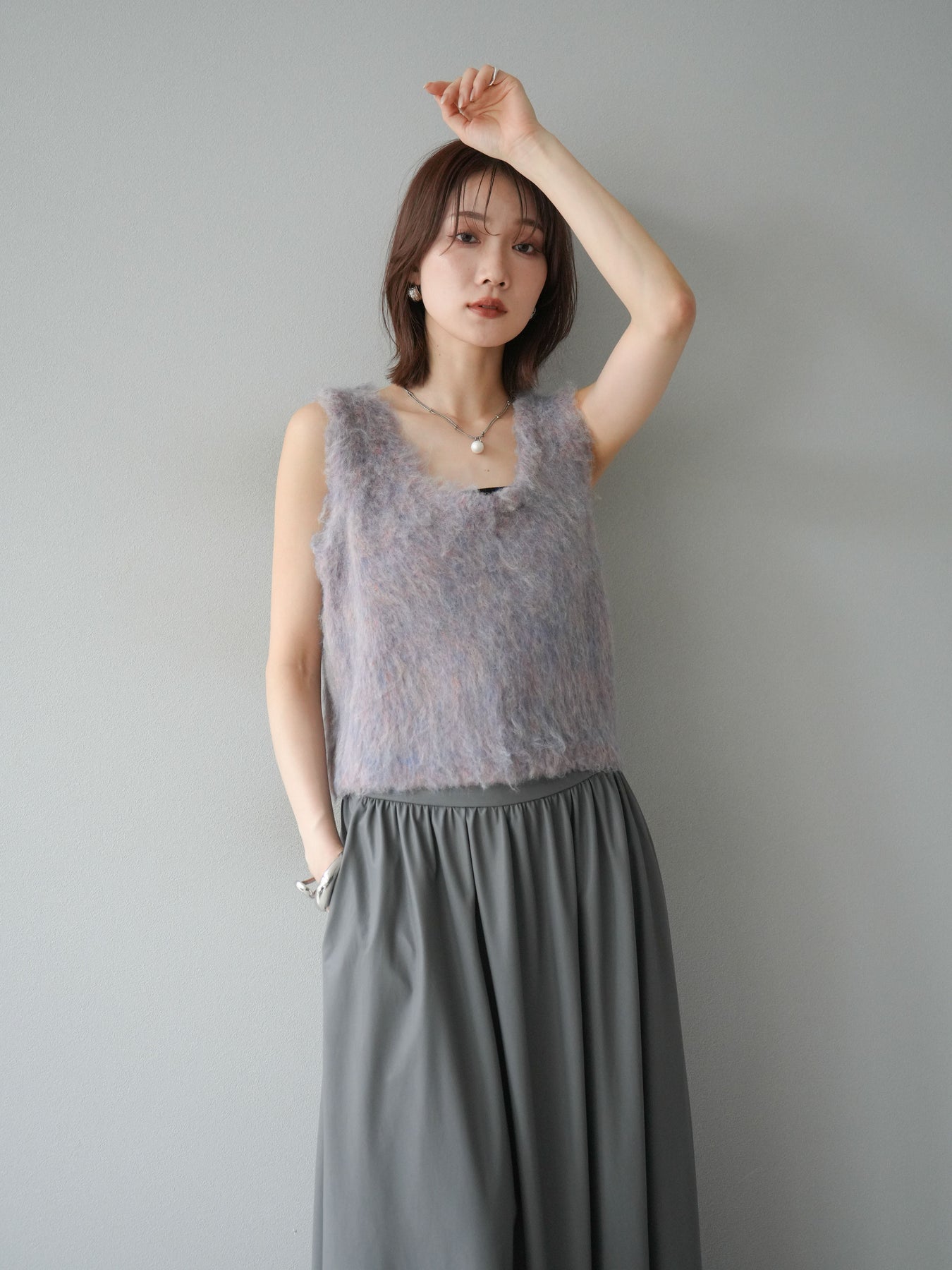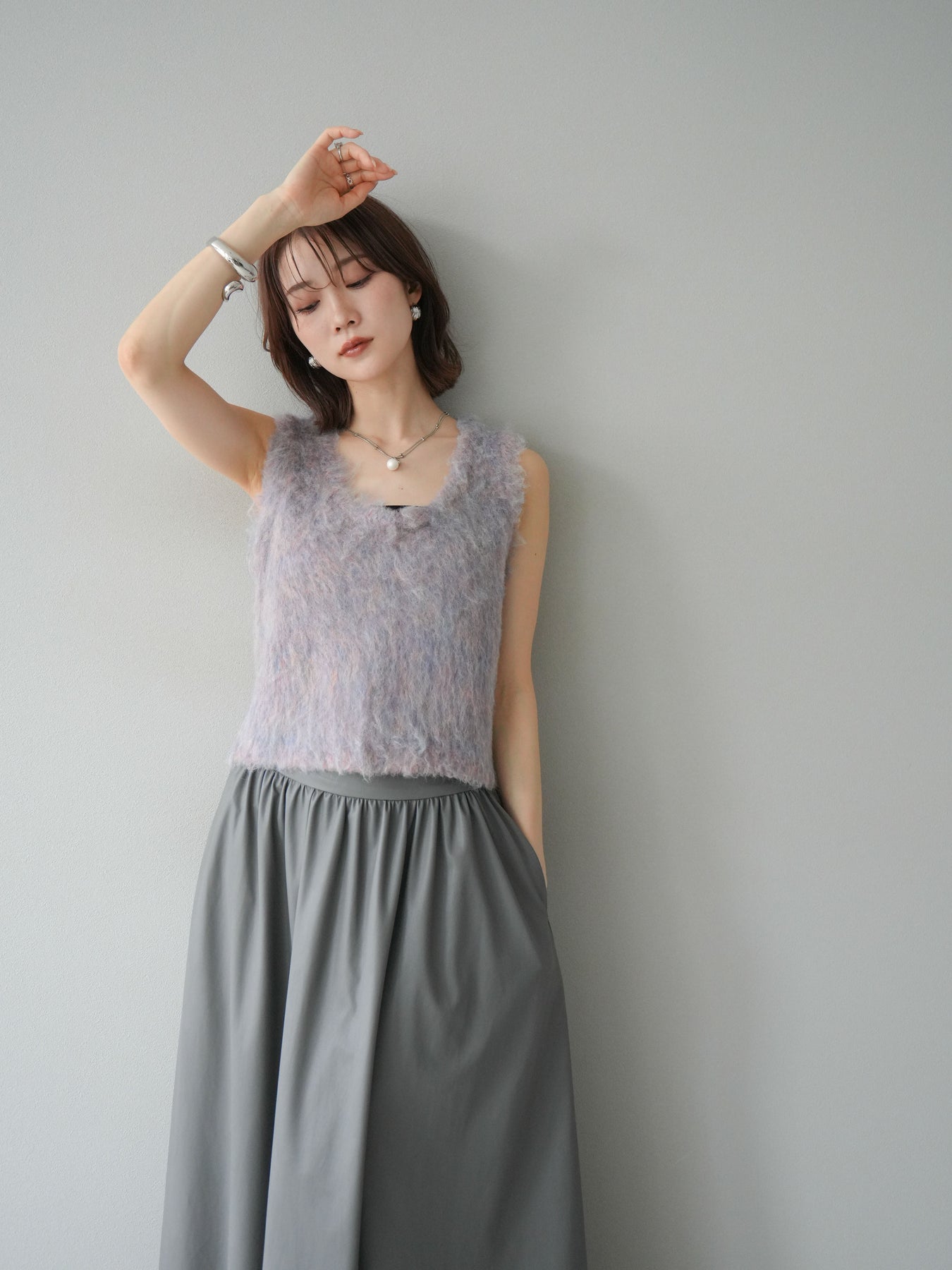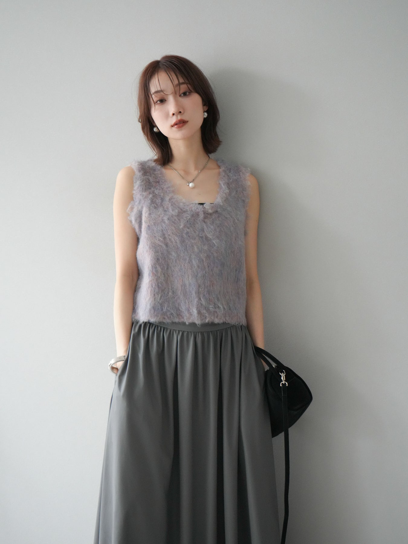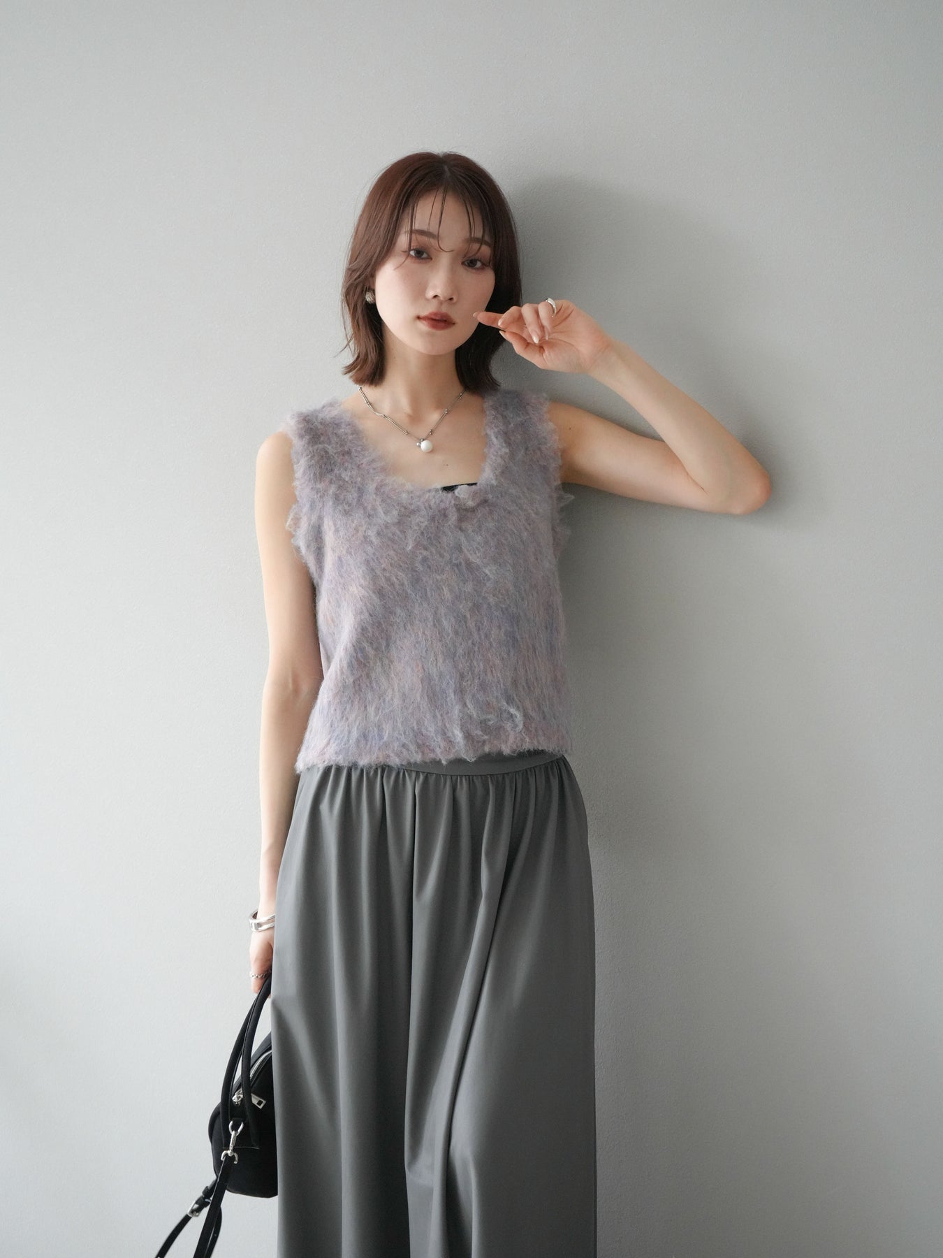 ふんわりとしたシャギー素材をミックスカラーで仕上げたUネックベスト。柔らかな毛足が表情豊かで、スタイリングに季節感と華やかさをプラスします。コンパクトな丈感でレイヤードがしやすく、シャツやワンピースに重ねるだけで旬なスタイルが完成。1枚で着ても存在感があり、秋冬のコーディネートを彩るアイテムです。 ※ボトムス、キャミソール(インナー)以外の商品は一律でインナーは付属していません。