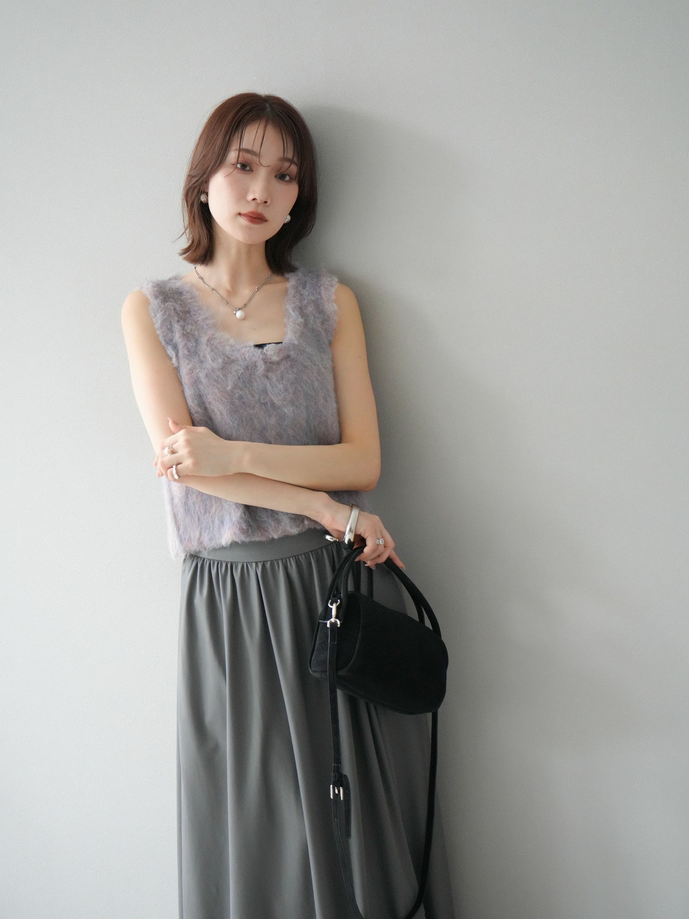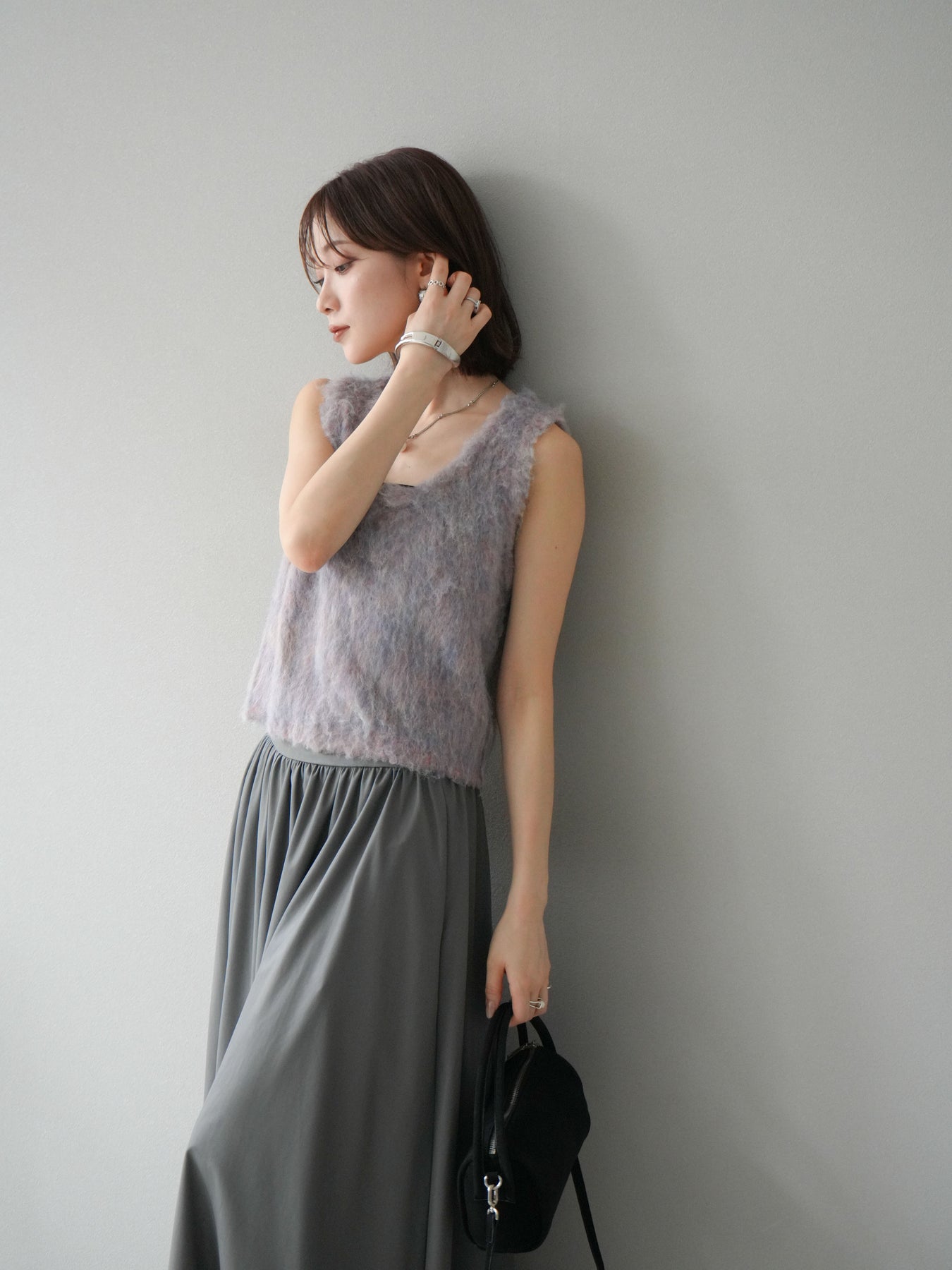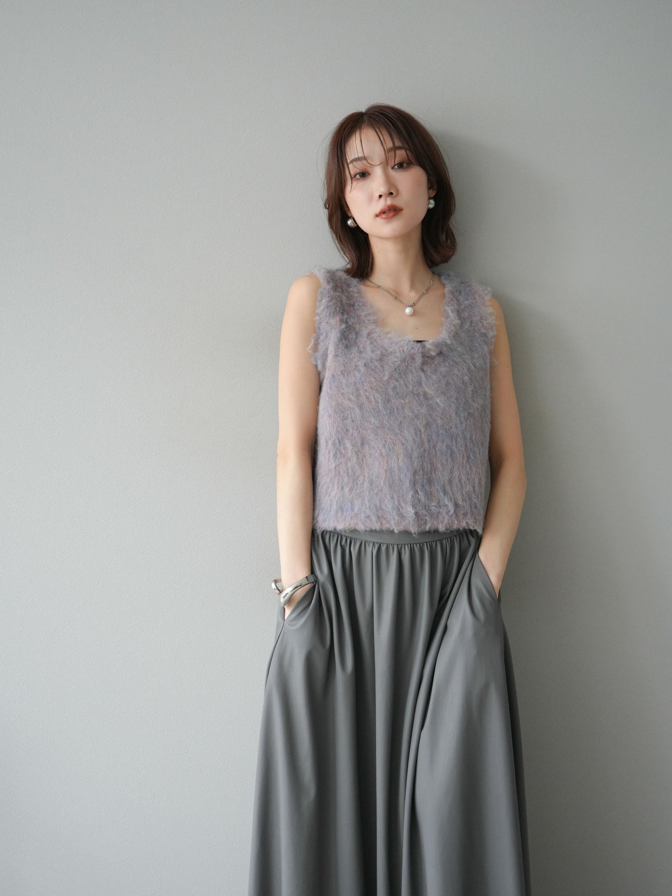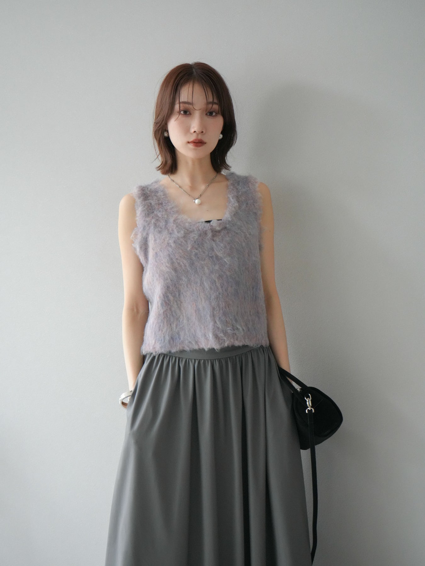 ふんわりとしたシャギー素材をミックスカラーで仕上げたUネックベスト。柔らかな毛足が表情豊かで、スタイリングに季節感と華やかさをプラスします。コンパクトな丈感でレイヤードがしやすく、シャツやワンピースに重ねるだけで旬なスタイルが完成。1枚で着ても存在感があり、秋冬のコーディネートを彩るアイテムです。 ※ボトムス、キャミソール(インナー)以外の商品は一律でインナーは付属していません。