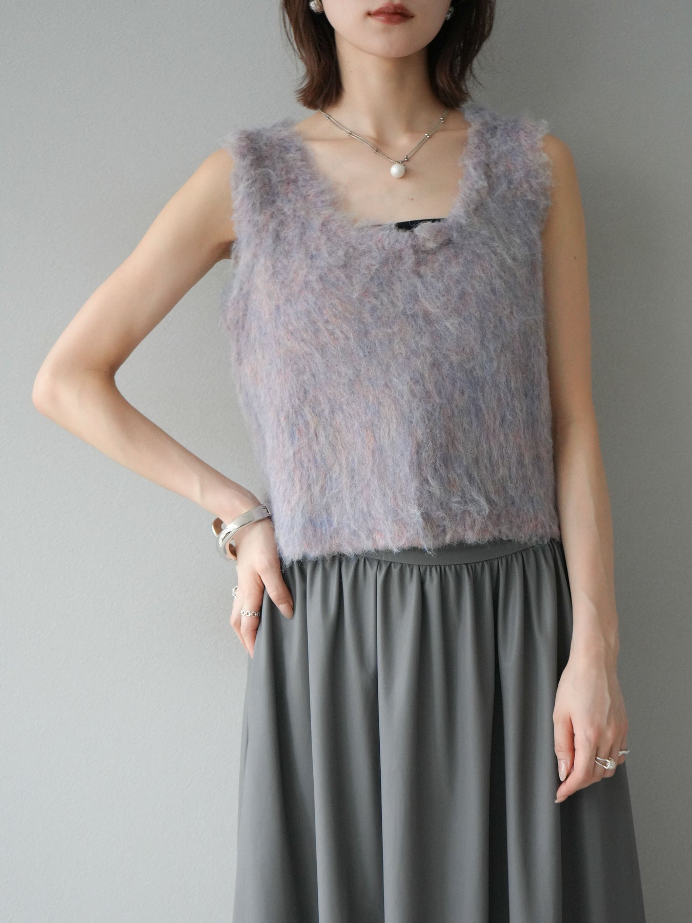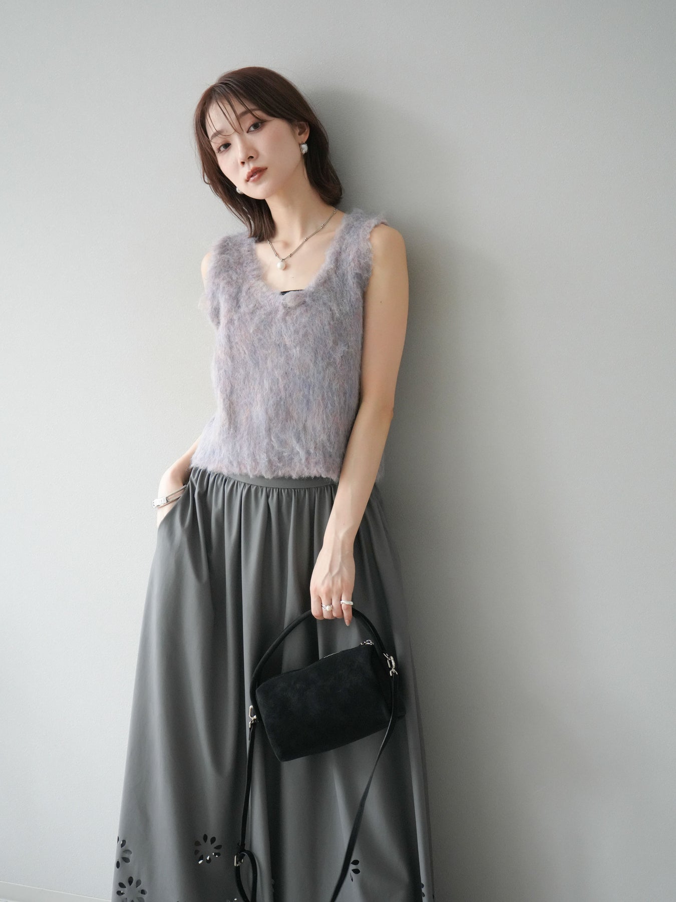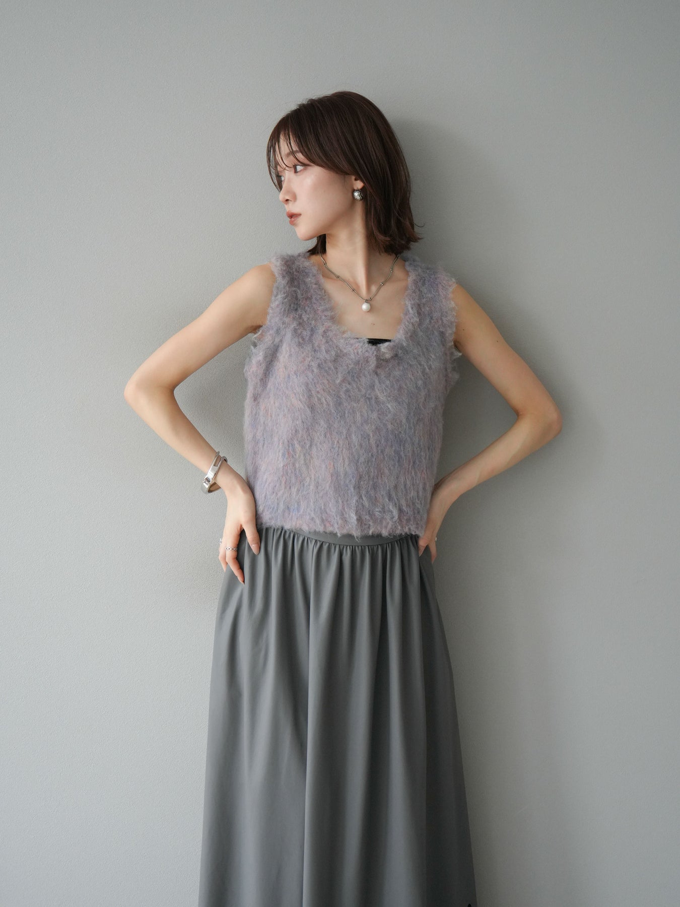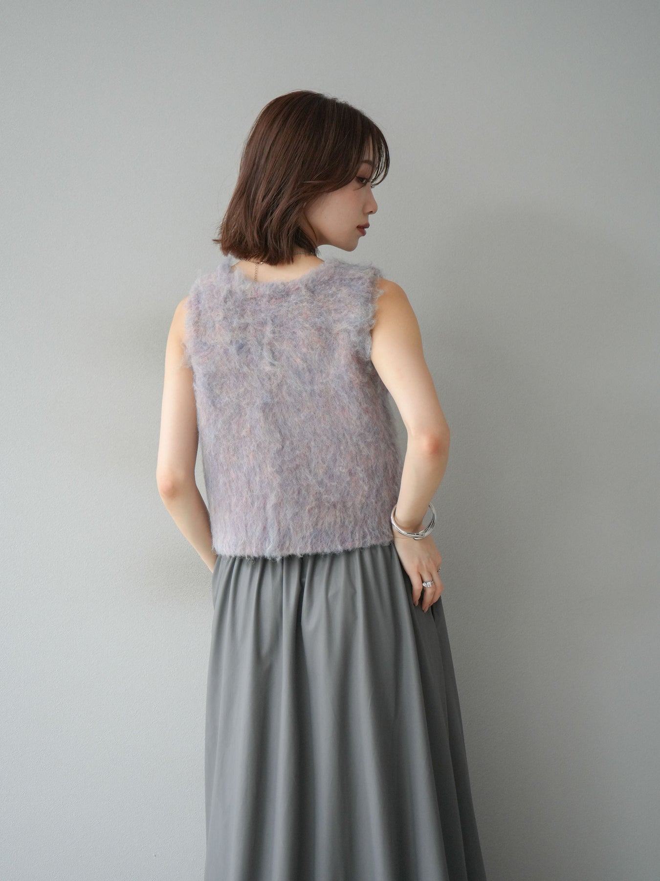 ふんわりとしたシャギー素材をミックスカラーで仕上げたUネックベスト。柔らかな毛足が表情豊かで、スタイリングに季節感と華やかさをプラスします。コンパクトな丈感でレイヤードがしやすく、シャツやワンピースに重ねるだけで旬なスタイルが完成。1枚で着ても存在感があり、秋冬のコーディネートを彩るアイテムです。 ※ボトムス、キャミソール(インナー)以外の商品は一律でインナーは付属していません。