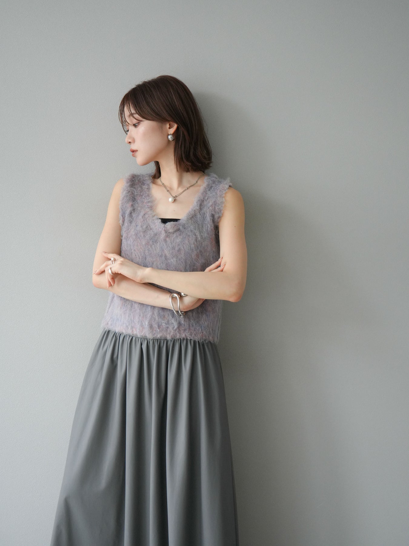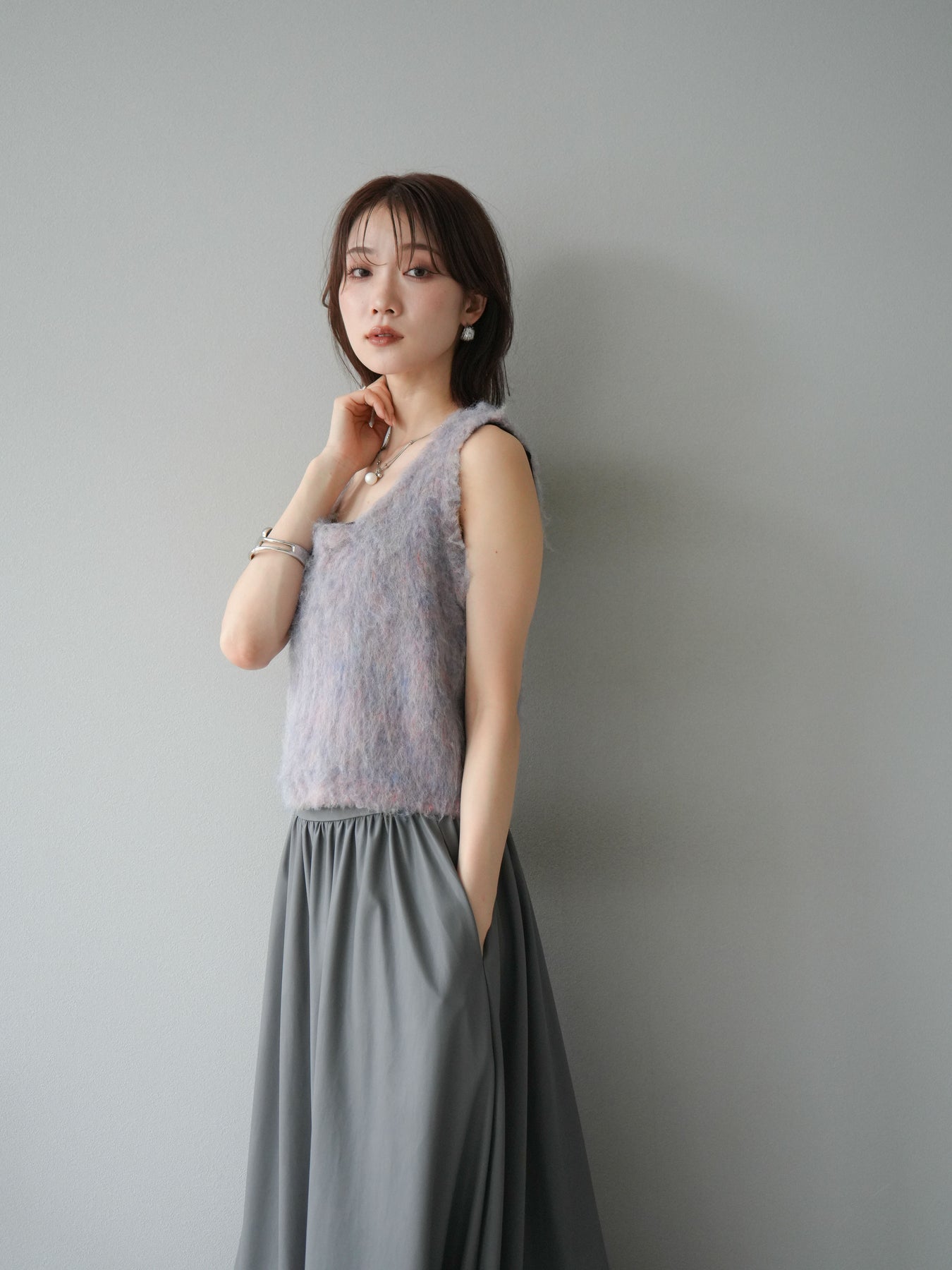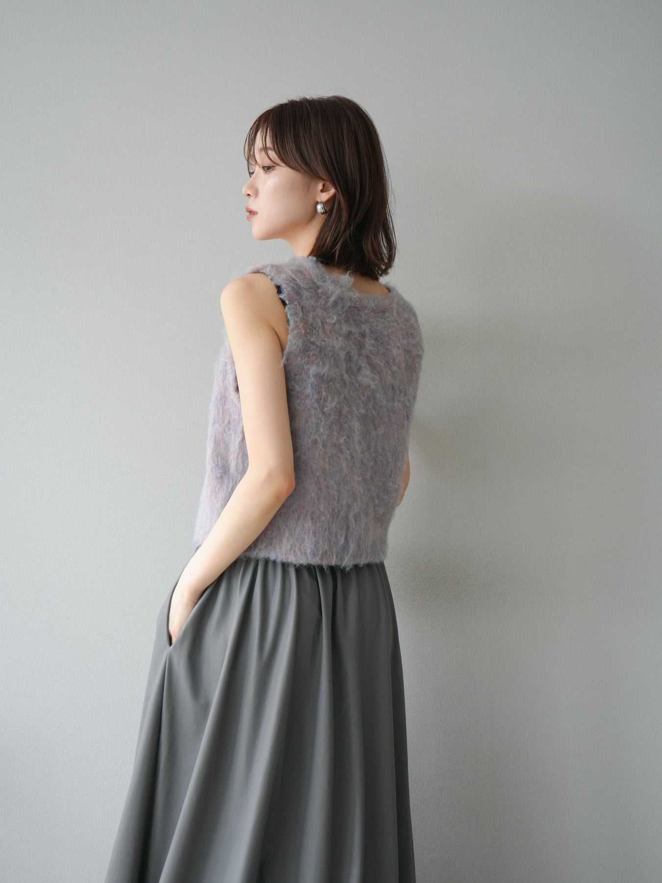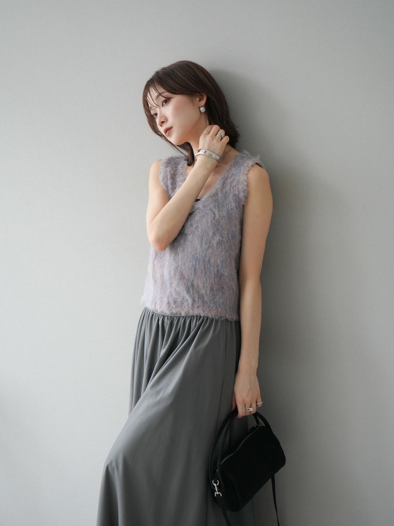 ふんわりとしたシャギー素材をミックスカラーで仕上げたUネックベスト。柔らかな毛足が表情豊かで、スタイリングに季節感と華やかさをプラスします。コンパクトな丈感でレイヤードがしやすく、シャツやワンピースに重ねるだけで旬なスタイルが完成。1枚で着ても存在感があり、秋冬のコーディネートを彩るアイテムです。 ※ボトムス、キャミソール(インナー)以外の商品は一律でインナーは付属していません。
