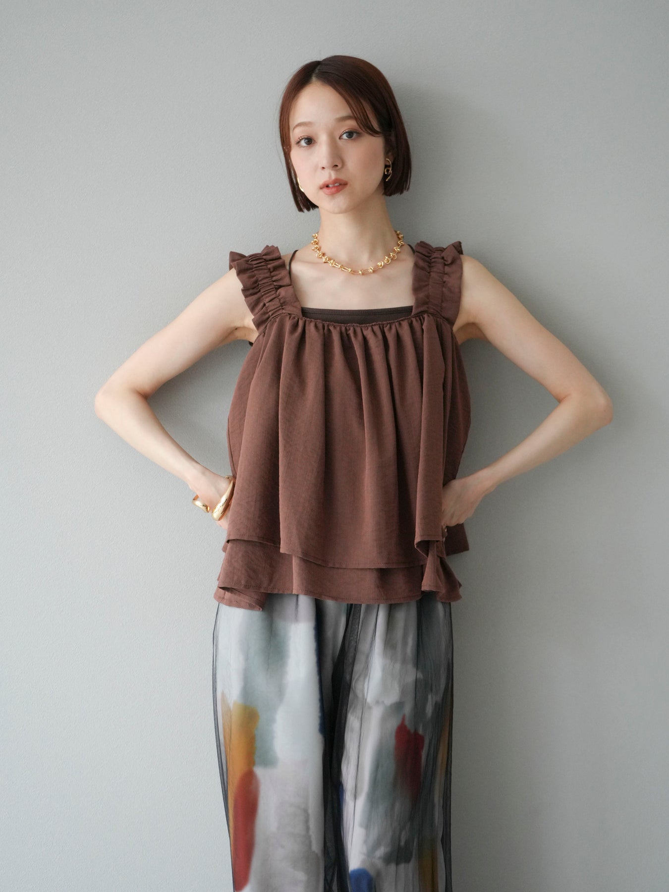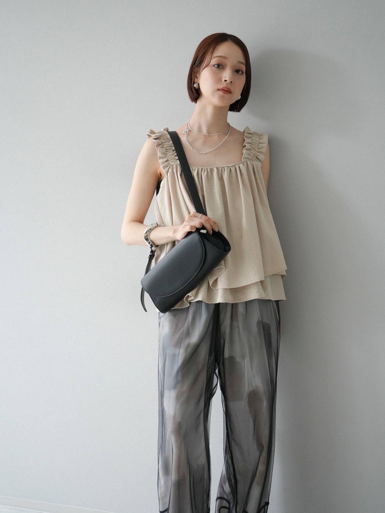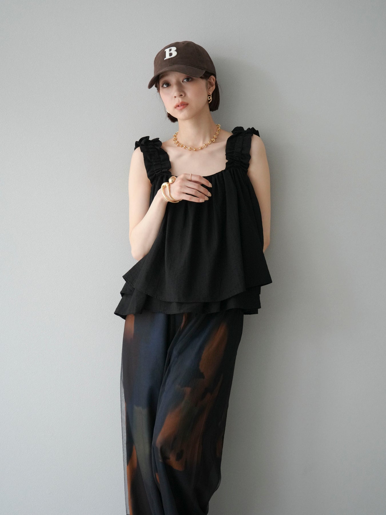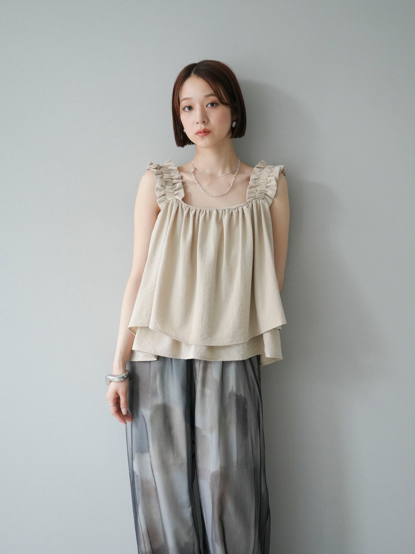 肩部飾有褶飾的背心。柔和的喇叭輪廓凸顯女性魅力,單穿即可打造華麗造型。柔滑的布料帶來清涼感。百搭單品,可輕鬆搭配褲裝和裙裝。 ※除下裝、吊帶背心(內衣)以外的商品均為標準品,不含內衣。