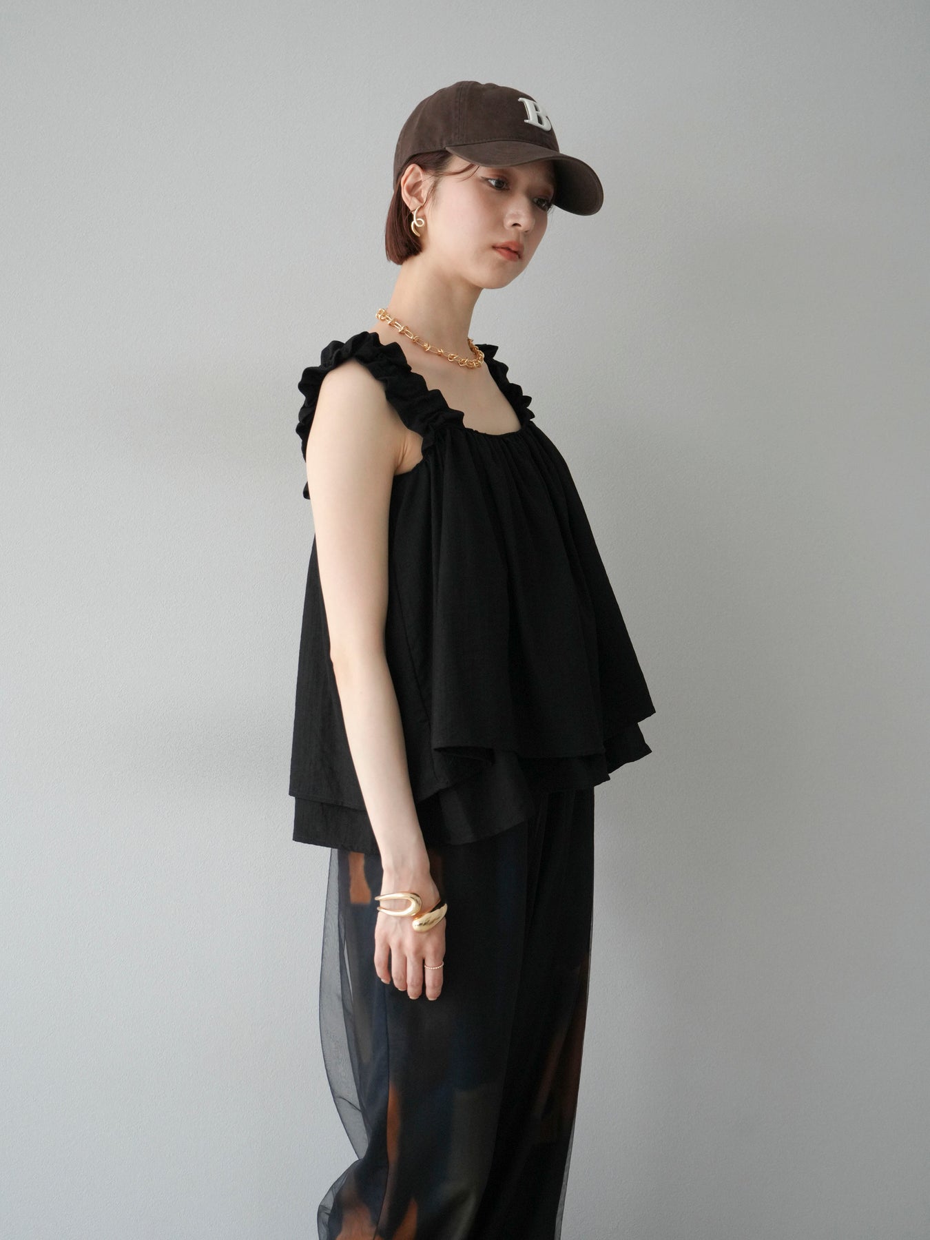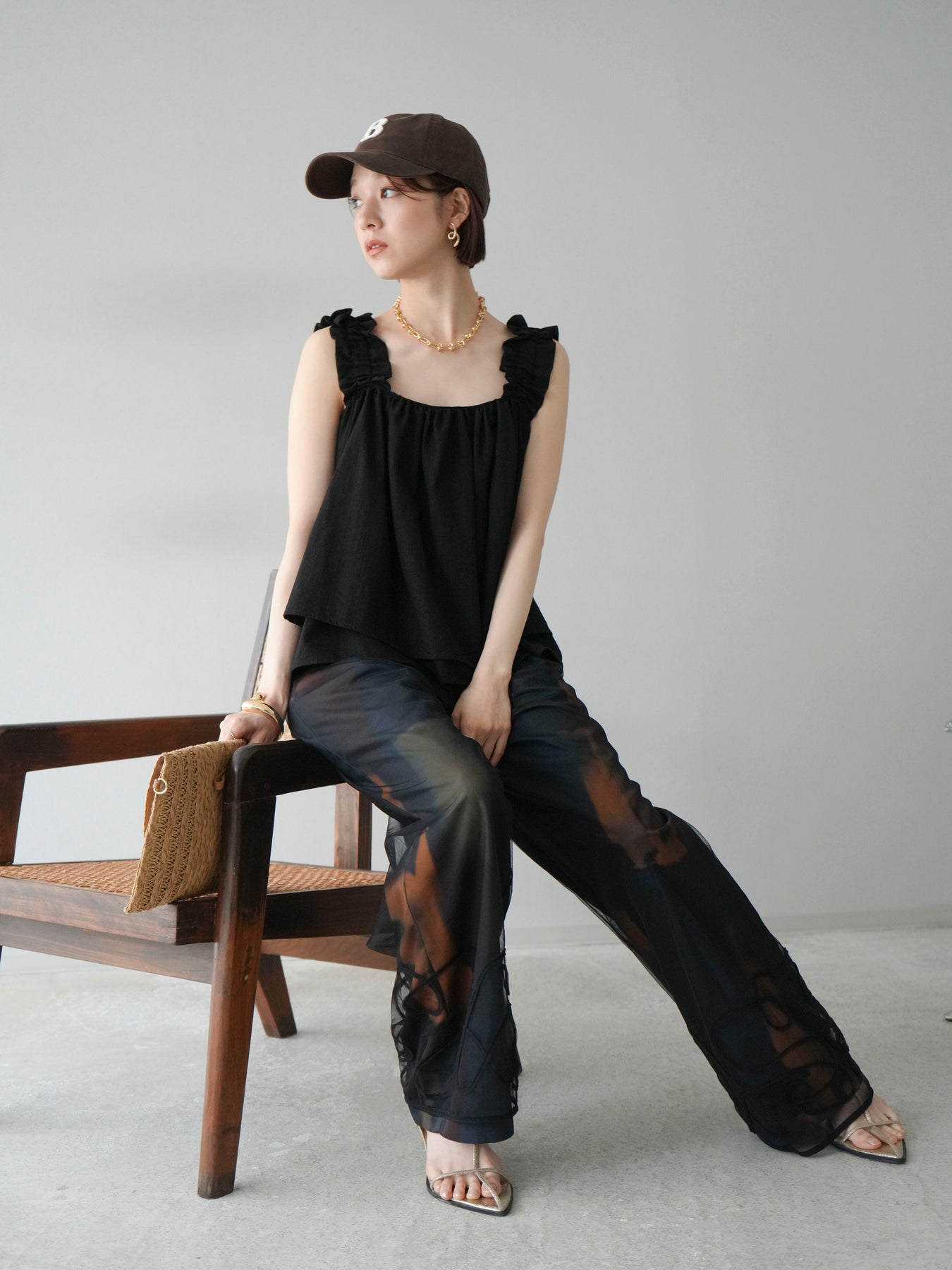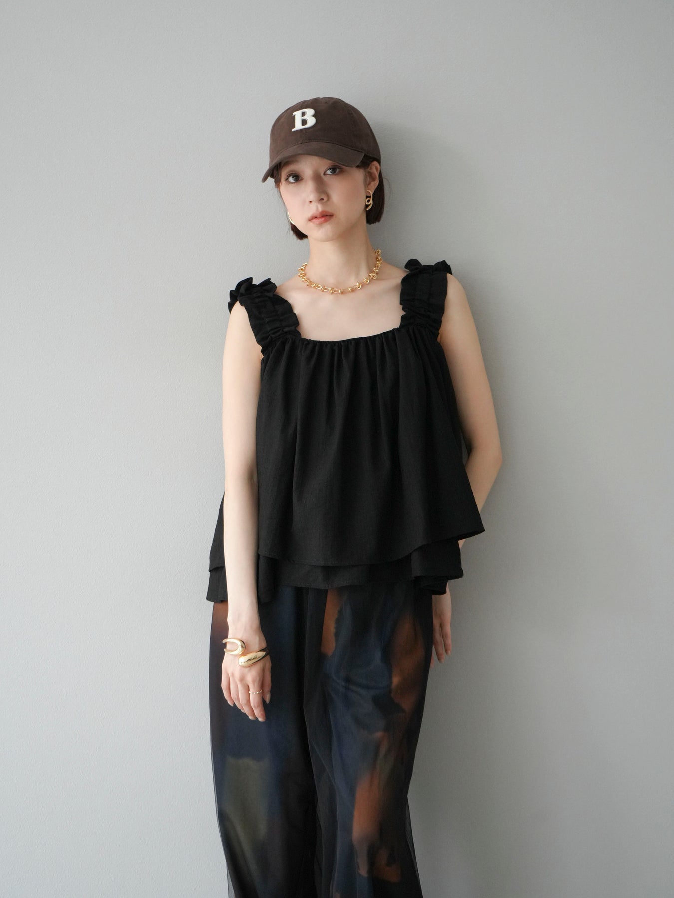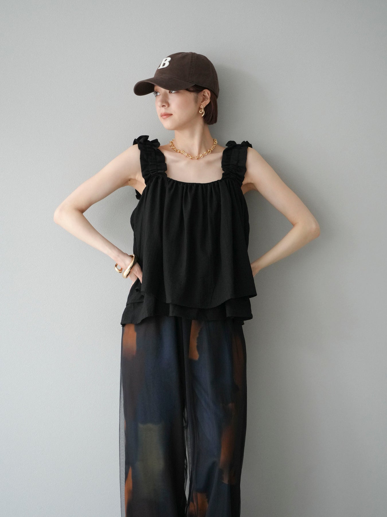 肩部飾有褶飾的背心。柔和的喇叭輪廓凸顯女性魅力,單穿即可打造華麗造型。柔滑的布料帶來清涼感。百搭單品,可輕鬆搭配褲裝和裙裝。 ※除下裝、吊帶背心(內衣)以外的商品均為標準品,不含內衣。