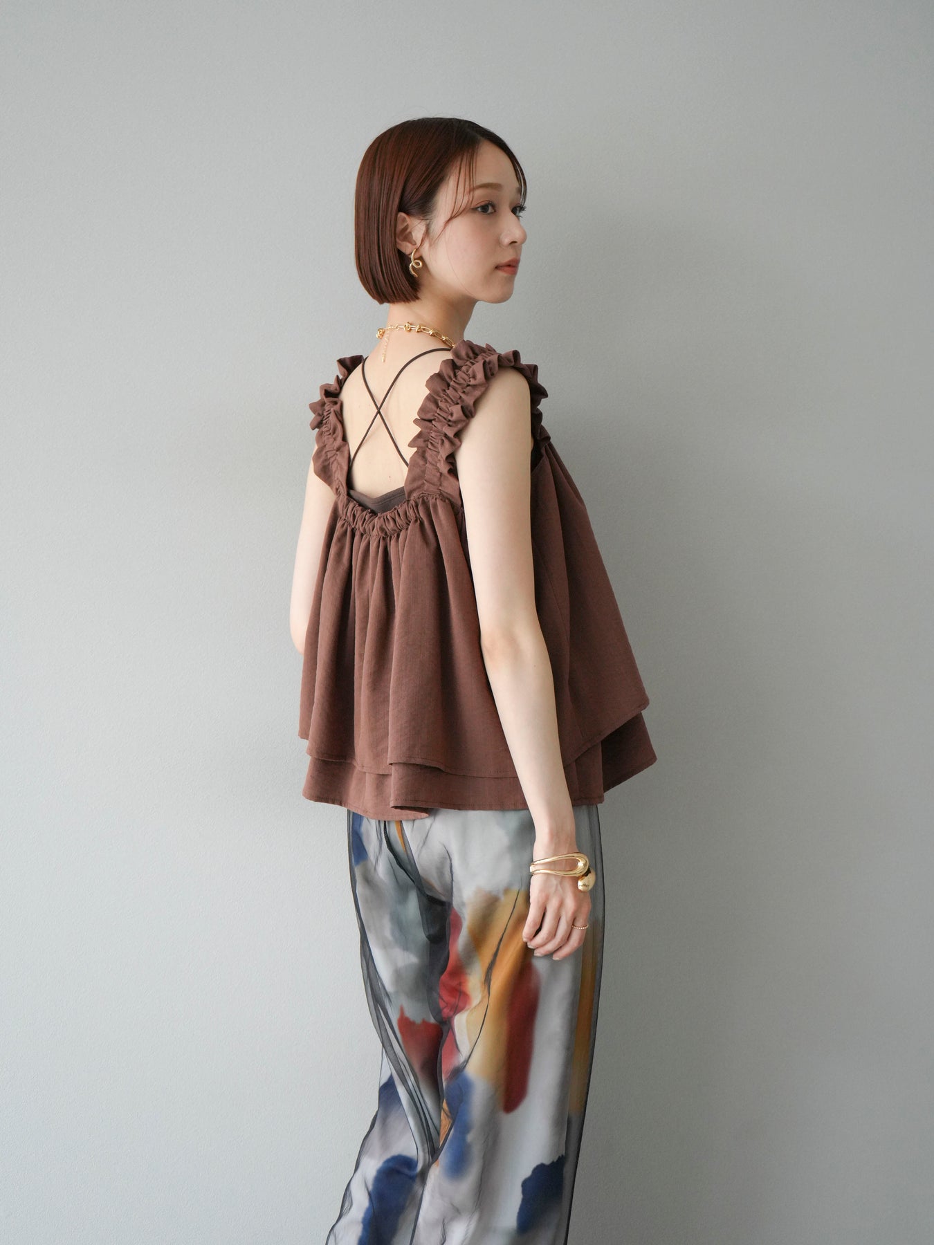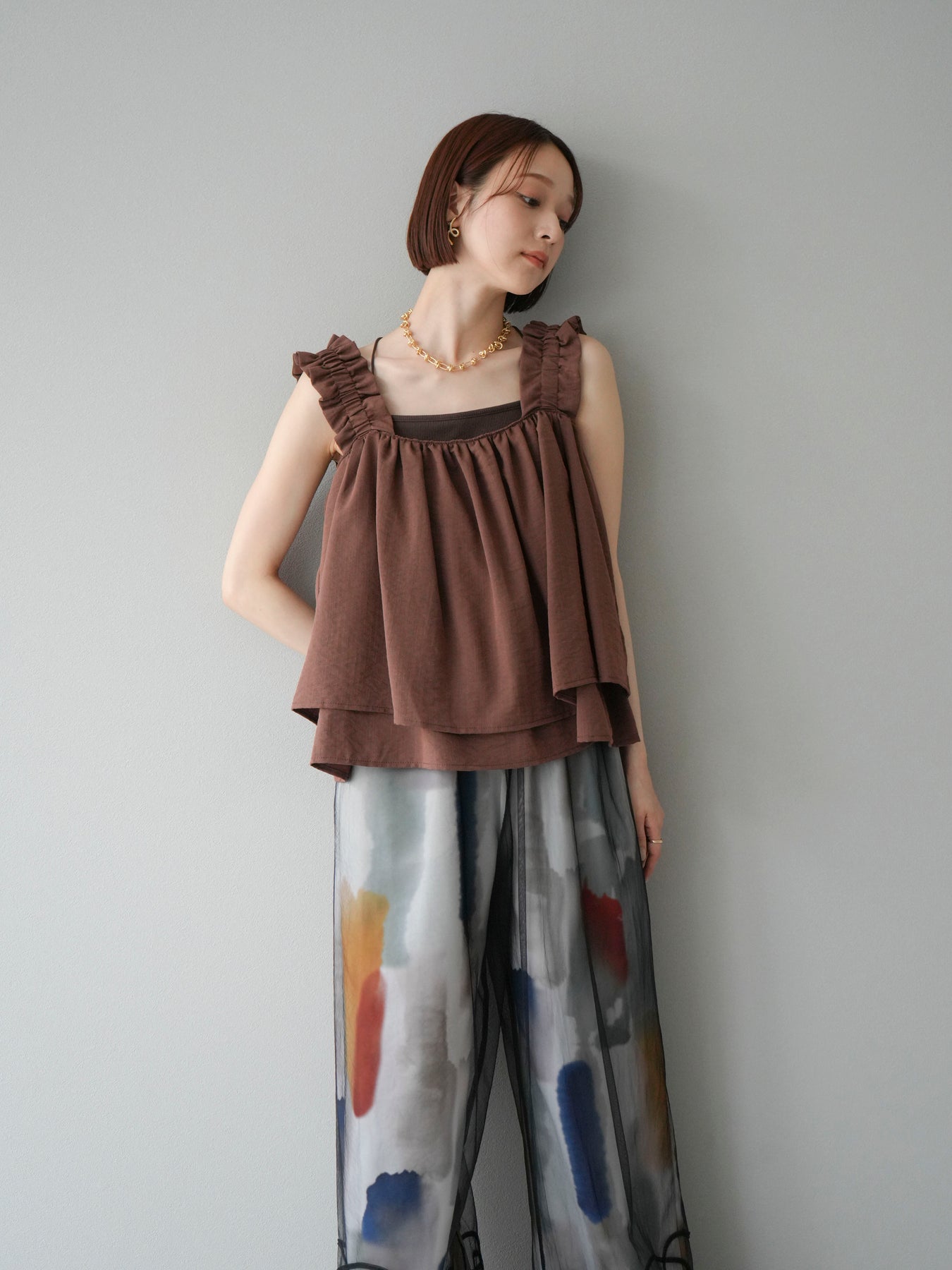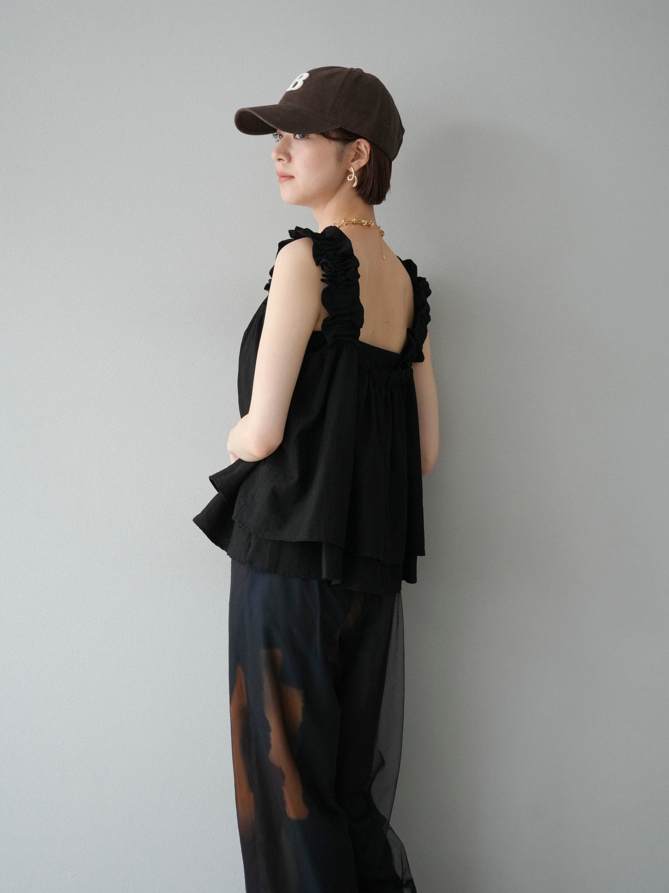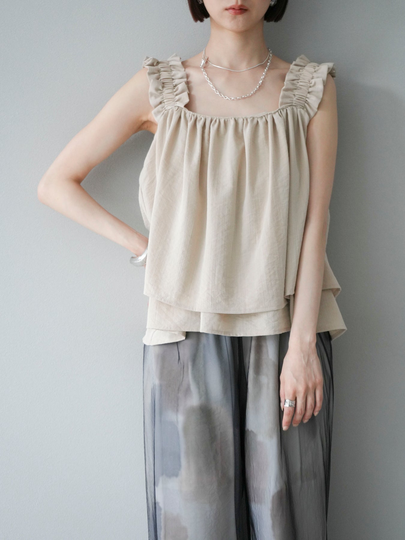肩部飾有褶飾的背心。柔和的喇叭輪廓凸顯女性魅力,單穿即可打造華麗造型。柔滑的布料帶來清涼感。百搭單品,可輕鬆搭配褲裝和裙裝。 ※除下裝、吊帶背心(內衣)以外的商品均為標準品,不含內衣。