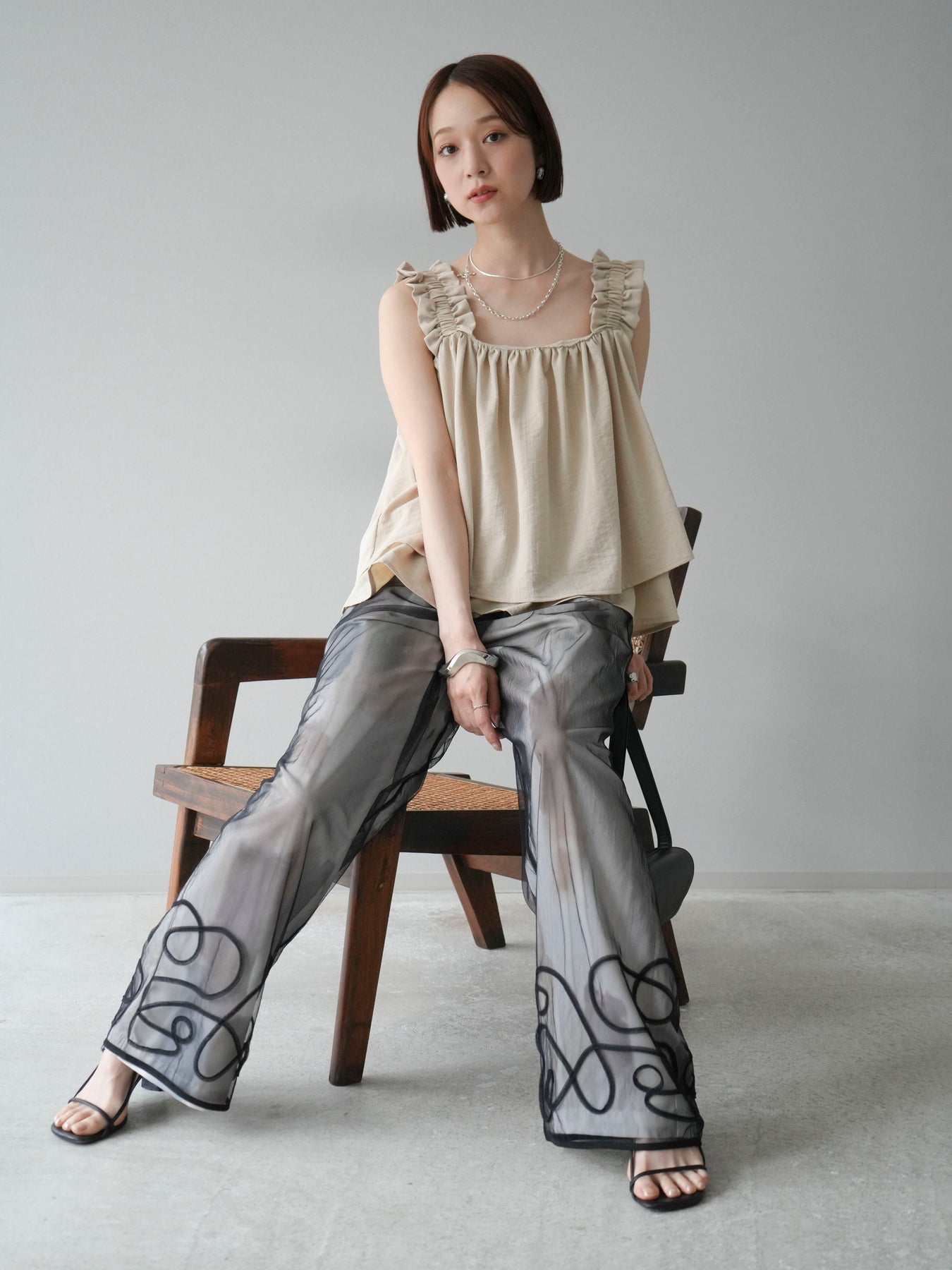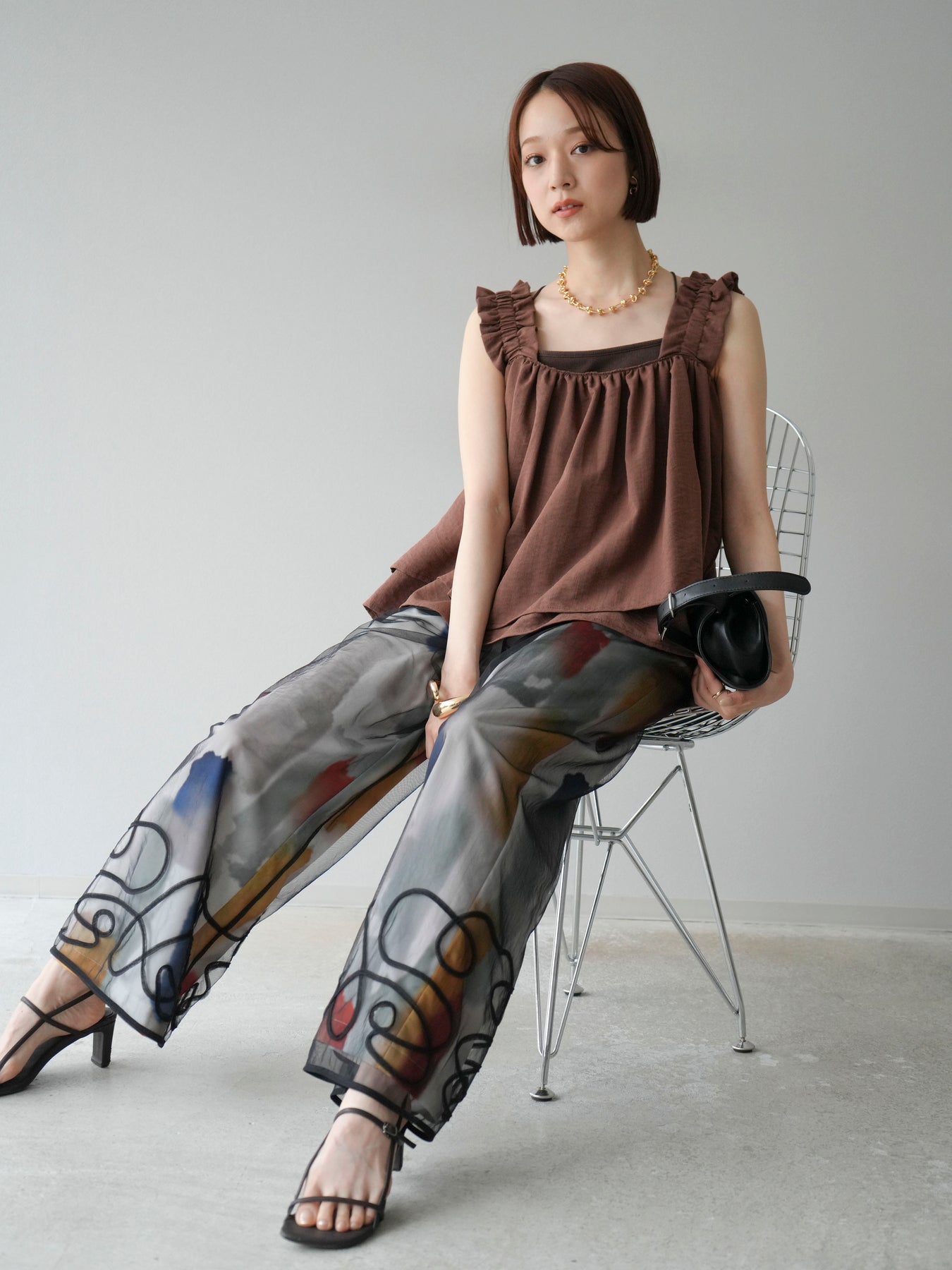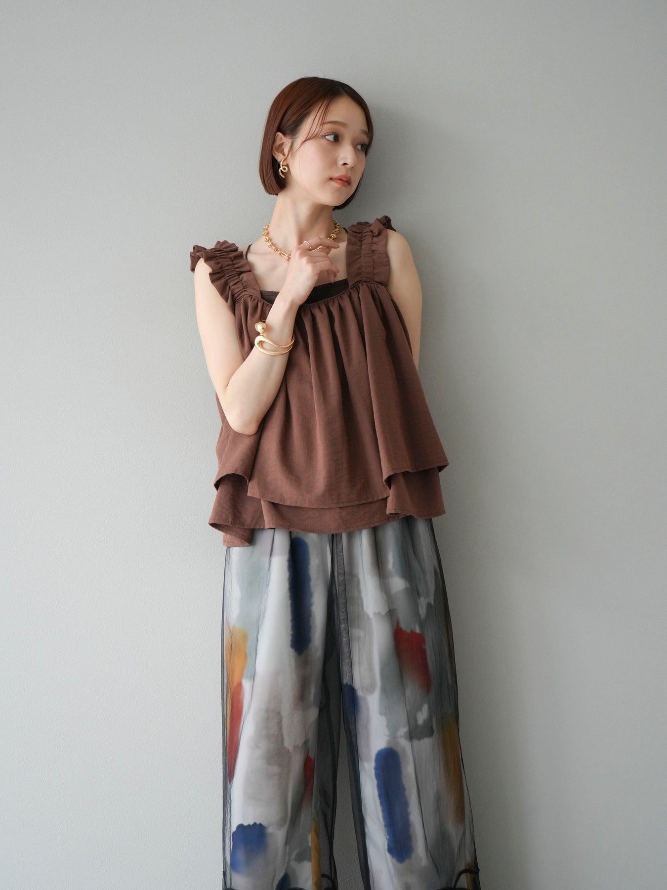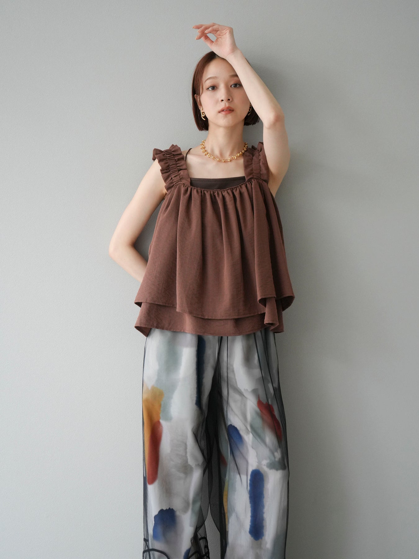 肩部飾有褶飾的背心。柔和的喇叭輪廓凸顯女性魅力,單穿即可打造華麗造型。柔滑的布料帶來清涼感。百搭單品,可輕鬆搭配褲裝和裙裝。 ※除下裝、吊帶背心(內衣)以外的商品均為標準品,不含內衣。