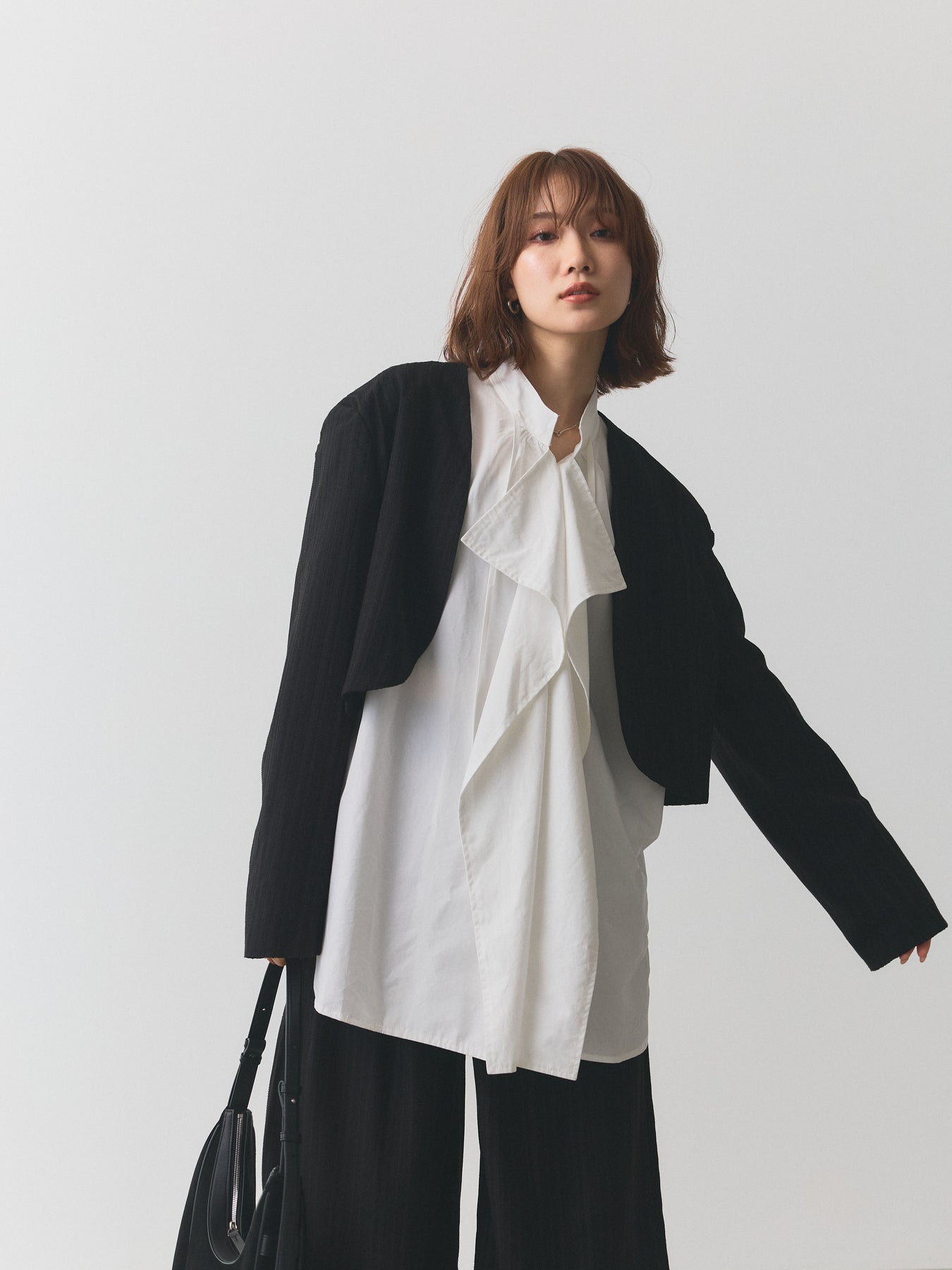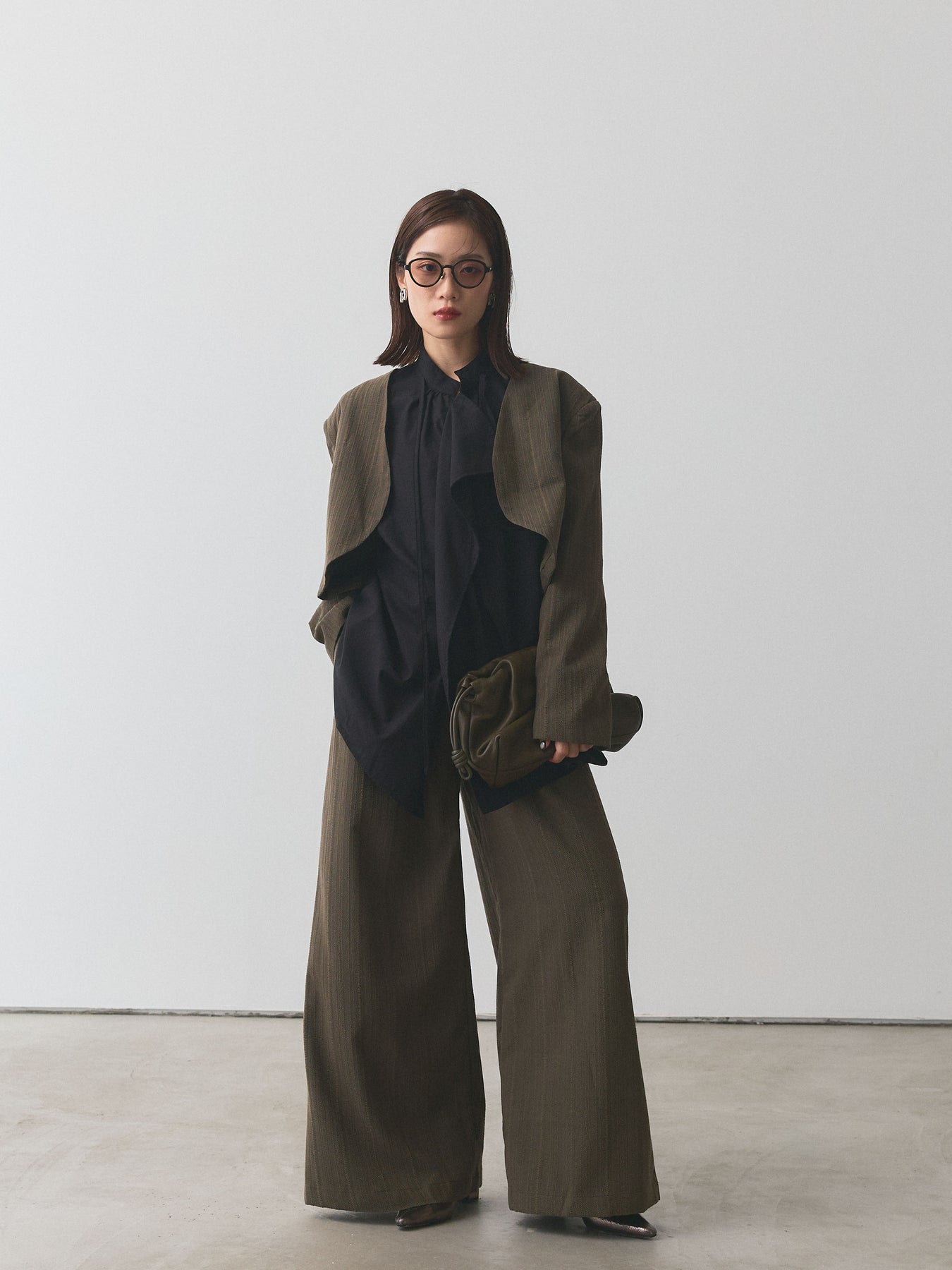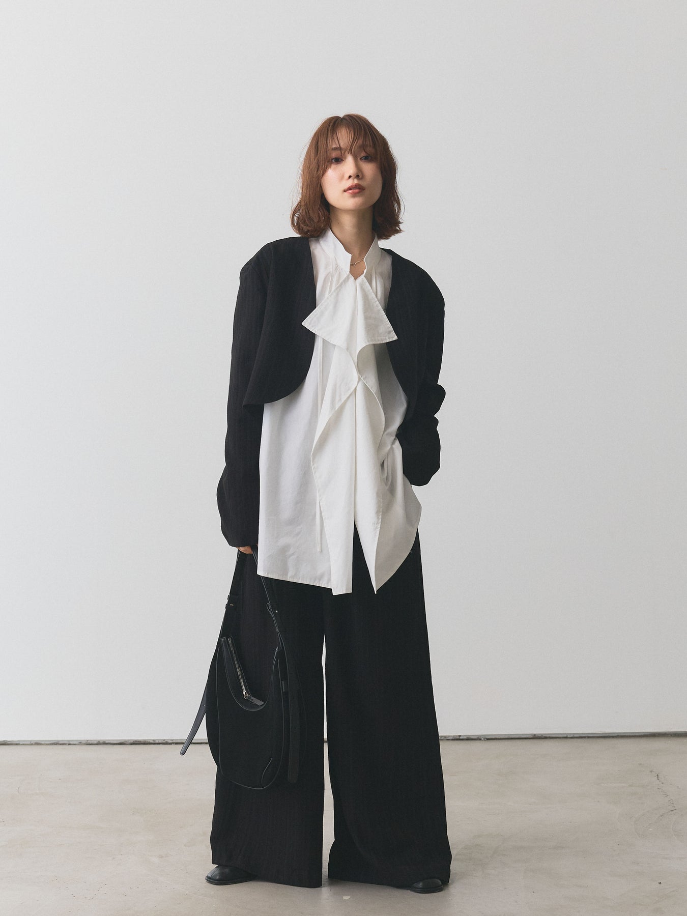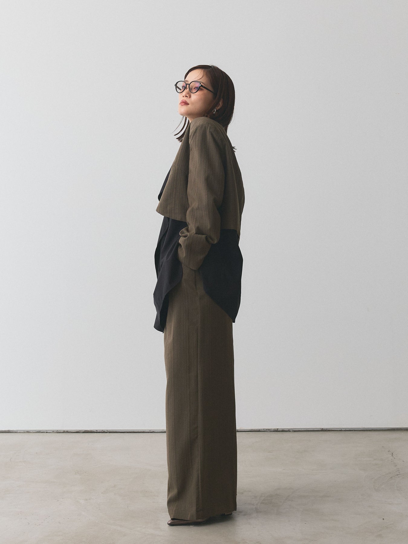 クラシカルなヘリンボーン柄で仕立てたショートジャケットとワイドパンツのセットアップ。ジャケットはコンパクトな着丈でバランスが取りやすく、パンツは落ち感のあるシルエットで脚長効果を演出します。セットで着用すれば洗練されたスタイリングが完成し、それぞれ単品でも着回せるのが魅力。オンオフ問わず幅広いシーンで活躍する、大人のワードローブに取り入れたいアイテムです。