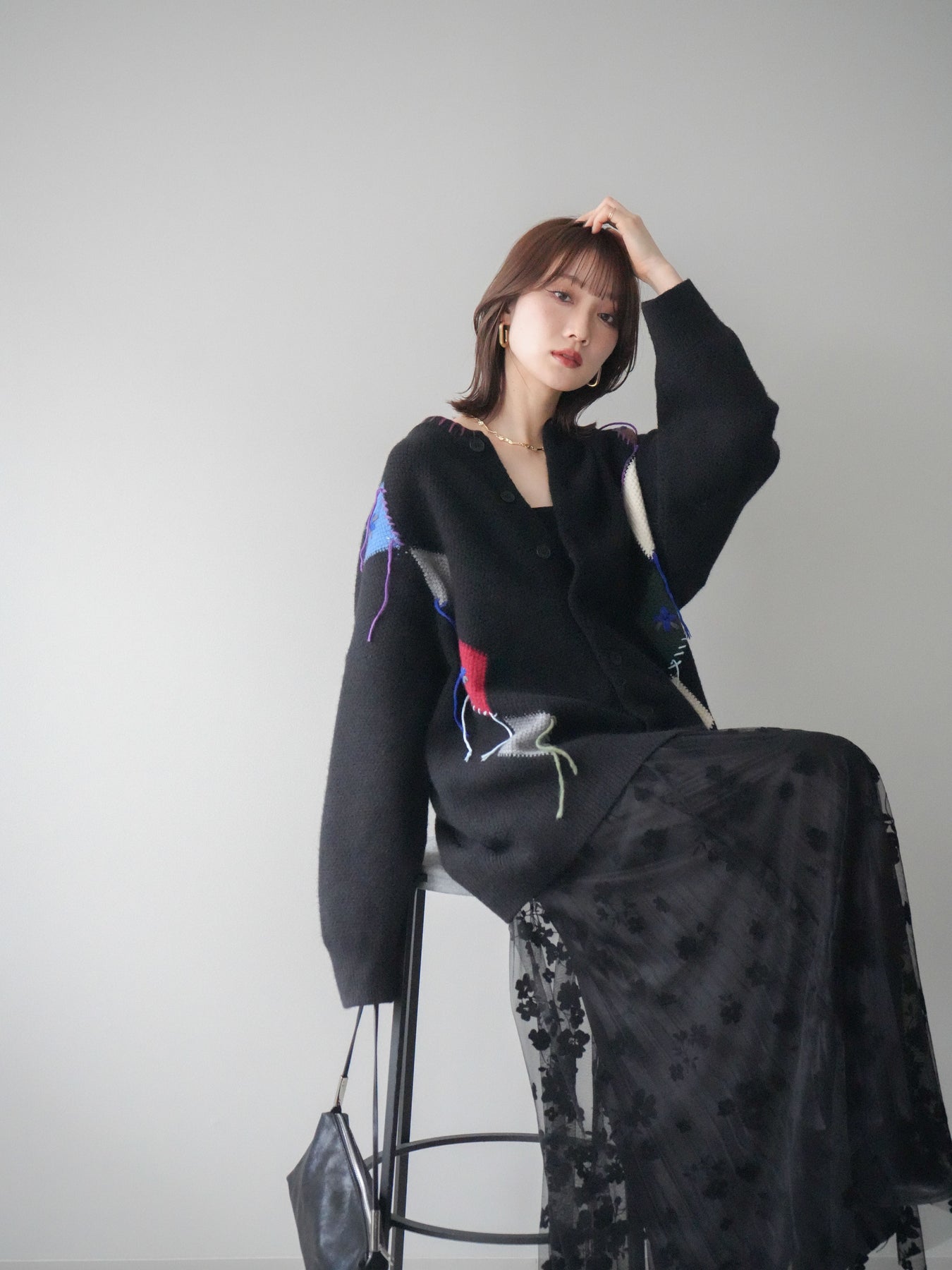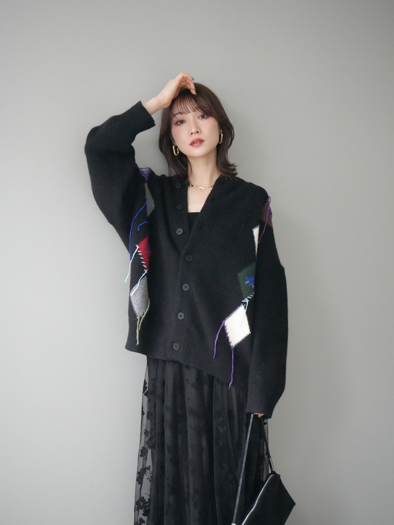 異素材の編地とハンドステッチ風のディテールを組み合わせた、存在感あふれるアーガイルデザインのニットカーディガン。色や質感の異なるパッチワークのような装飾が視覚的な楽しさを加え、1枚で主役になる着映えアイテムに仕上がっています。ゆったりとしたシルエットと柔らかなニット素材がリラックスした着心地を叶えつつ、フロントのボタンで着こなしのアレンジも自在。シンプルなボトムスに合わせるだけでスタイルが完成する、個性と暖かみを兼ね備えた一枚です。 ※ボトムス、キャミソール(インナー)以外の商品は一律でインナーは付属していません。