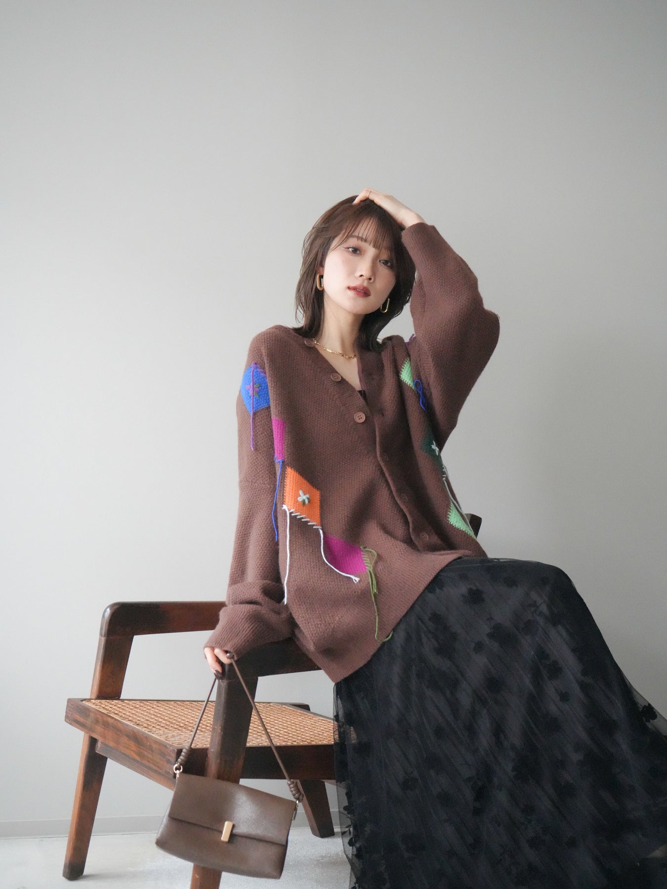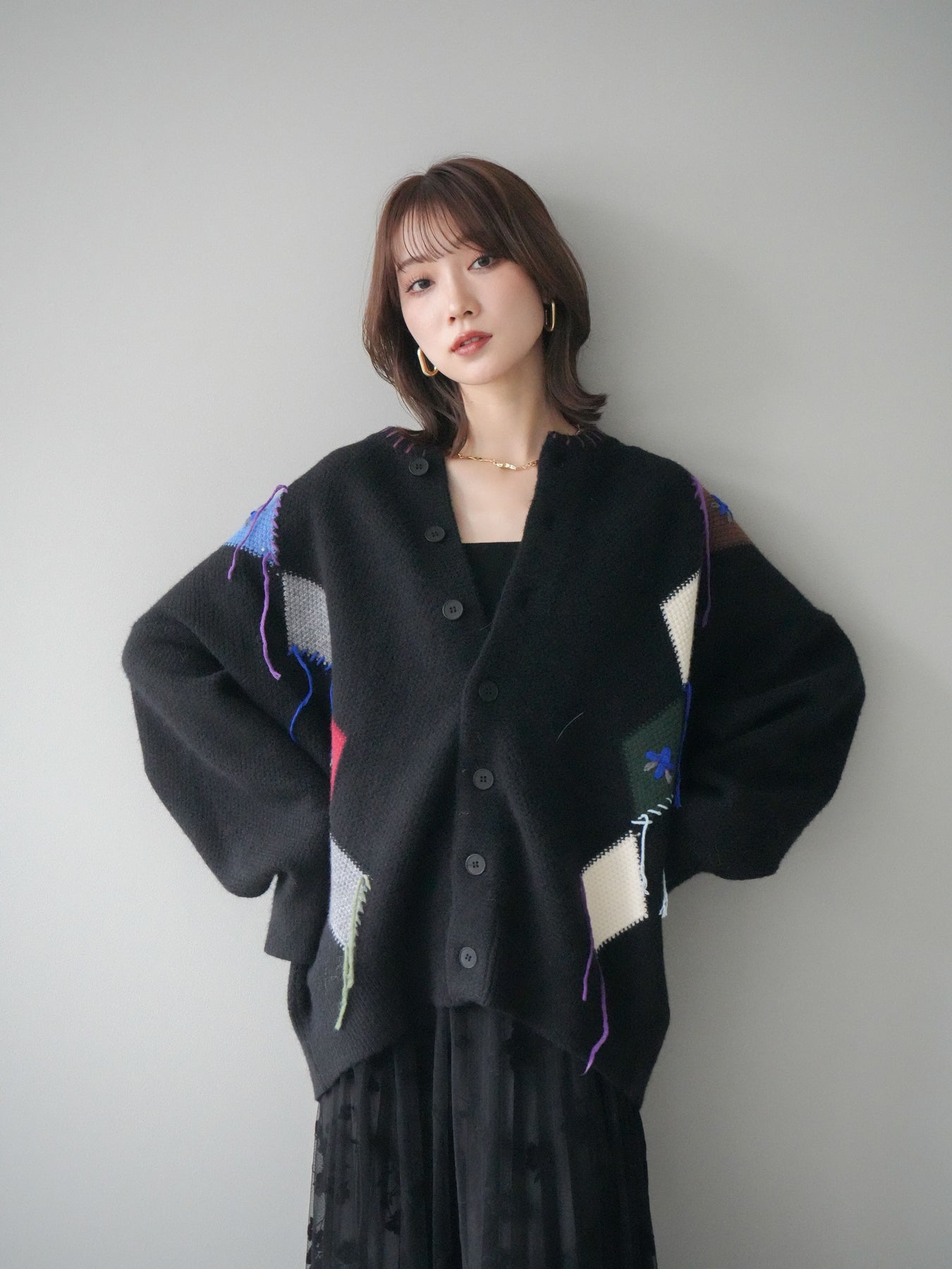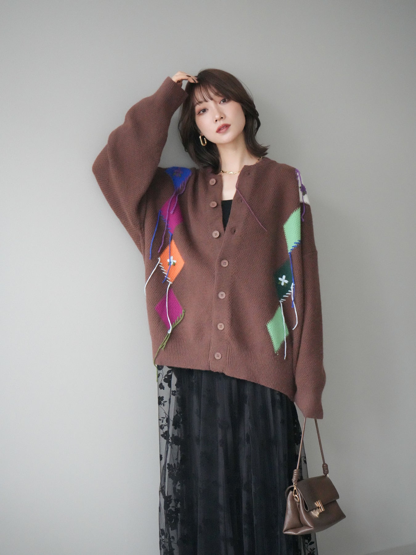 異素材の編地とハンドステッチ風のディテールを組み合わせた、存在感あふれるアーガイルデザインのニットカーディガン。色や質感の異なるパッチワークのような装飾が視覚的な楽しさを加え、1枚で主役になる着映えアイテムに仕上がっています。ゆったりとしたシルエットと柔らかなニット素材がリラックスした着心地を叶えつつ、フロントのボタンで着こなしのアレンジも自在。シンプルなボトムスに合わせるだけでスタイルが完成する、個性と暖かみを兼ね備えた一枚です。 ※ボトムス、キャミソール(インナー)以外の商品は一律でインナーは付属していません。