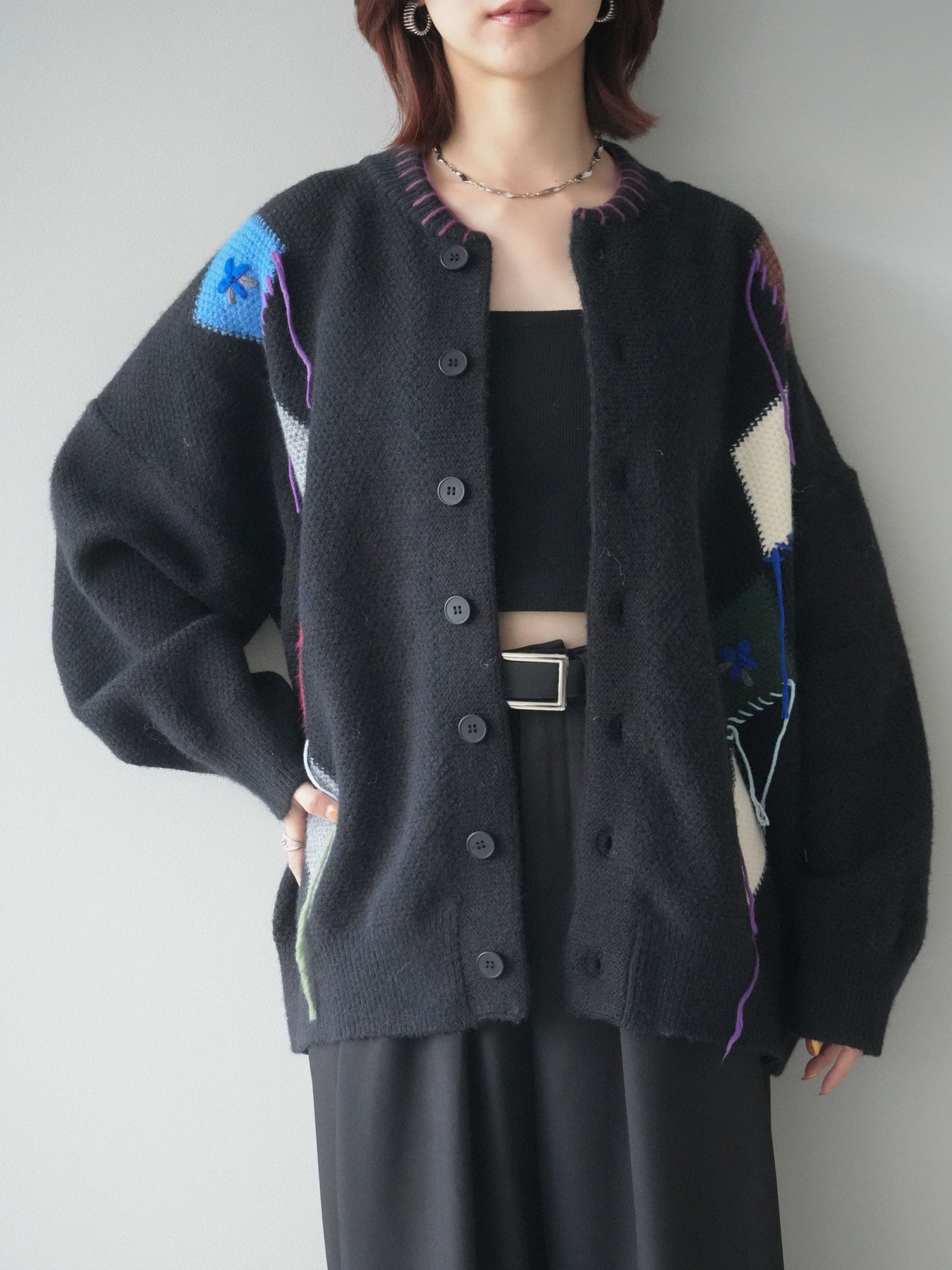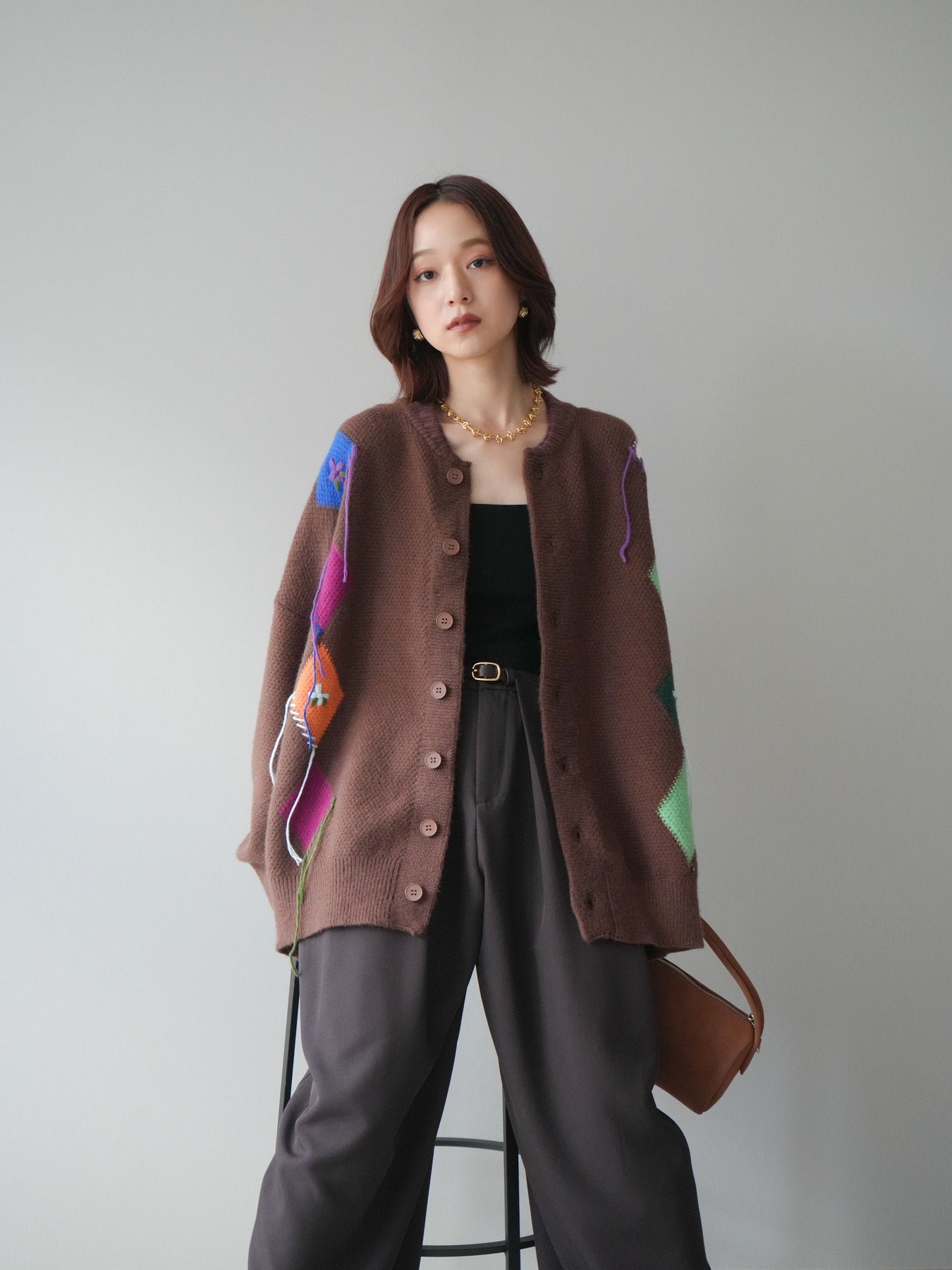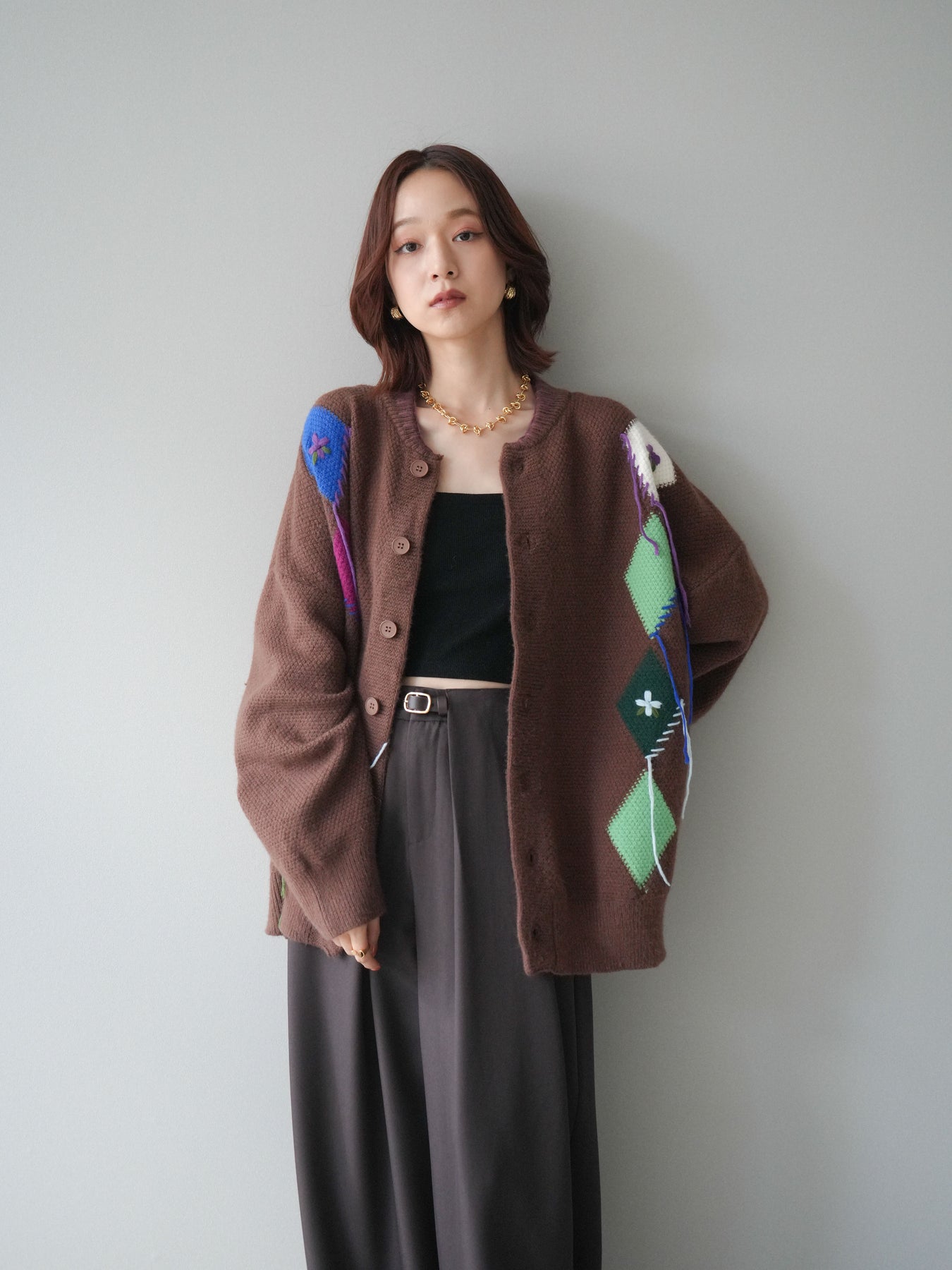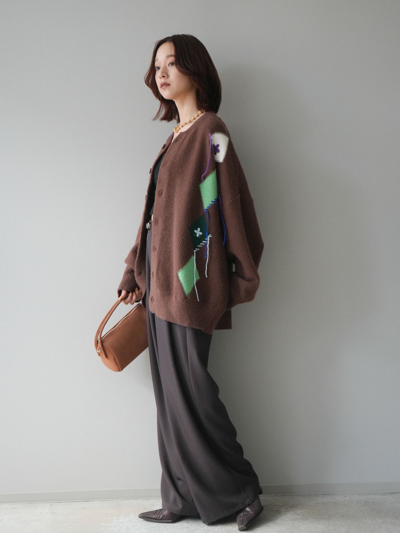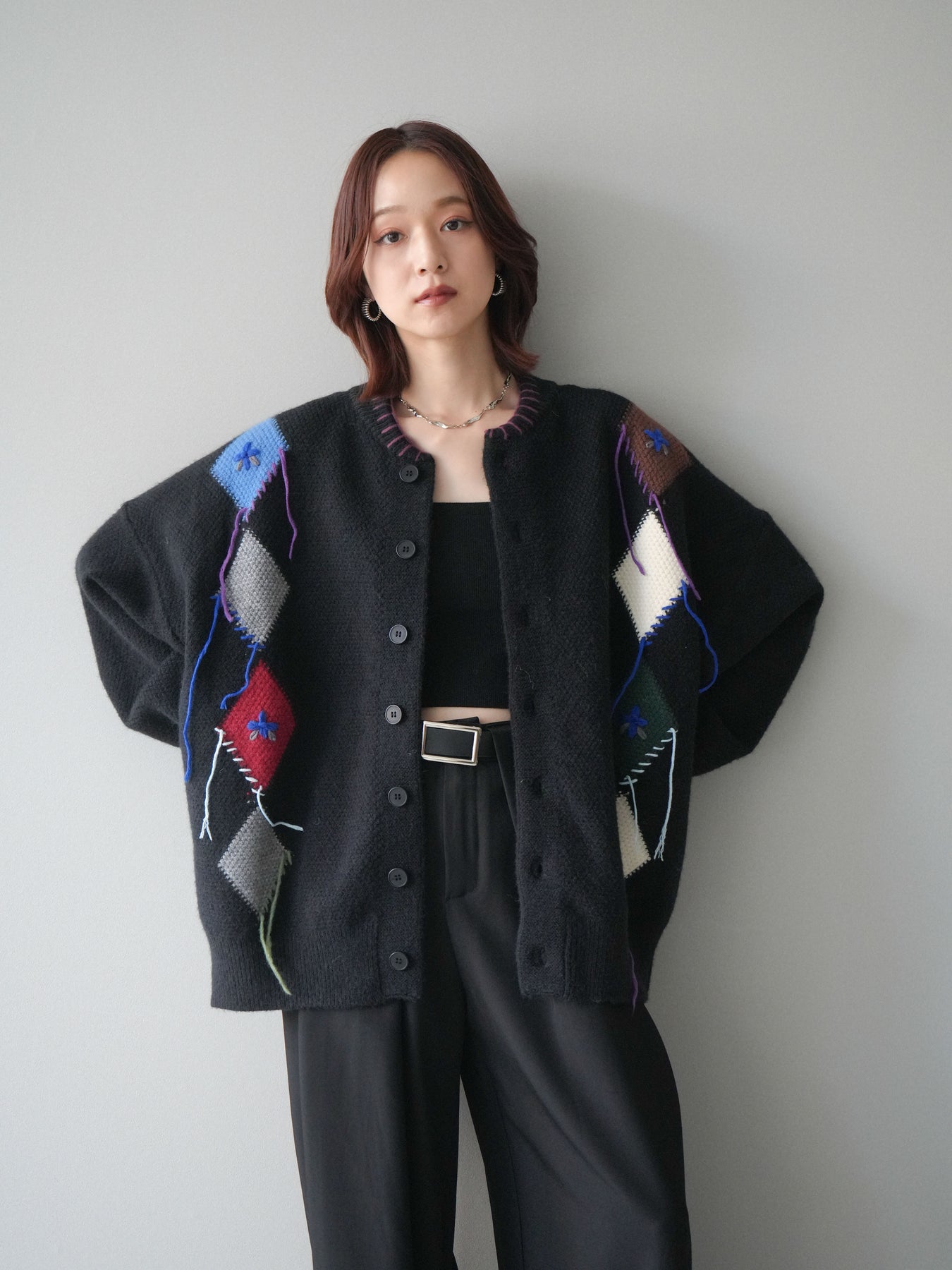 異素材の編地とハンドステッチ風のディテールを組み合わせた、存在感あふれるアーガイルデザインのニットカーディガン。色や質感の異なるパッチワークのような装飾が視覚的な楽しさを加え、1枚で主役になる着映えアイテムに仕上がっています。ゆったりとしたシルエットと柔らかなニット素材がリラックスした着心地を叶えつつ、フロントのボタンで着こなしのアレンジも自在。シンプルなボトムスに合わせるだけでスタイルが完成する、個性と暖かみを兼ね備えた一枚です。 ※ボトムス、キャミソール(インナー)以外の商品は一律でインナーは付属していません。