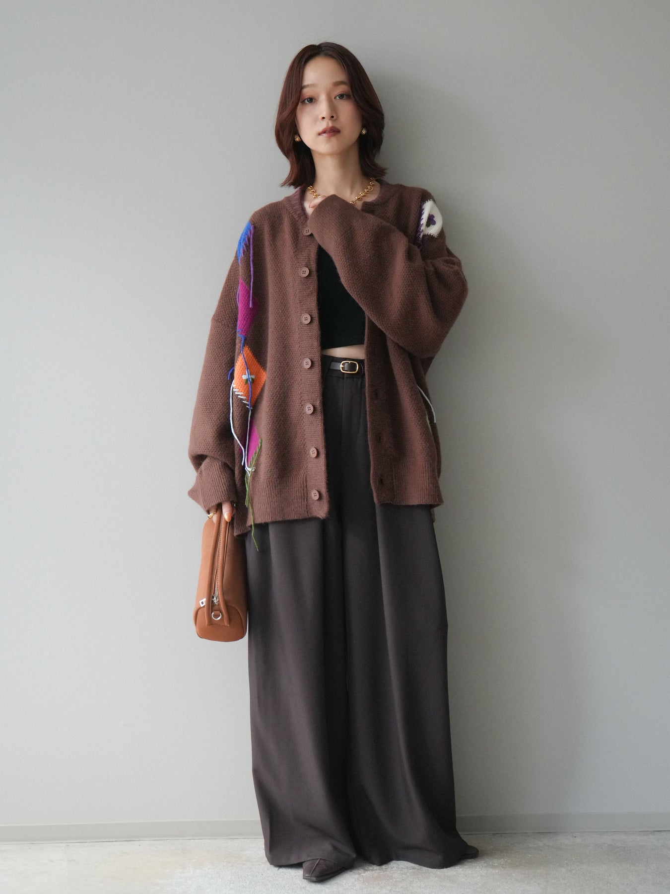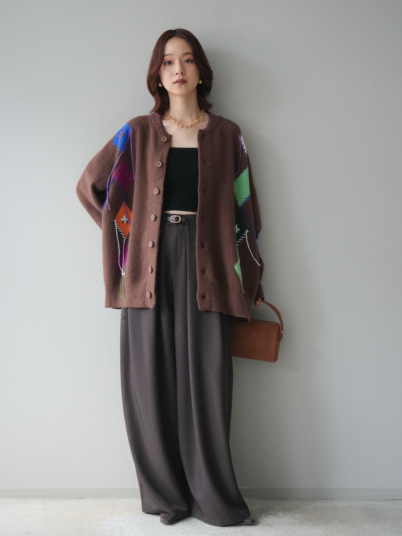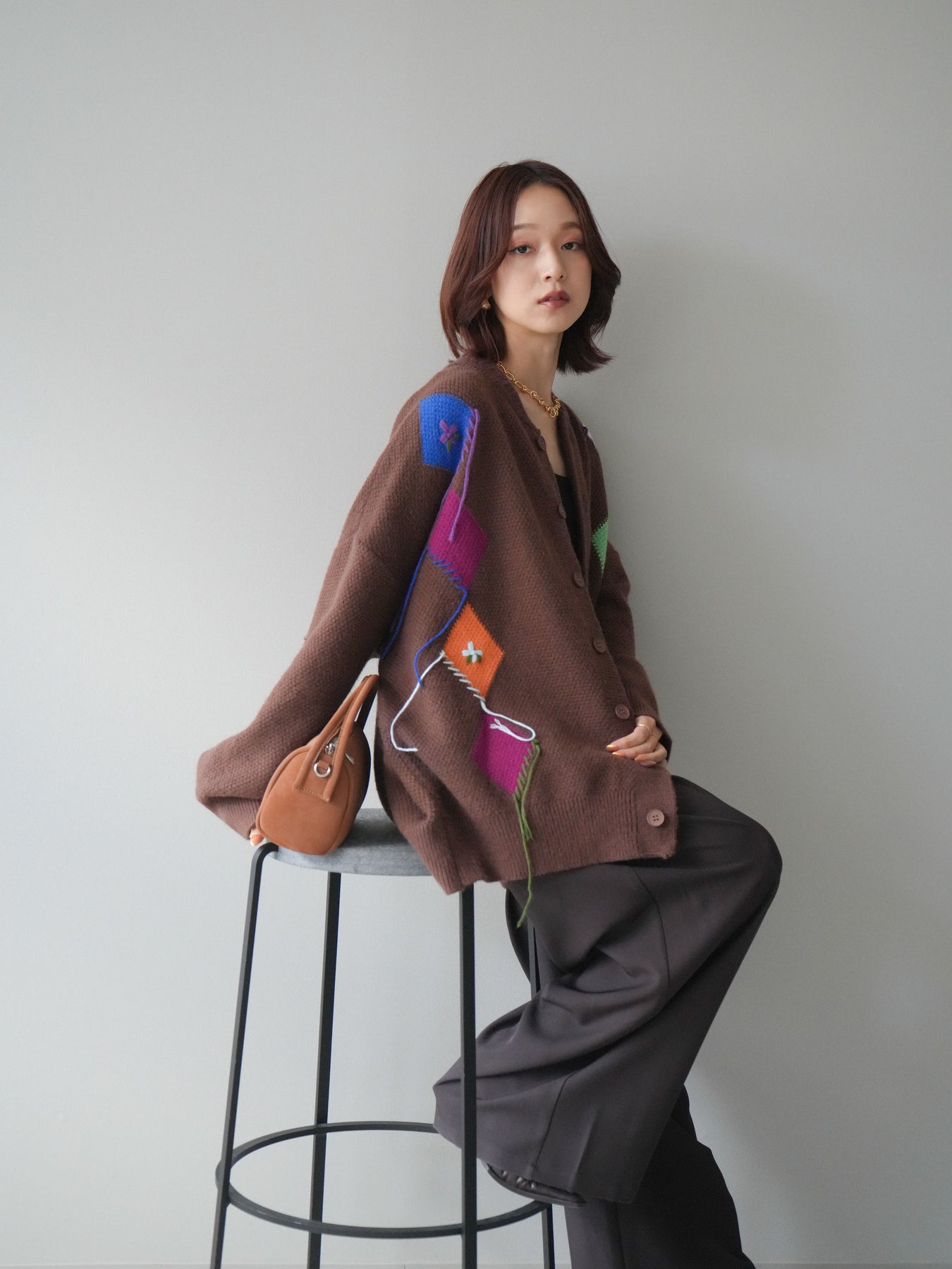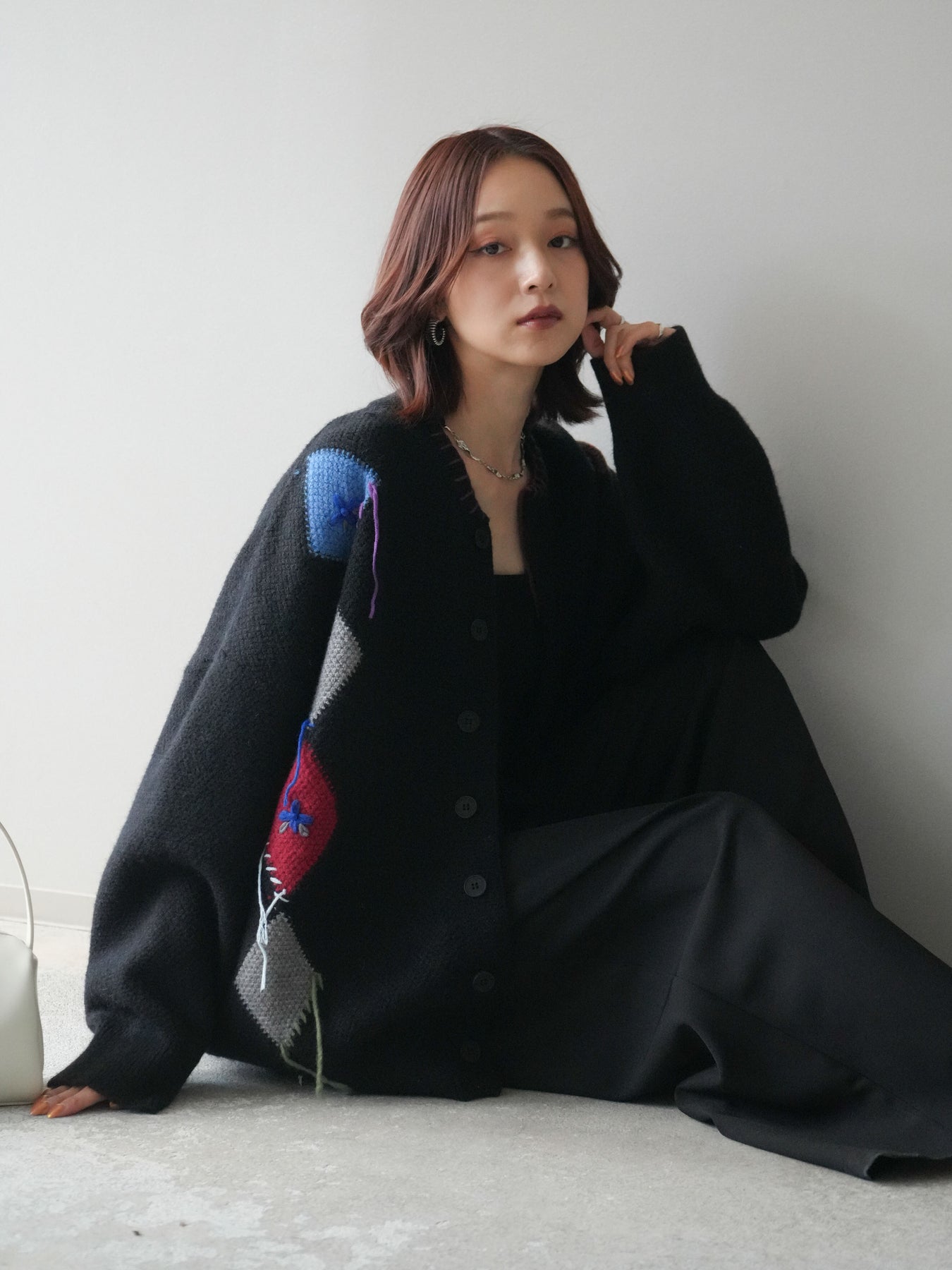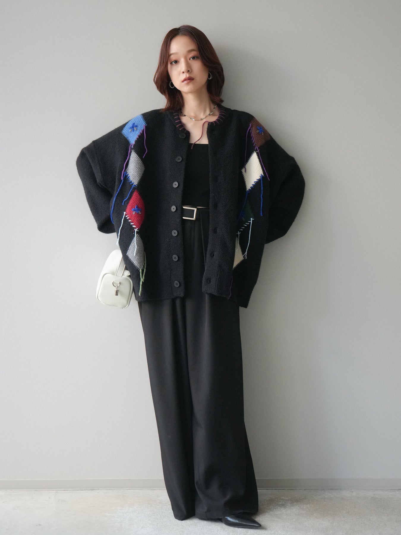 異素材の編地とハンドステッチ風のディテールを組み合わせた、存在感あふれるアーガイルデザインのニットカーディガン。色や質感の異なるパッチワークのような装飾が視覚的な楽しさを加え、1枚で主役になる着映えアイテムに仕上がっています。ゆったりとしたシルエットと柔らかなニット素材がリラックスした着心地を叶えつつ、フロントのボタンで着こなしのアレンジも自在。シンプルなボトムスに合わせるだけでスタイルが完成する、個性と暖かみを兼ね備えた一枚です。 ※ボトムス、キャミソール(インナー)以外の商品は一律でインナーは付属していません。