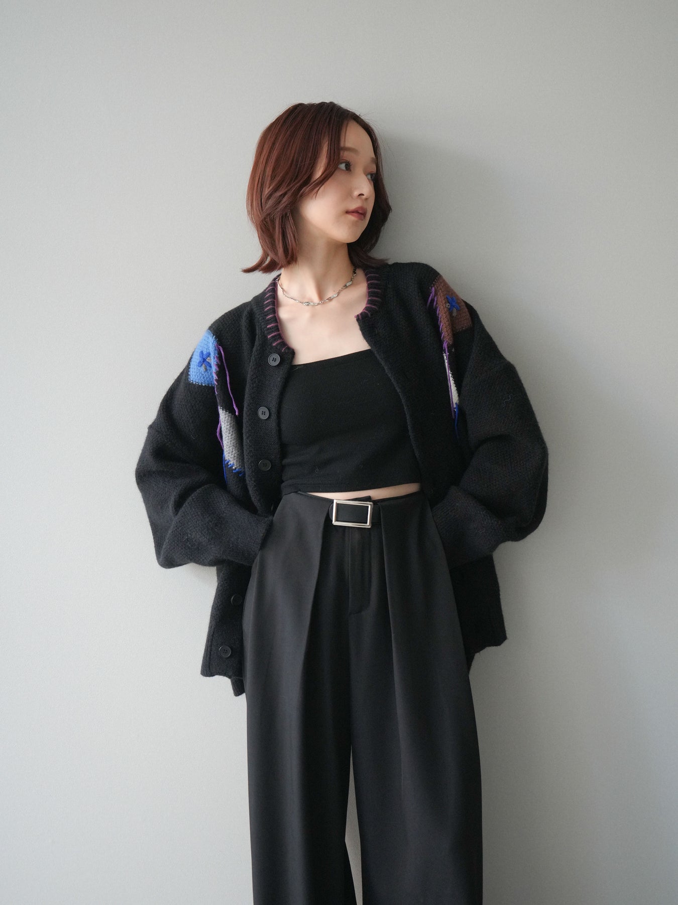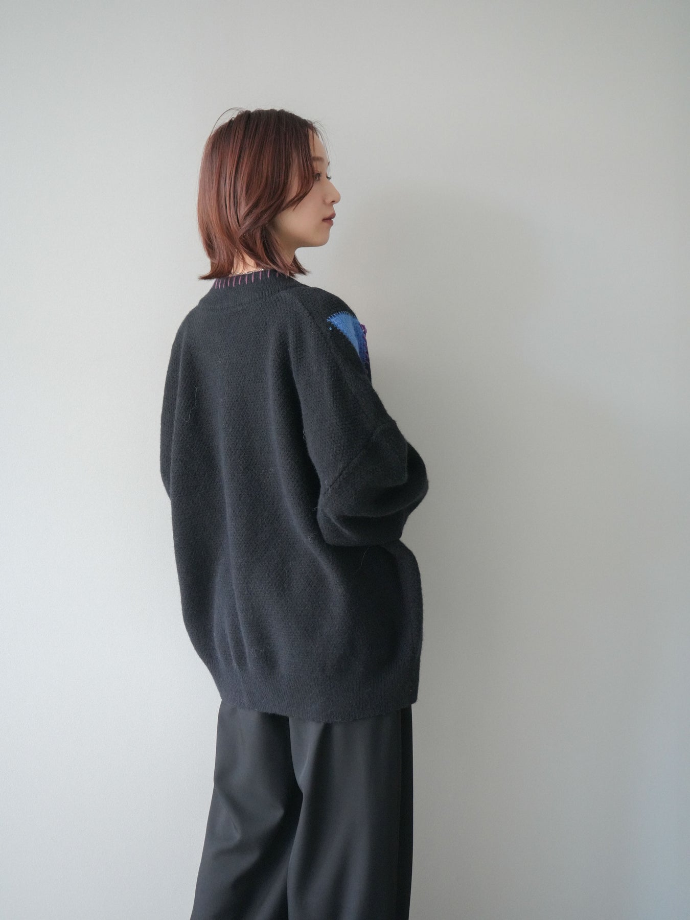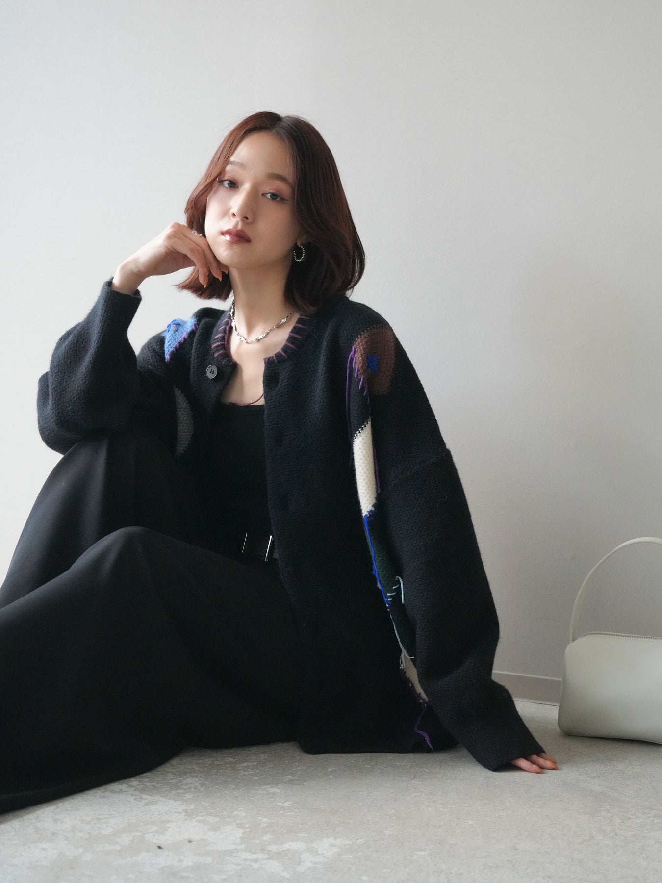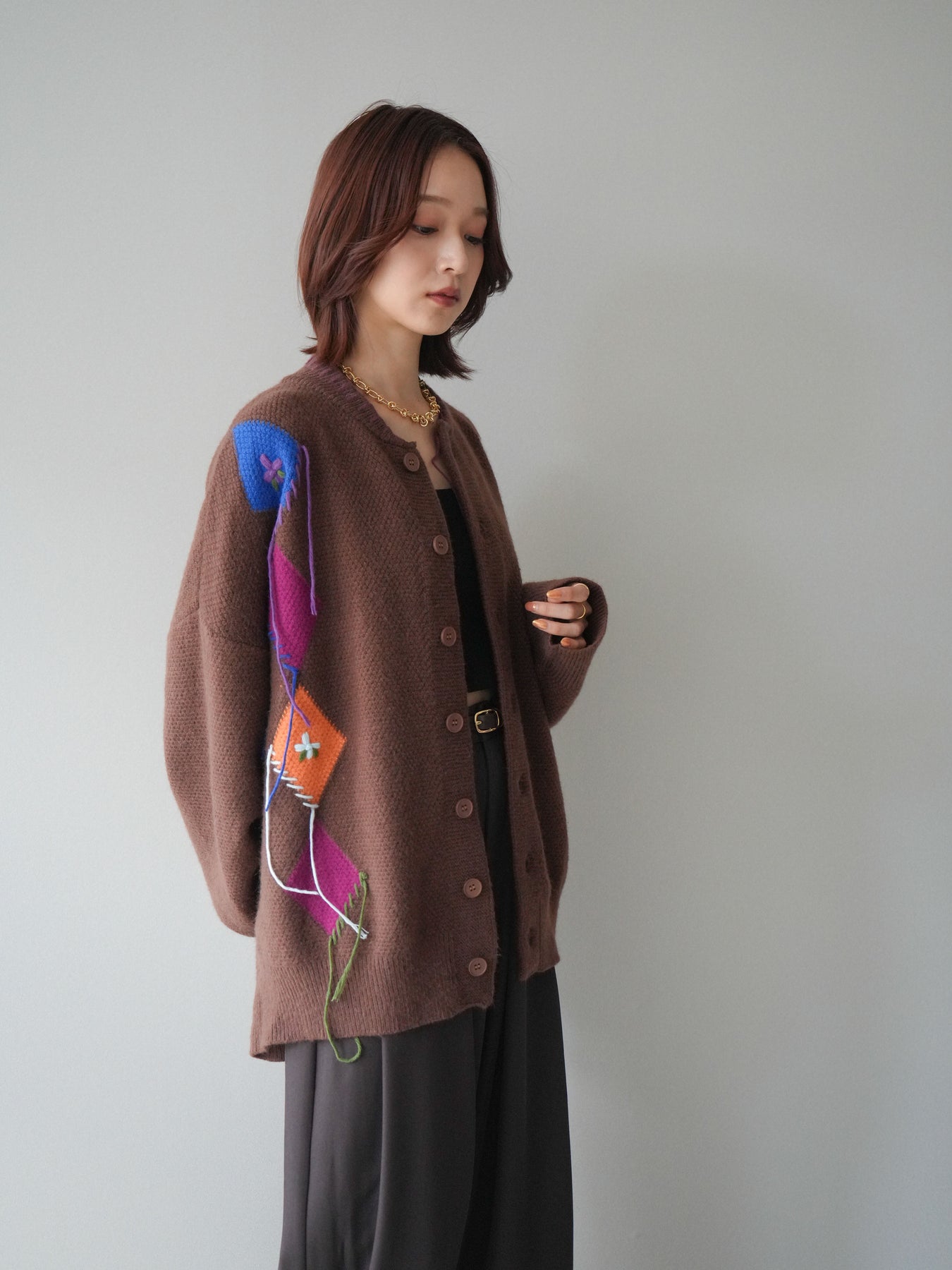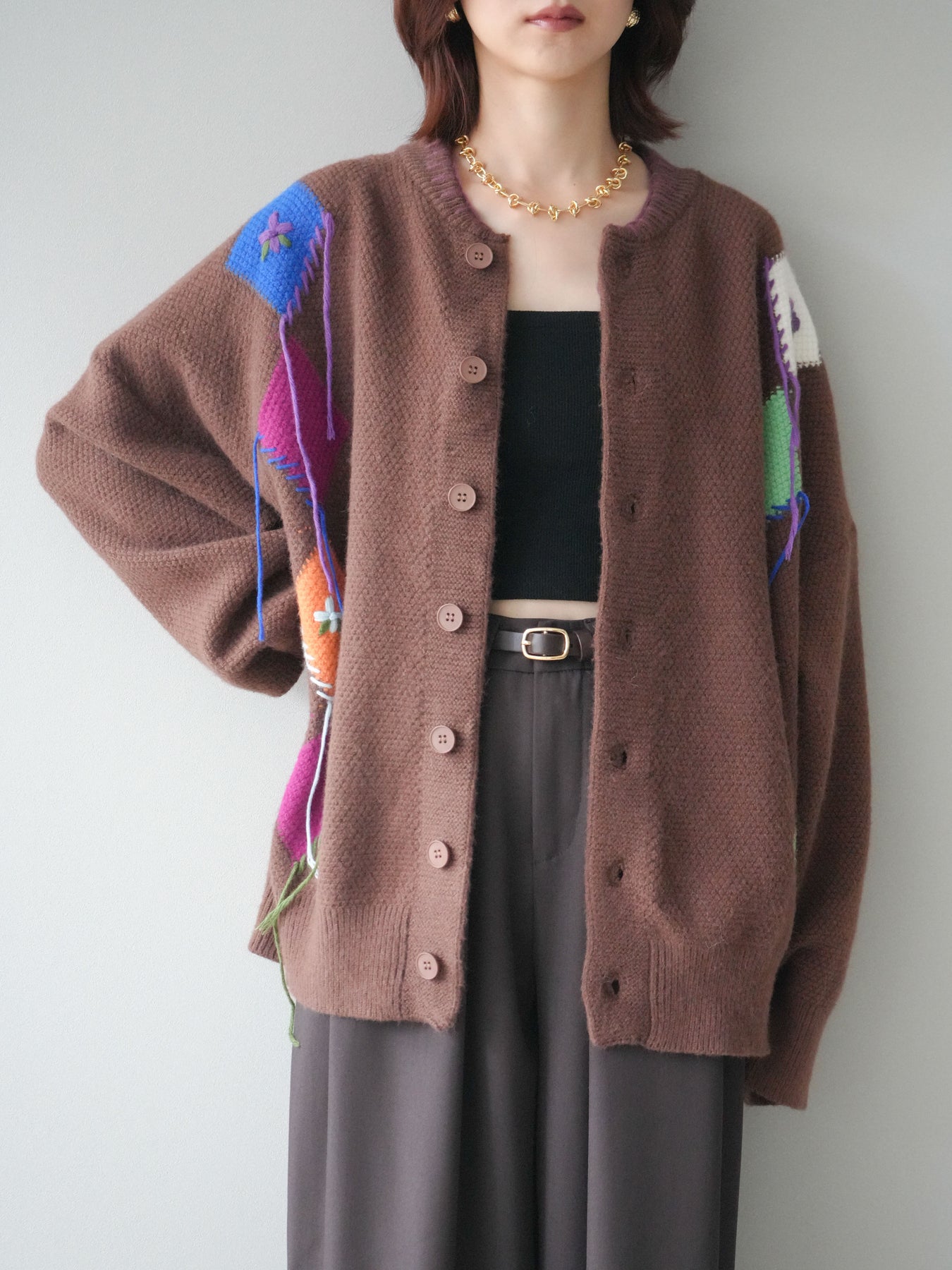 異素材の編地とハンドステッチ風のディテールを組み合わせた、存在感あふれるアーガイルデザインのニットカーディガン。色や質感の異なるパッチワークのような装飾が視覚的な楽しさを加え、1枚で主役になる着映えアイテムに仕上がっています。ゆったりとしたシルエットと柔らかなニット素材がリラックスした着心地を叶えつつ、フロントのボタンで着こなしのアレンジも自在。シンプルなボトムスに合わせるだけでスタイルが完成する、個性と暖かみを兼ね備えた一枚です。 ※ボトムス、キャミソール(インナー)以外の商品は一律でインナーは付属していません。