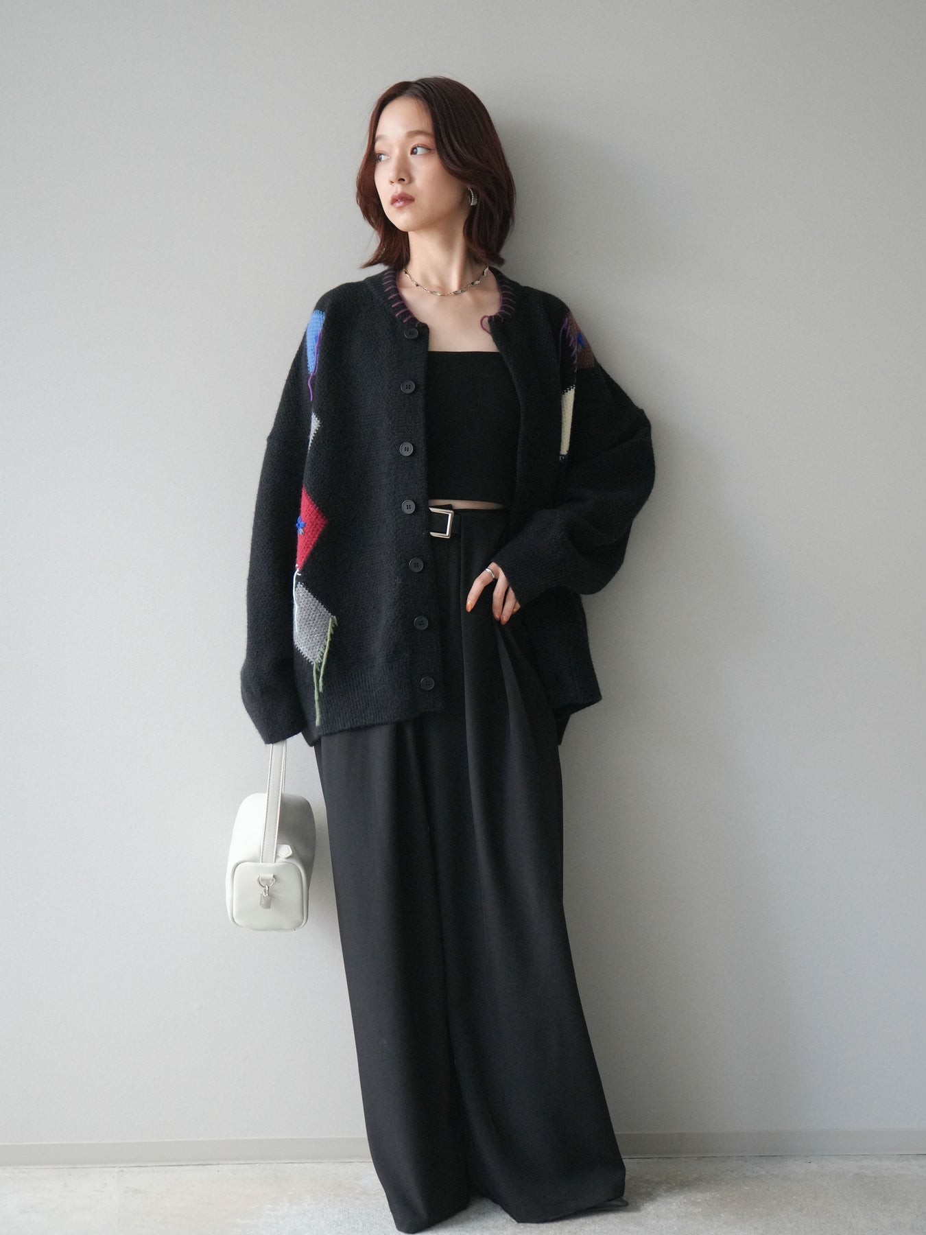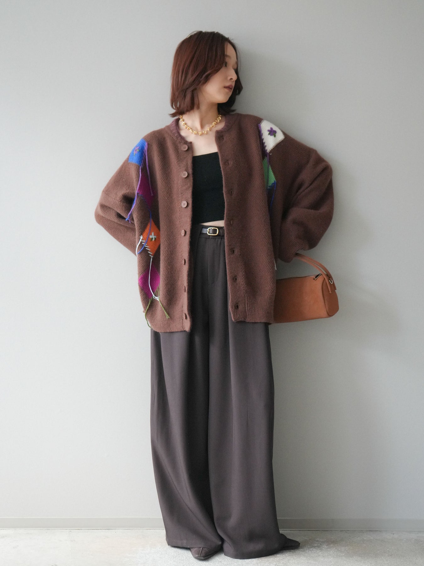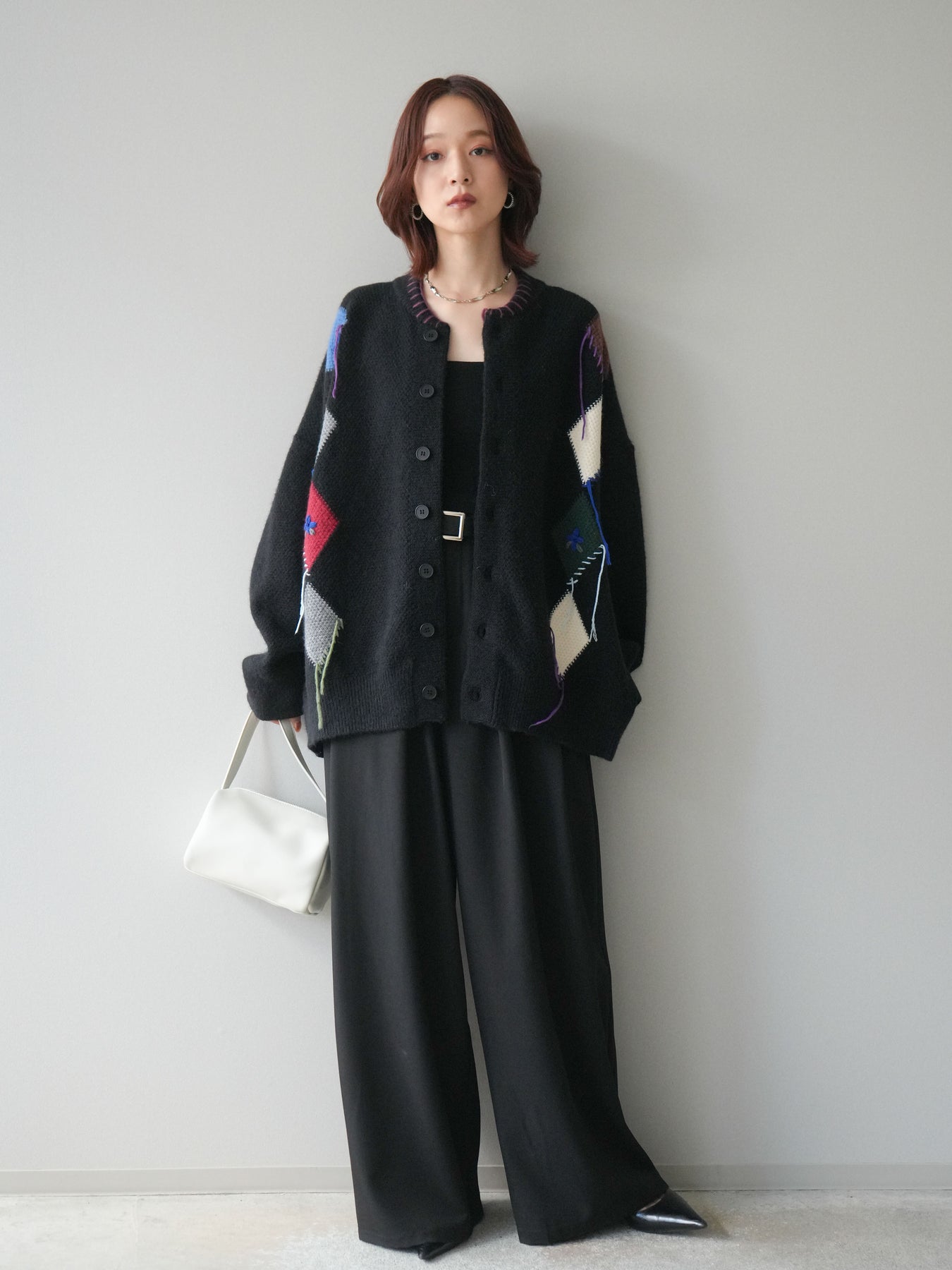 [SET]ハンドステッチアーガイルデザインニットカーディガン+ベルトループデザインワイドパンツ(2set)