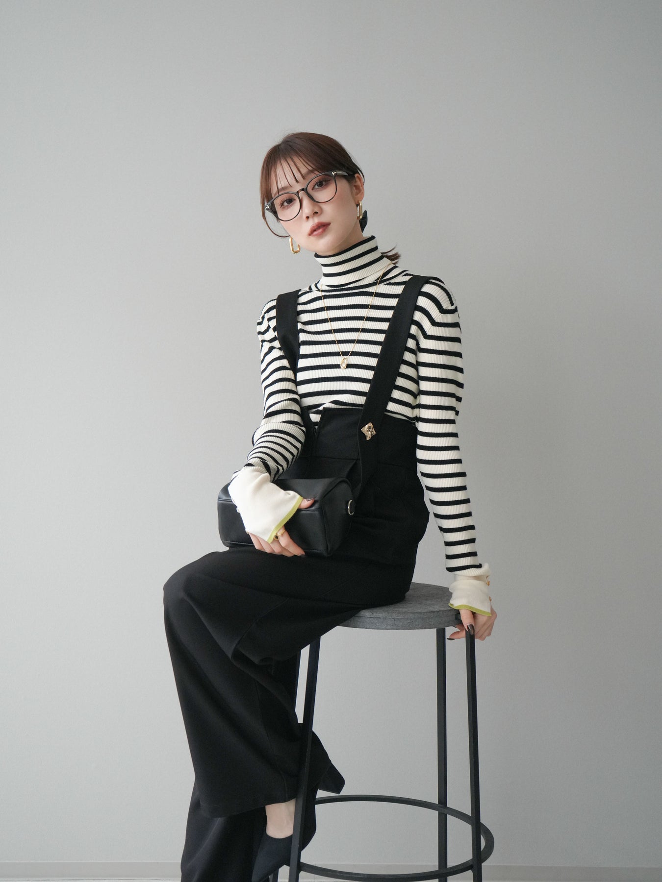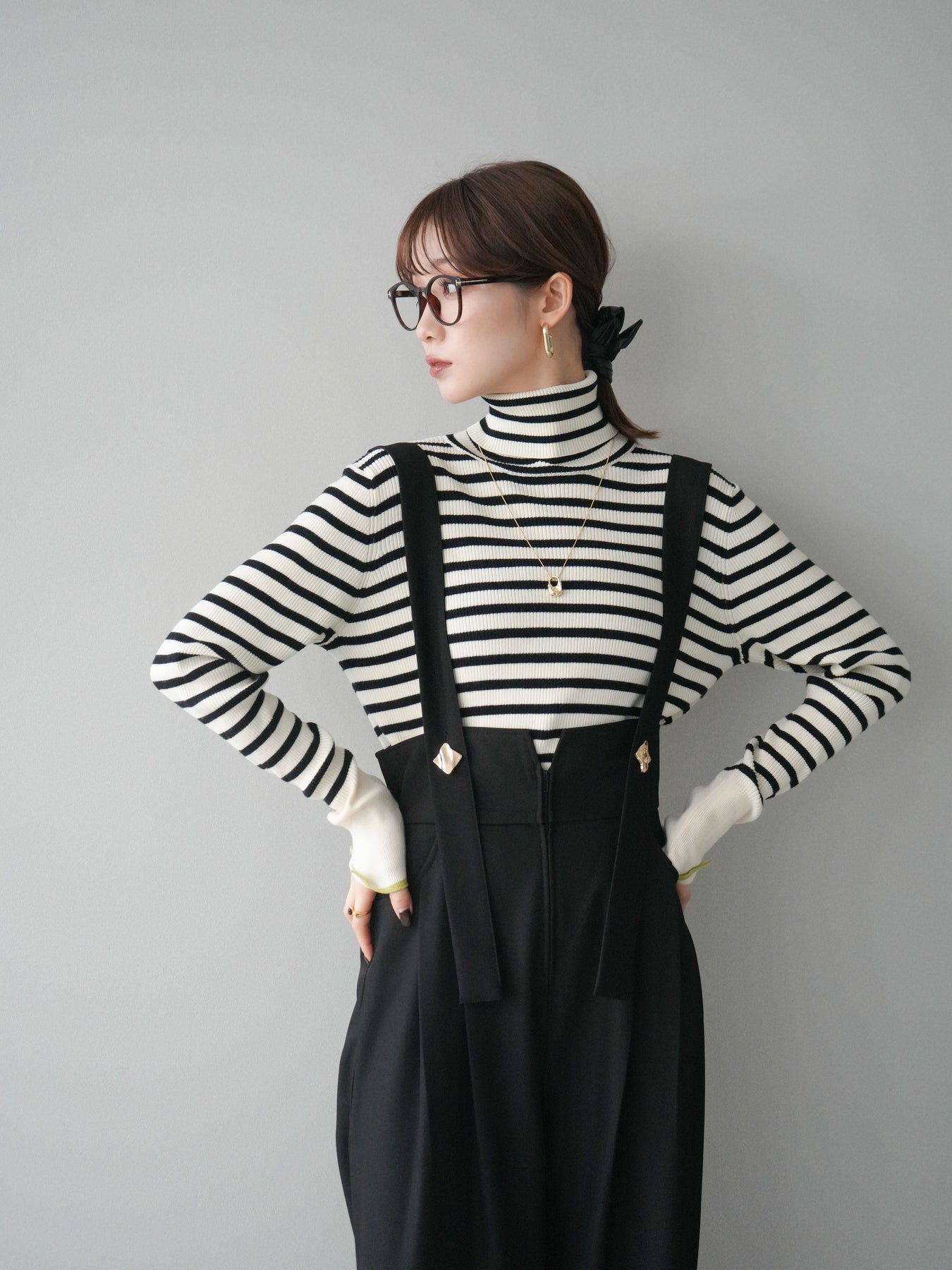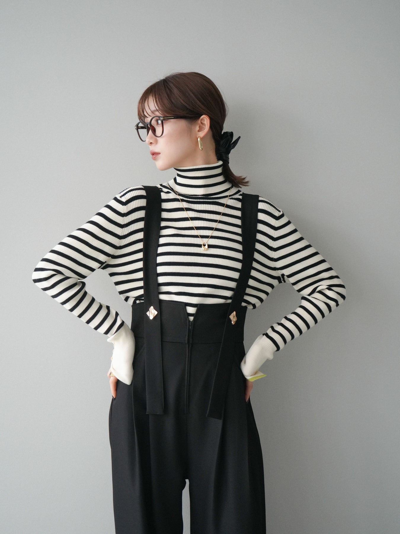 クラシックなボーダー柄に配色スリット袖を組み合わせた、ひとクセあるデザインが魅力のリブニットトップス。程よく身体に沿うリブ編みがシルエットをすっきり見せ、ハイネックが上品な印象をプラスします。袖口にはスリットとボタンを施し、配色のレイヤードが覗く遊び心のある仕上がりに。1枚で存在感がありながら、アウターのインにも合わせやすく、デイリーコーデに取り入れやすい万能アイテムです。 ※ボトムス、キャミソール(インナー)以外の商品は一律でインナーは付属していません。