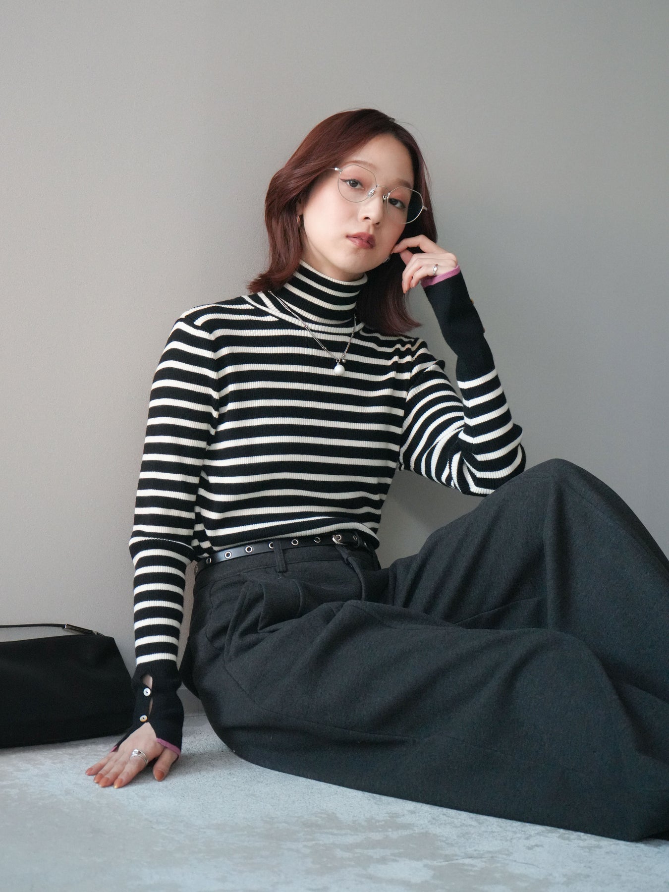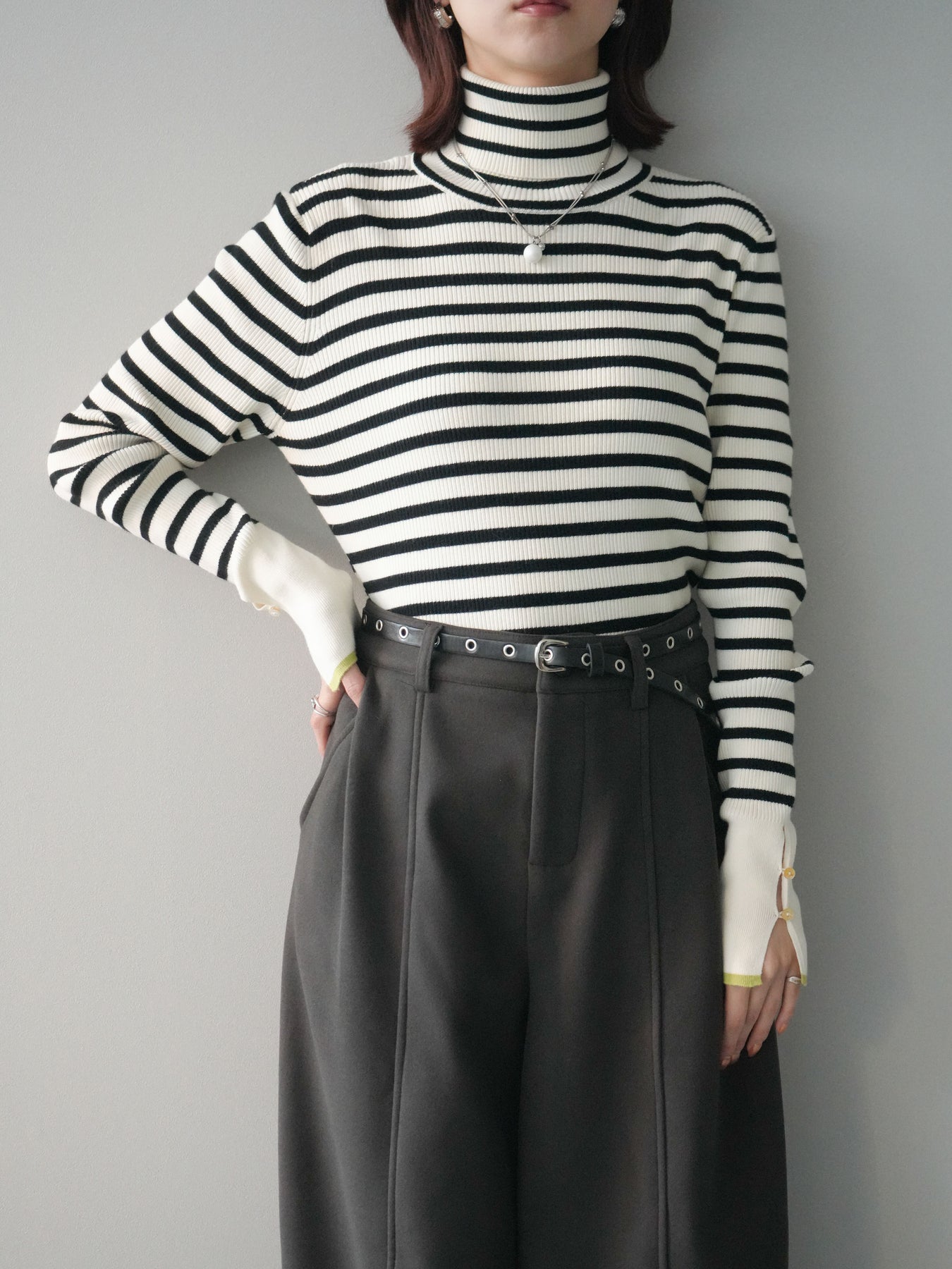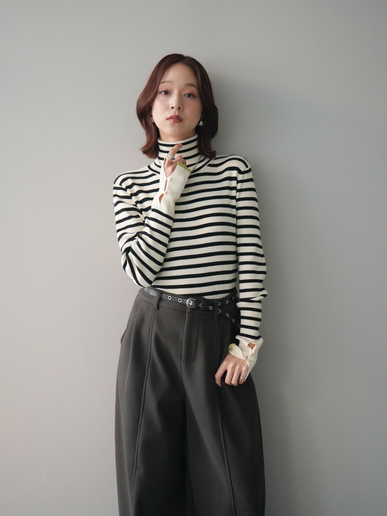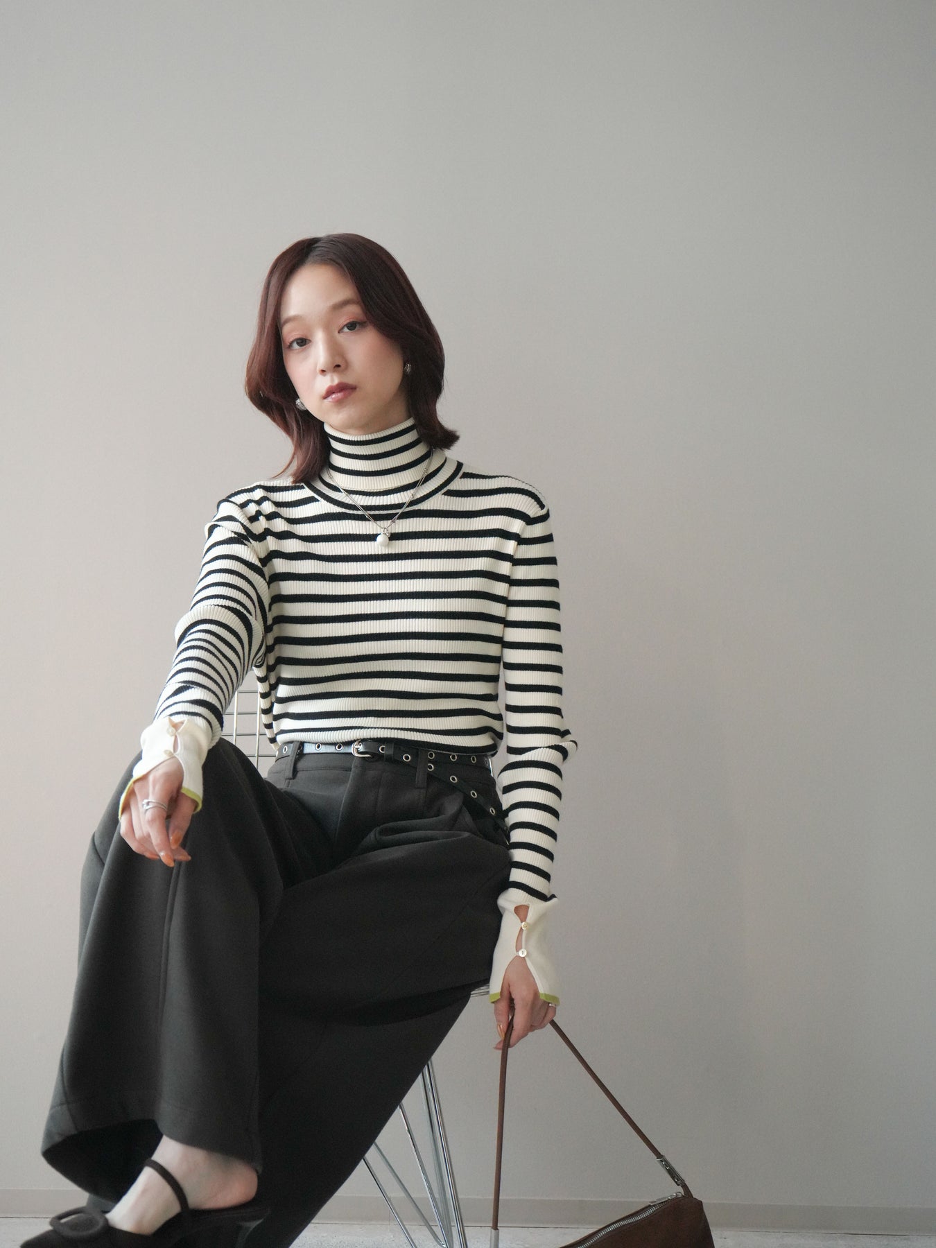 クラシックなボーダー柄に配色スリット袖を組み合わせた、ひとクセあるデザインが魅力のリブニットトップス。程よく身体に沿うリブ編みがシルエットをすっきり見せ、ハイネックが上品な印象をプラスします。袖口にはスリットとボタンを施し、配色のレイヤードが覗く遊び心のある仕上がりに。1枚で存在感がありながら、アウターのインにも合わせやすく、デイリーコーデに取り入れやすい万能アイテムです。 ※ボトムス、キャミソール(インナー)以外の商品は一律でインナーは付属していません。