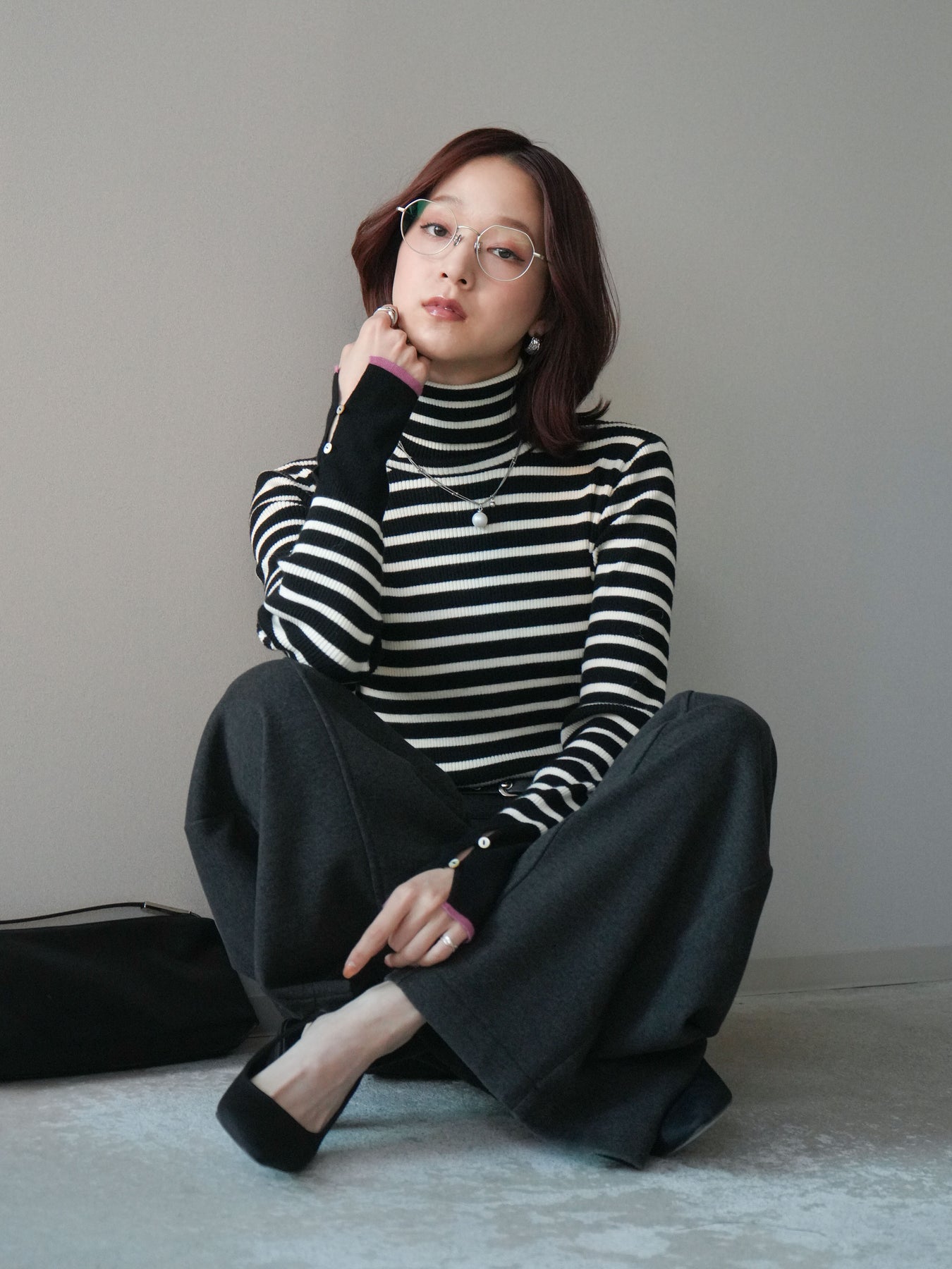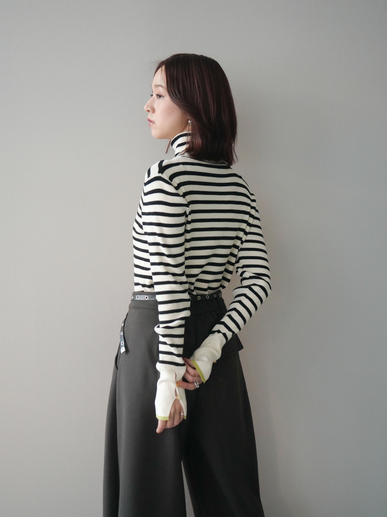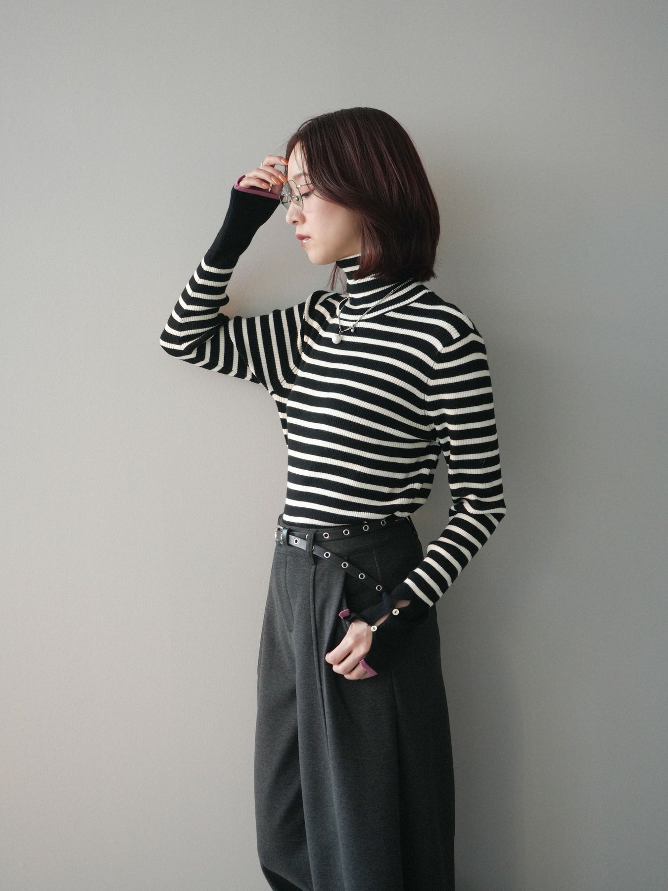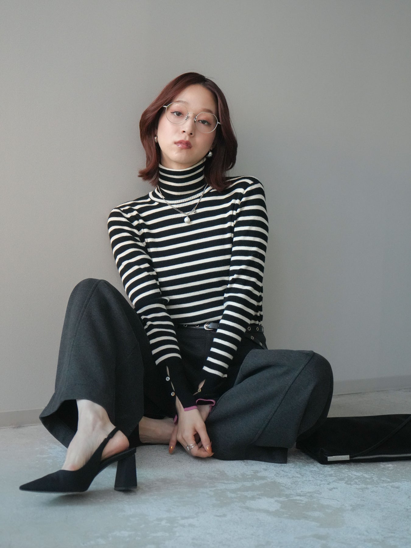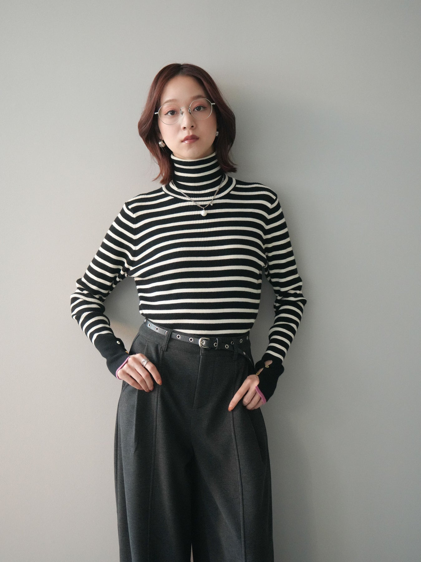クラシックなボーダー柄に配色スリット袖を組み合わせた、ひとクセあるデザインが魅力のリブニットトップス。程よく身体に沿うリブ編みがシルエットをすっきり見せ、ハイネックが上品な印象をプラスします。袖口にはスリットとボタンを施し、配色のレイヤードが覗く遊び心のある仕上がりに。1枚で存在感がありながら、アウターのインにも合わせやすく、デイリーコーデに取り入れやすい万能アイテムです。 ※ボトムス、キャミソール(インナー)以外の商品は一律でインナーは付属していません。