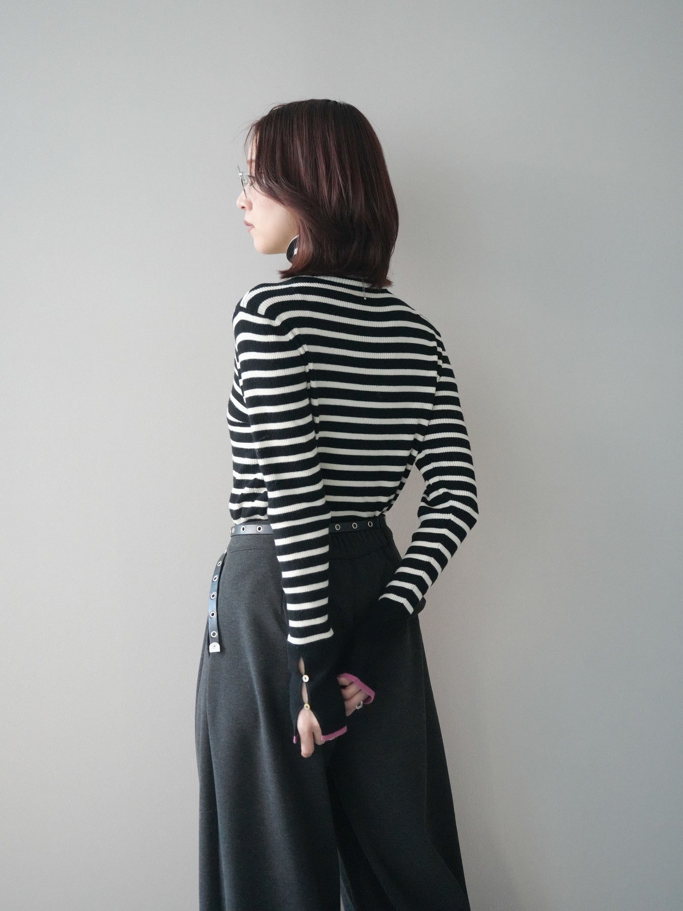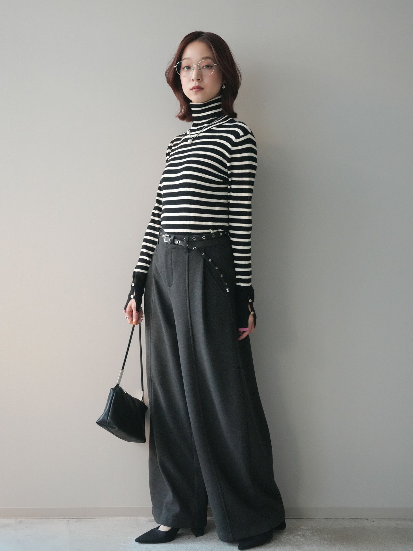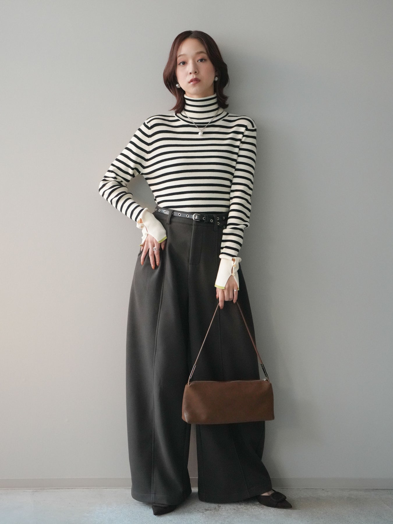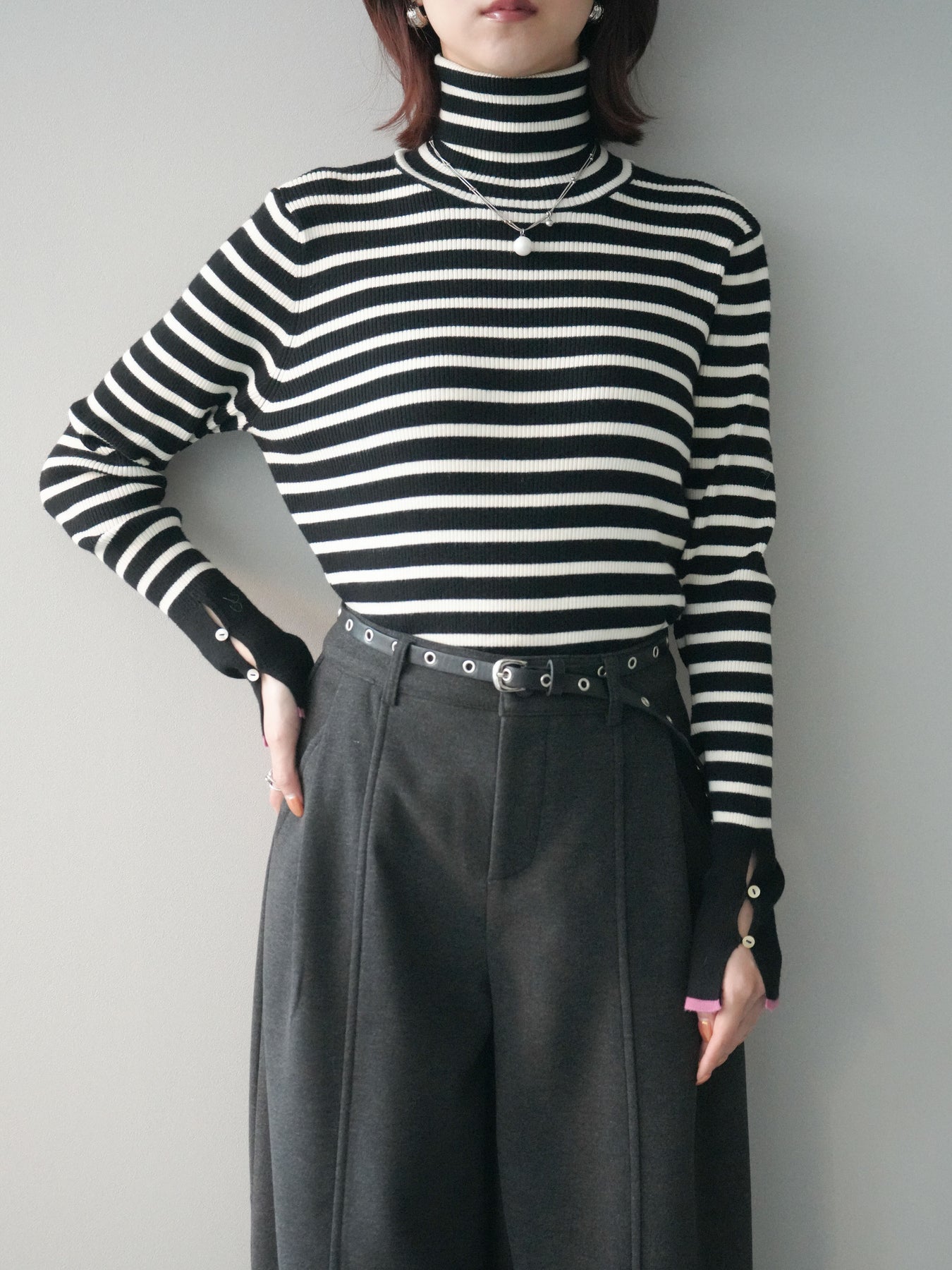 クラシックなボーダー柄に配色スリット袖を組み合わせた、ひとクセあるデザインが魅力のリブニットトップス。程よく身体に沿うリブ編みがシルエットをすっきり見せ、ハイネックが上品な印象をプラスします。袖口にはスリットとボタンを施し、配色のレイヤードが覗く遊び心のある仕上がりに。1枚で存在感がありながら、アウターのインにも合わせやすく、デイリーコーデに取り入れやすい万能アイテムです。 ※ボトムス、キャミソール(インナー)以外の商品は一律でインナーは付属していません。