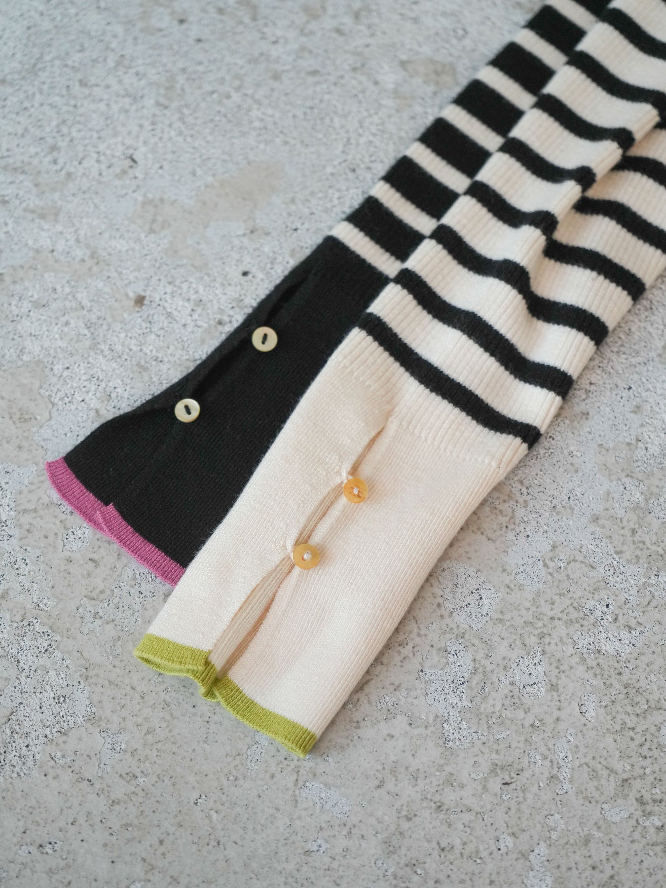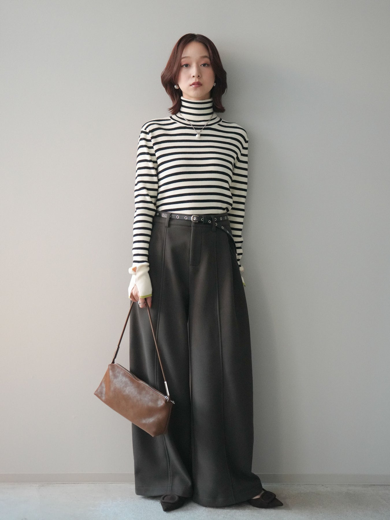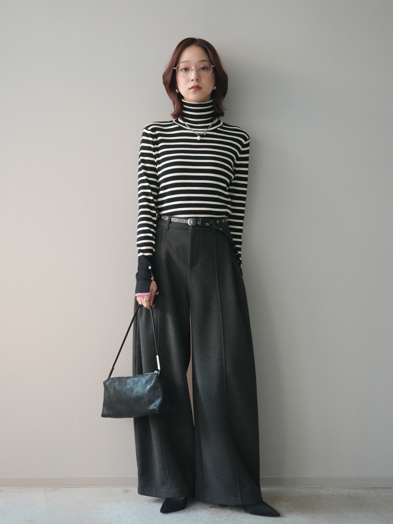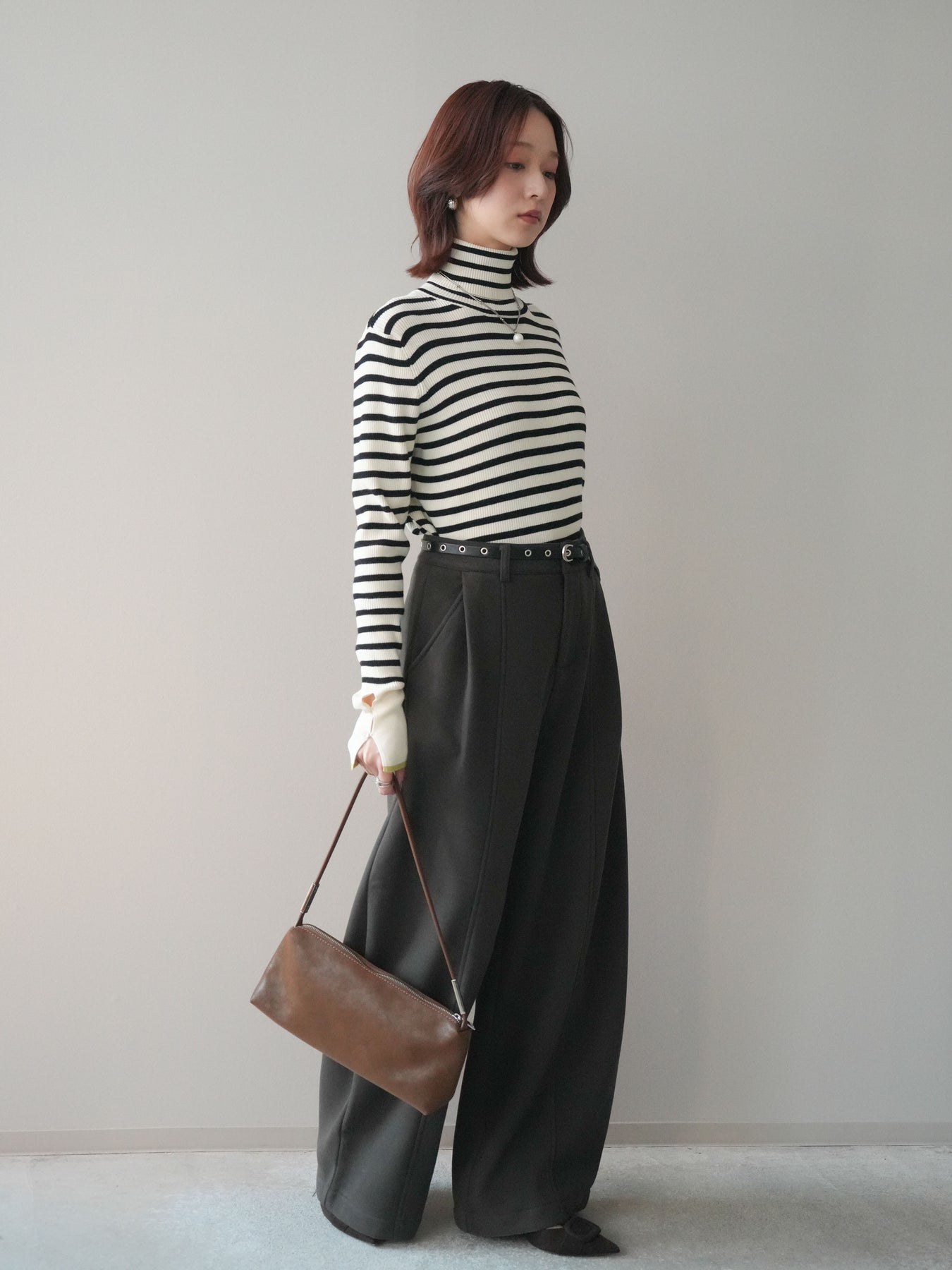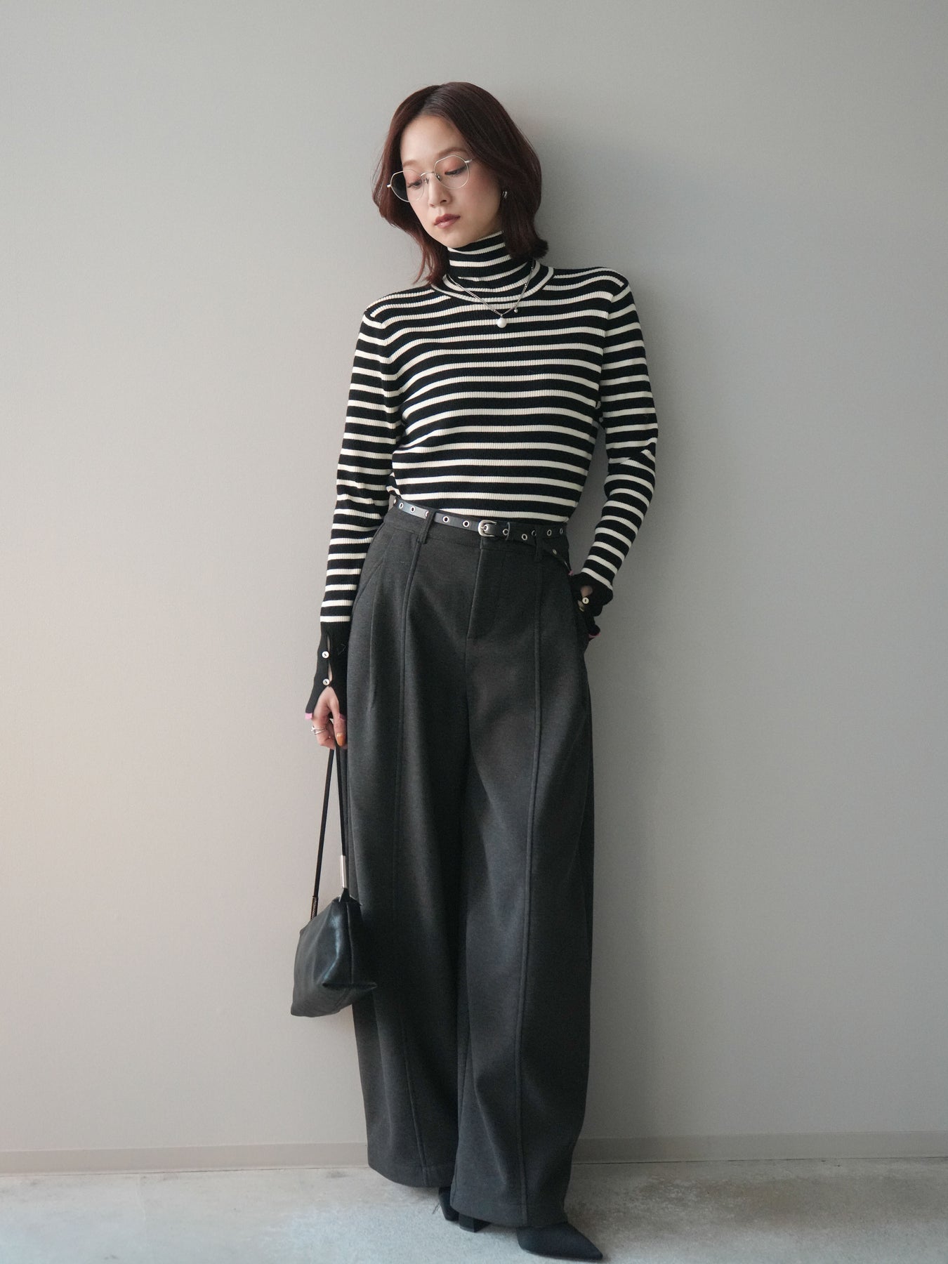 クラシックなボーダー柄に配色スリット袖を組み合わせた、ひとクセあるデザインが魅力のリブニットトップス。程よく身体に沿うリブ編みがシルエットをすっきり見せ、ハイネックが上品な印象をプラスします。袖口にはスリットとボタンを施し、配色のレイヤードが覗く遊び心のある仕上がりに。1枚で存在感がありながら、アウターのインにも合わせやすく、デイリーコーデに取り入れやすい万能アイテムです。 ※ボトムス、キャミソール(インナー)以外の商品は一律でインナーは付属していません。