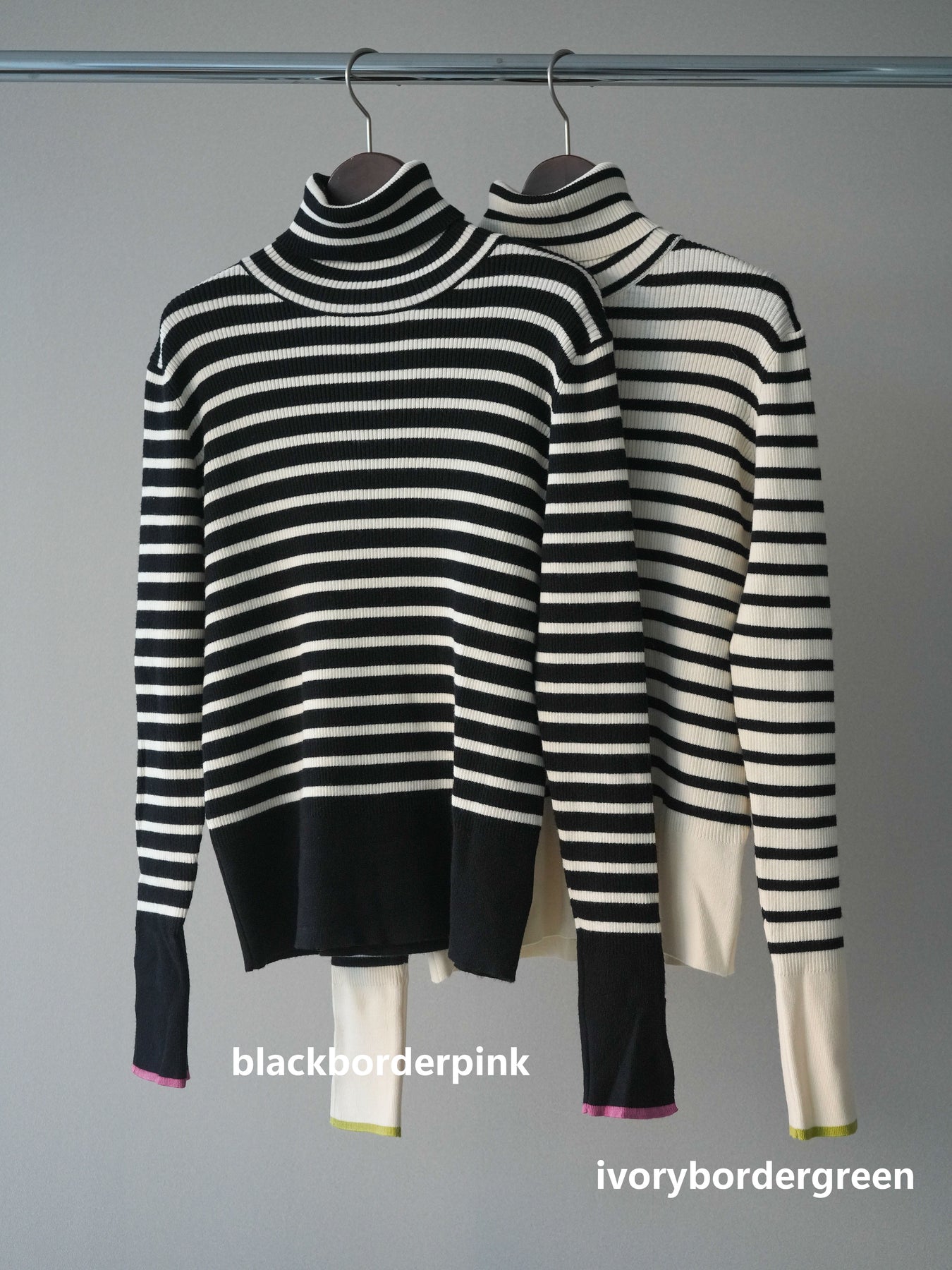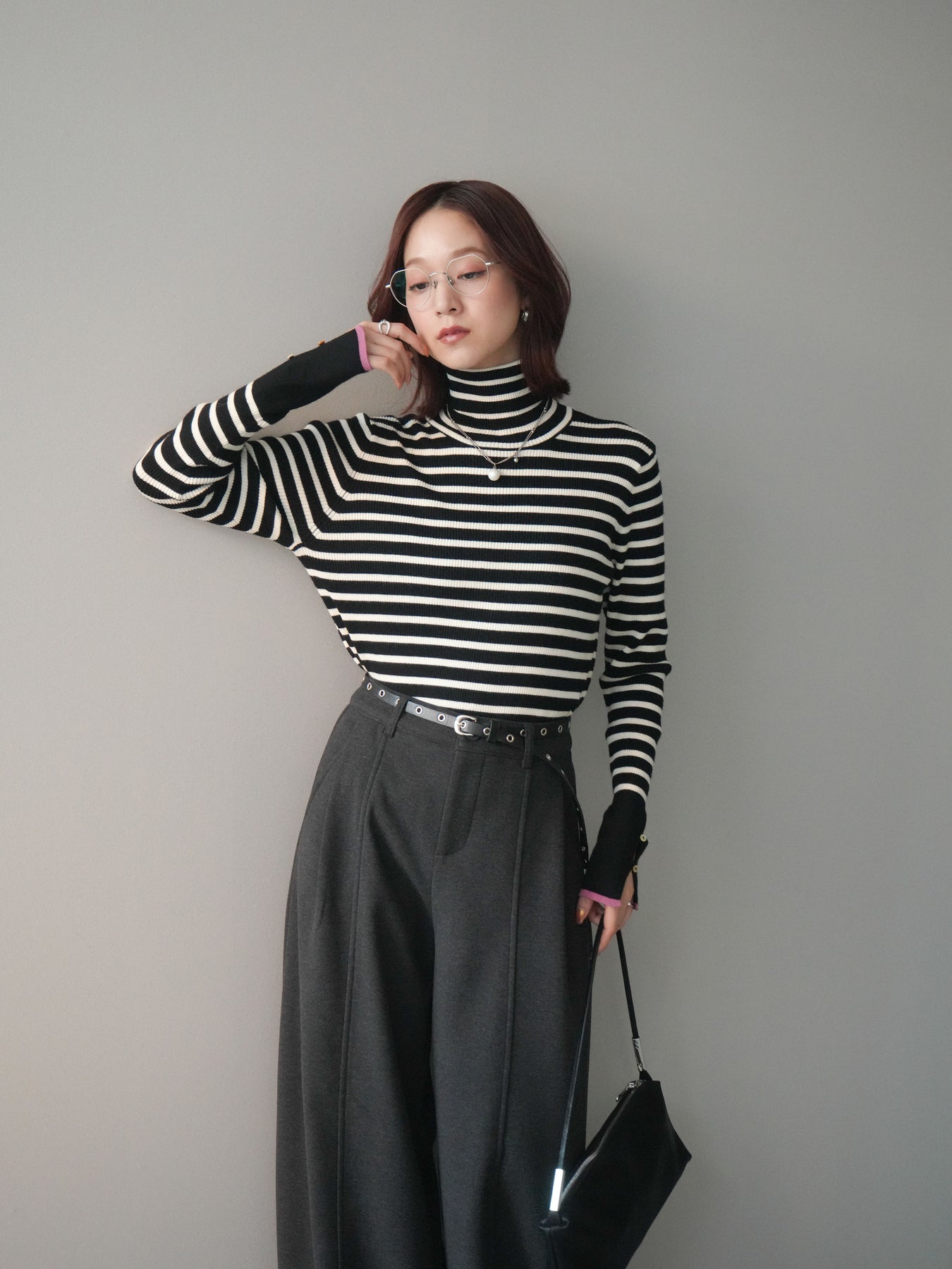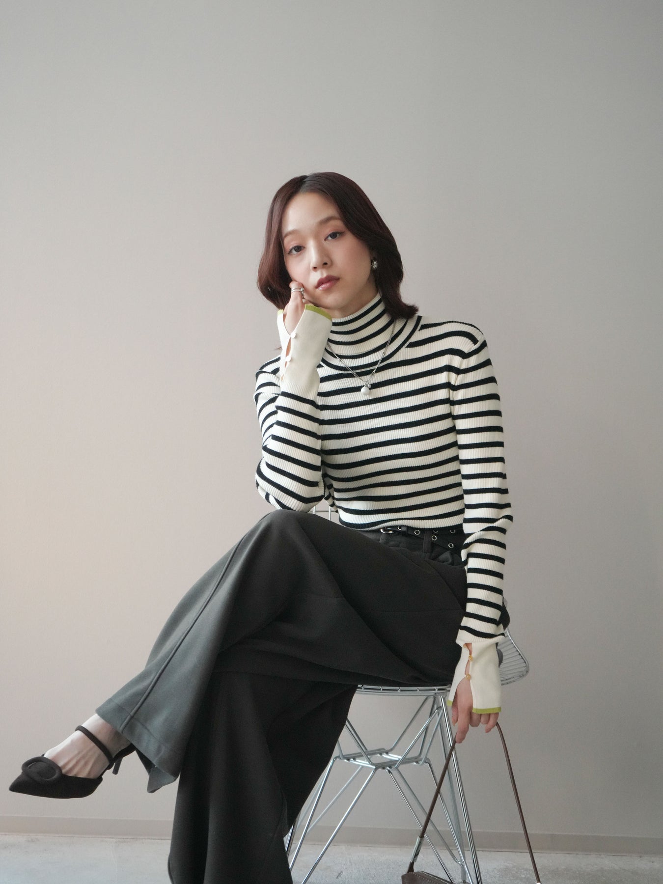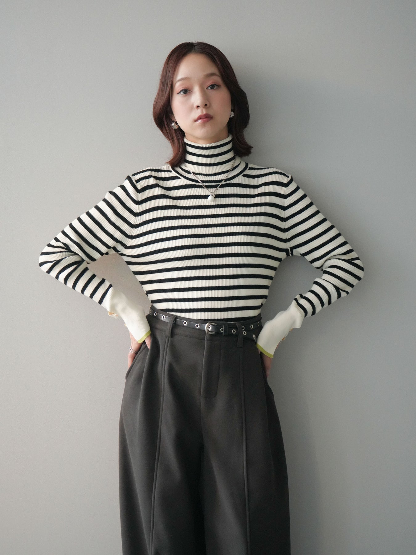 ◆ [予約]袖配色ハイネックボーダーリブニットトップス