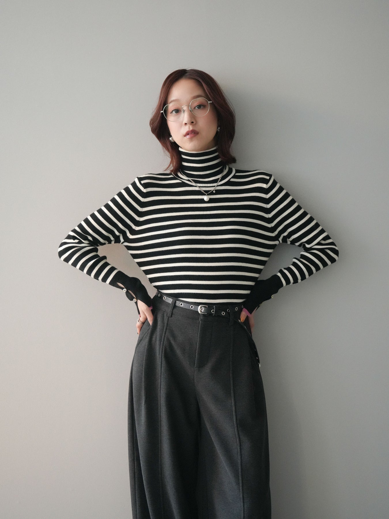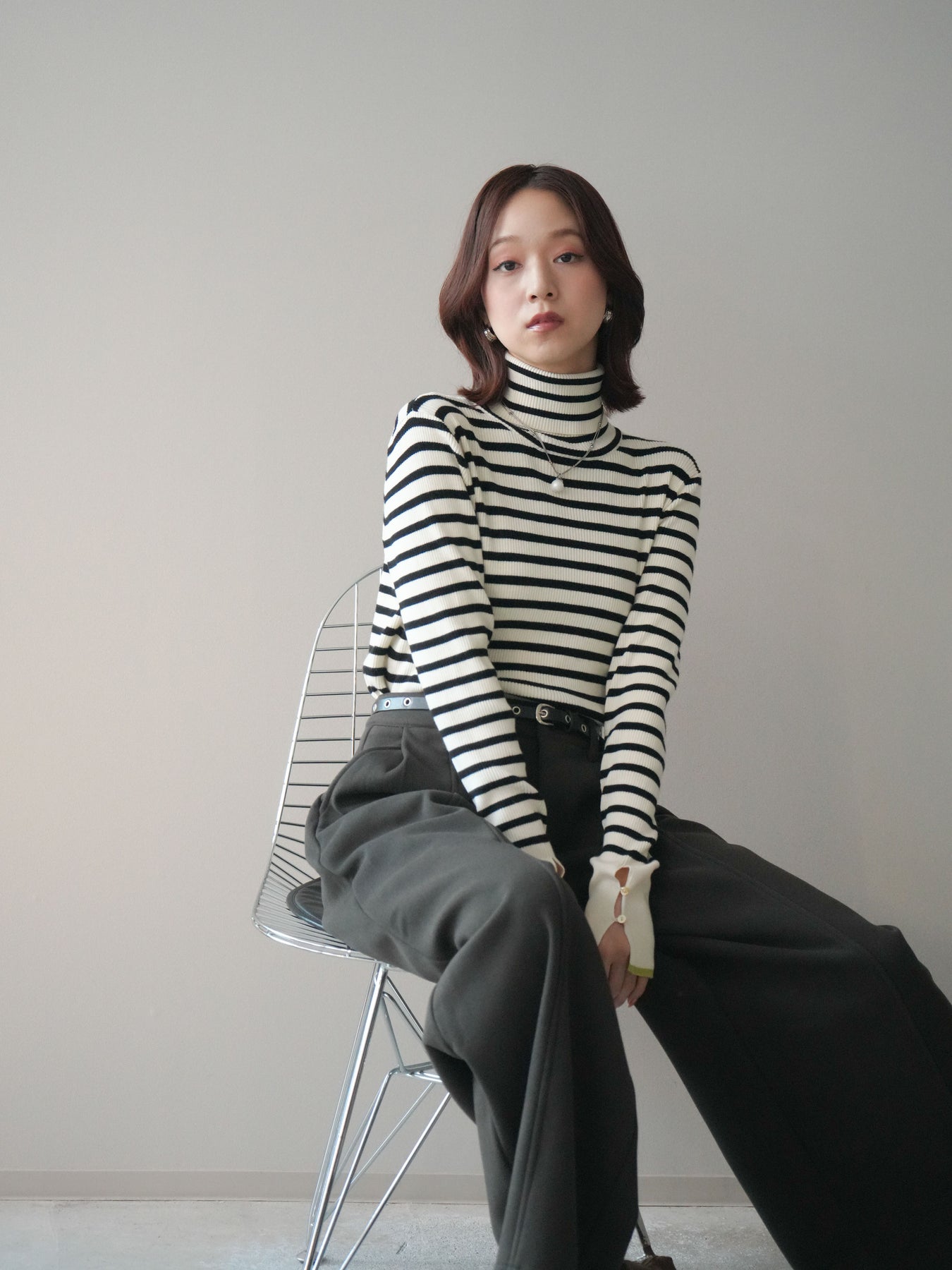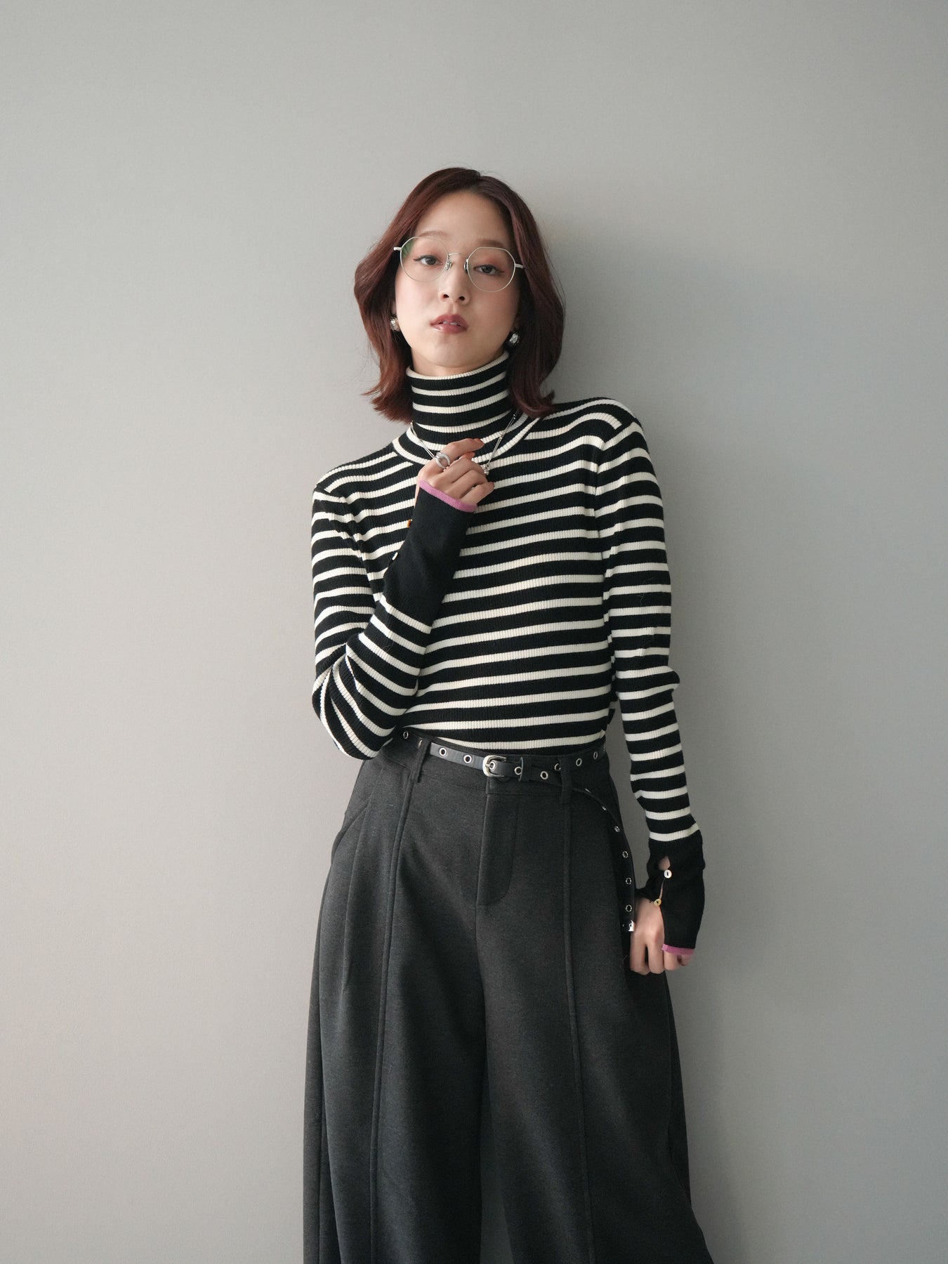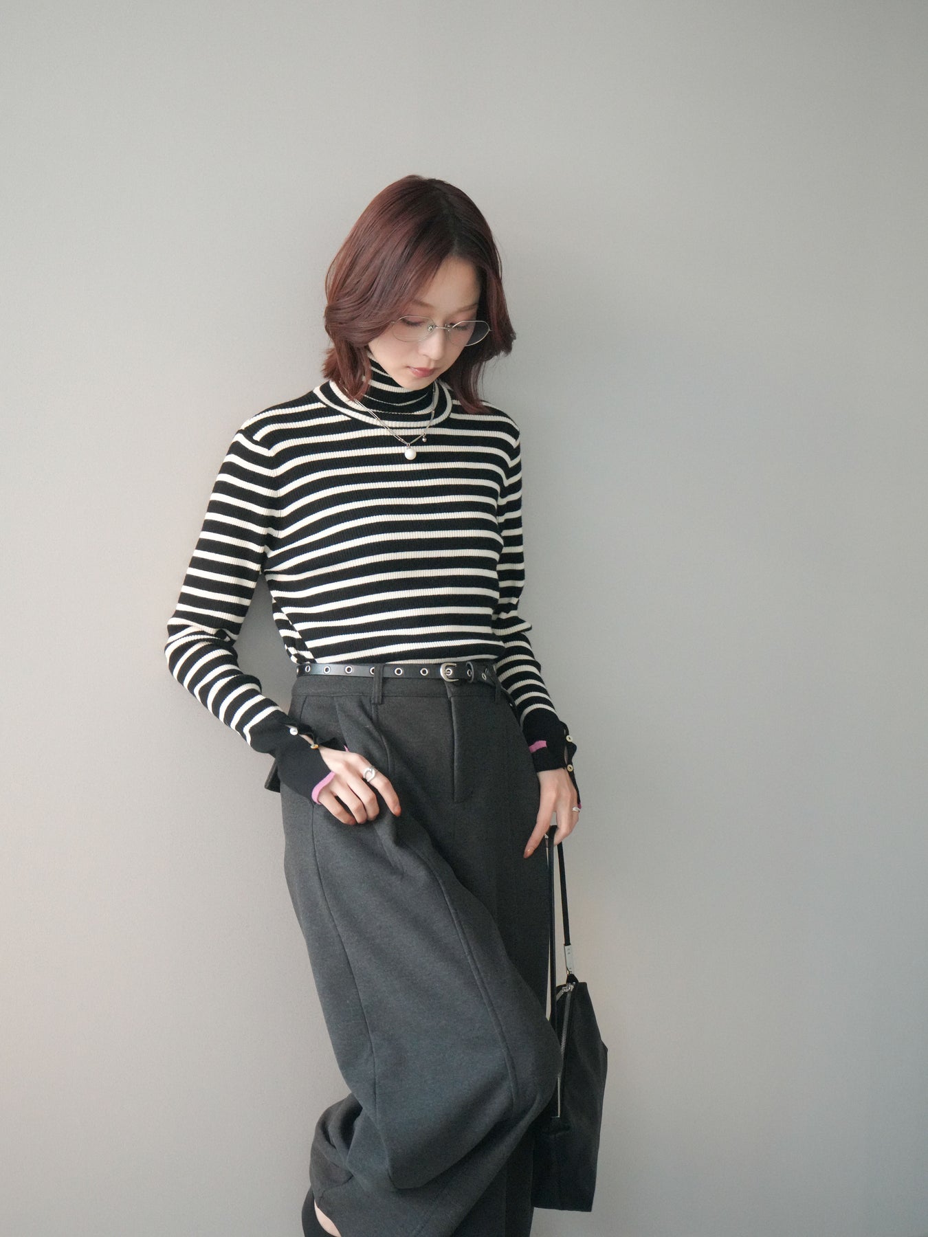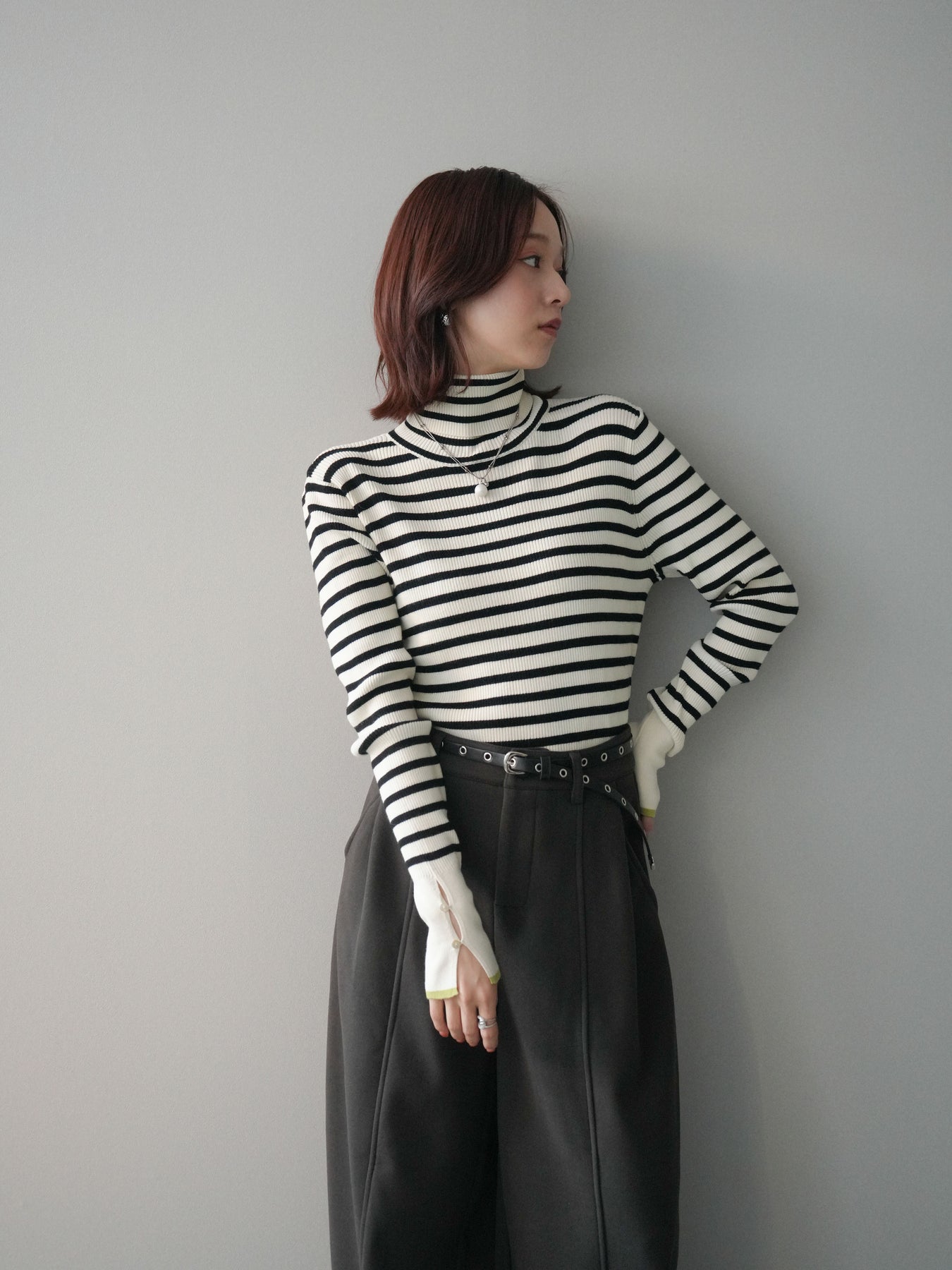 ◆ [予約]袖配色ハイネックボーダーリブニットトップス