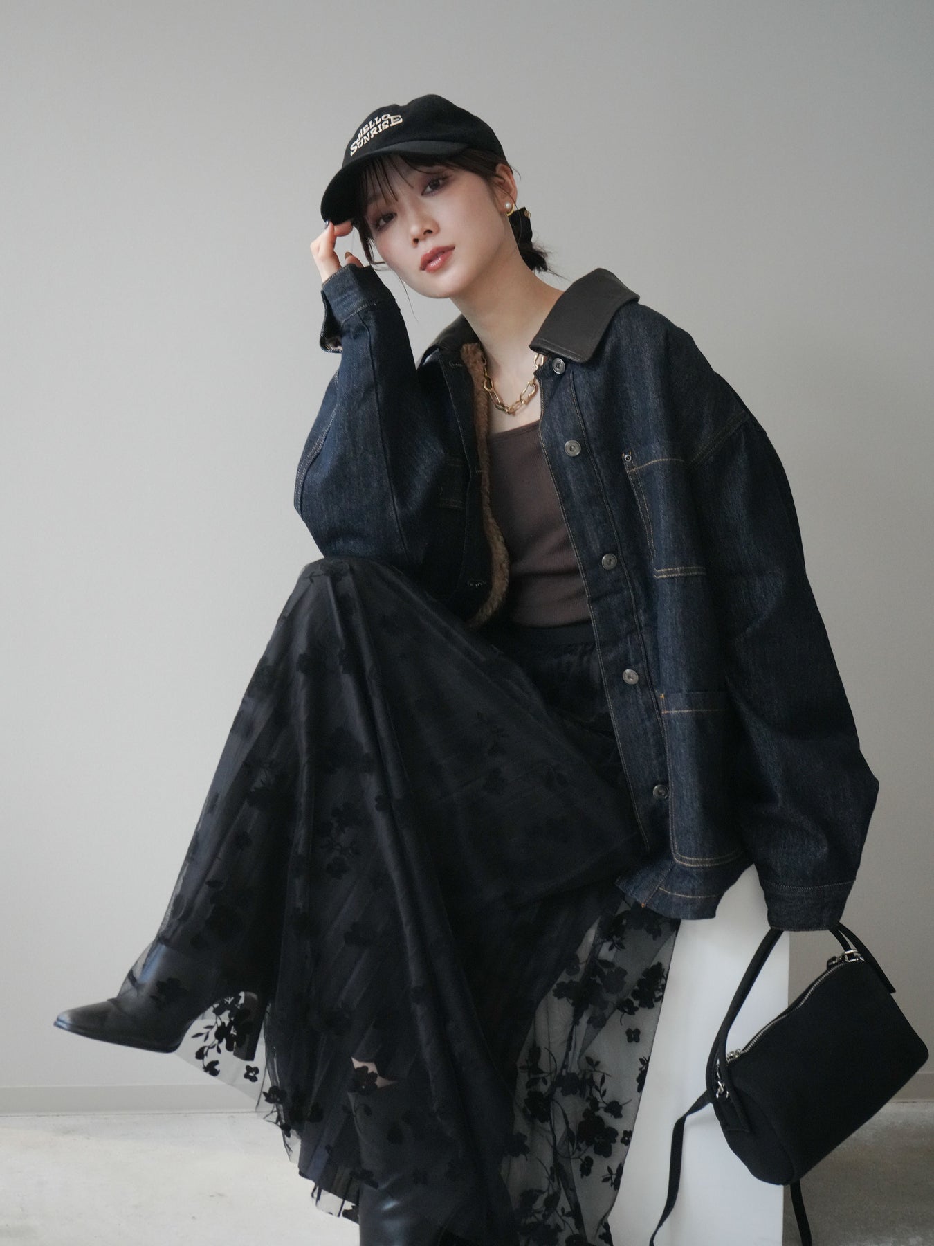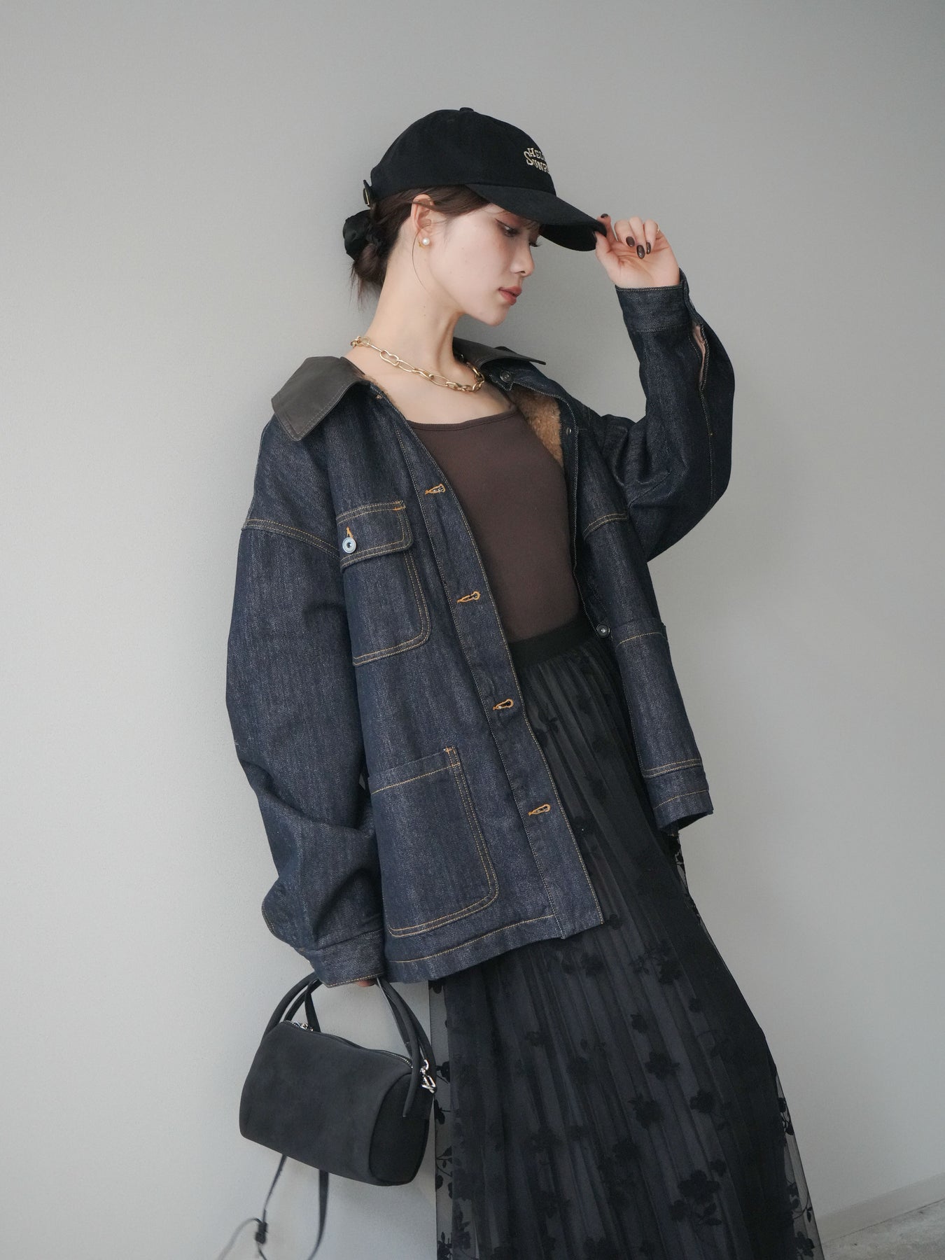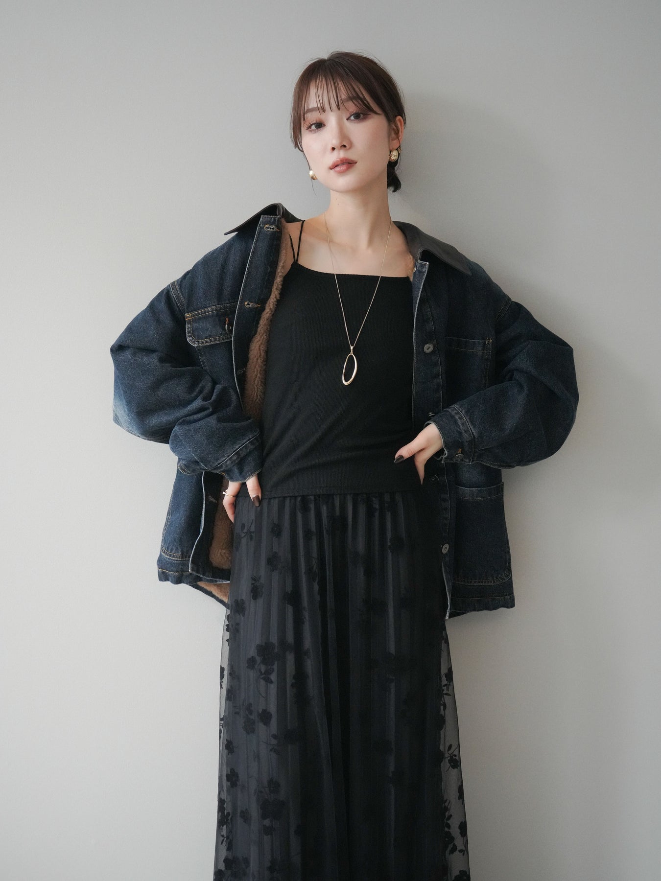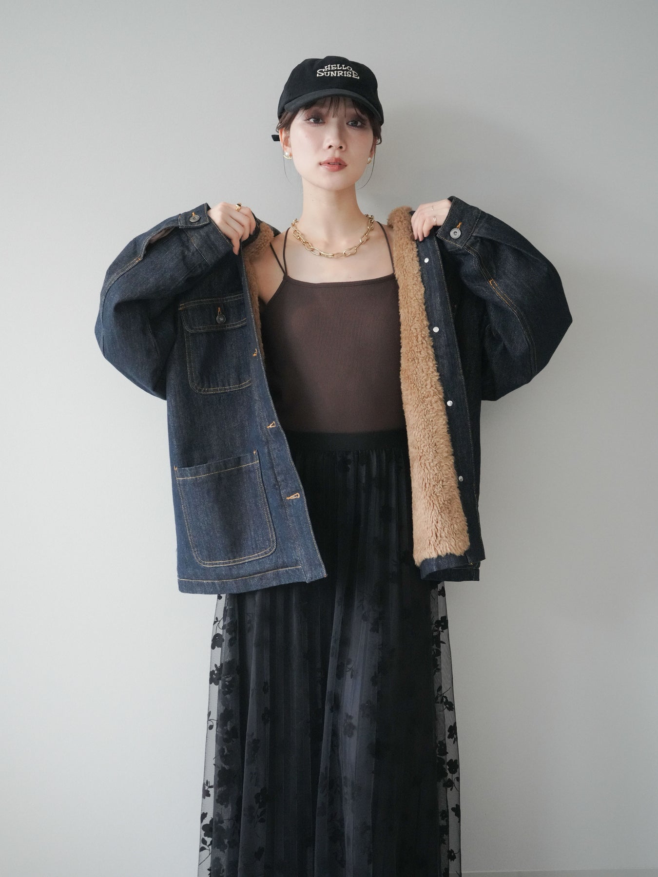 ヴィンテージライクなデニム素材を使用し、裏地にふわふわのファーを仕込んだフライトジャケット。外側はカジュアルなデニム、内側は暖かなファーの贅沢な組み合わせで、見た目以上の防寒性を発揮します。大きめの襟やポケットがアクセントになり、どこかレトロな雰囲気を漂わせつつも、トレンド感のあるシルエットに仕上げています。ゆとりのあるサイズ感でニットの上からも羽織りやすく、冬のデイリーコーデに頼れる一枚です。 ※ボトムス、キャミソール(インナー)以外の商品は一律でインナーは付属していません。
