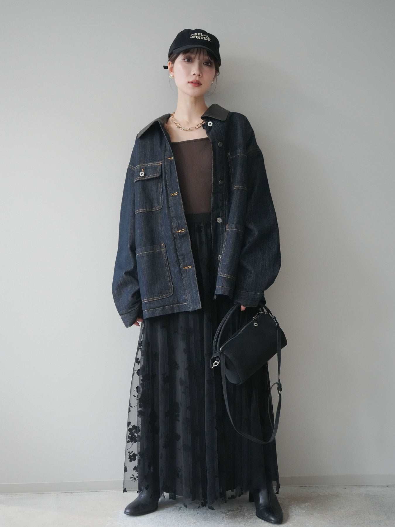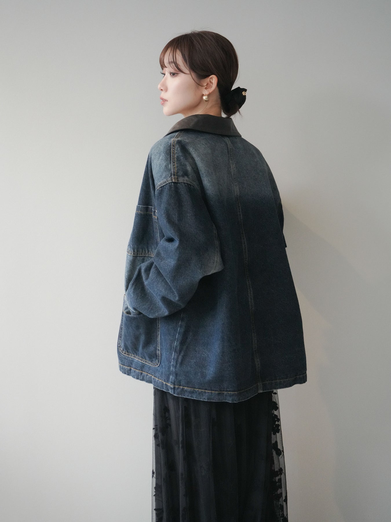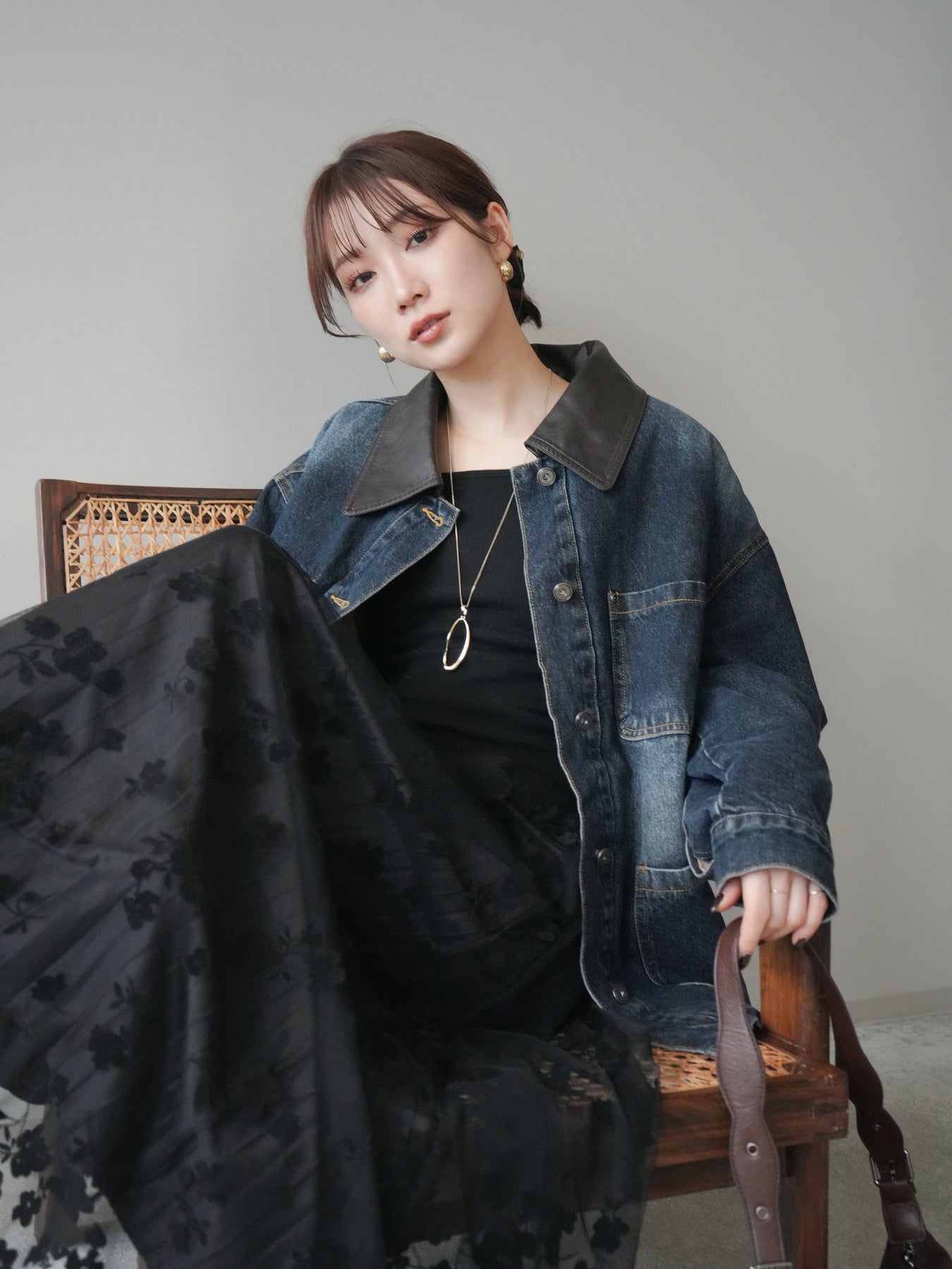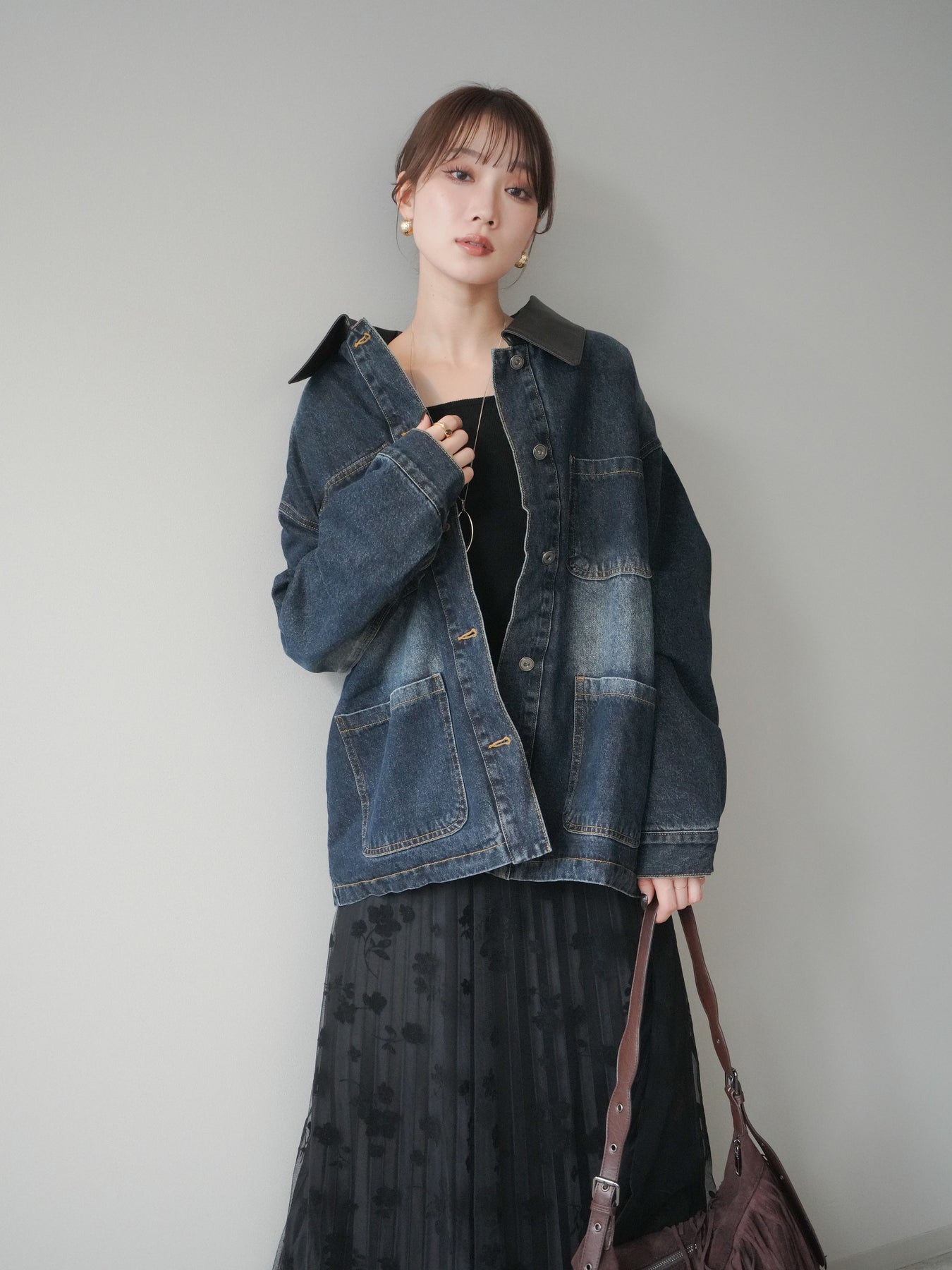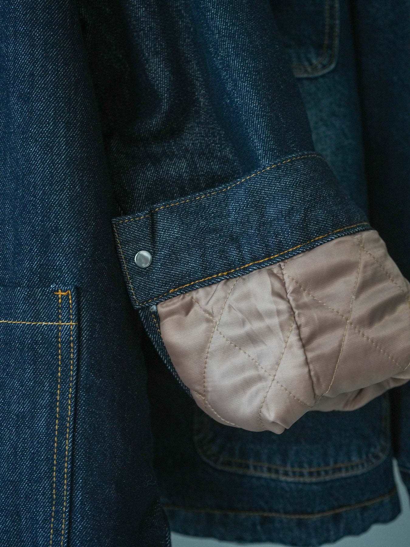 ヴィンテージライクなデニム素材を使用し、裏地にふわふわのファーを仕込んだフライトジャケット。外側はカジュアルなデニム、内側は暖かなファーの贅沢な組み合わせで、見た目以上の防寒性を発揮します。大きめの襟やポケットがアクセントになり、どこかレトロな雰囲気を漂わせつつも、トレンド感のあるシルエットに仕上げています。ゆとりのあるサイズ感でニットの上からも羽織りやすく、冬のデイリーコーデに頼れる一枚です。 ※ボトムス、キャミソール(インナー)以外の商品は一律でインナーは付属していません。