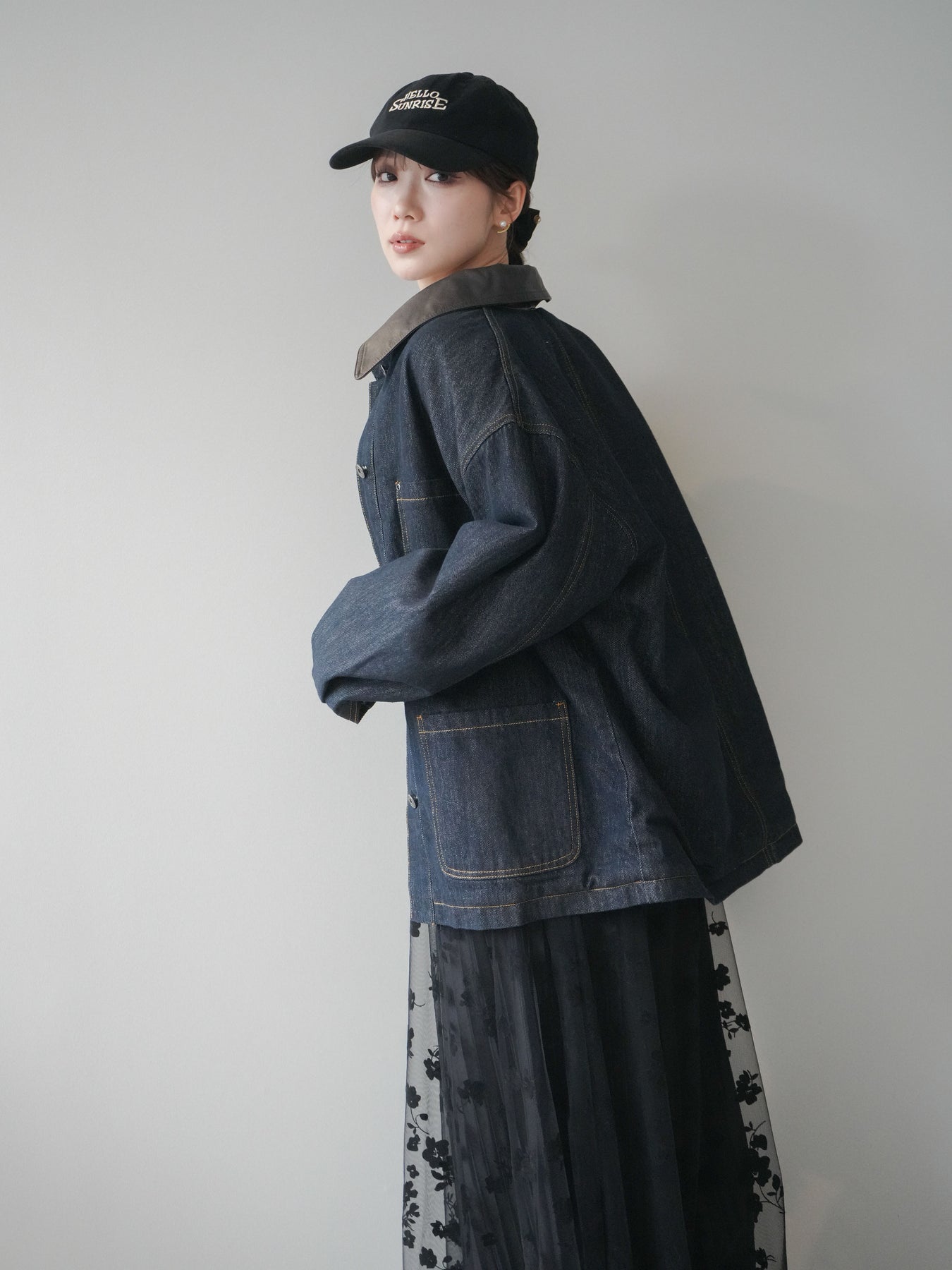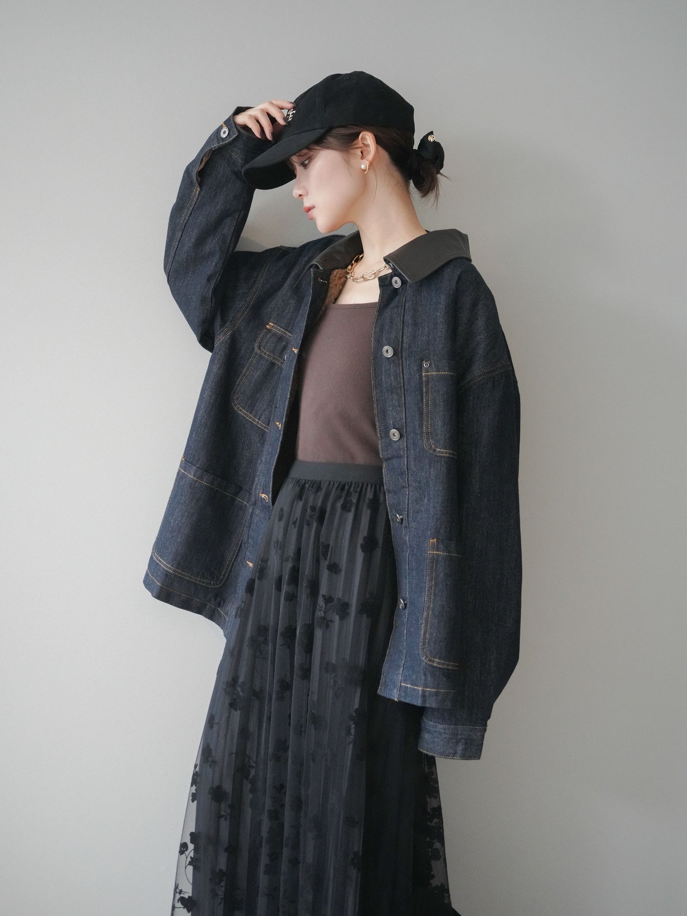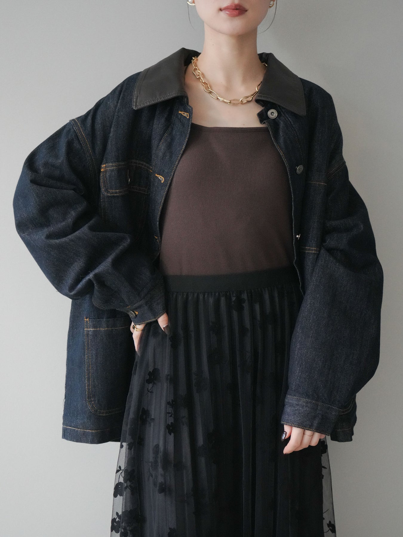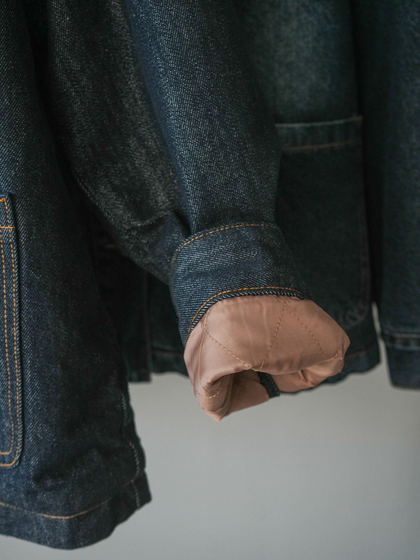 ヴィンテージライクなデニム素材を使用し、裏地にふわふわのファーを仕込んだフライトジャケット。外側はカジュアルなデニム、内側は暖かなファーの贅沢な組み合わせで、見た目以上の防寒性を発揮します。大きめの襟やポケットがアクセントになり、どこかレトロな雰囲気を漂わせつつも、トレンド感のあるシルエットに仕上げています。ゆとりのあるサイズ感でニットの上からも羽織りやすく、冬のデイリーコーデに頼れる一枚です。 ※ボトムス、キャミソール(インナー)以外の商品は一律でインナーは付属していません。