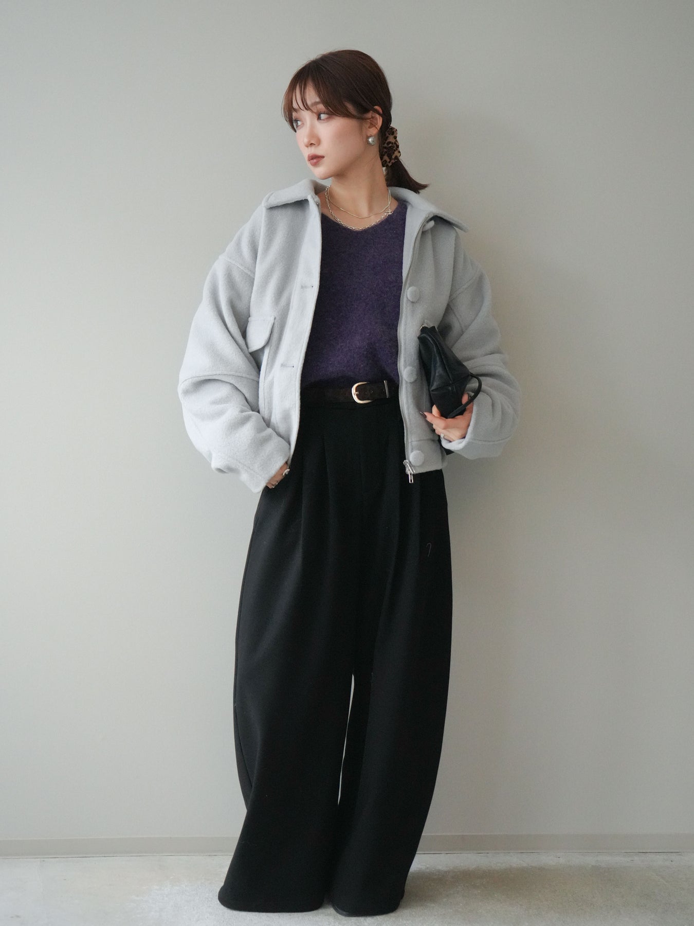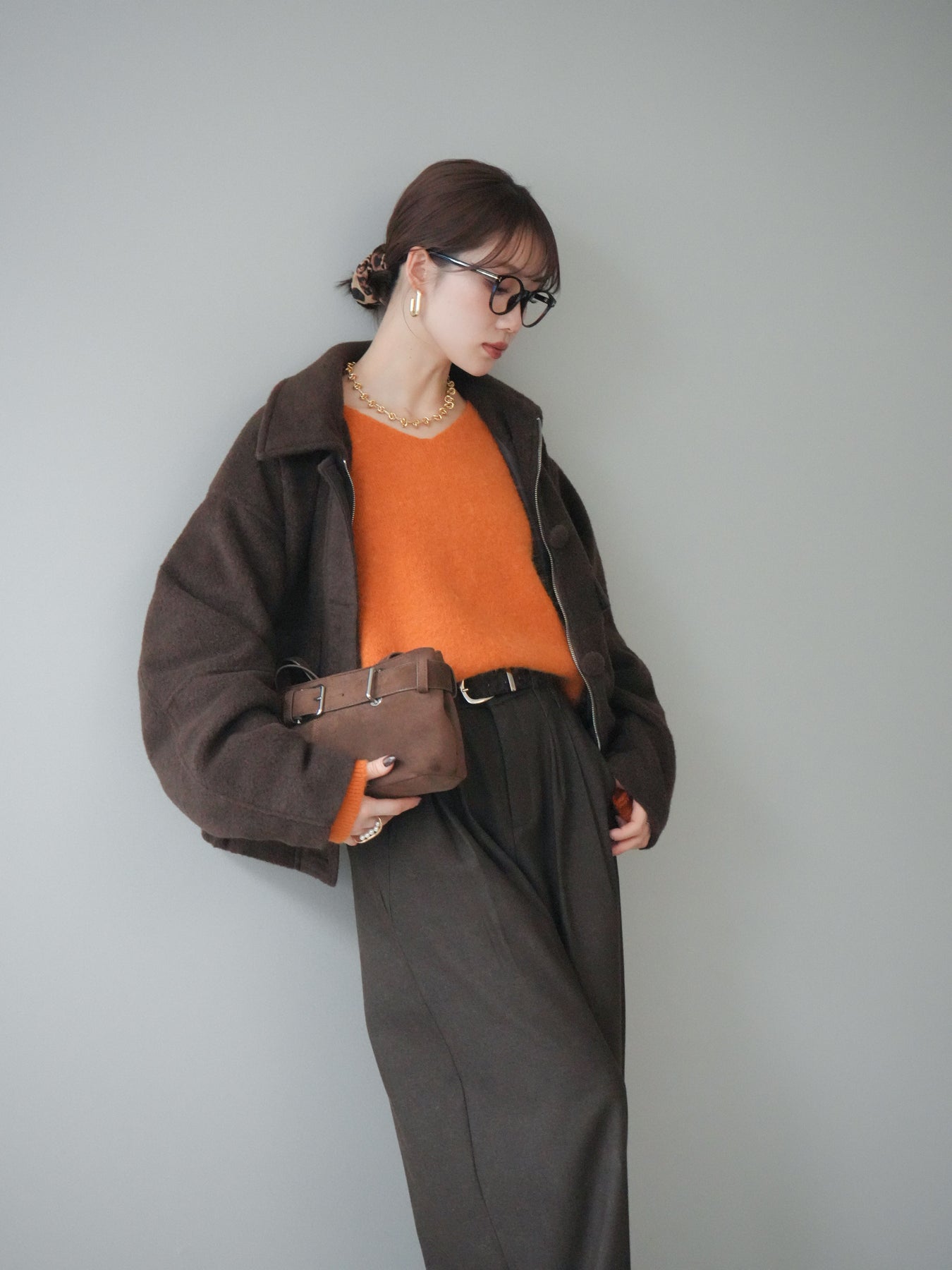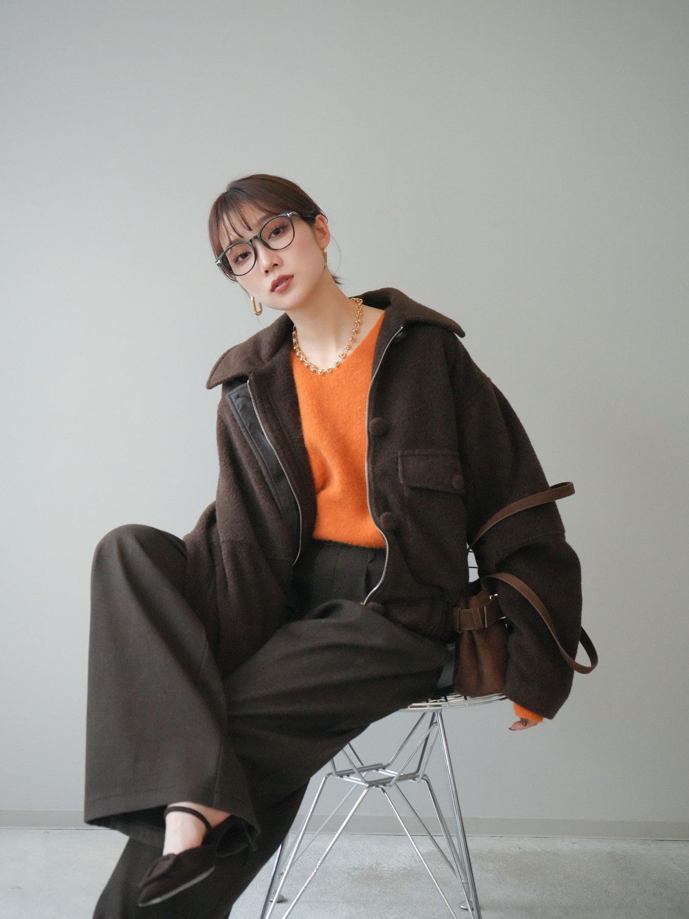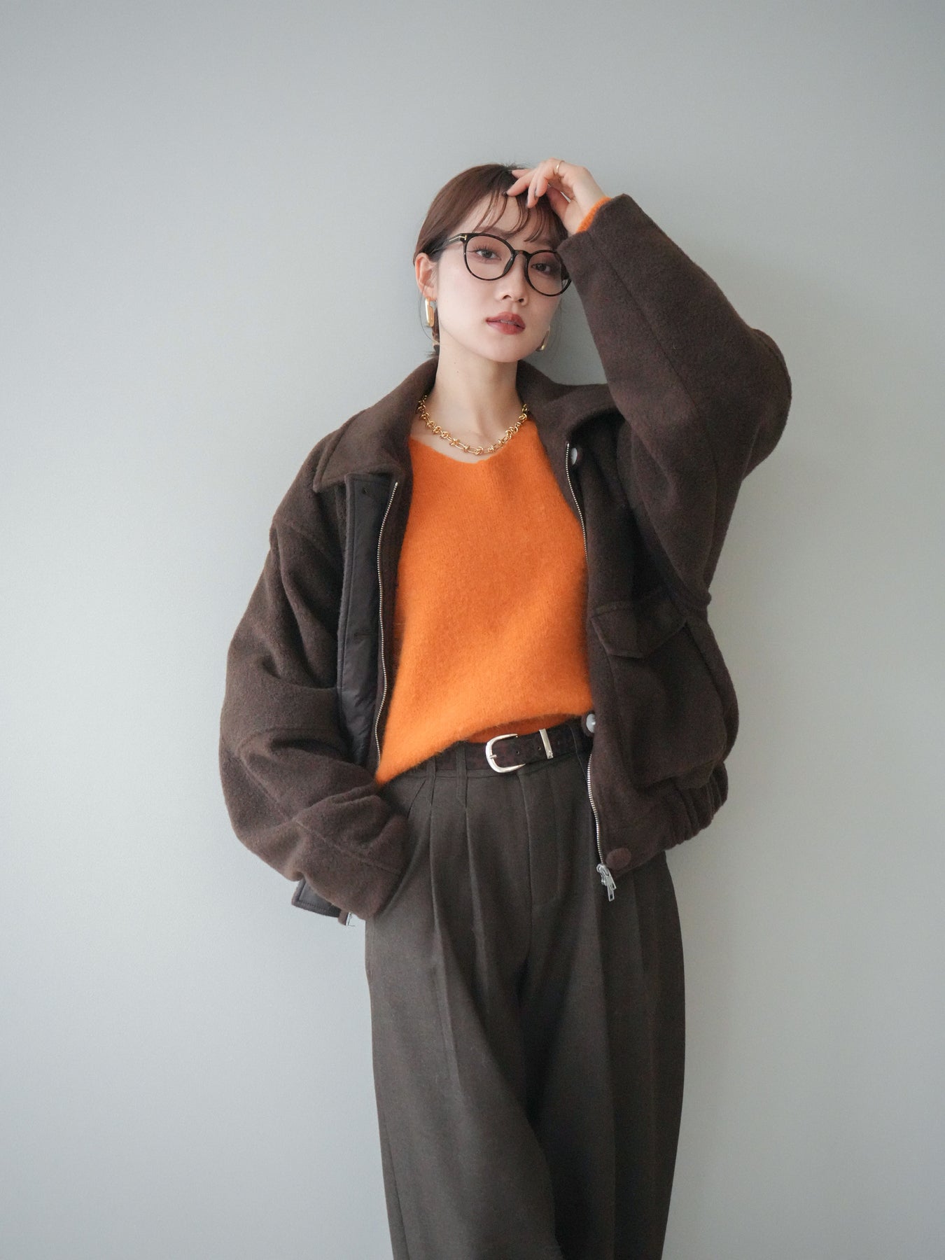 ウールのような柔らかな質感と温かみのある風合いが魅力のフライトジャケット。コンパクトな丈感と程よいボリュームスリーブがバランスよく、女性らしいシルエットを引き立てます。大きめのフラップポケットや包みボタンがアクセントとなり、シンプルながら存在感のある一枚に。ゆったりとしたサイズ感でニットの上からも羽織りやすく、カジュアルからきれいめまで幅広いスタイリングにマッチします。季節の始まりから冬本番まで活躍する万能アウターです。 ※ボトムス、キャミソール(インナー)以外の商品は一律でインナーは付属していません。