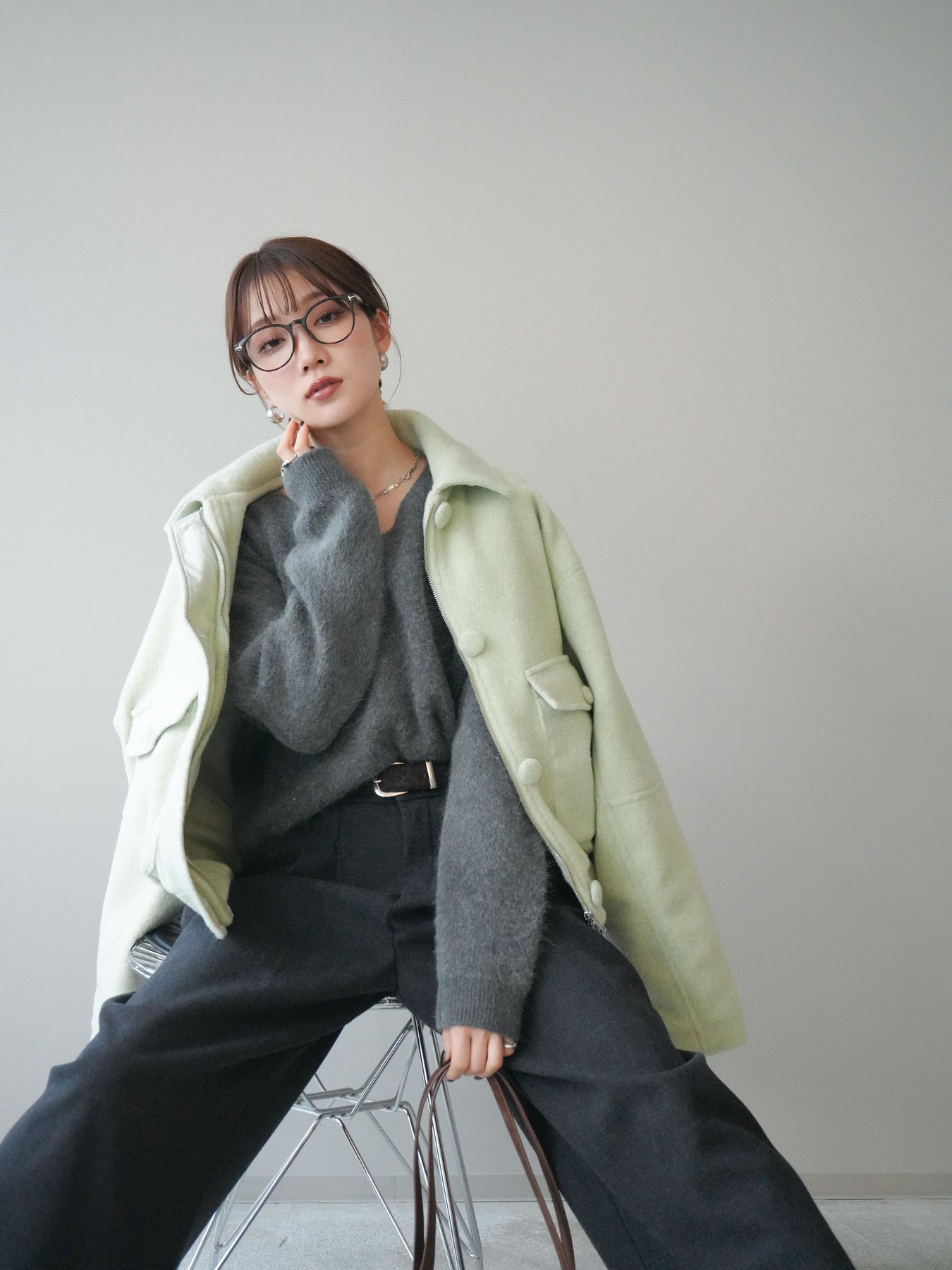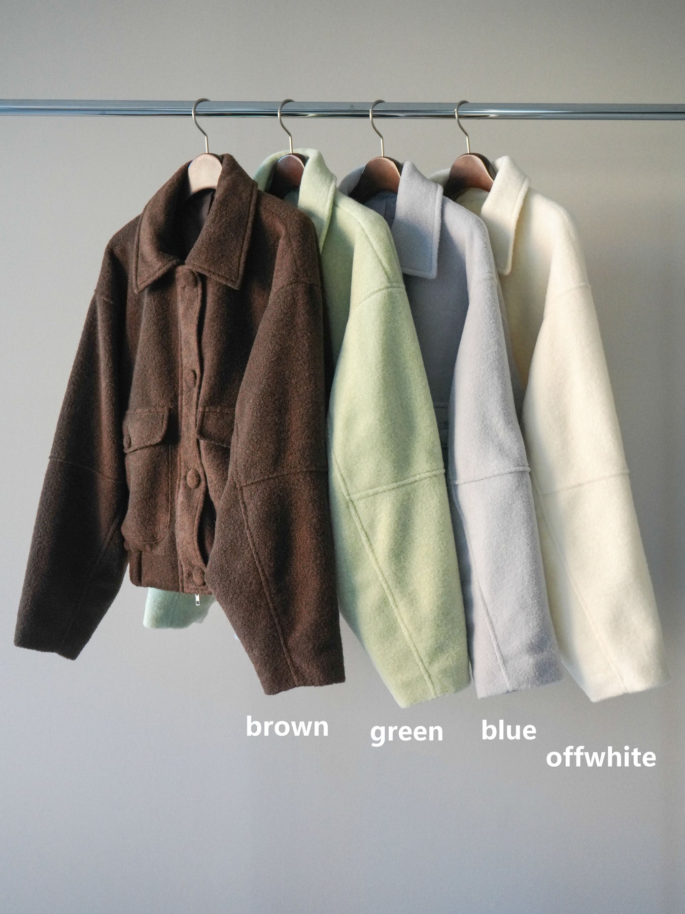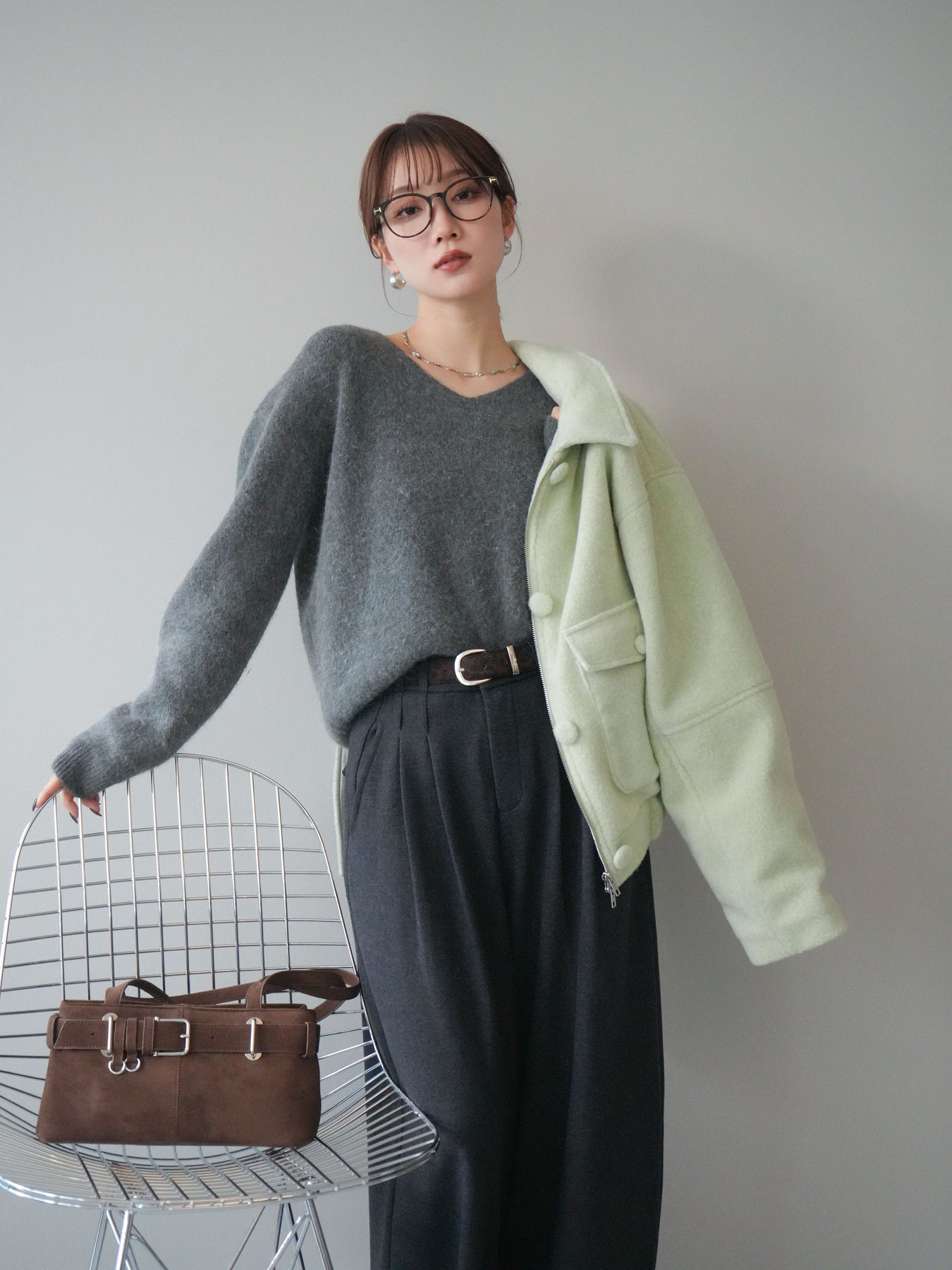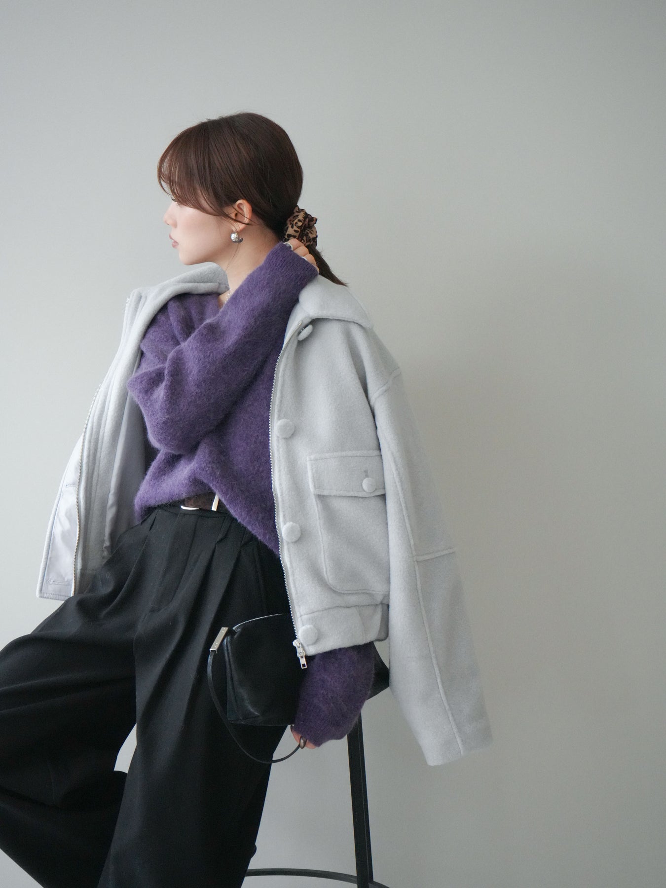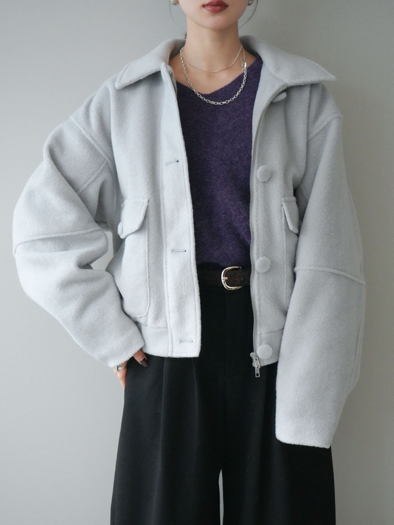 ウールのような柔らかな質感と温かみのある風合いが魅力のフライトジャケット。コンパクトな丈感と程よいボリュームスリーブがバランスよく、女性らしいシルエットを引き立てます。大きめのフラップポケットや包みボタンがアクセントとなり、シンプルながら存在感のある一枚に。ゆったりとしたサイズ感でニットの上からも羽織りやすく、カジュアルからきれいめまで幅広いスタイリングにマッチします。季節の始まりから冬本番まで活躍する万能アウターです。 ※ボトムス、キャミソール(インナー)以外の商品は一律でインナーは付属していません。