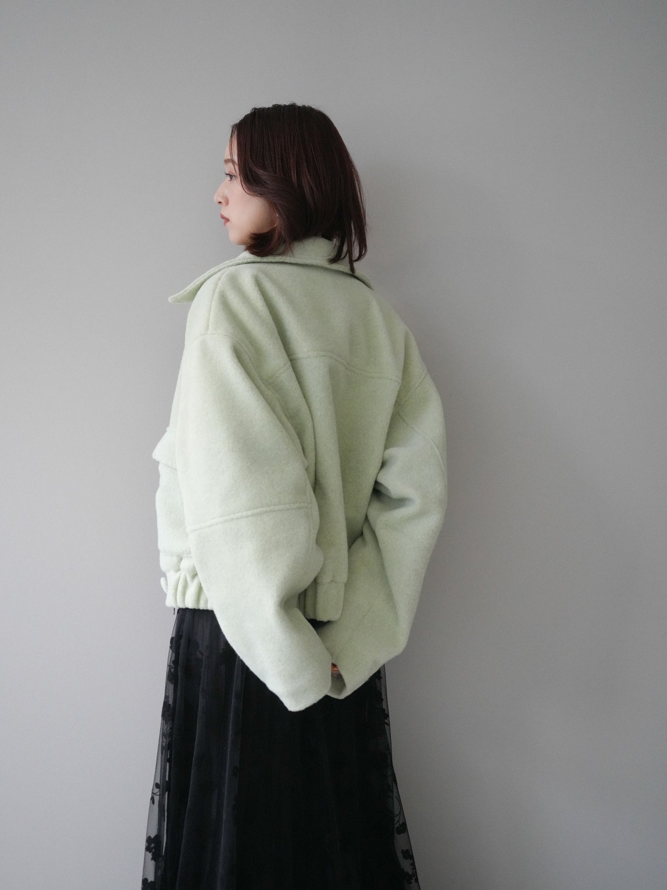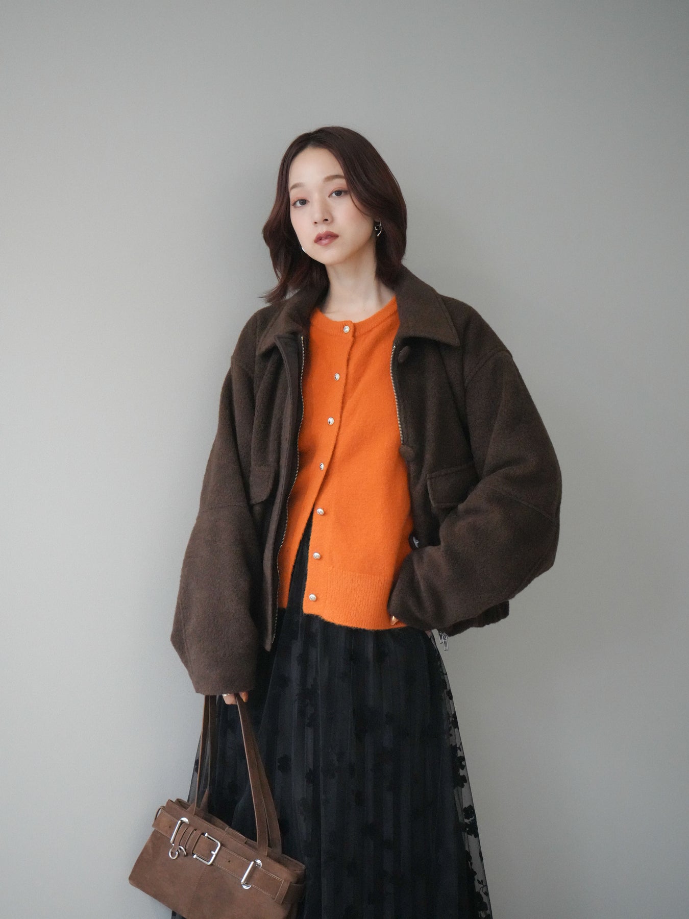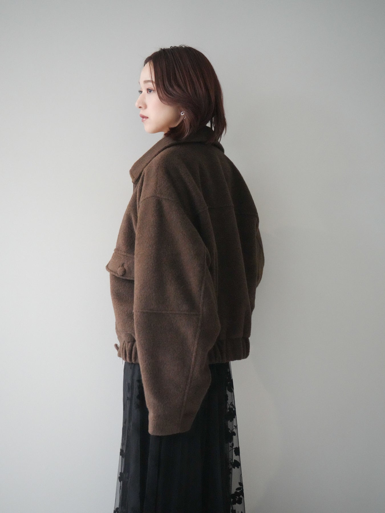 ウールのような柔らかな質感と温かみのある風合いが魅力のフライトジャケット。コンパクトな丈感と程よいボリュームスリーブがバランスよく、女性らしいシルエットを引き立てます。大きめのフラップポケットや包みボタンがアクセントとなり、シンプルながら存在感のある一枚に。ゆったりとしたサイズ感でニットの上からも羽織りやすく、カジュアルからきれいめまで幅広いスタイリングにマッチします。季節の始まりから冬本番まで活躍する万能アウターです。 ※ボトムス、キャミソール(インナー)以外の商品は一律でインナーは付属していません。