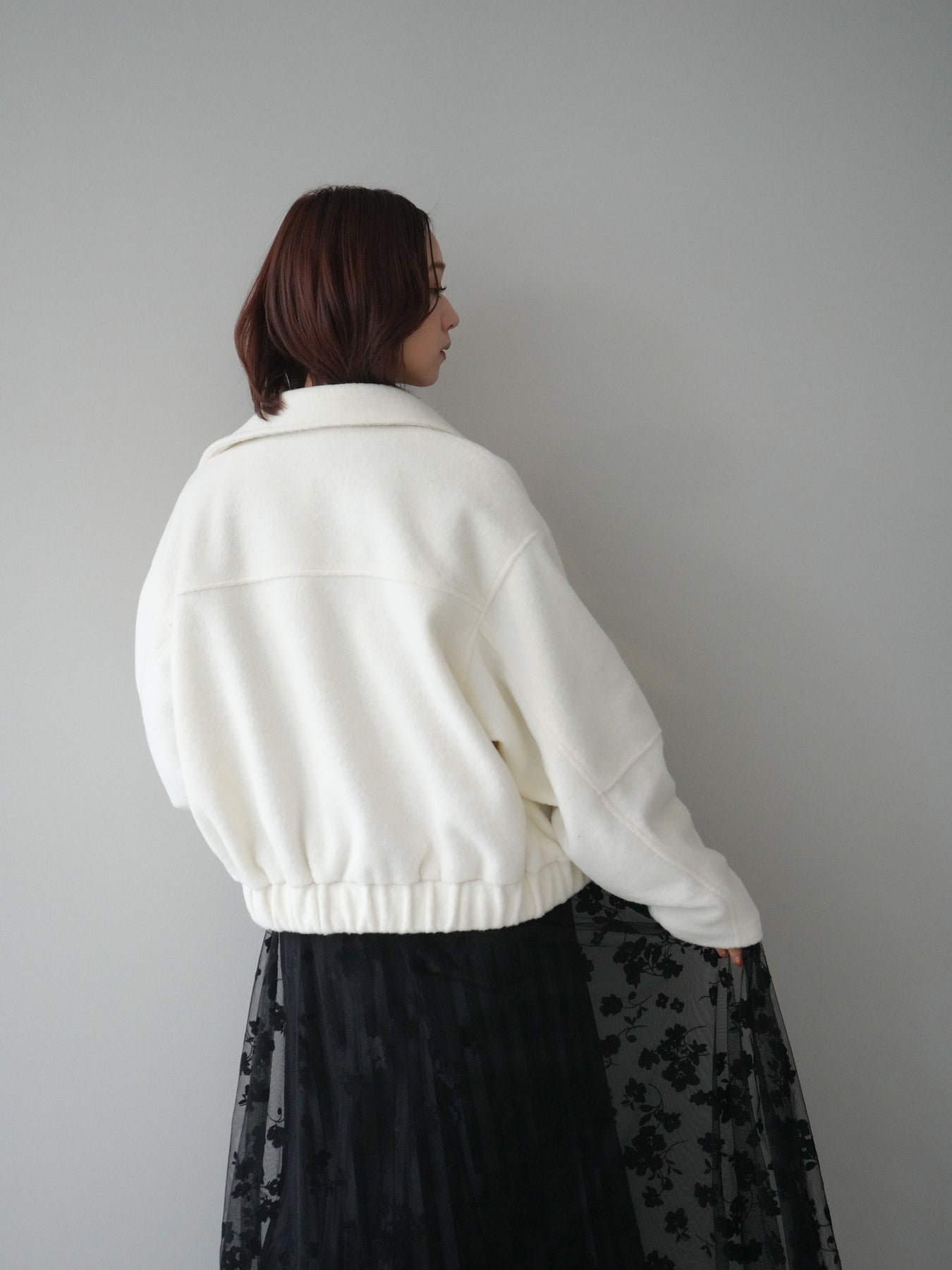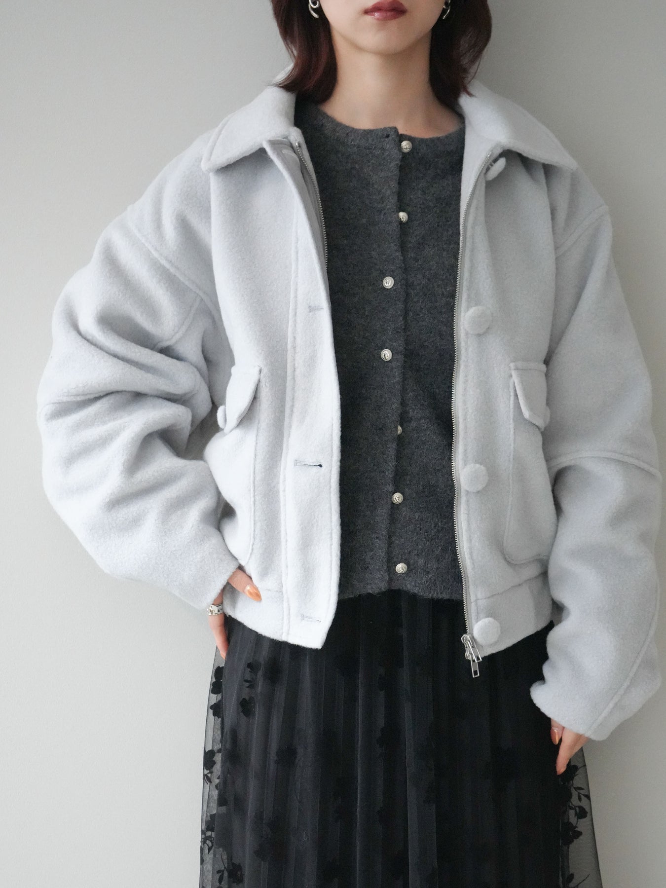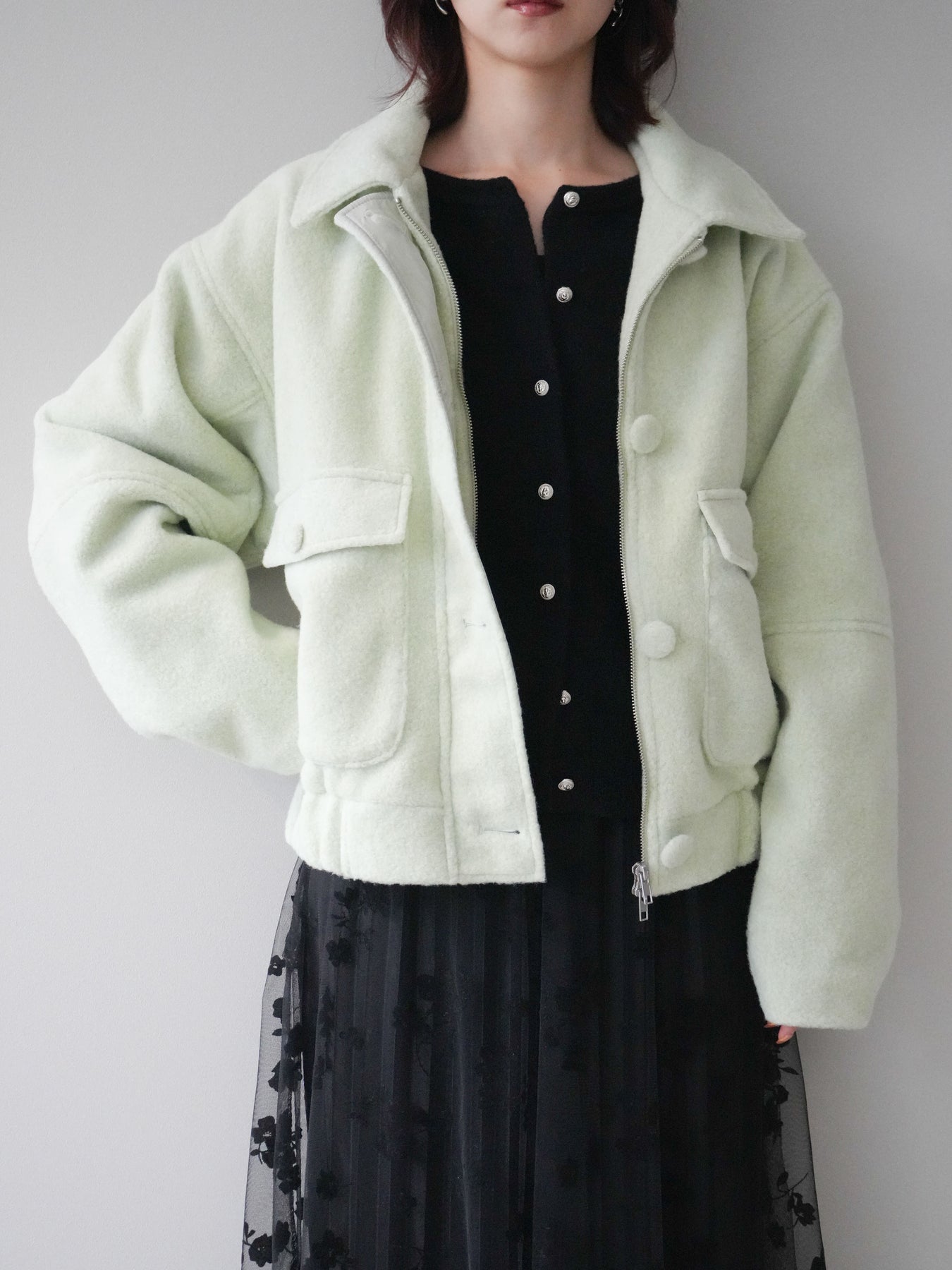 ウールのような柔らかな質感と温かみのある風合いが魅力のフライトジャケット。コンパクトな丈感と程よいボリュームスリーブがバランスよく、女性らしいシルエットを引き立てます。大きめのフラップポケットや包みボタンがアクセントとなり、シンプルながら存在感のある一枚に。ゆったりとしたサイズ感でニットの上からも羽織りやすく、カジュアルからきれいめまで幅広いスタイリングにマッチします。季節の始まりから冬本番まで活躍する万能アウターです。 ※ボトムス、キャミソール(インナー)以外の商品は一律でインナーは付属していません。