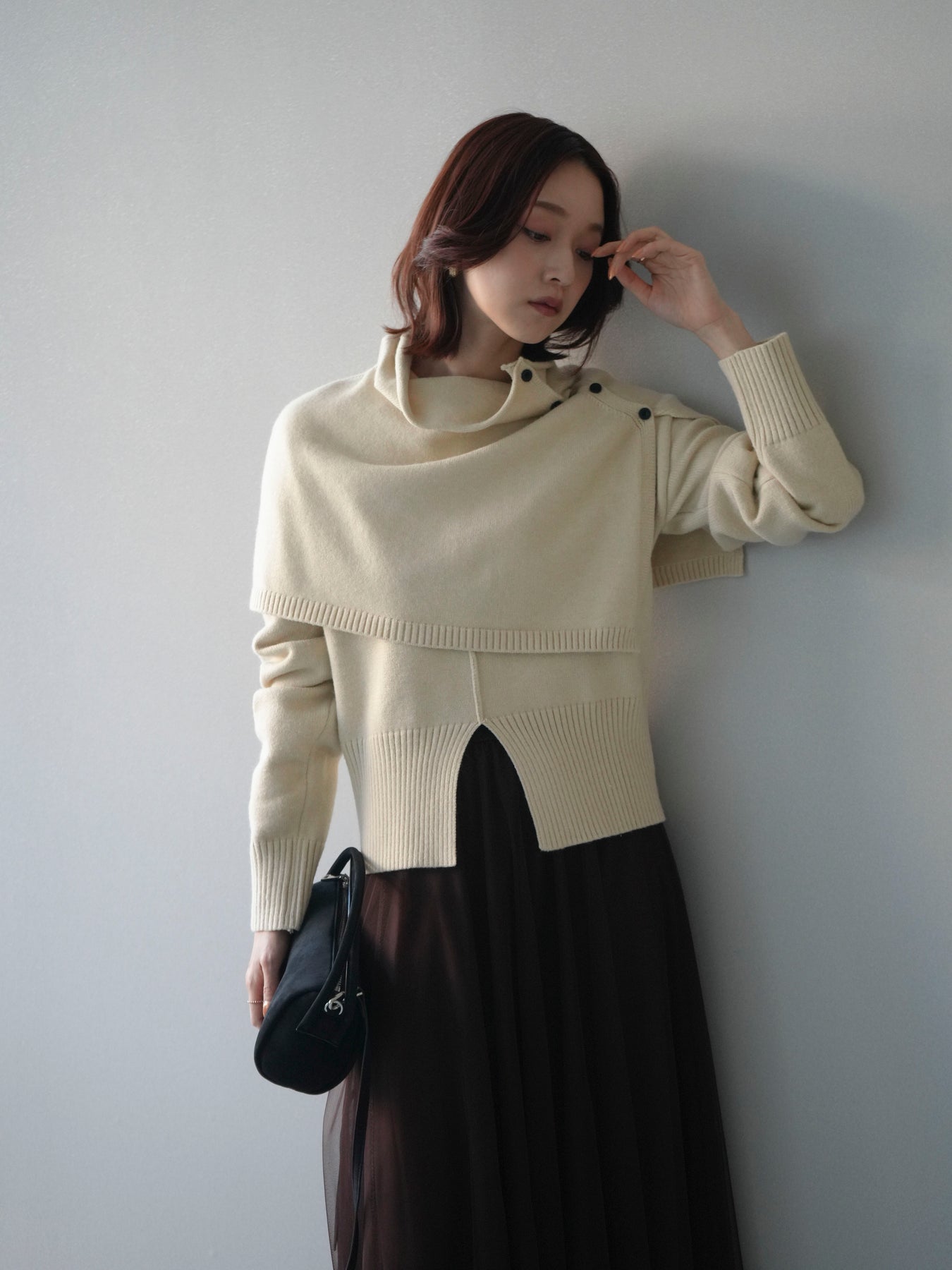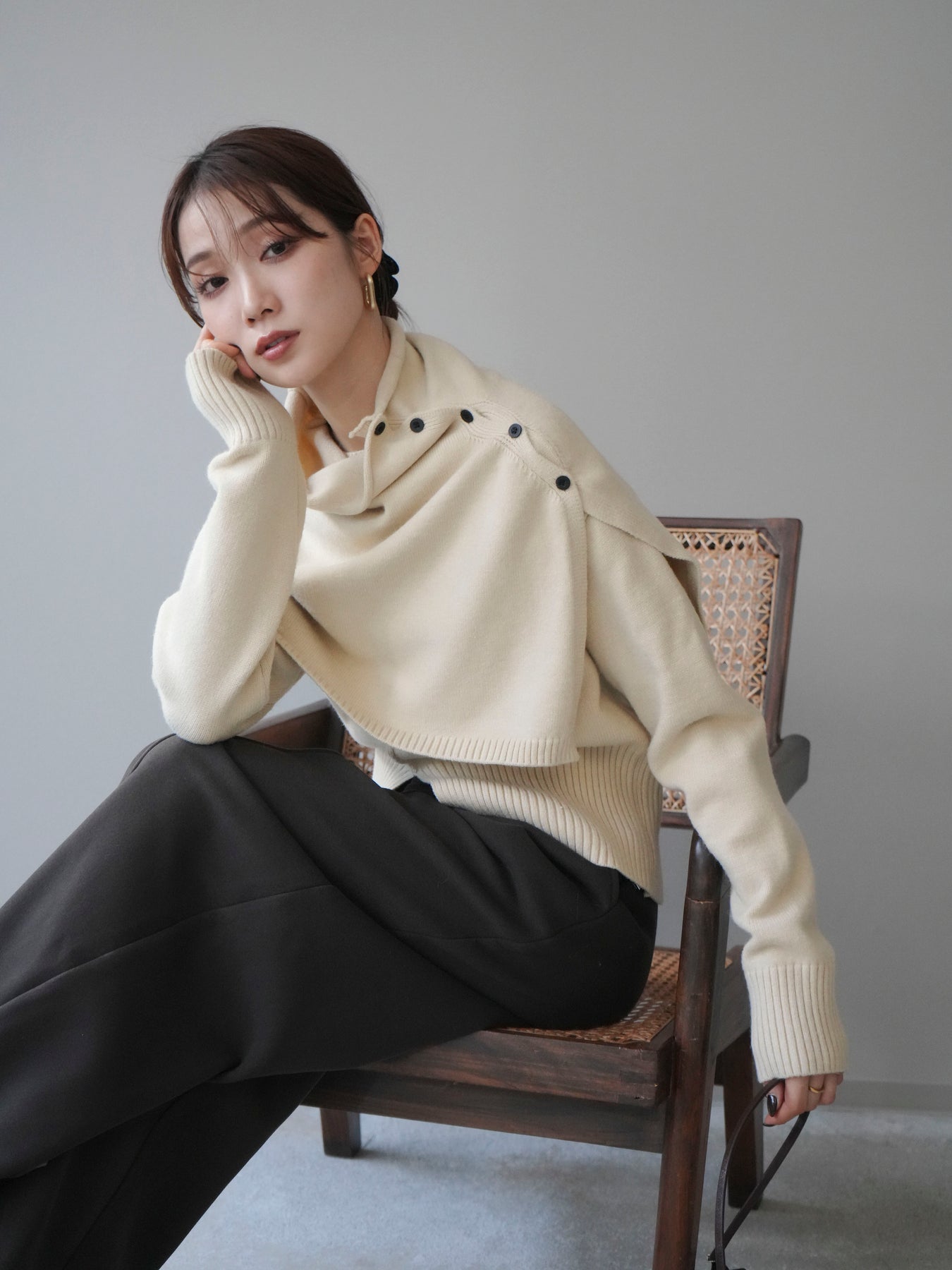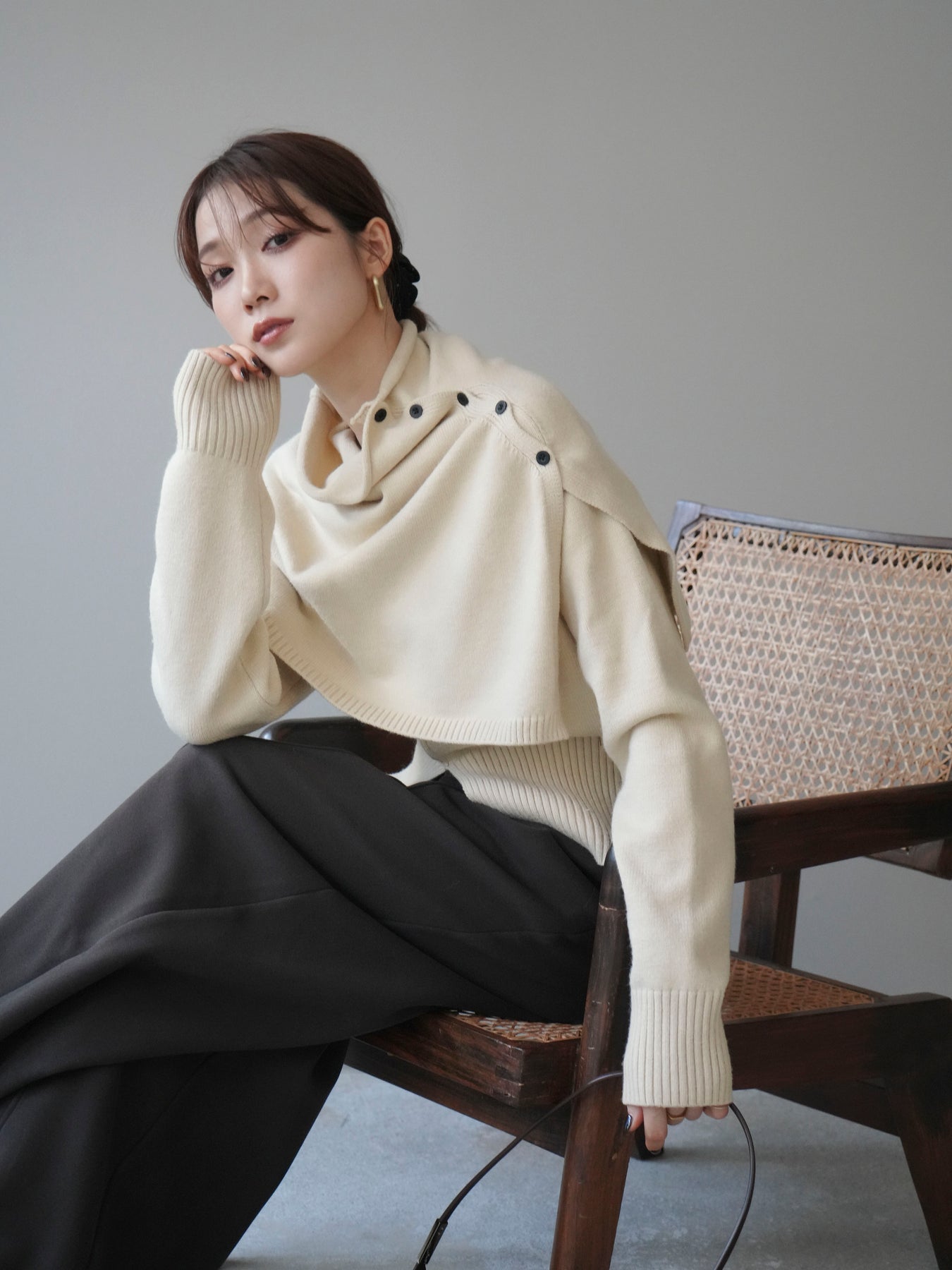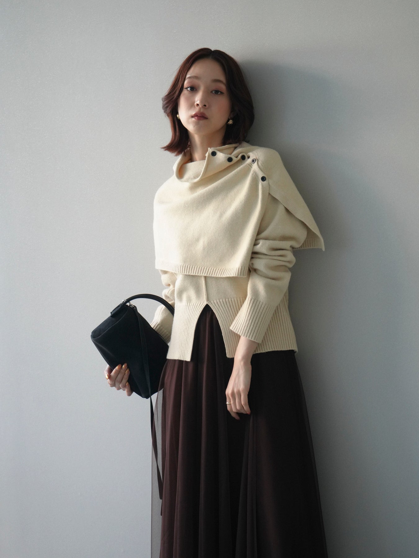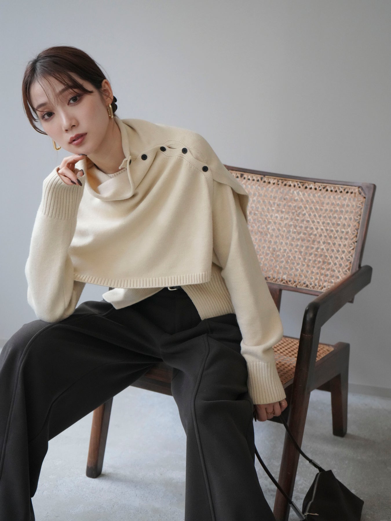 スリット入りのネックデザインが印象的なアンサンブルニット。レイヤードしたように見えるフロントのデザインがスタイリングに奥行きを生み、シンプルながら存在感のある一枚に仕上がっています。柔らかな風合いのニットは着心地がよく、程よくゆとりを持たせたシルエットがこなれ感をプラス。首元のボタンディテールは開閉によってニュアンスの変化が楽しめ、気分に合わせてアレンジできるのも魅力です。パンツにもスカートにも合わせやすく、デイリーに長く愛用できるアイテム。 ※ボトムス、キャミソール(インナー)以外の商品は一律でインナーは付属していません。
