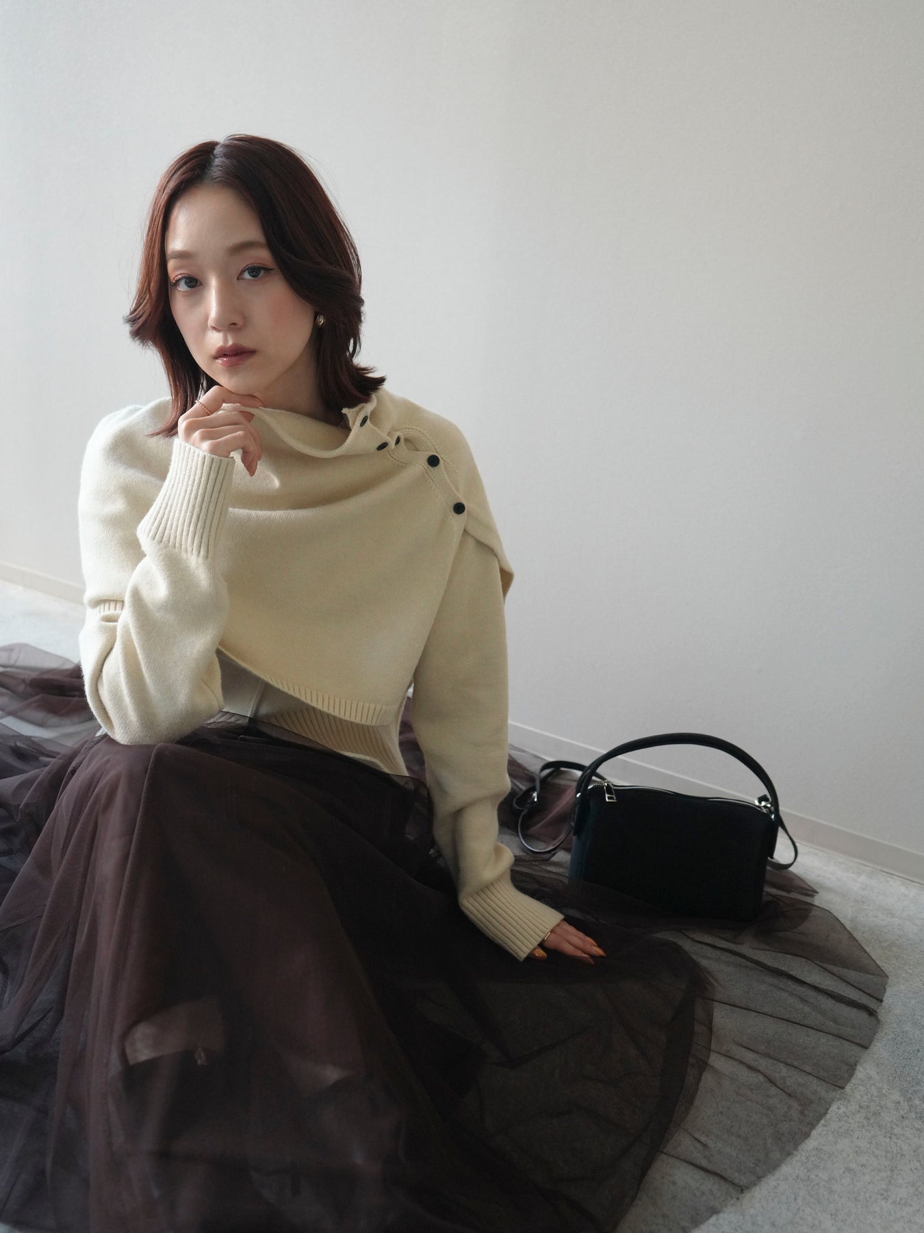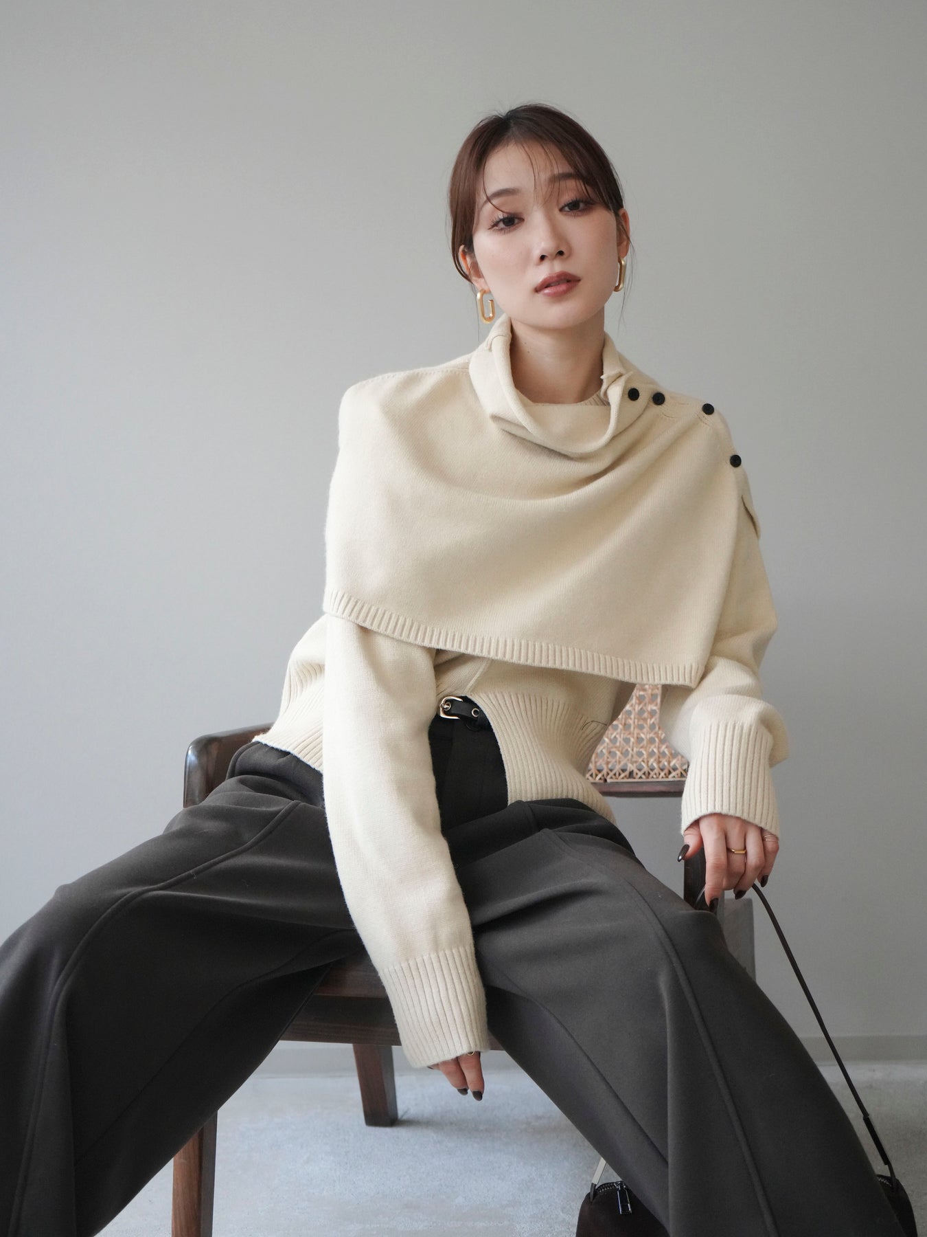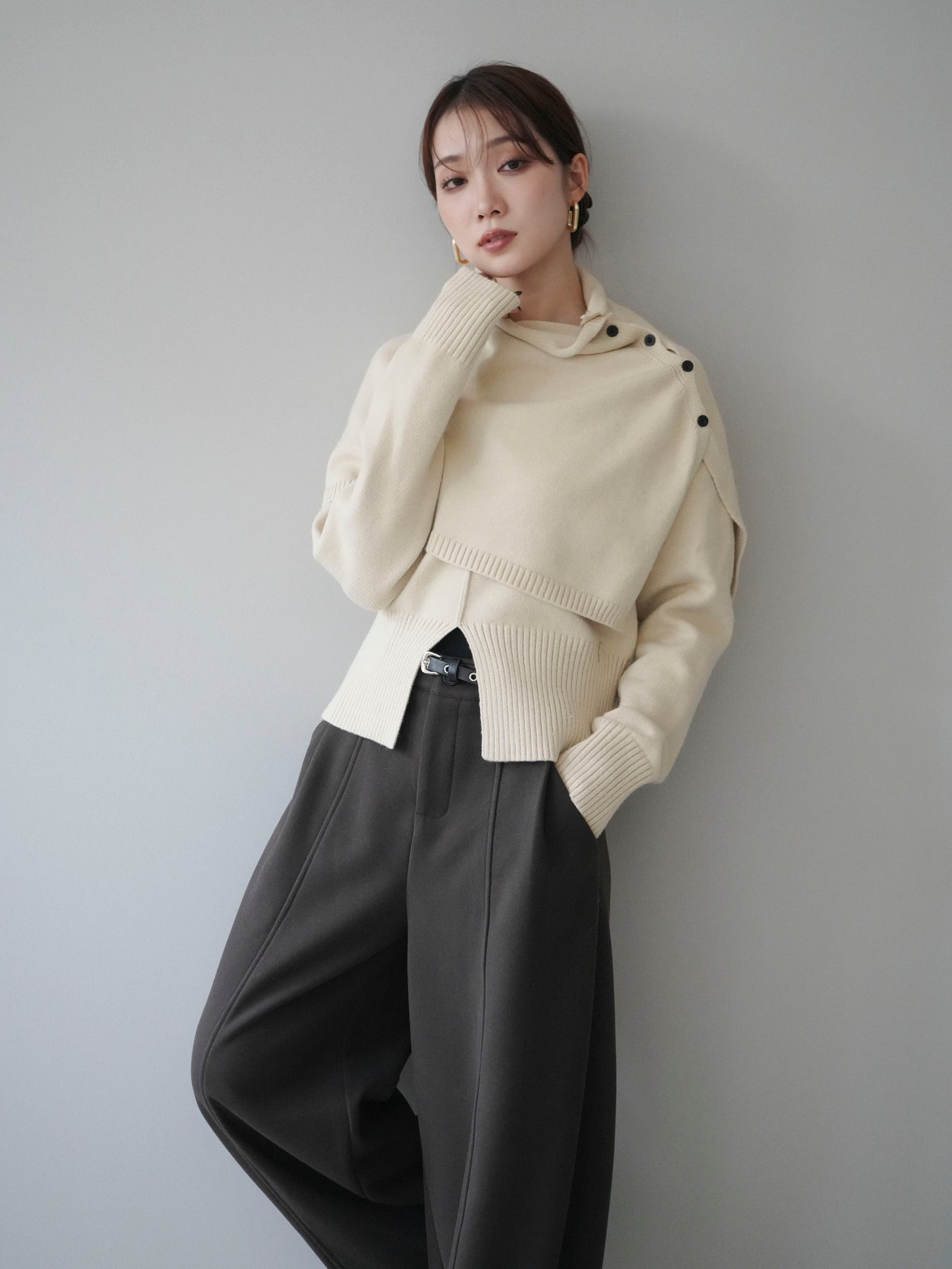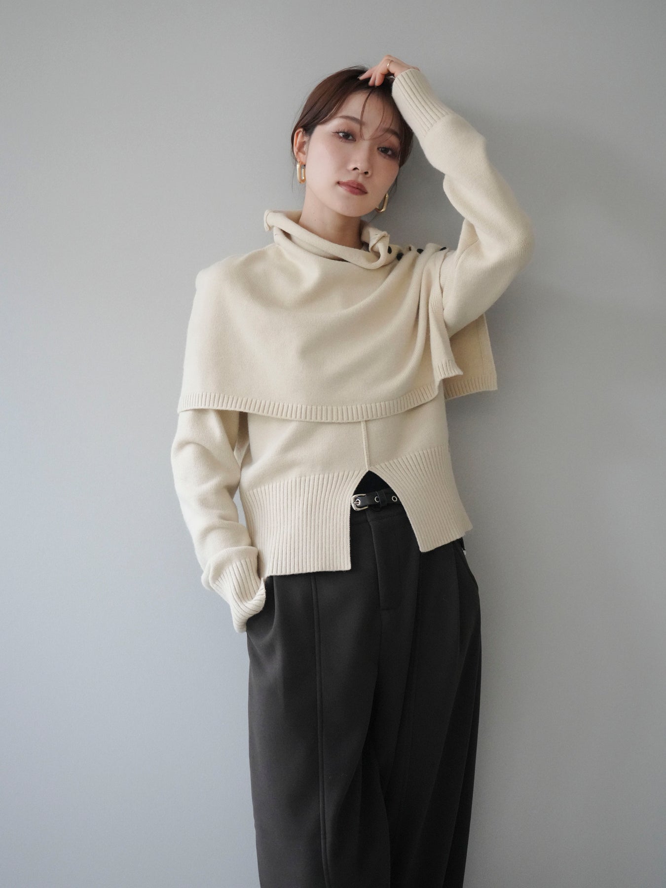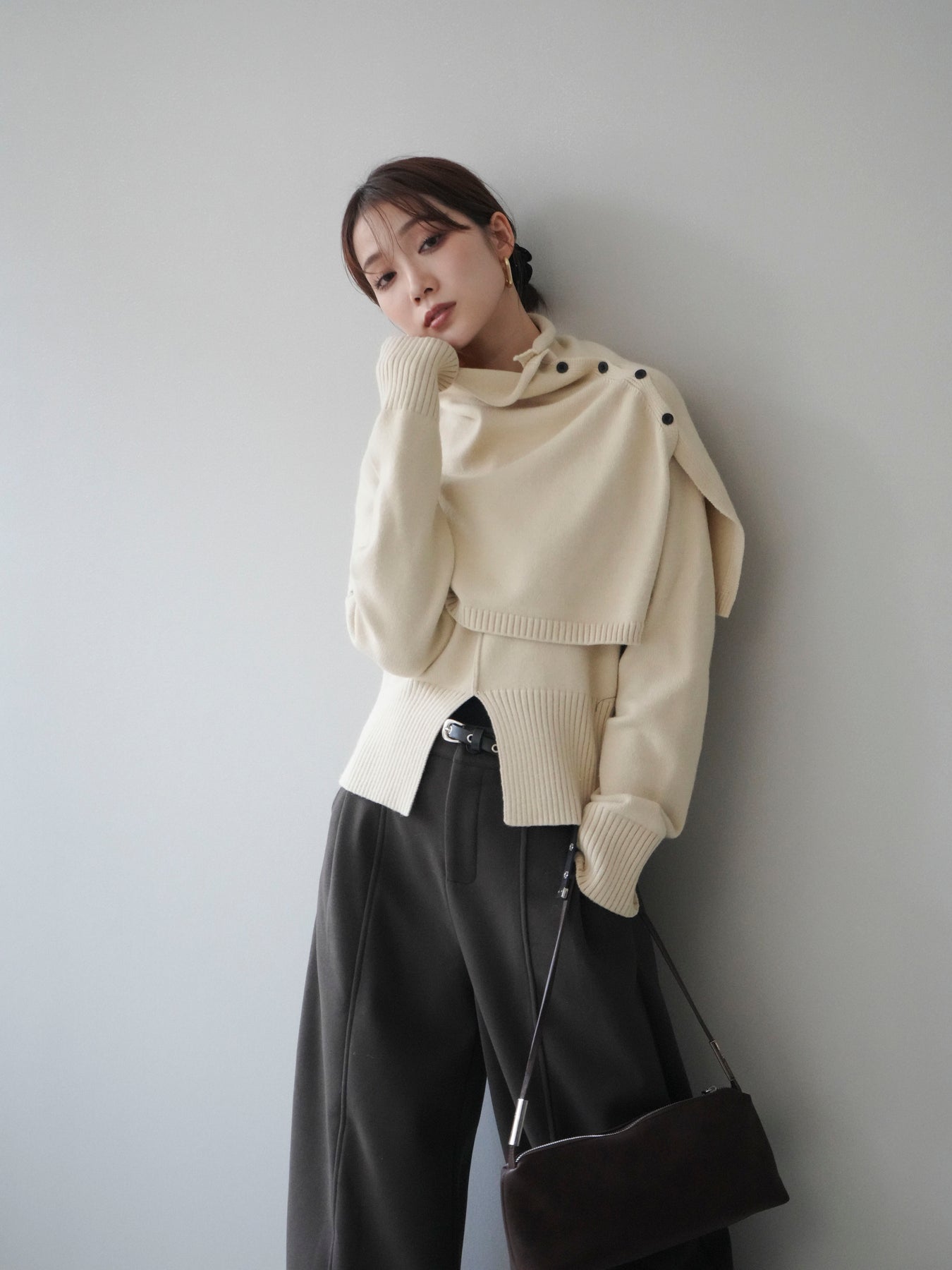 スリット入りのネックデザインが印象的なアンサンブルニット。レイヤードしたように見えるフロントのデザインがスタイリングに奥行きを生み、シンプルながら存在感のある一枚に仕上がっています。柔らかな風合いのニットは着心地がよく、程よくゆとりを持たせたシルエットがこなれ感をプラス。首元のボタンディテールは開閉によってニュアンスの変化が楽しめ、気分に合わせてアレンジできるのも魅力です。パンツにもスカートにも合わせやすく、デイリーに長く愛用できるアイテム。 ※ボトムス、キャミソール(インナー)以外の商品は一律でインナーは付属していません。