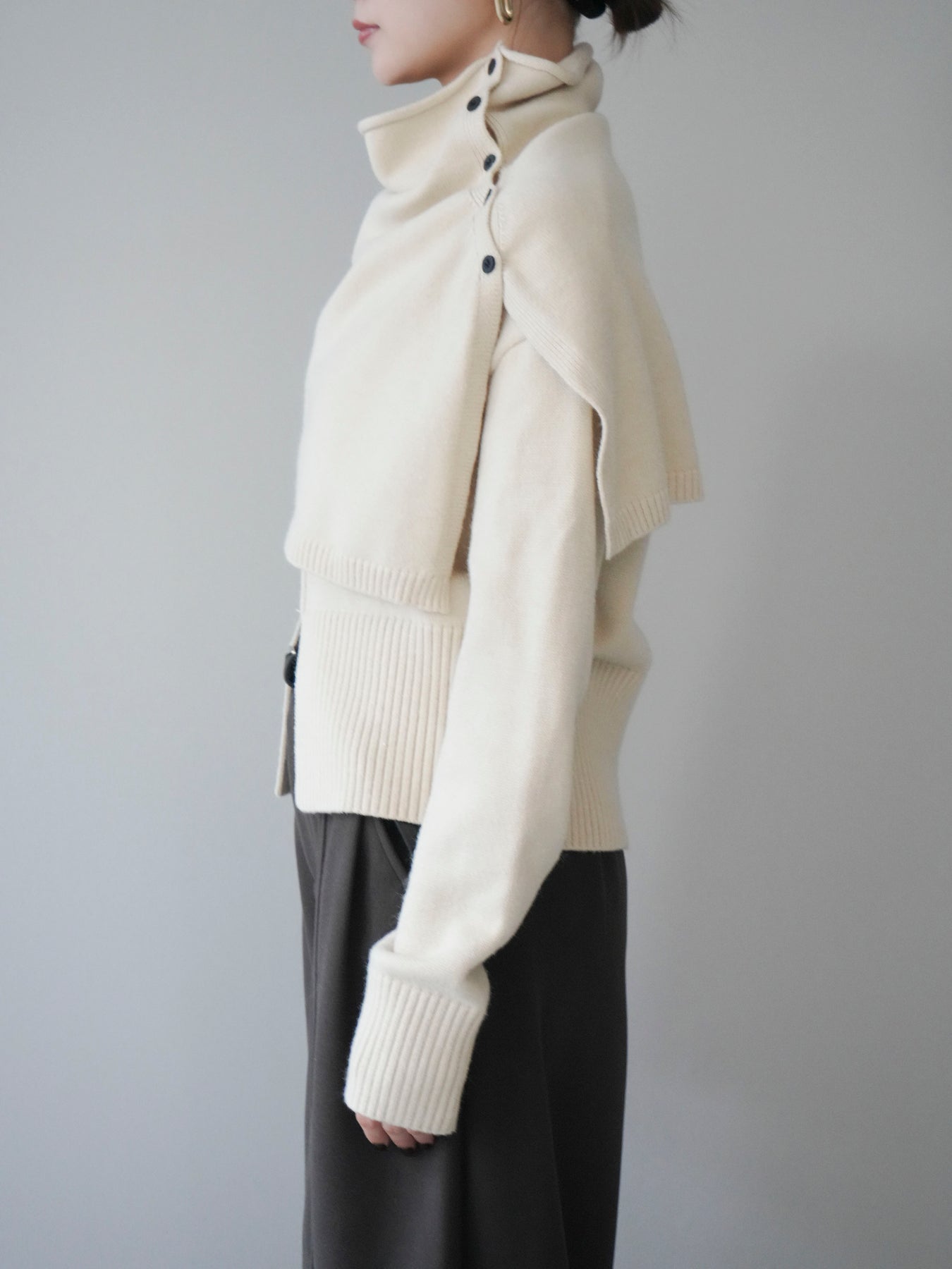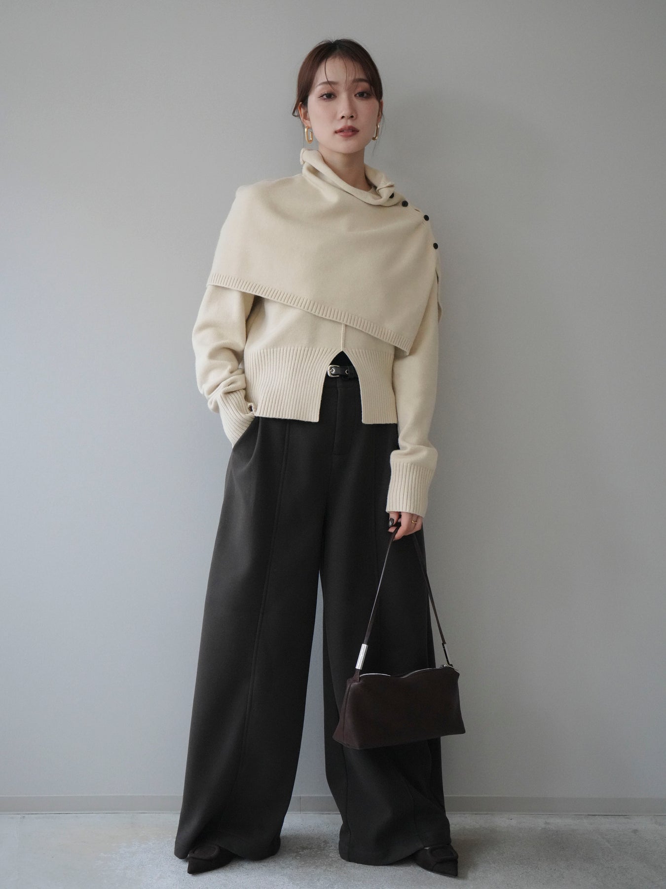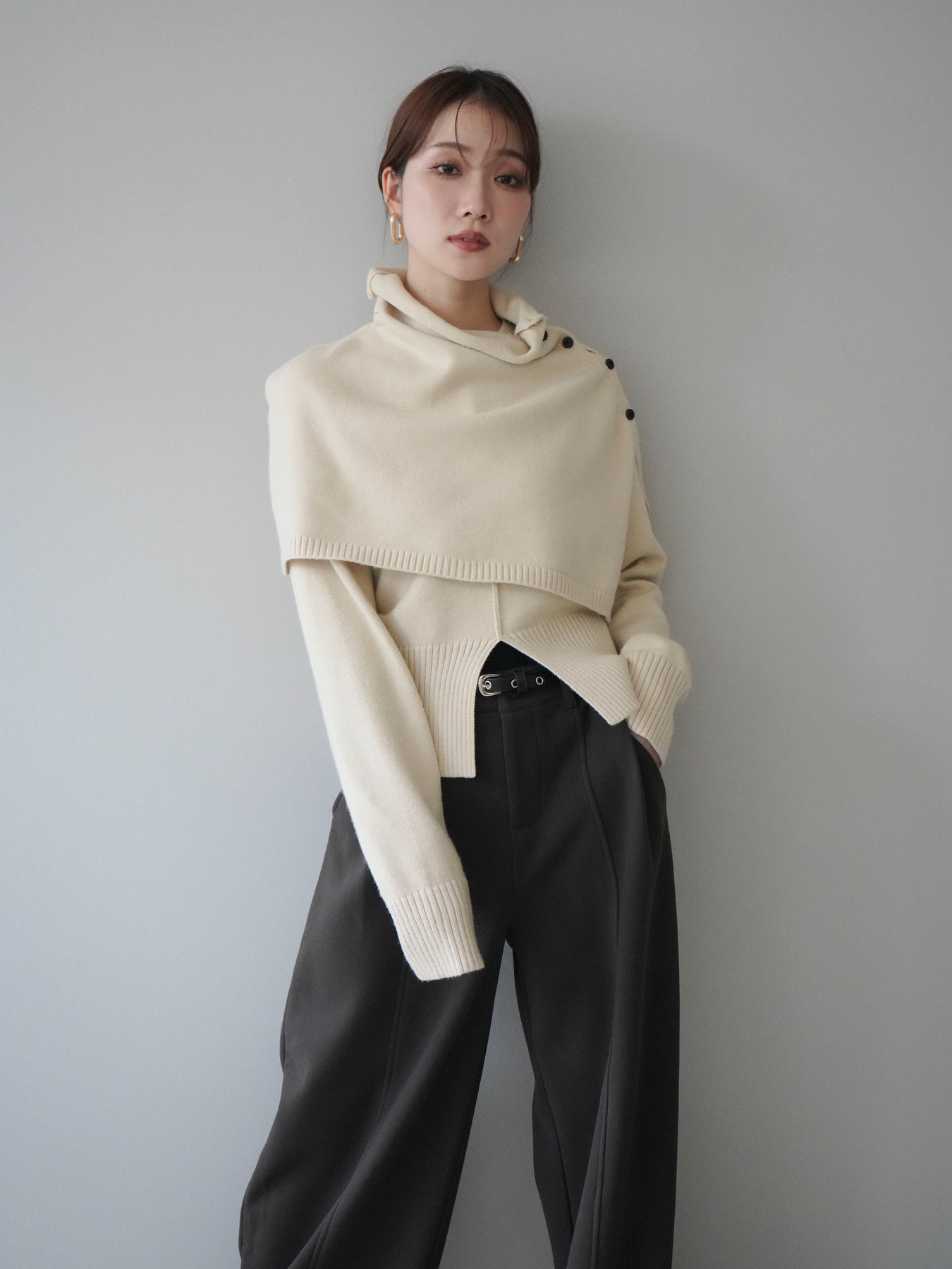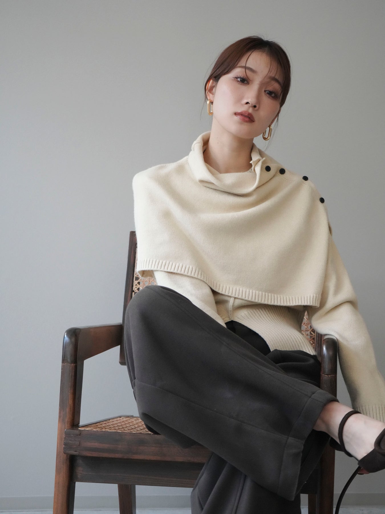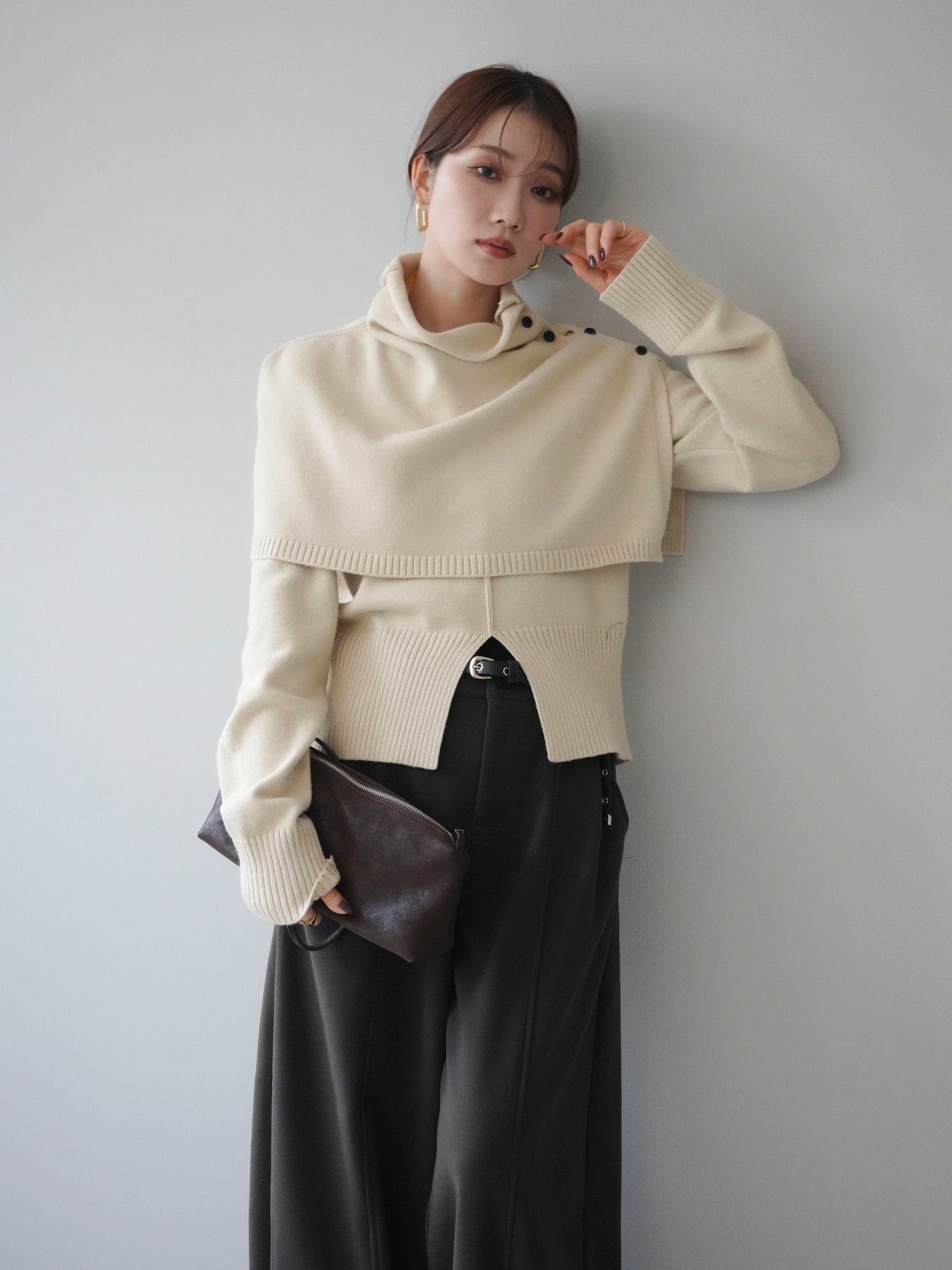 スリット入りのネックデザインが印象的なアンサンブルニット。レイヤードしたように見えるフロントのデザインがスタイリングに奥行きを生み、シンプルながら存在感のある一枚に仕上がっています。柔らかな風合いのニットは着心地がよく、程よくゆとりを持たせたシルエットがこなれ感をプラス。首元のボタンディテールは開閉によってニュアンスの変化が楽しめ、気分に合わせてアレンジできるのも魅力です。パンツにもスカートにも合わせやすく、デイリーに長く愛用できるアイテム。 ※ボトムス、キャミソール(インナー)以外の商品は一律でインナーは付属していません。