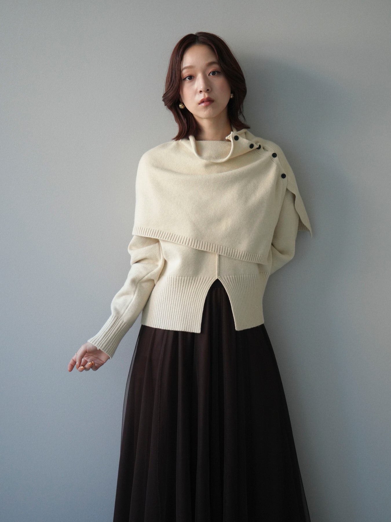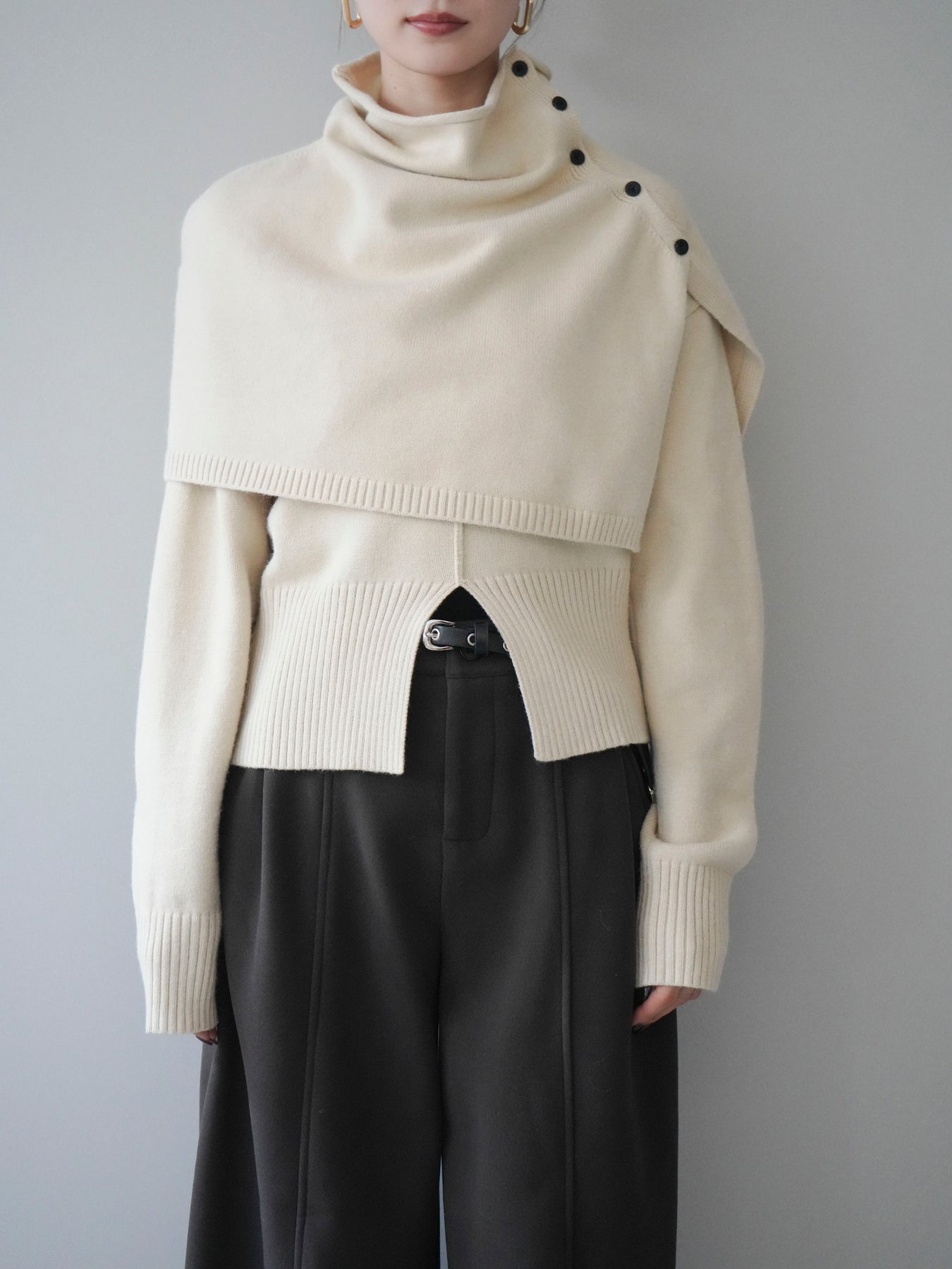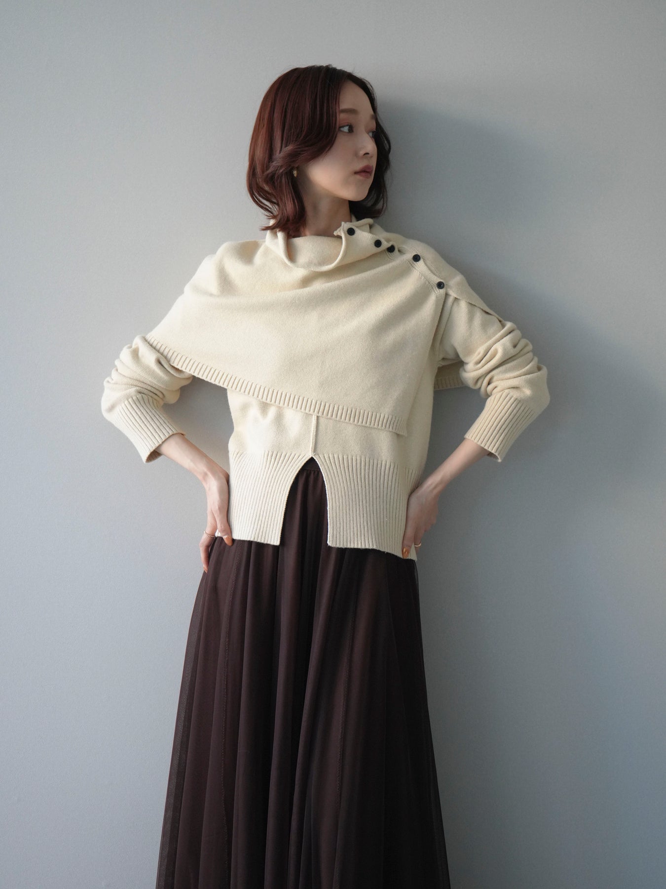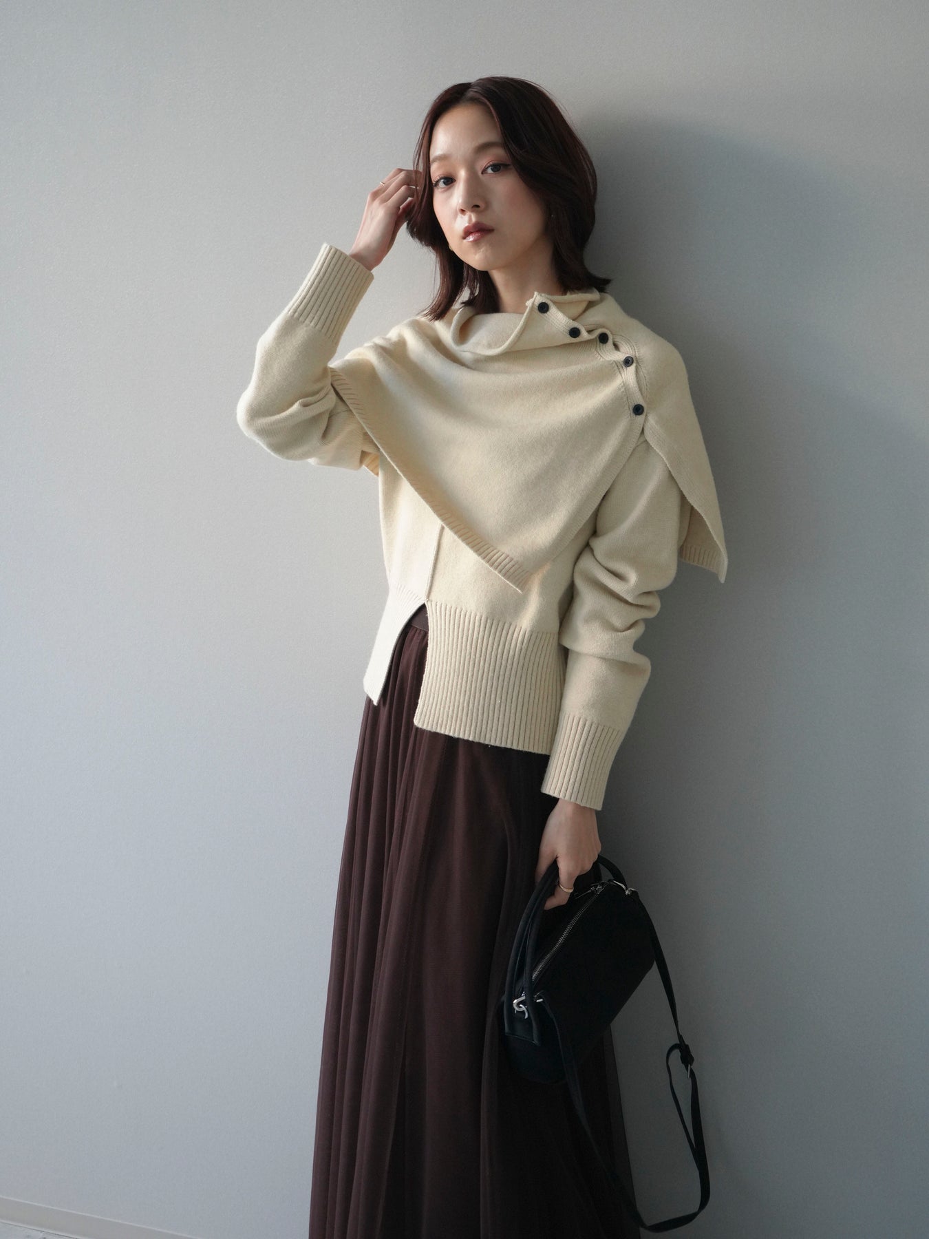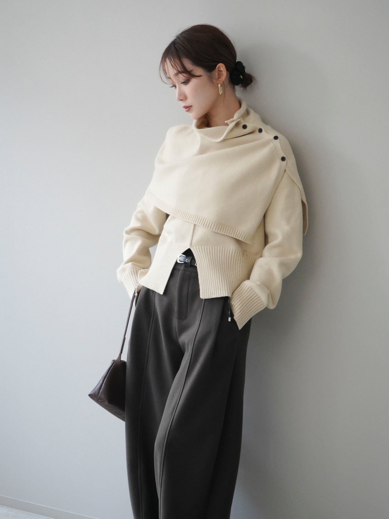 スリット入りのネックデザインが印象的なアンサンブルニット。レイヤードしたように見えるフロントのデザインがスタイリングに奥行きを生み、シンプルながら存在感のある一枚に仕上がっています。柔らかな風合いのニットは着心地がよく、程よくゆとりを持たせたシルエットがこなれ感をプラス。首元のボタンディテールは開閉によってニュアンスの変化が楽しめ、気分に合わせてアレンジできるのも魅力です。パンツにもスカートにも合わせやすく、デイリーに長く愛用できるアイテム。 ※ボトムス、キャミソール(インナー)以外の商品は一律でインナーは付属していません。