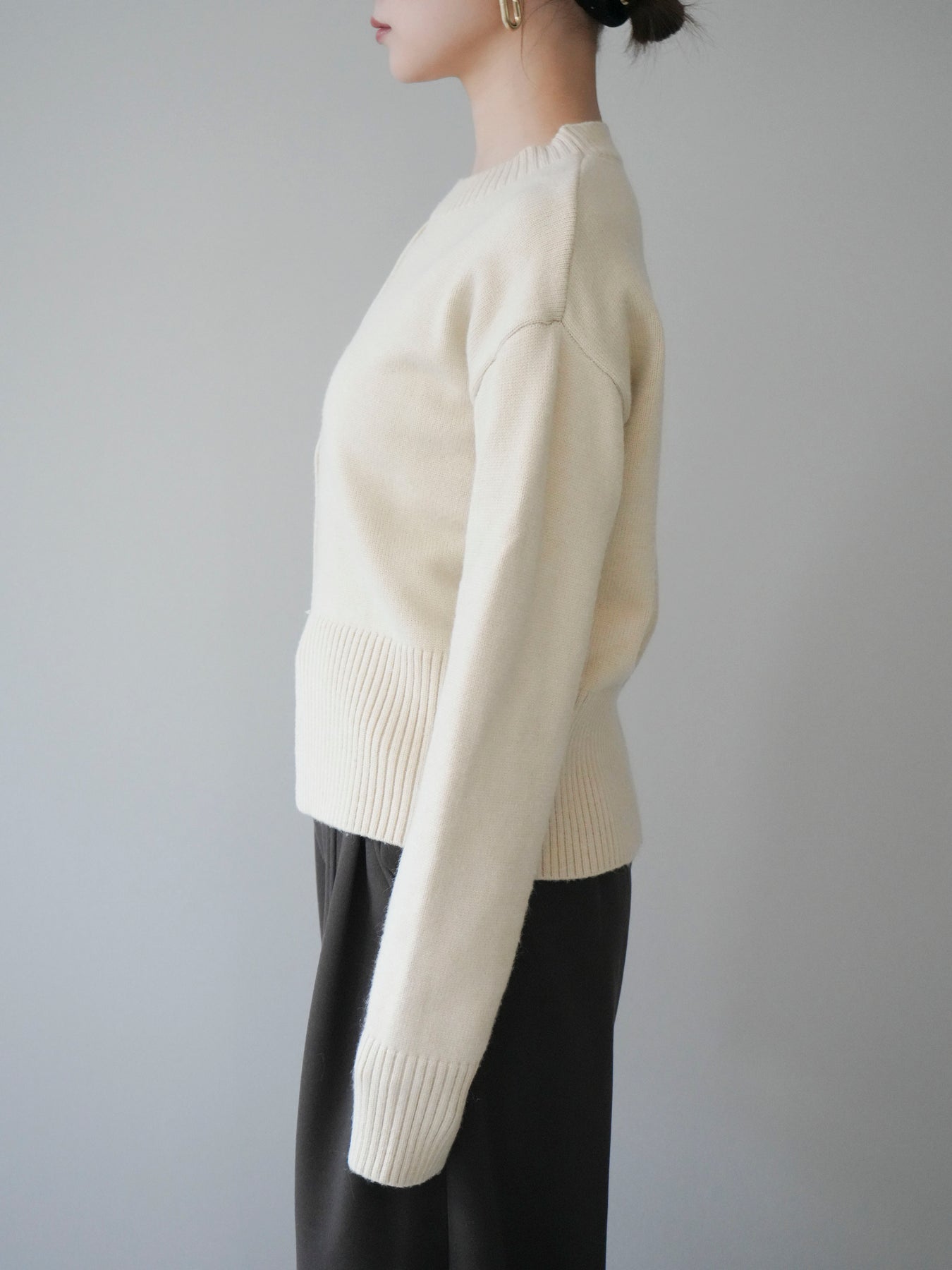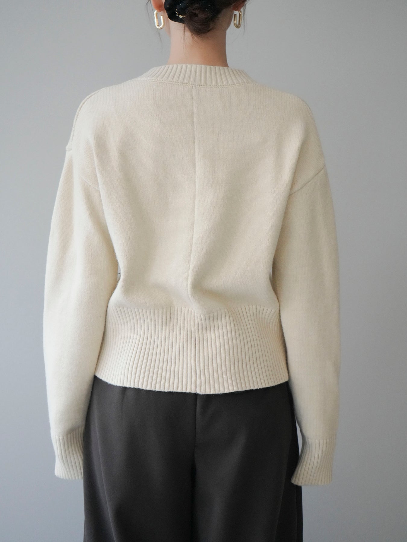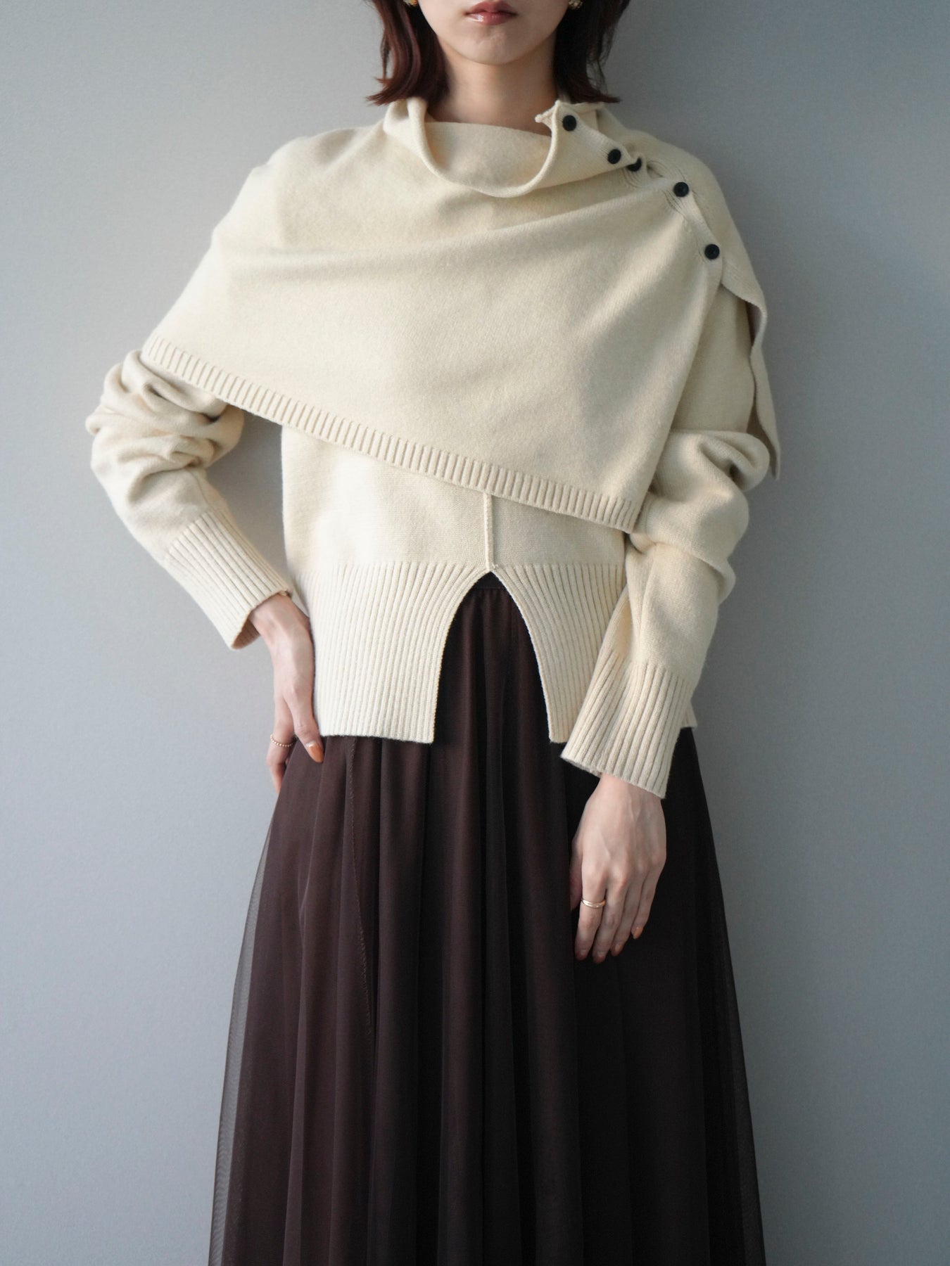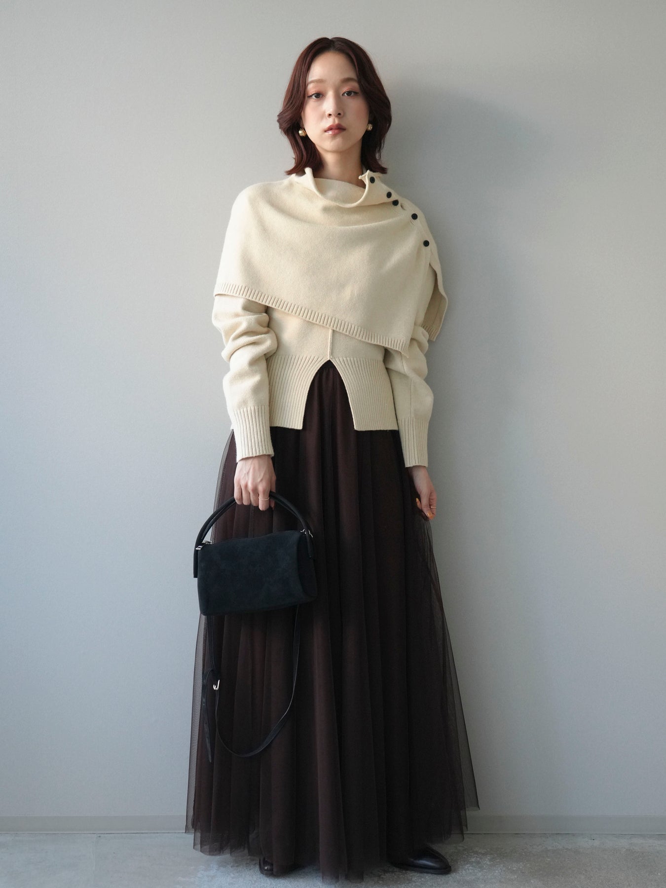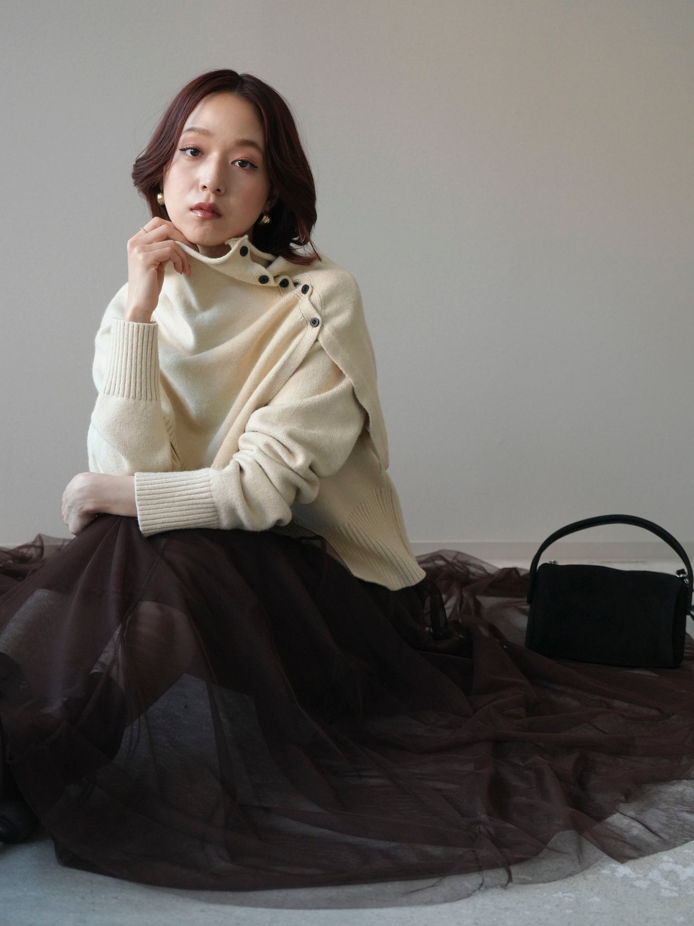 スリット入りのネックデザインが印象的なアンサンブルニット。レイヤードしたように見えるフロントのデザインがスタイリングに奥行きを生み、シンプルながら存在感のある一枚に仕上がっています。柔らかな風合いのニットは着心地がよく、程よくゆとりを持たせたシルエットがこなれ感をプラス。首元のボタンディテールは開閉によってニュアンスの変化が楽しめ、気分に合わせてアレンジできるのも魅力です。パンツにもスカートにも合わせやすく、デイリーに長く愛用できるアイテム。 ※ボトムス、キャミソール(インナー)以外の商品は一律でインナーは付属していません。