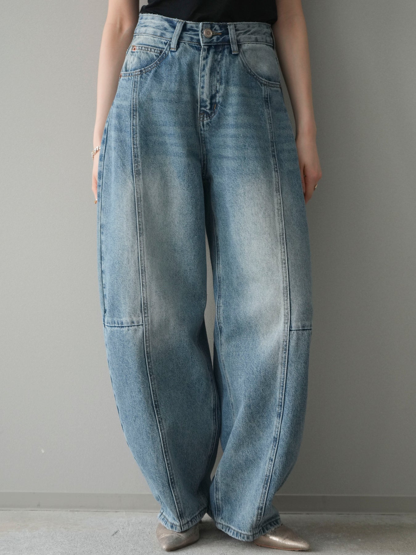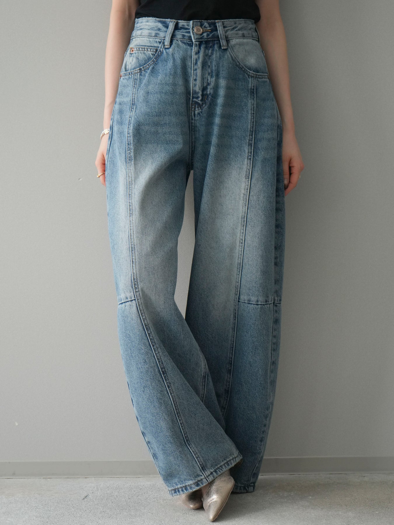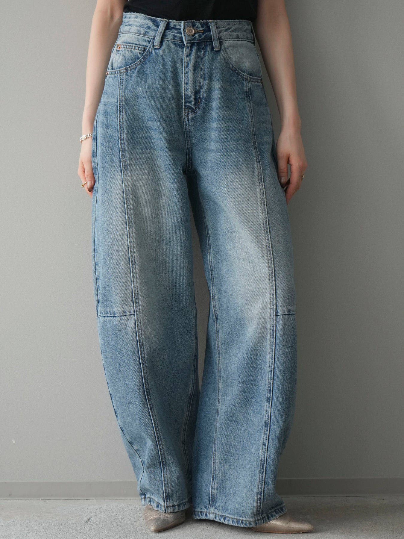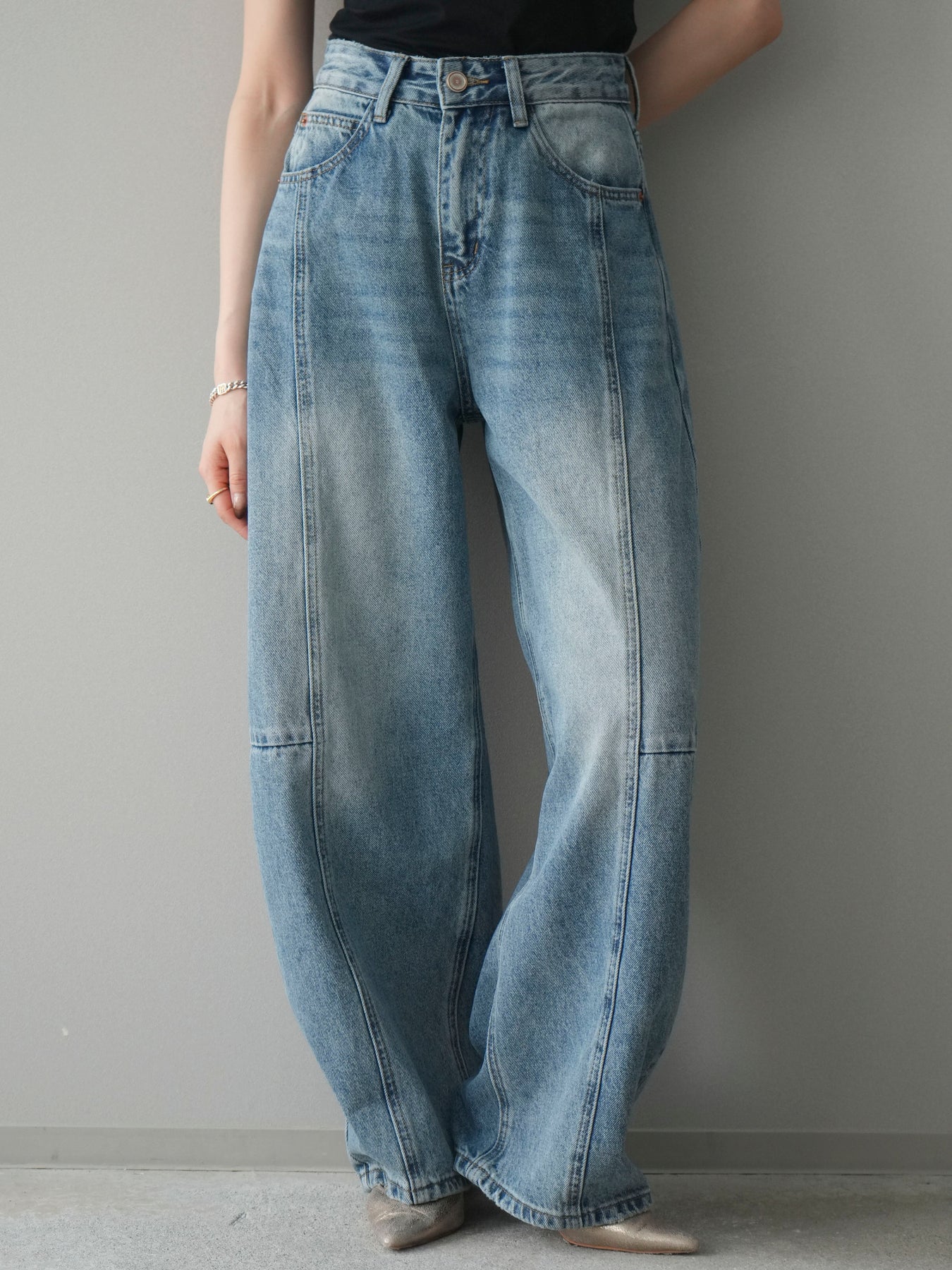 ガーメントウォッシュ加工による、こなれた風合いが魅力のカーブデニムパンツ。立体的な切り替えと丸みのあるシルエットが、脚のラインを拾いにくく、自然な体型カバーを叶えます。程よく存在感のあるデザインながら、落ち着いた印象でトップスを選ばず合わせやすいのもポイント。カジュアルスタイルはもちろん、きれいめアイテムと合わせたミックスコーデにも馴染み、デイリーに活躍する一本です。