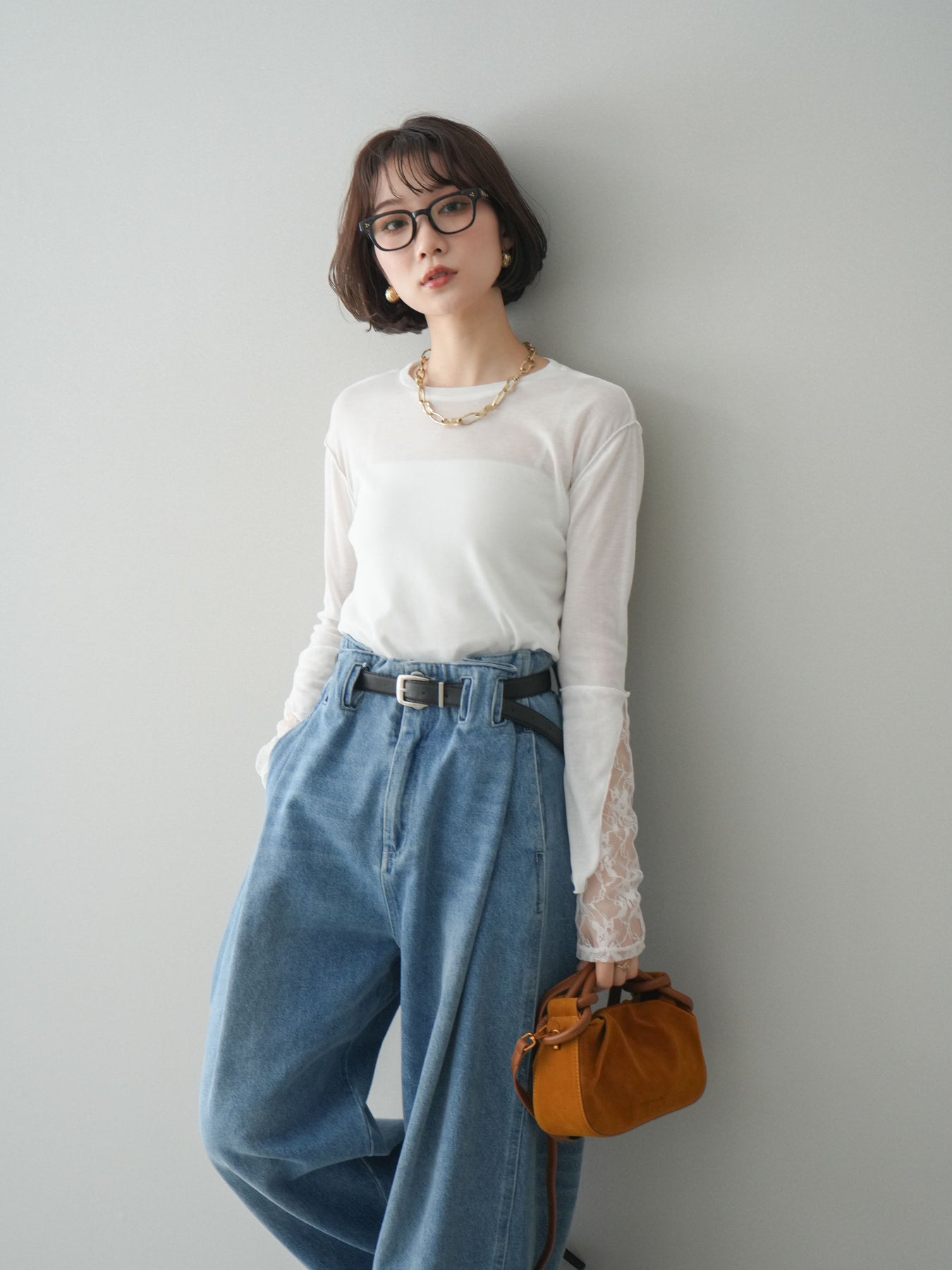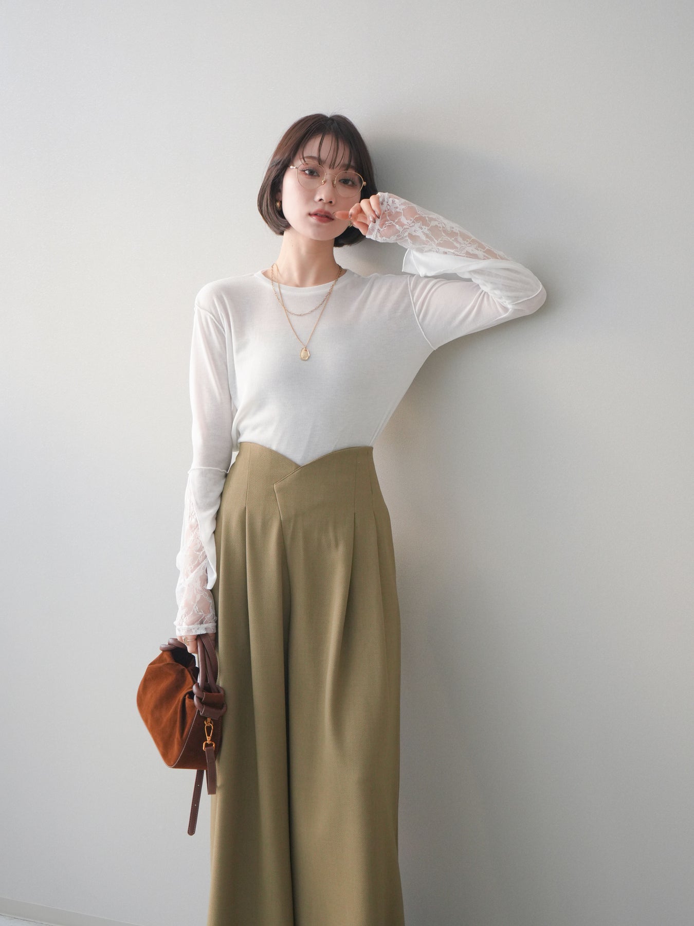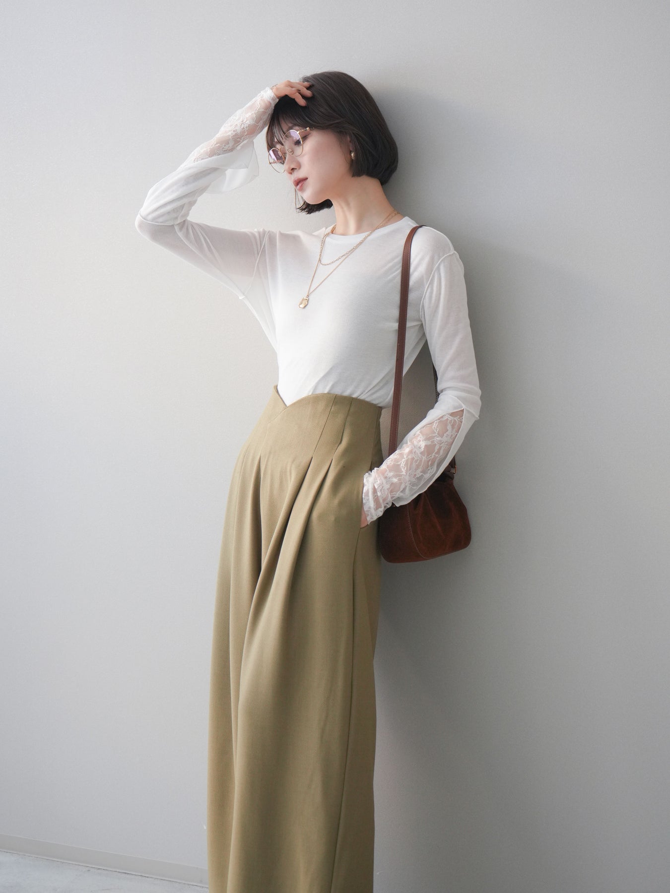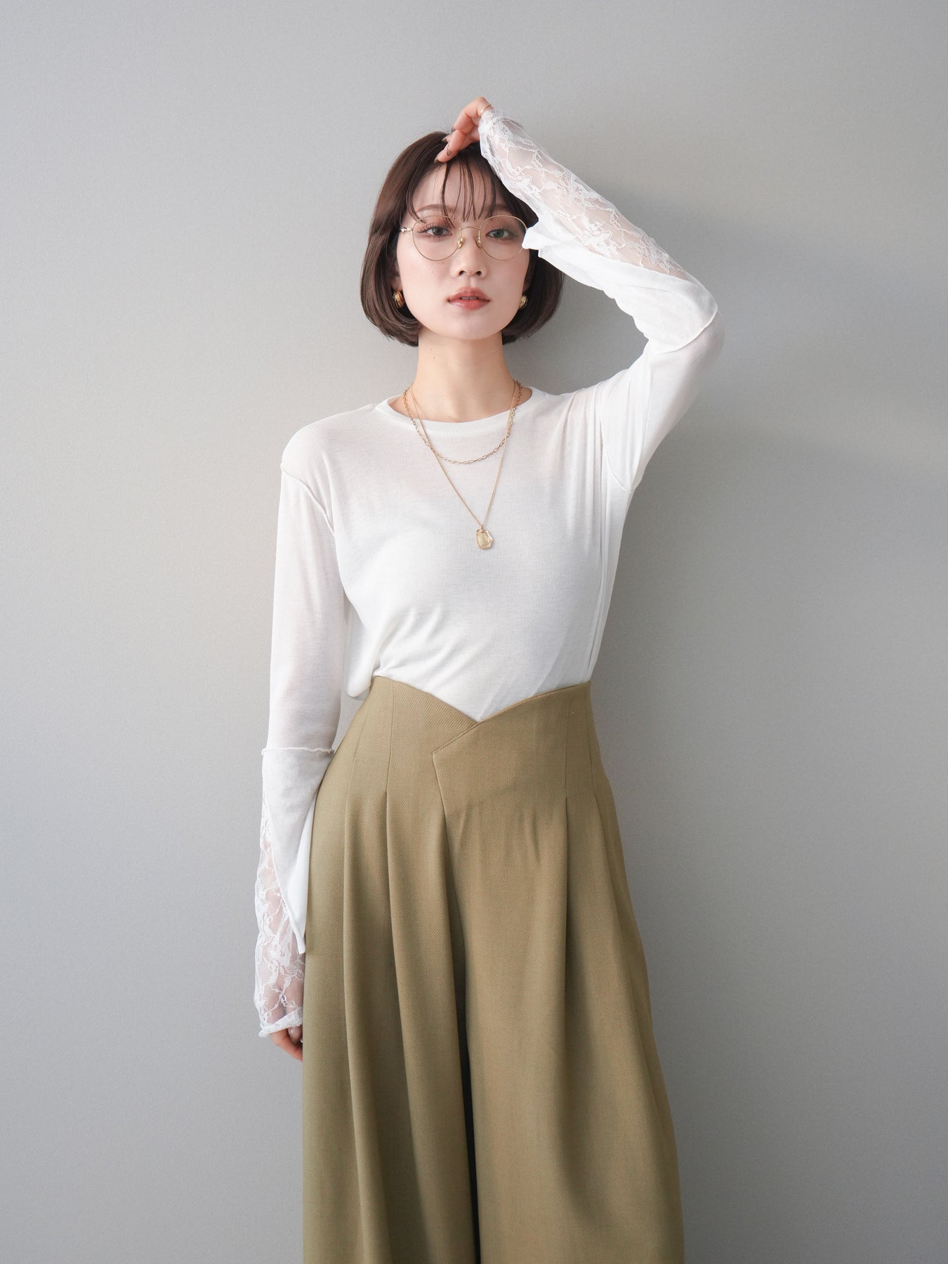 袖口にレースをレイヤードしたデザインが印象的なメロートップス。シンプルな身頃に、異素材を重ねた袖デザインがさりげない華やかさと奥行きをプラスします。程よく透け感のある素材で、軽やかな着心地も魅力。メローディテールが全体を柔らかな印象にまとめ、1枚ではもちろん、ベストやジャケットのインナーとしても着映えする一着です。デイリーからきれいめスタイルまで幅広く活躍します。 ※ボトムス、キャミソール(インナー)以外の商品は一律でインナーは付属していません。