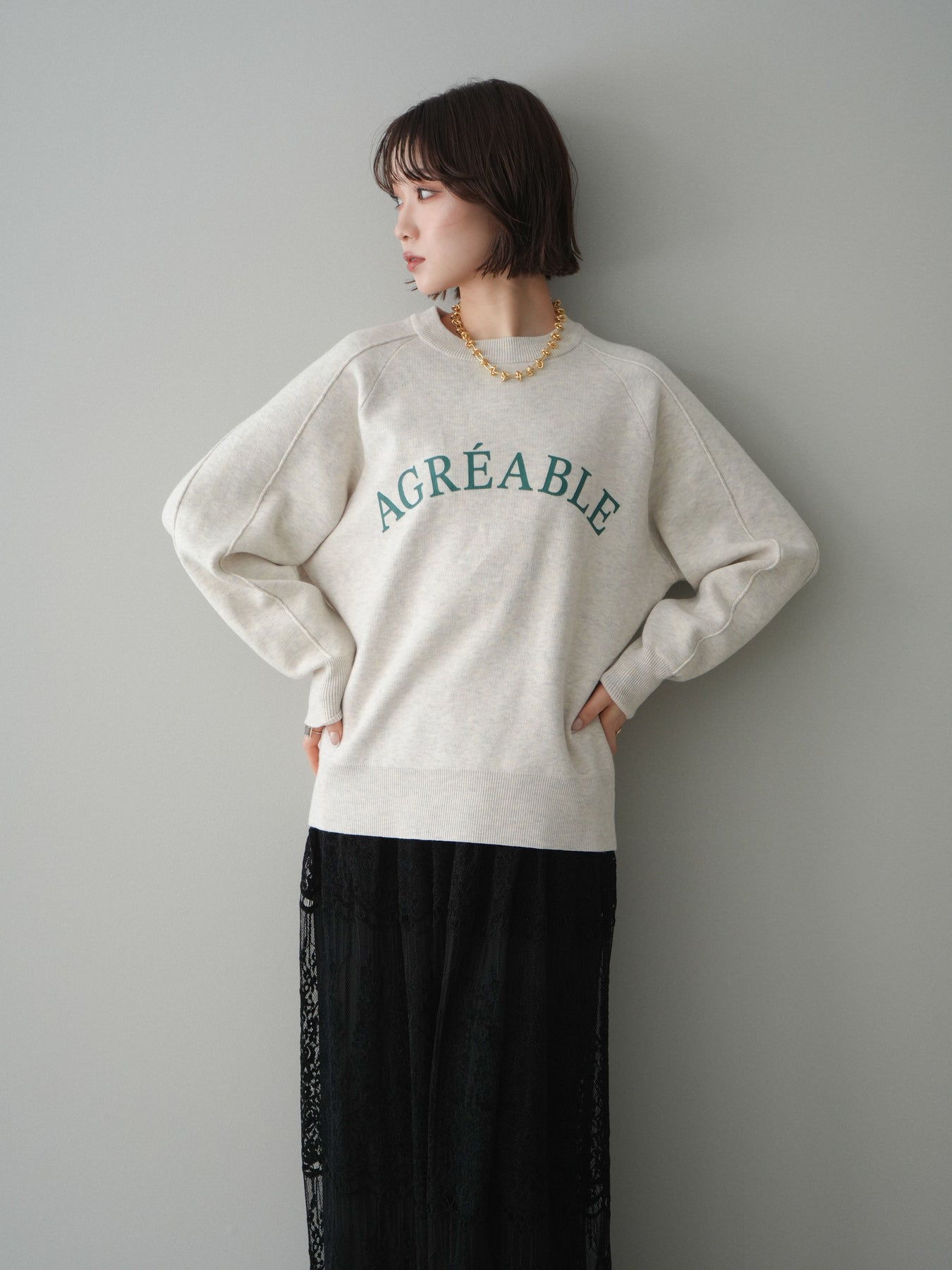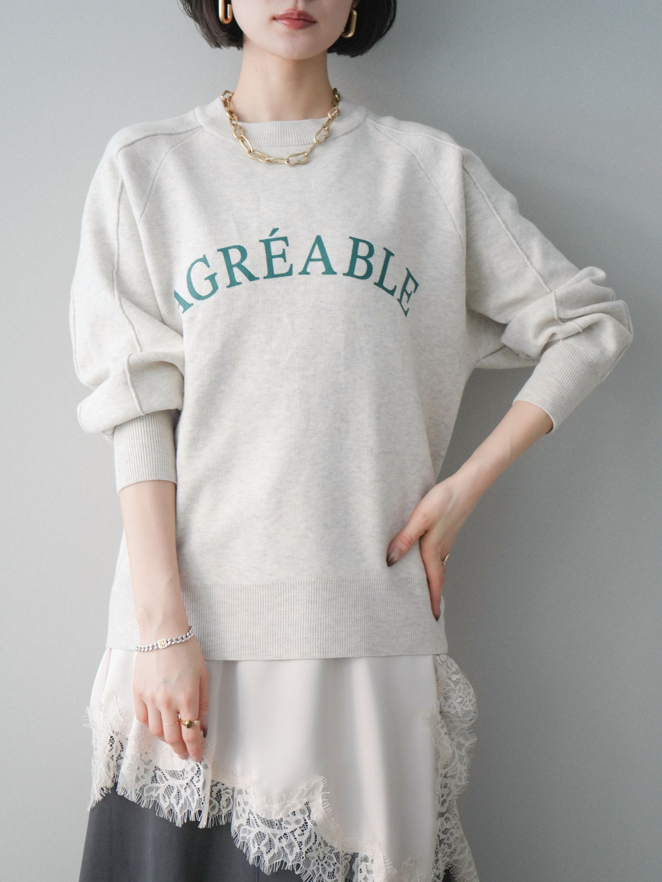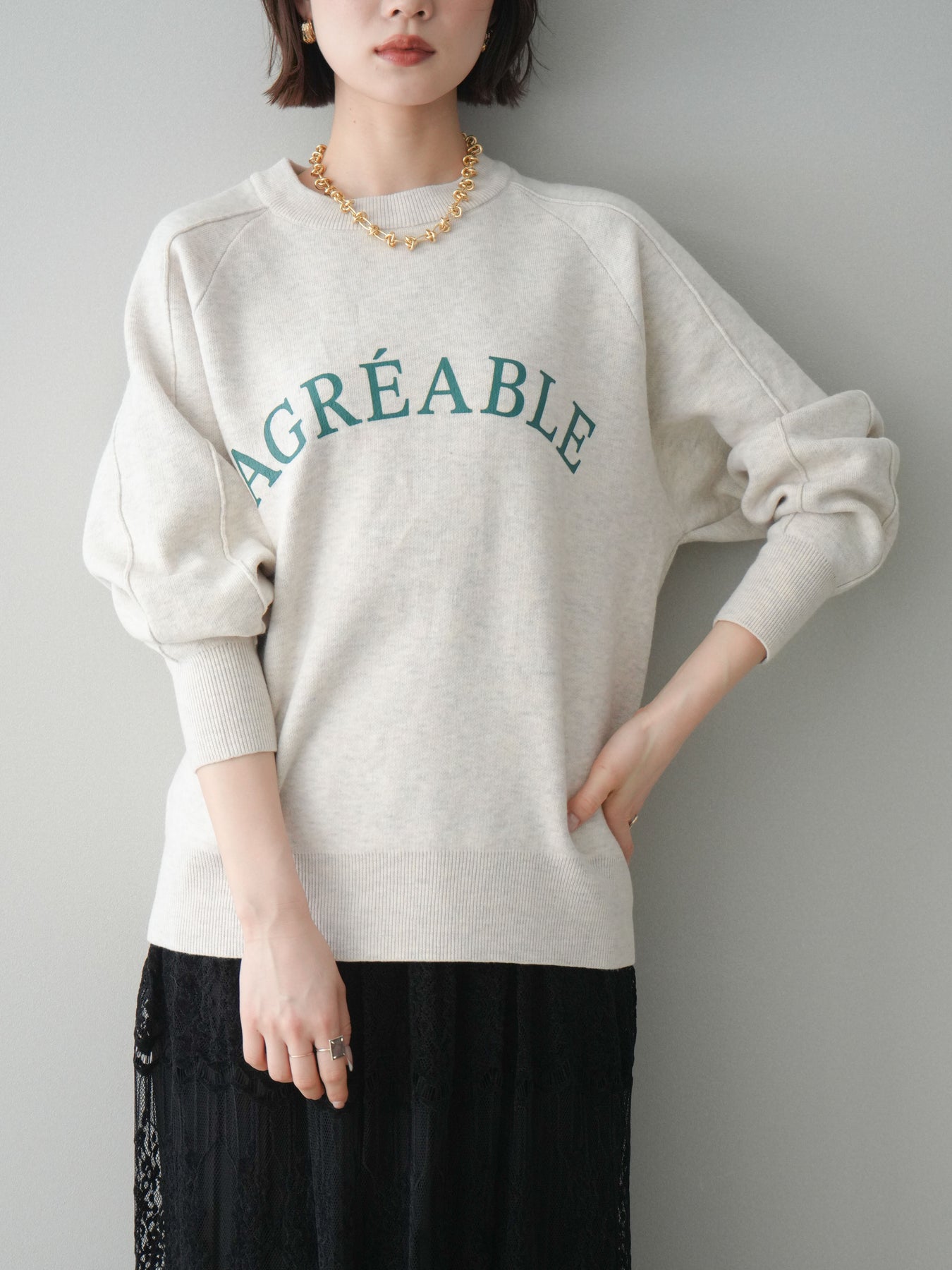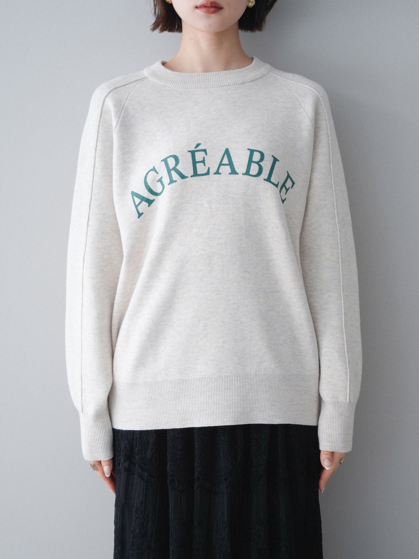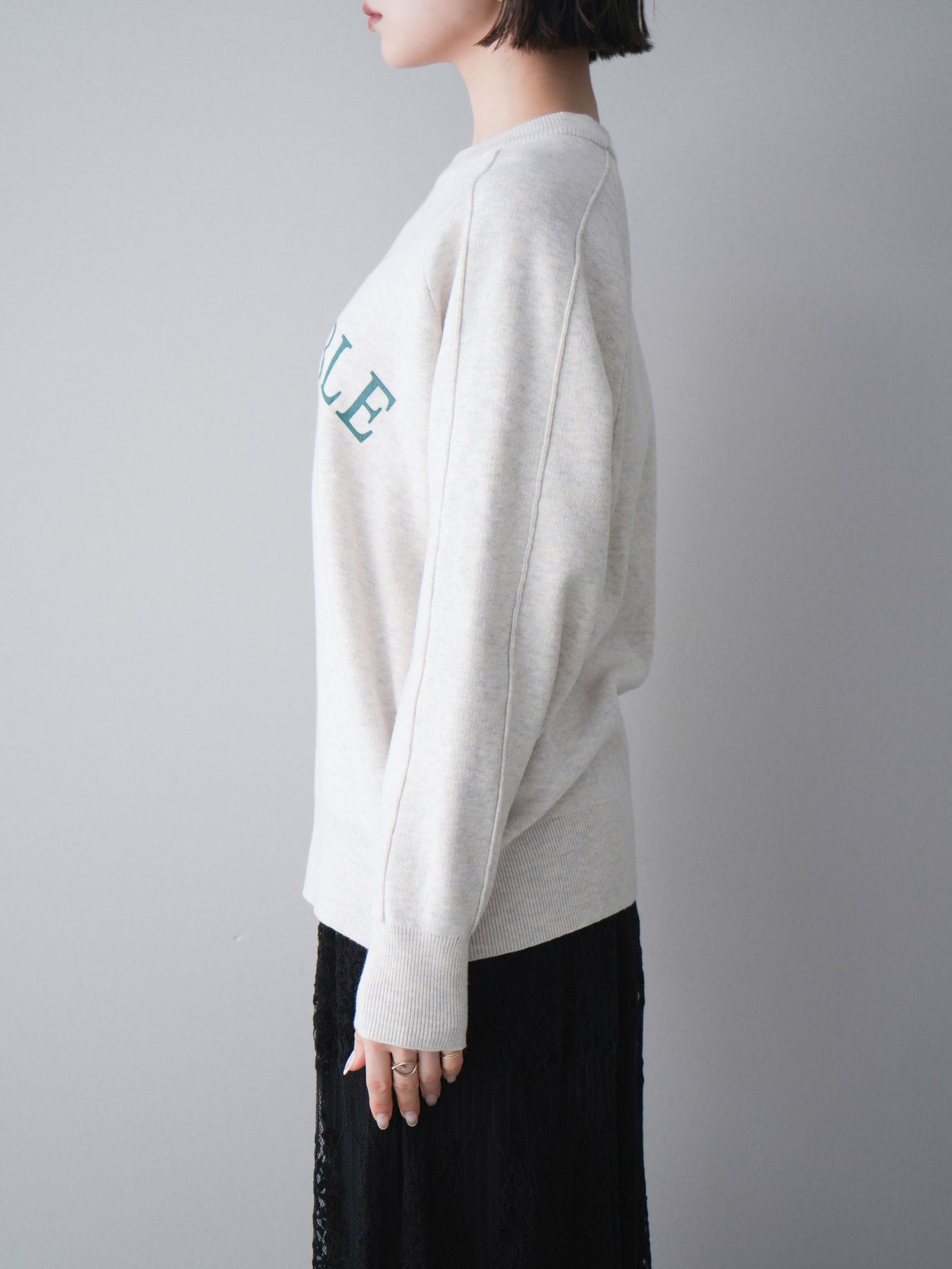 スウェットライクな風合いが魅力のニットプルオーバー。フロントには半ラバープリントのロゴを施し、主張しすぎないデザインで大人のカジュアルスタイルに馴染む一着です。程よくゆとりのあるシルエットで、体のラインを拾いにくく、リラックス感のある着心地もポイント。ニットならではの柔らかさと、スウェットのような気軽さを兼ね備え、デイリー使いはもちろん、きれいめアイテムと合わせたミックスコーデにも活躍します。 ※ボトムス、キャミソール(インナー)以外の商品は一律でインナーは付属していません。