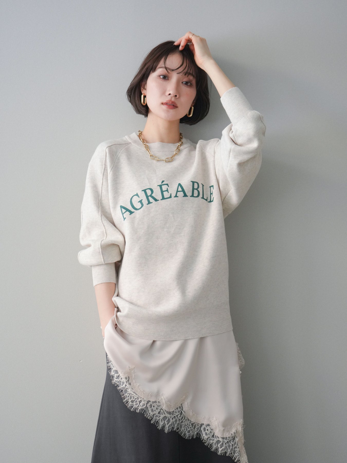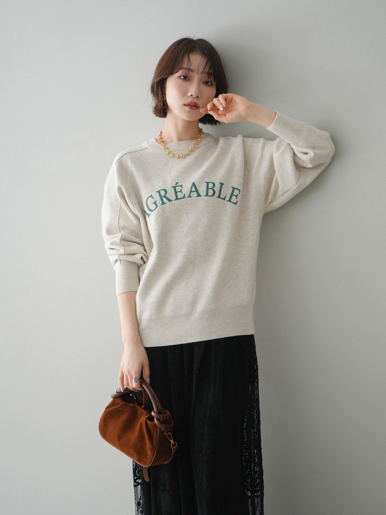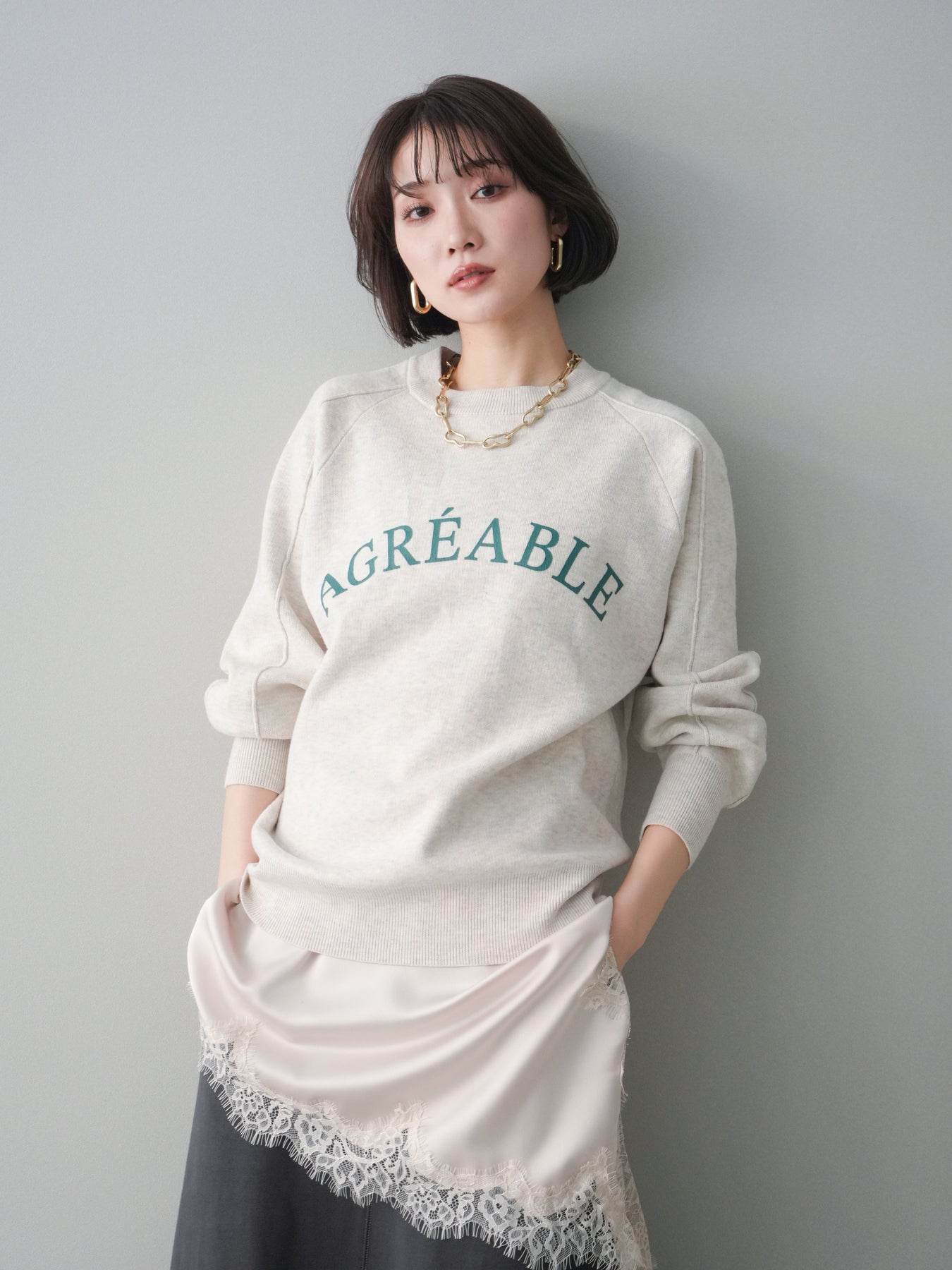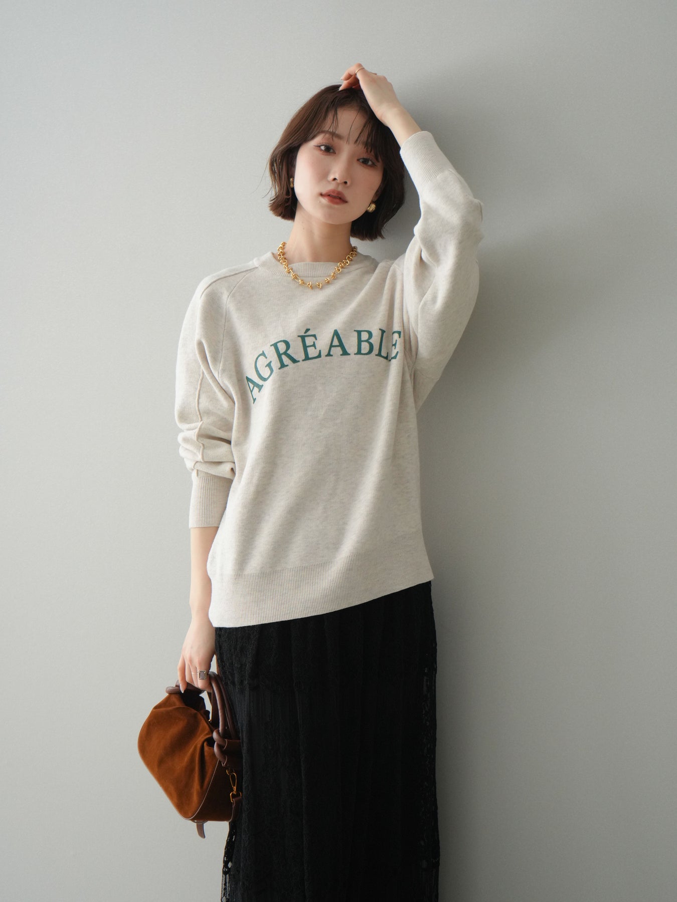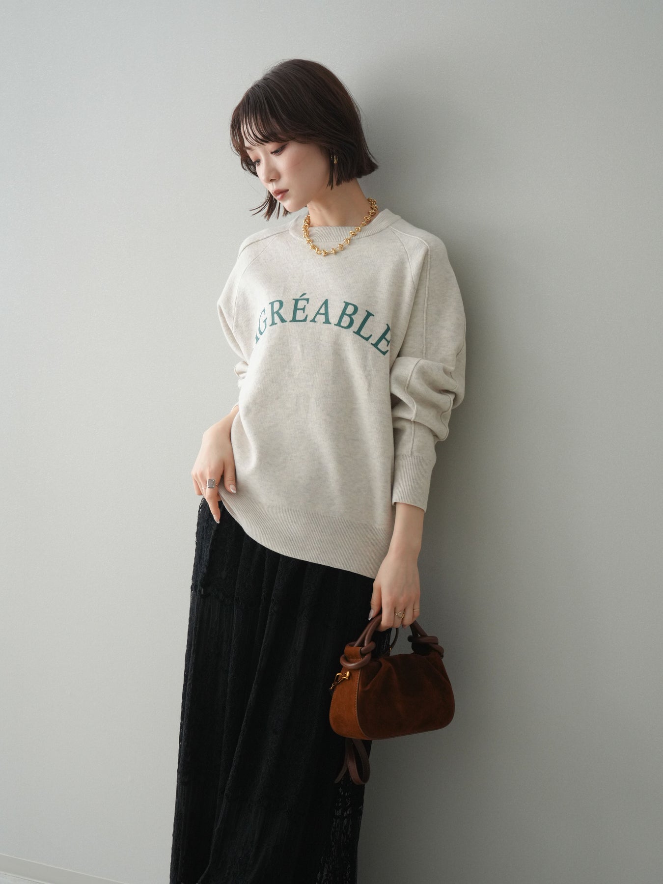 スウェットライクな風合いが魅力のニットプルオーバー。フロントには半ラバープリントのロゴを施し、主張しすぎないデザインで大人のカジュアルスタイルに馴染む一着です。程よくゆとりのあるシルエットで、体のラインを拾いにくく、リラックス感のある着心地もポイント。ニットならではの柔らかさと、スウェットのような気軽さを兼ね備え、デイリー使いはもちろん、きれいめアイテムと合わせたミックスコーデにも活躍します。 ※ボトムス、キャミソール(インナー)以外の商品は一律でインナーは付属していません。