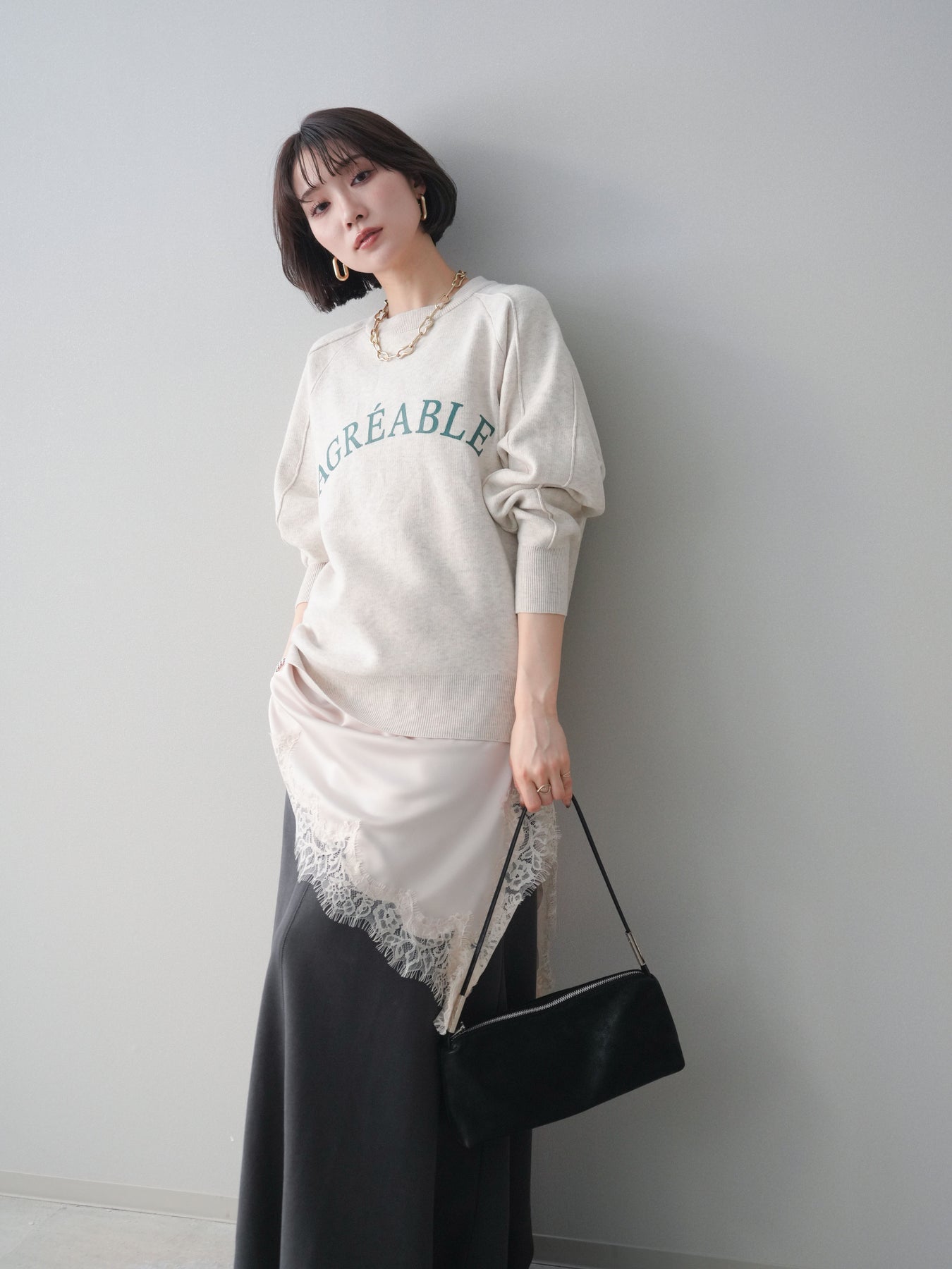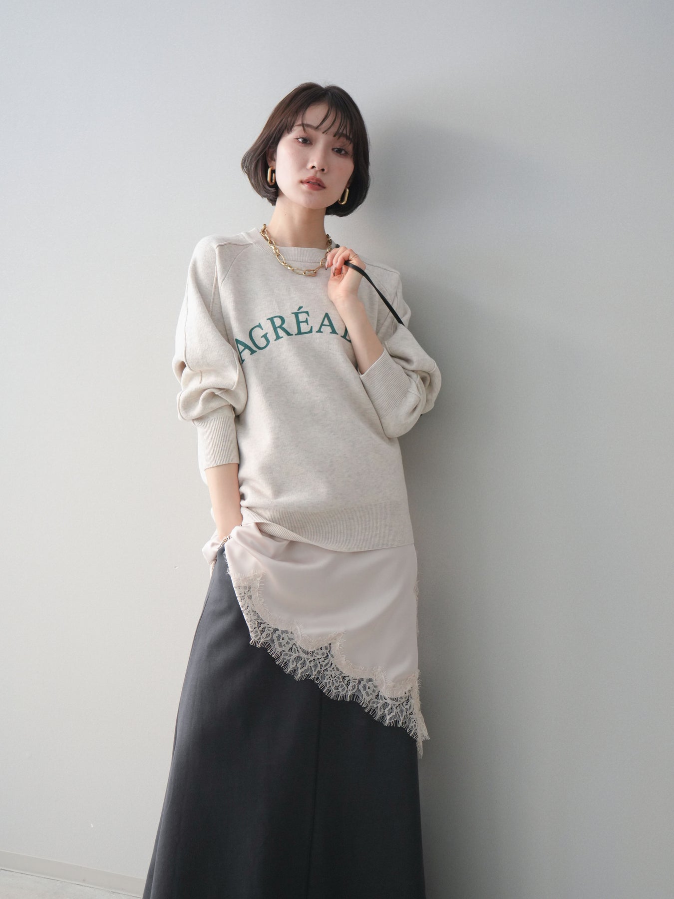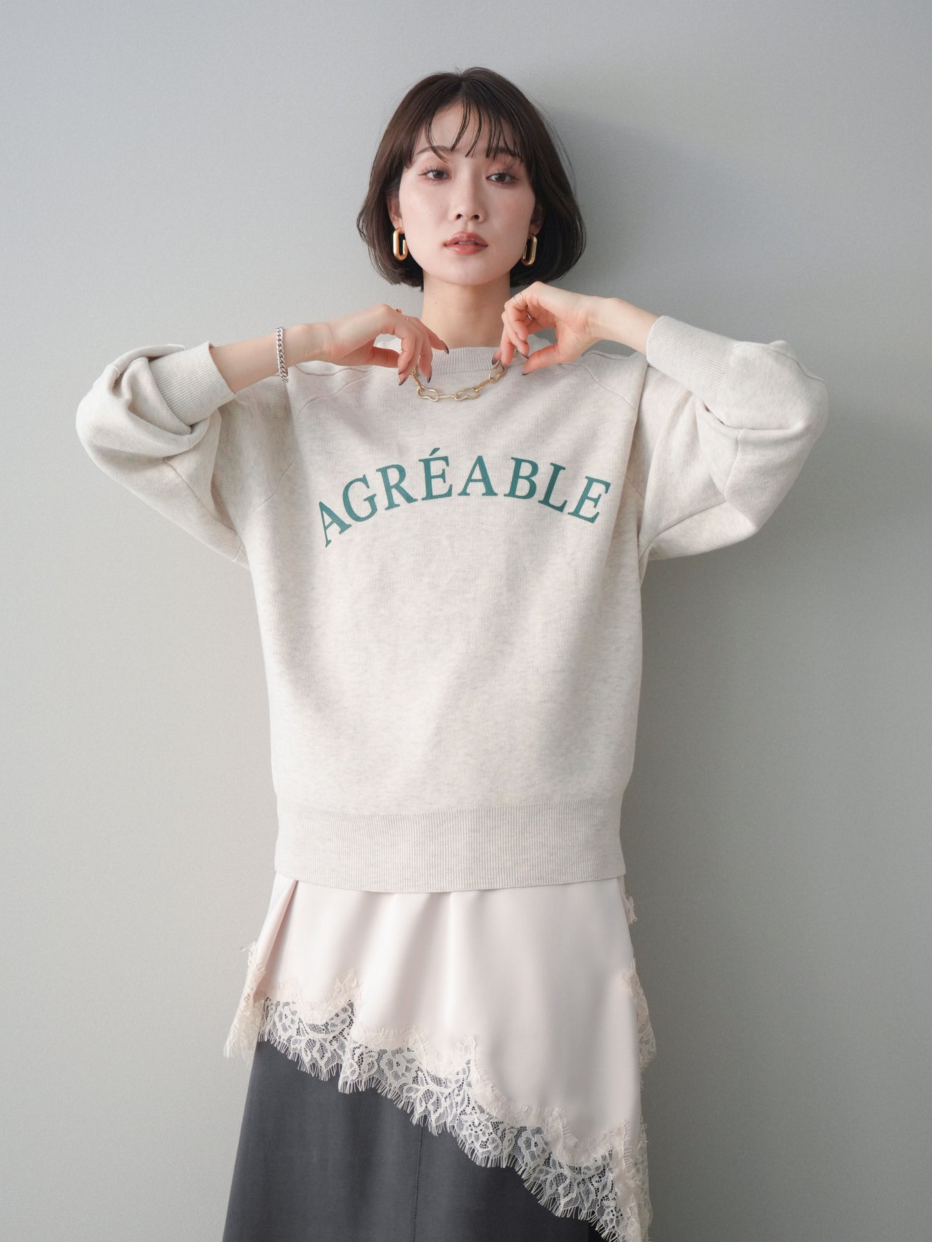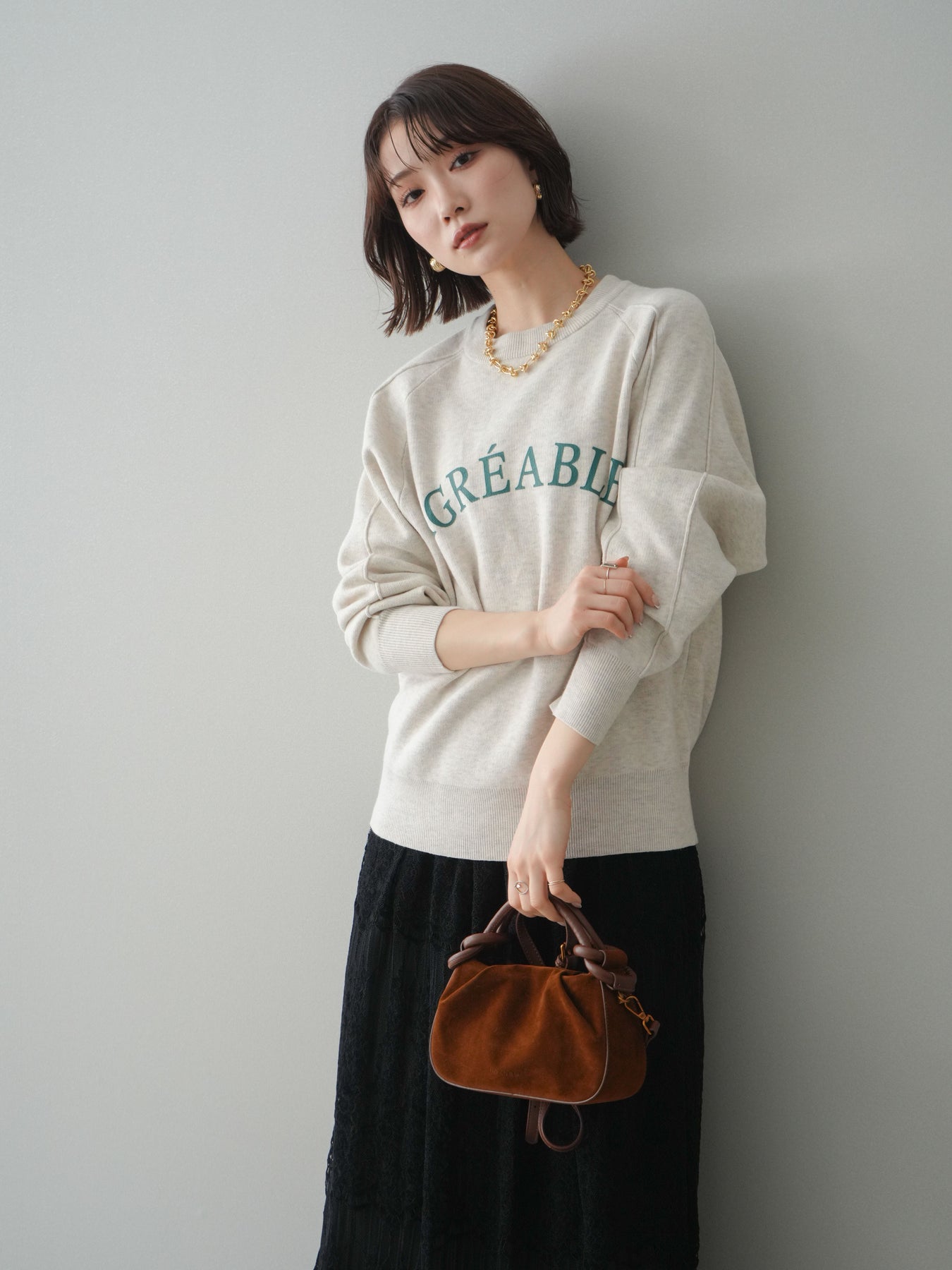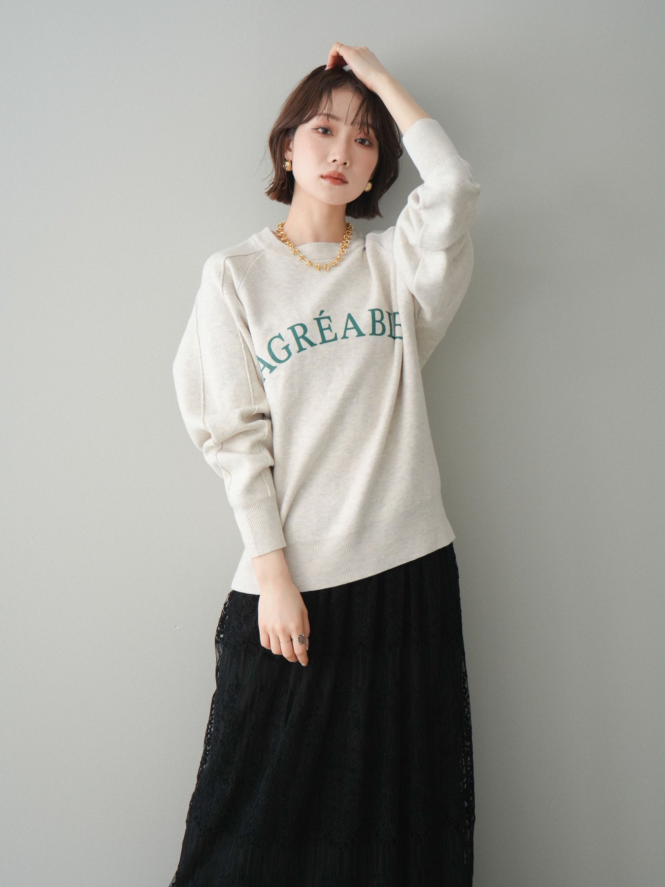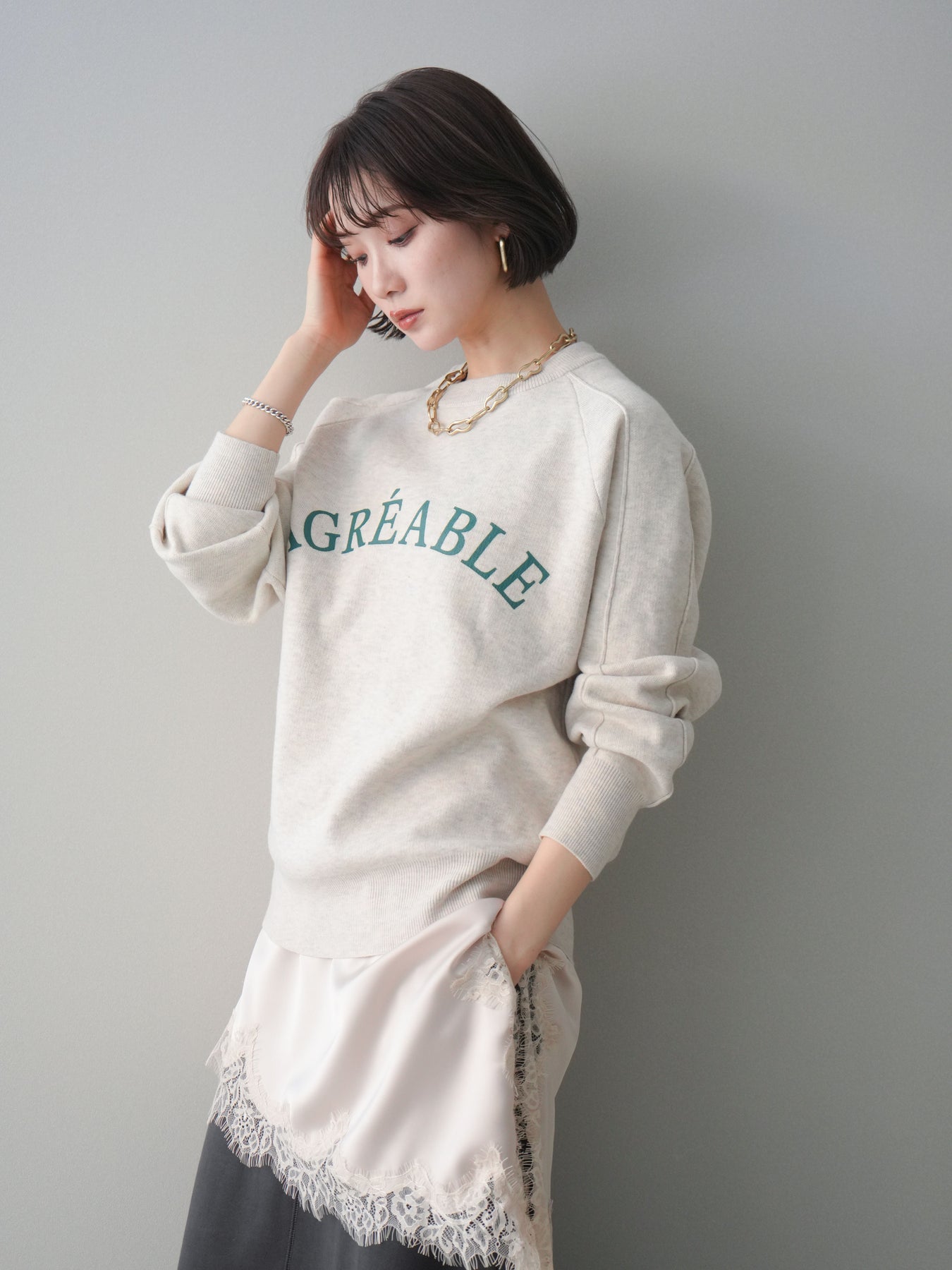 スウェットライクな風合いが魅力のニットプルオーバー。フロントには半ラバープリントのロゴを施し、主張しすぎないデザインで大人のカジュアルスタイルに馴染む一着です。程よくゆとりのあるシルエットで、体のラインを拾いにくく、リラックス感のある着心地もポイント。ニットならではの柔らかさと、スウェットのような気軽さを兼ね備え、デイリー使いはもちろん、きれいめアイテムと合わせたミックスコーデにも活躍します。 ※ボトムス、キャミソール(インナー)以外の商品は一律でインナーは付属していません。