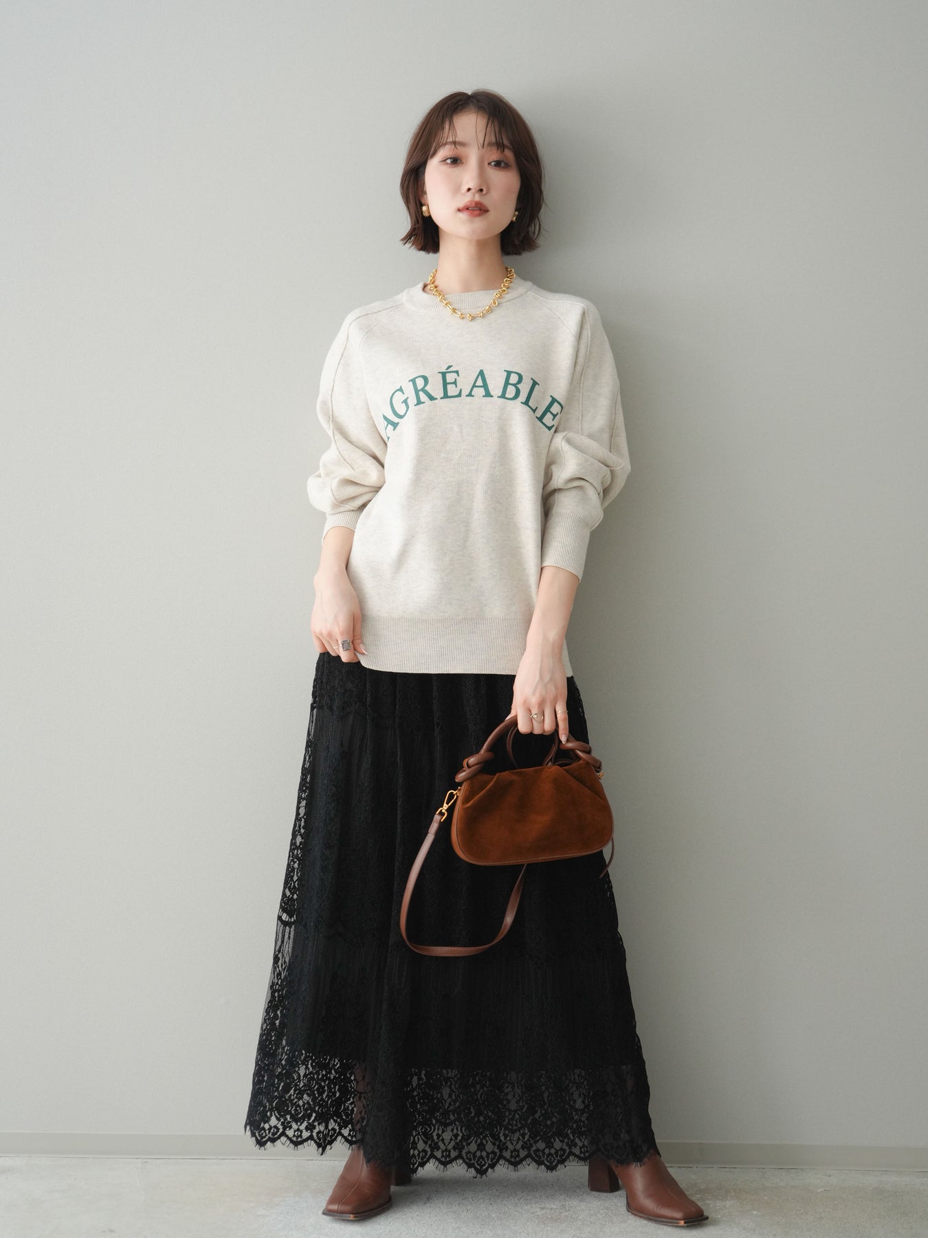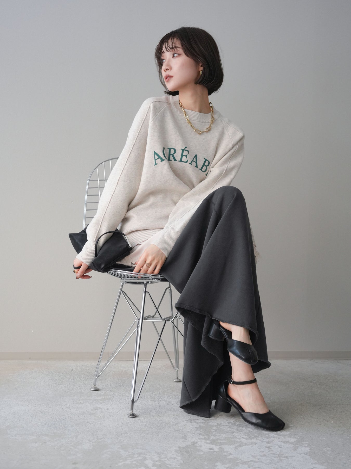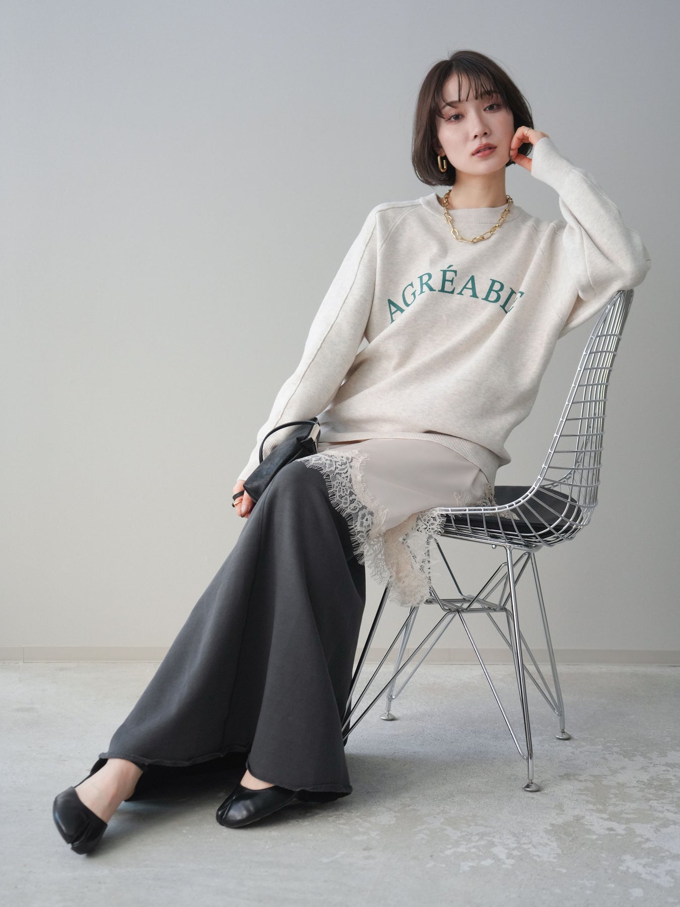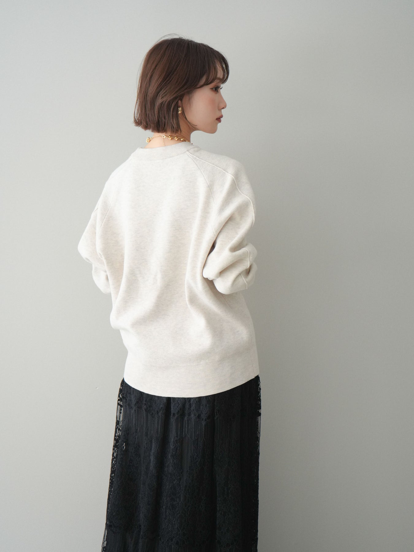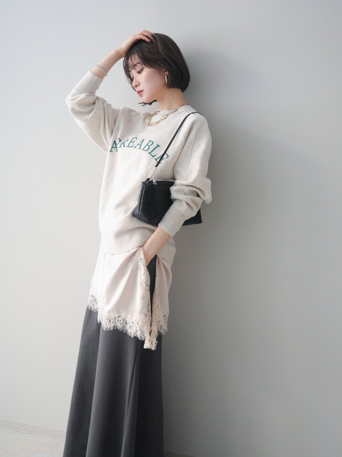 スウェットライクな風合いが魅力のニットプルオーバー。フロントには半ラバープリントのロゴを施し、主張しすぎないデザインで大人のカジュアルスタイルに馴染む一着です。程よくゆとりのあるシルエットで、体のラインを拾いにくく、リラックス感のある着心地もポイント。ニットならではの柔らかさと、スウェットのような気軽さを兼ね備え、デイリー使いはもちろん、きれいめアイテムと合わせたミックスコーデにも活躍します。 ※ボトムス、キャミソール(インナー)以外の商品は一律でインナーは付属していません。