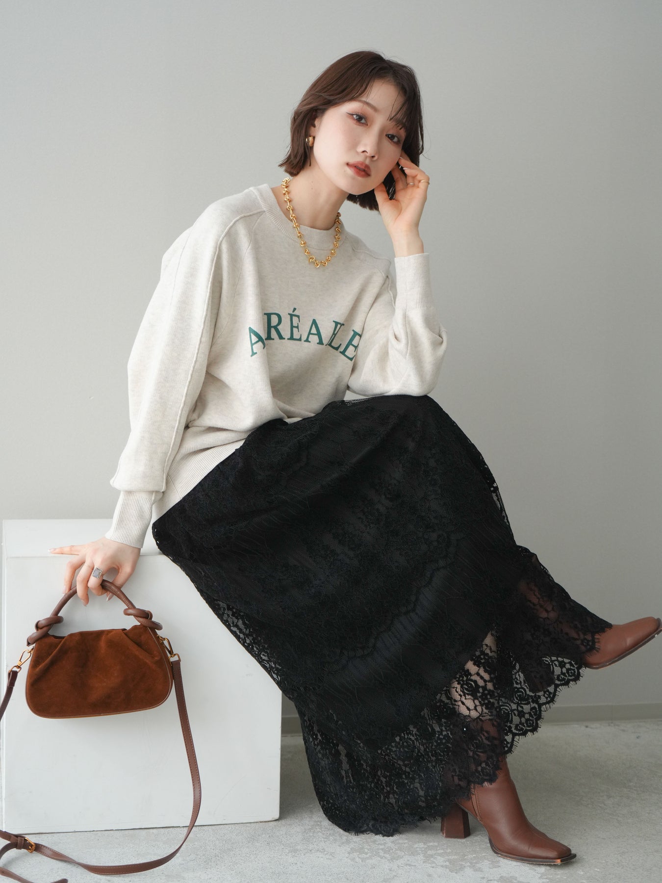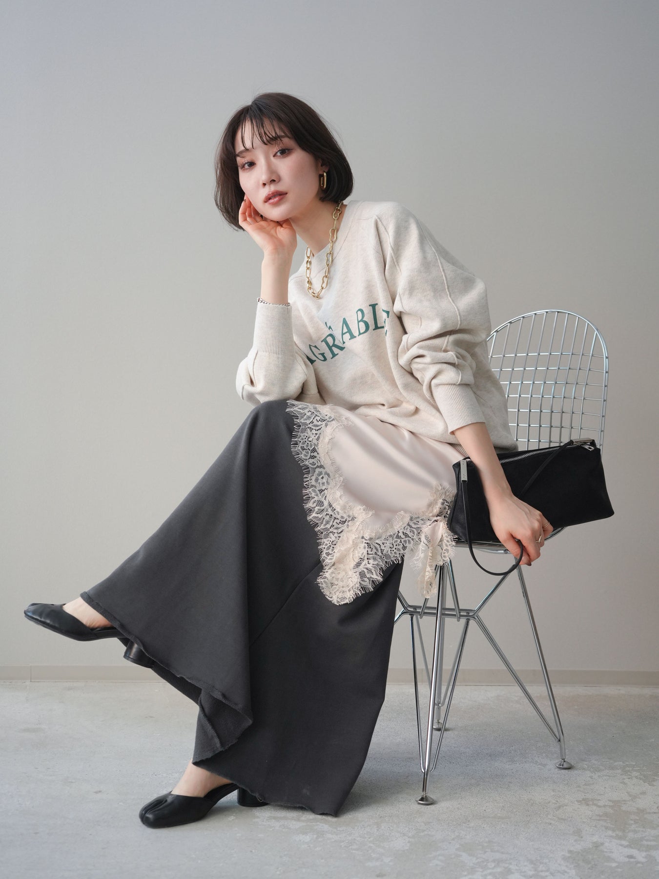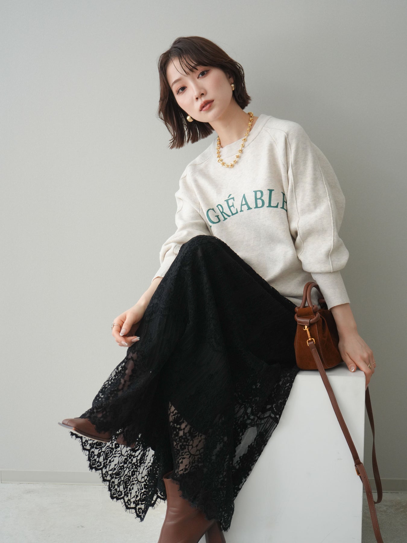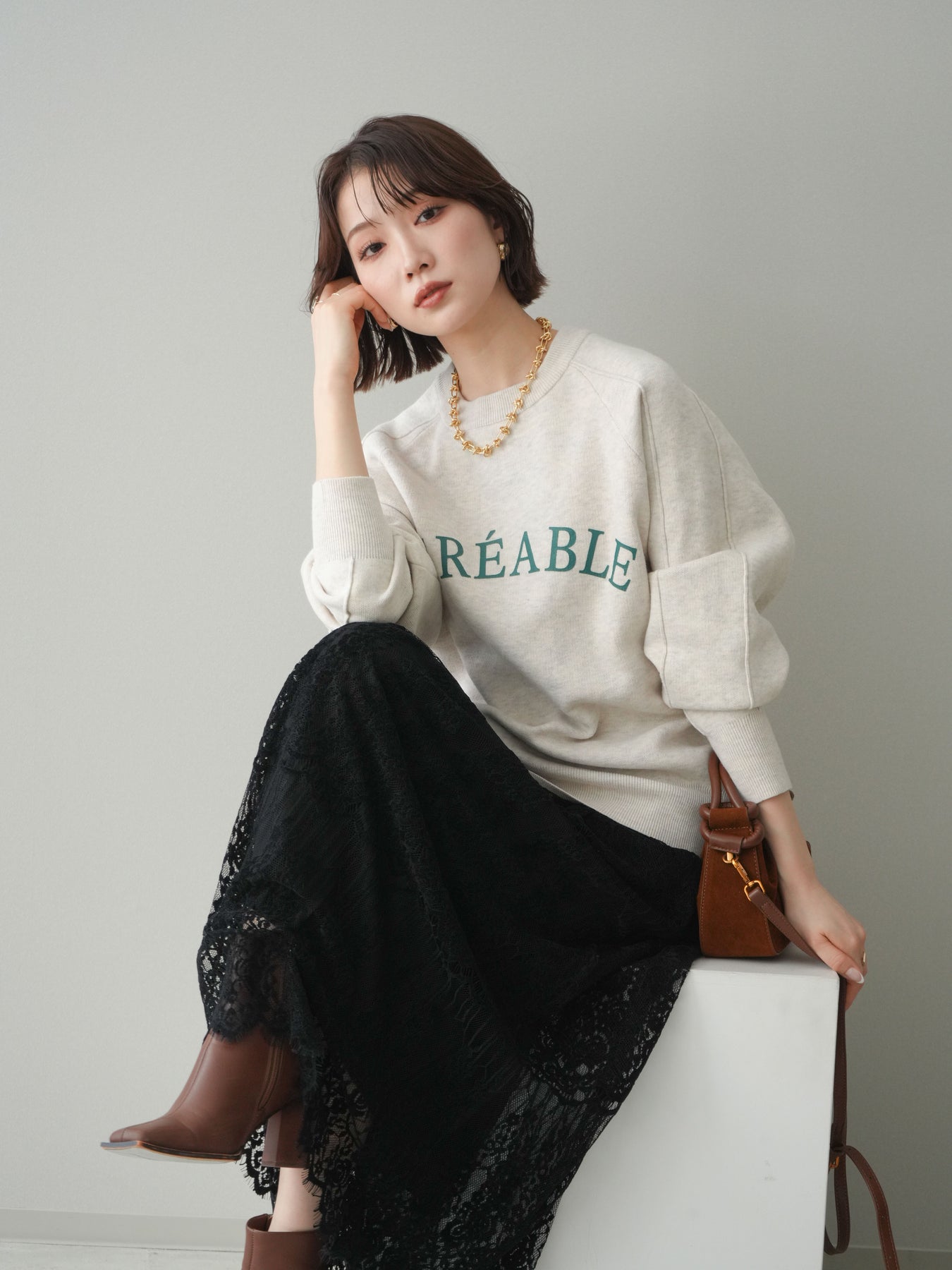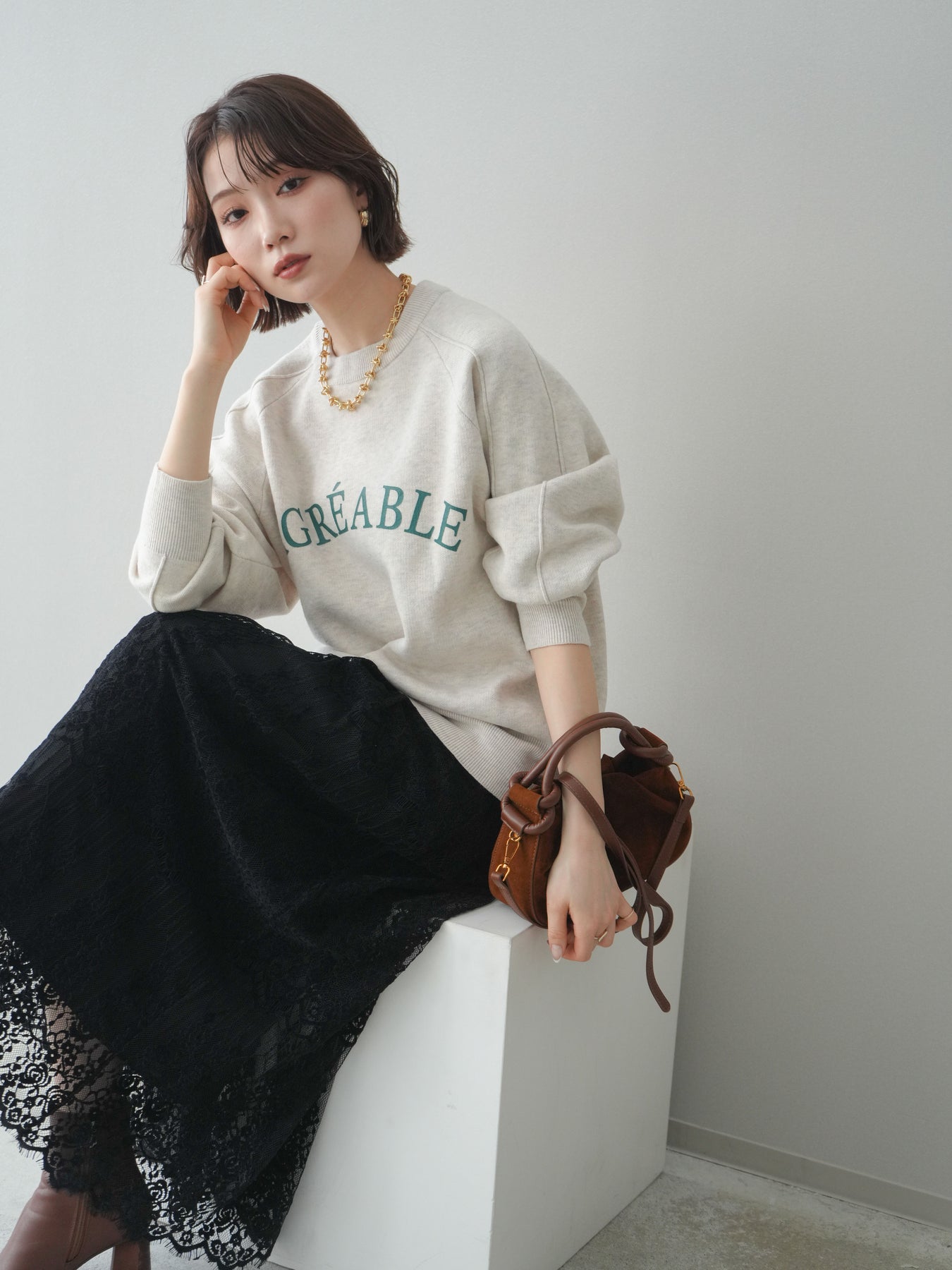 スウェットライクな風合いが魅力のニットプルオーバー。フロントには半ラバープリントのロゴを施し、主張しすぎないデザインで大人のカジュアルスタイルに馴染む一着です。程よくゆとりのあるシルエットで、体のラインを拾いにくく、リラックス感のある着心地もポイント。ニットならではの柔らかさと、スウェットのような気軽さを兼ね備え、デイリー使いはもちろん、きれいめアイテムと合わせたミックスコーデにも活躍します。 ※ボトムス、キャミソール(インナー)以外の商品は一律でインナーは付属していません。