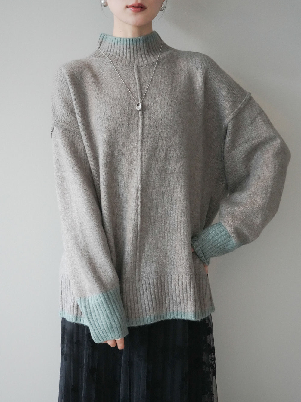 [SET]配色ハイネックニットプルオーバー+選べるアクセセット(2set)